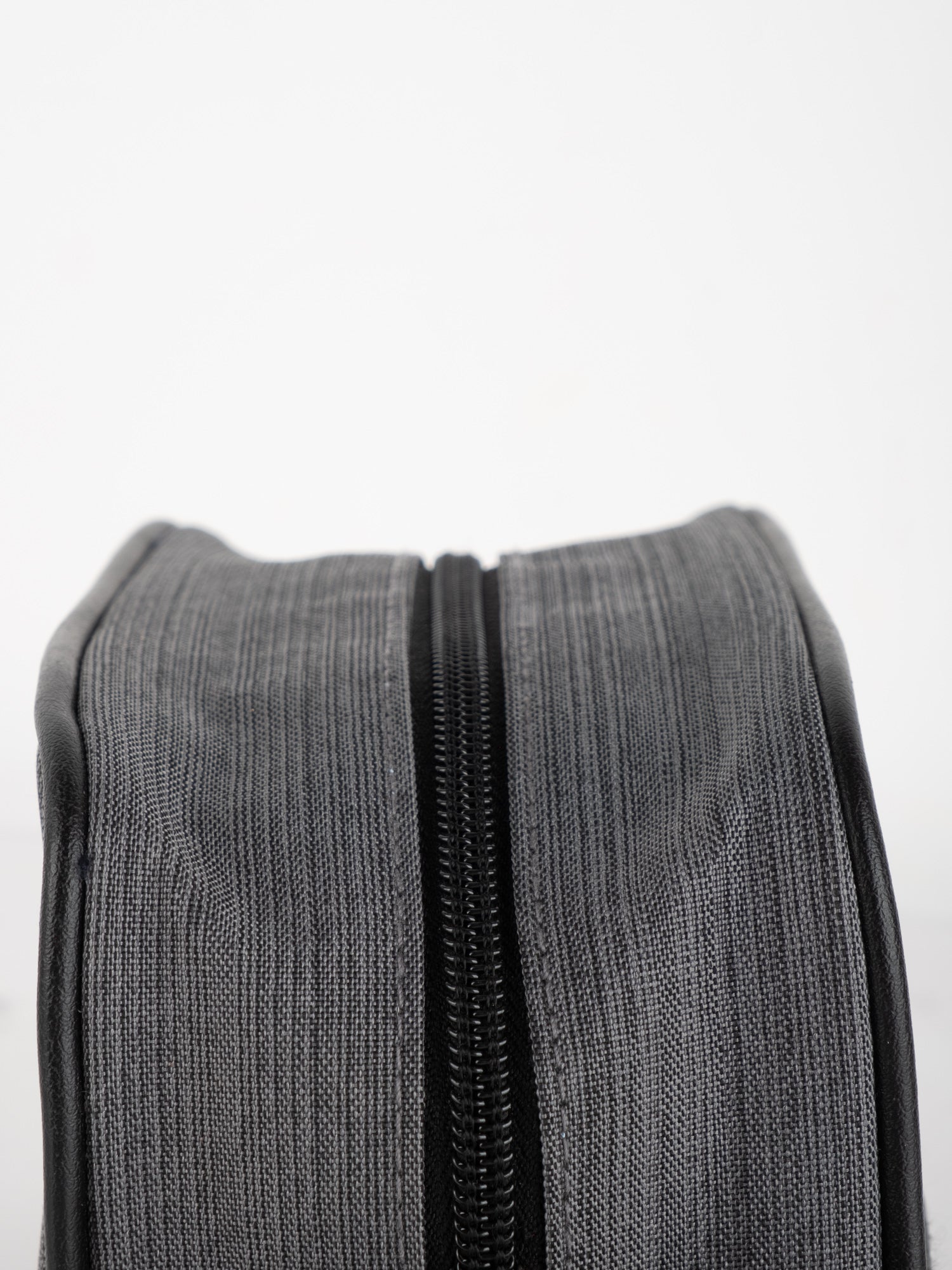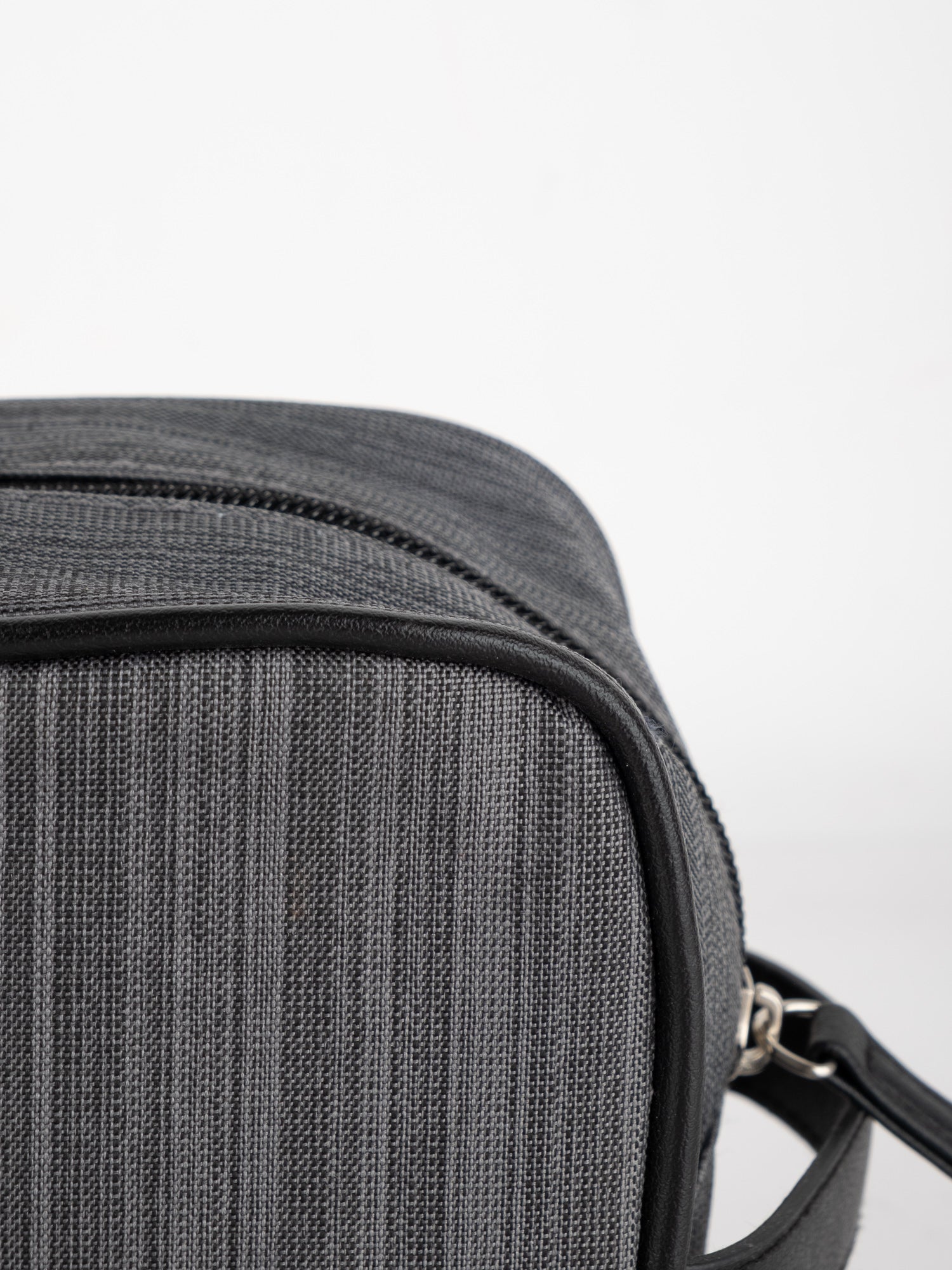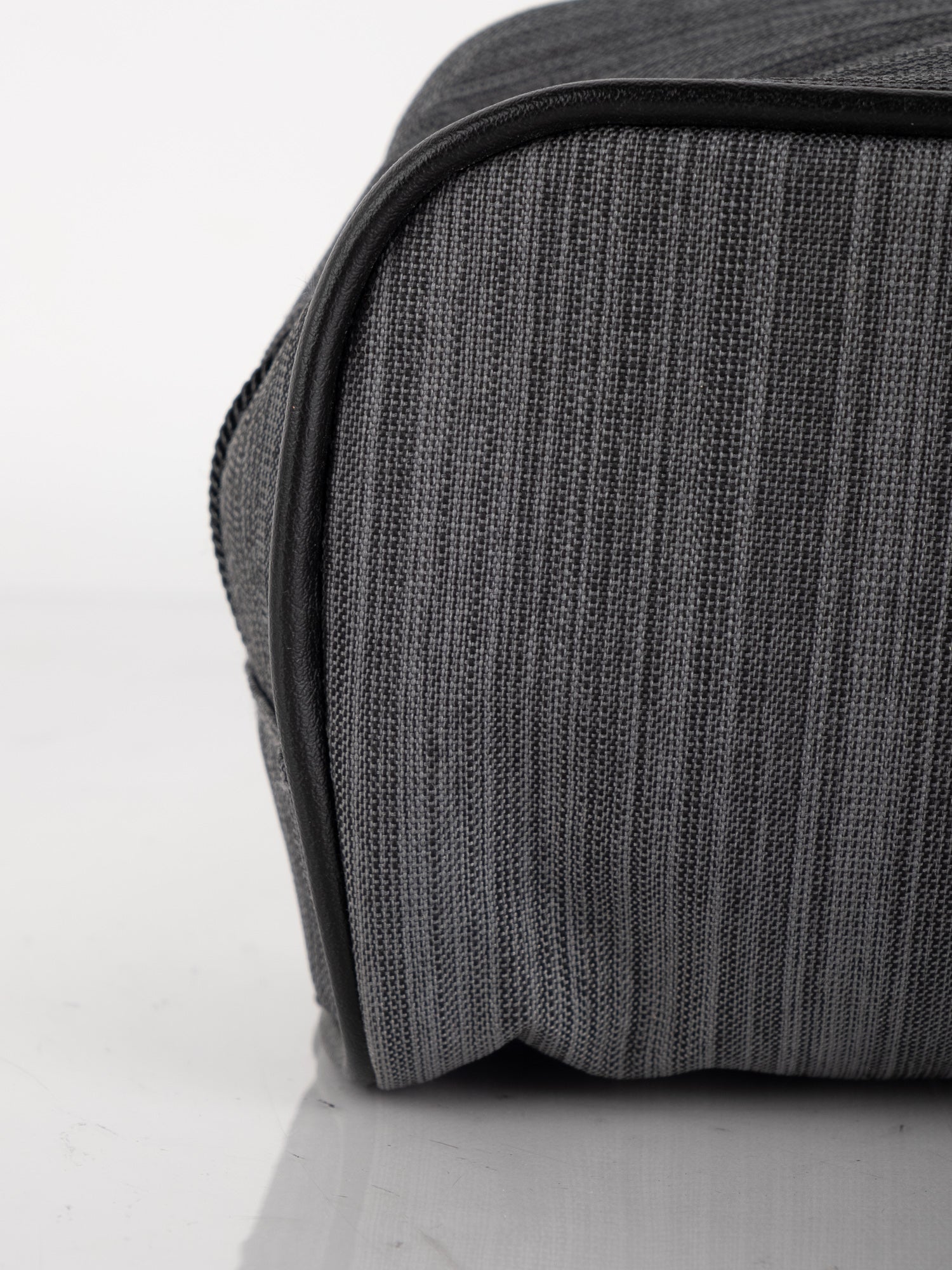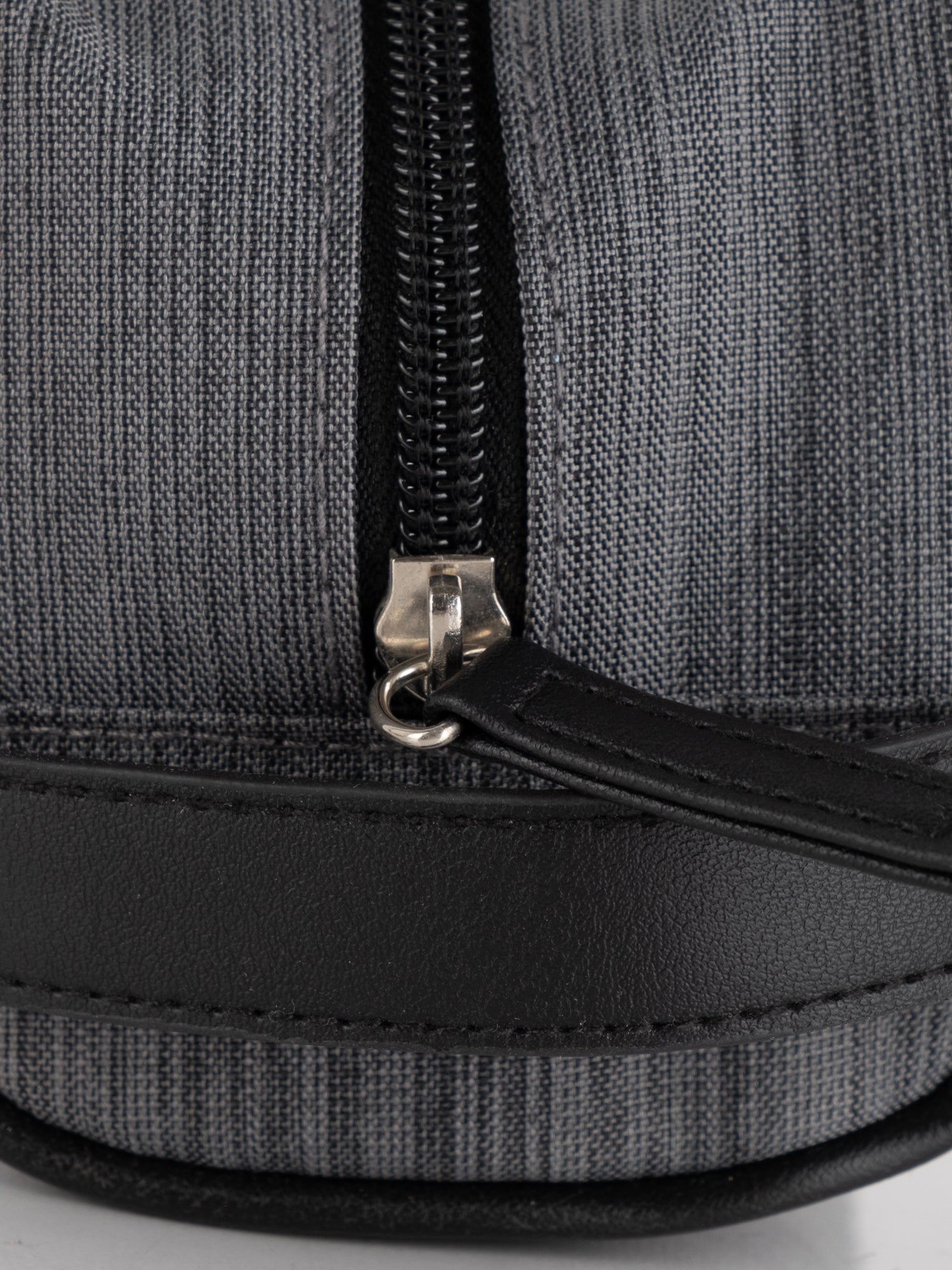 עשוי בד טקסטורתי בגוון אפור עם פס עור שחור בתחתית, רוכסן עליון באיכות גבוהה ותא מרכזי רחב עם בטנת בד פנימית.