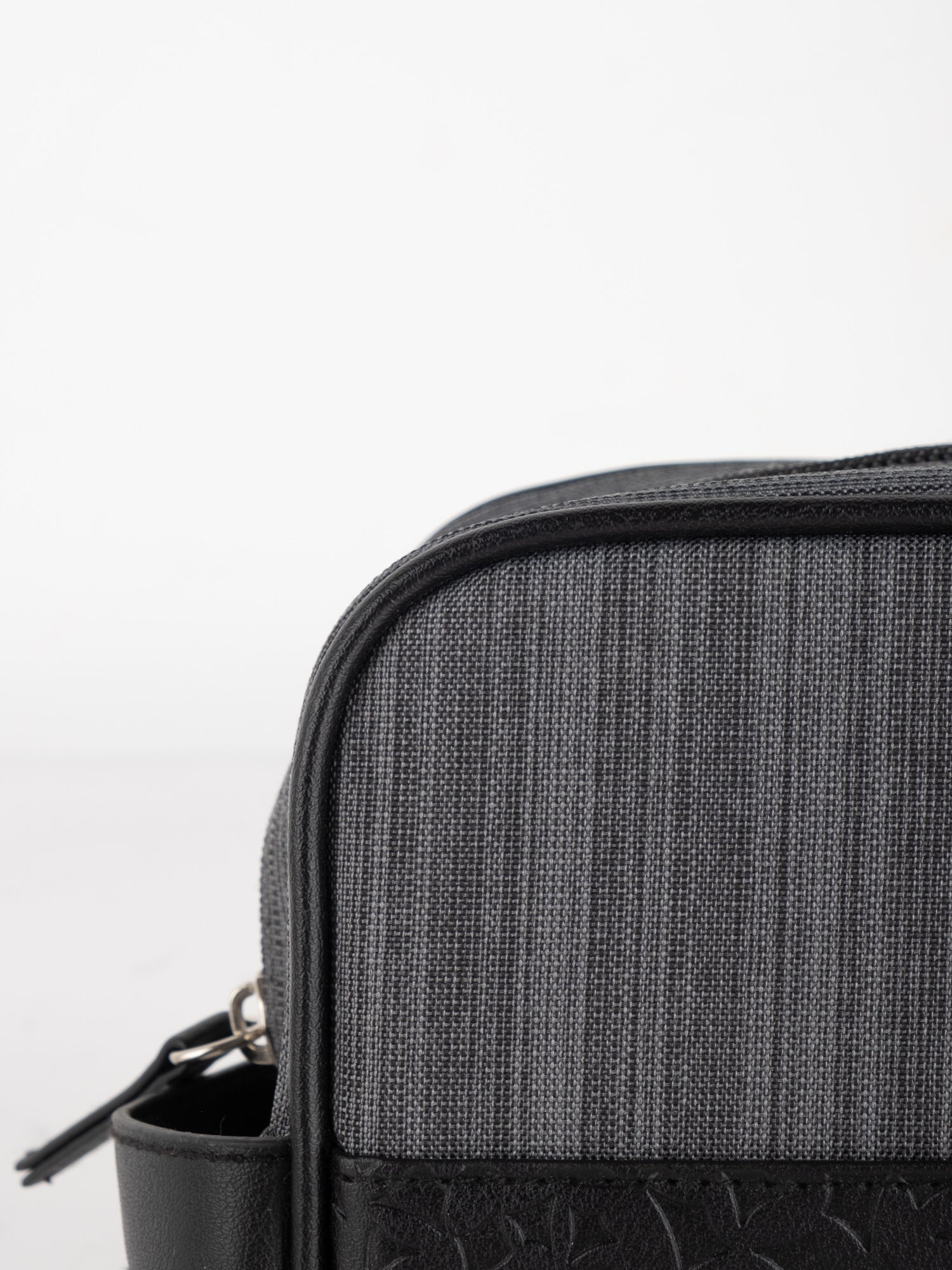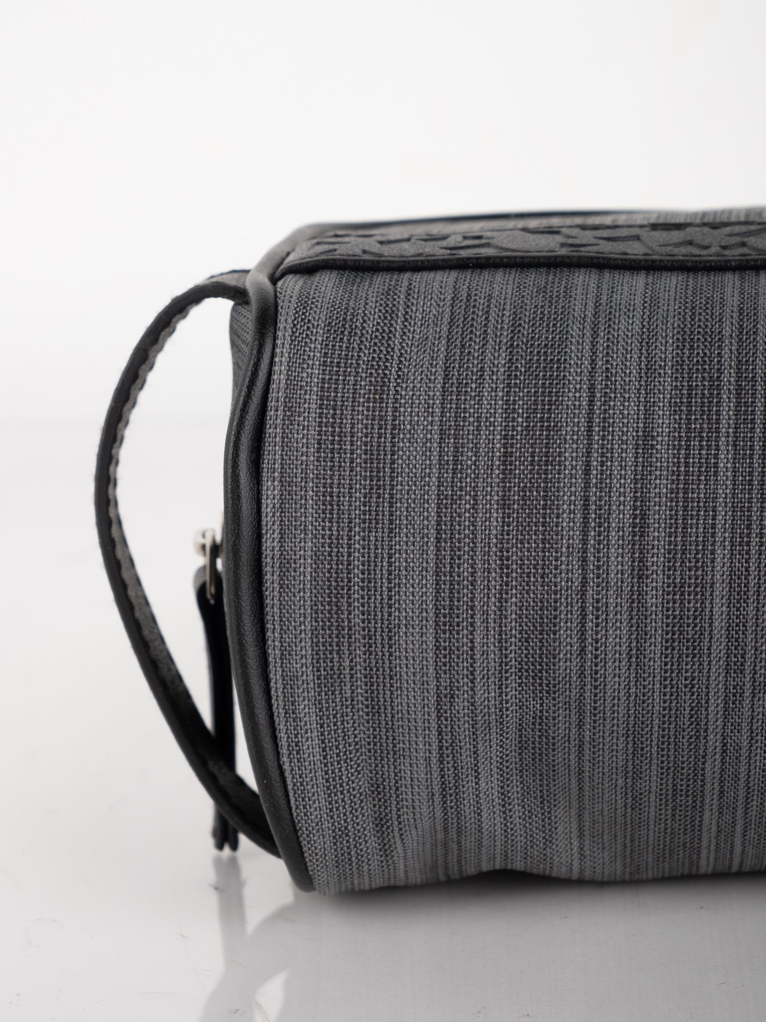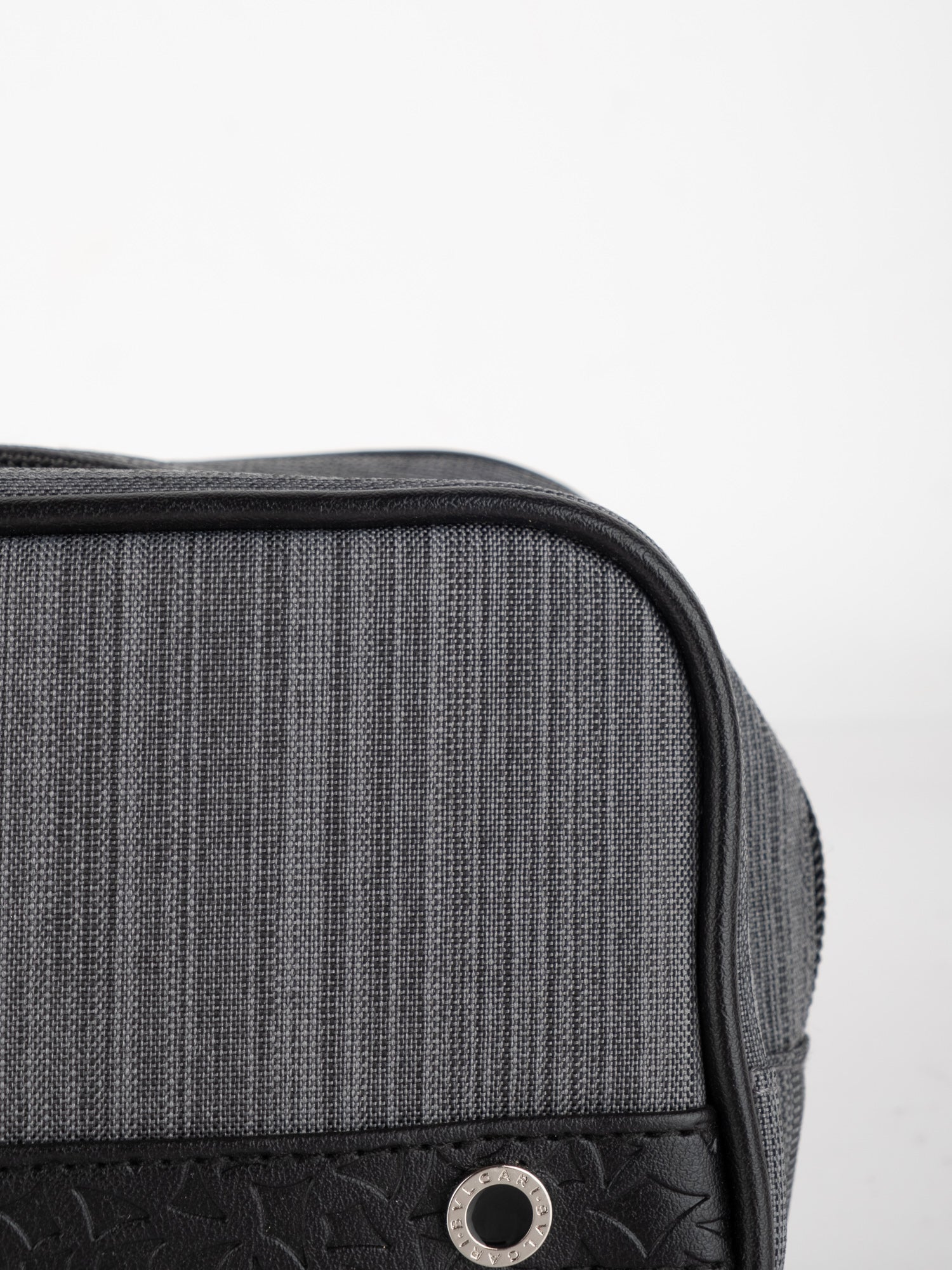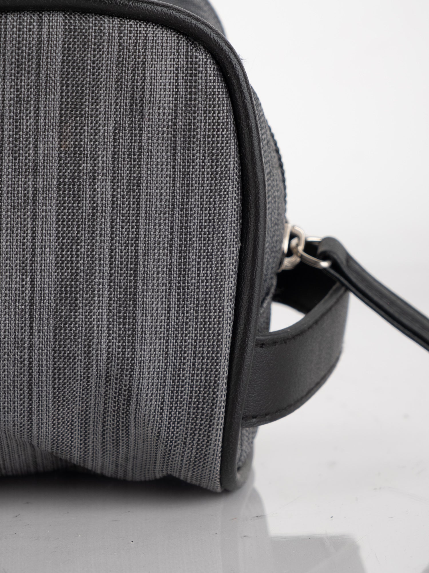 עשוי בד טקסטורתי בגוון אפור עם פס עור שחור בתחתית, רוכסן עליון באיכות גבוהה ותא מרכזי רחב עם בטנת בד פנימית.