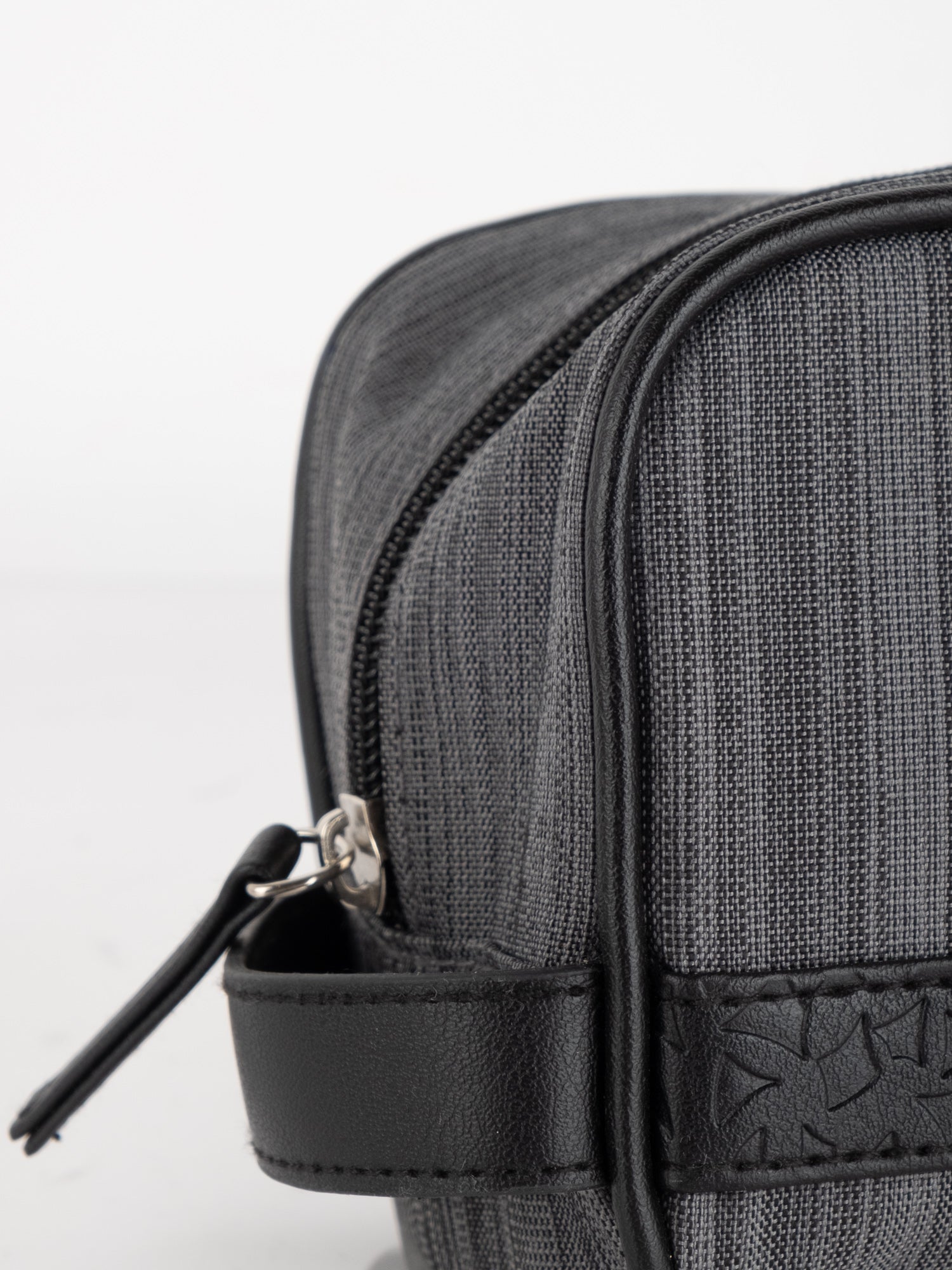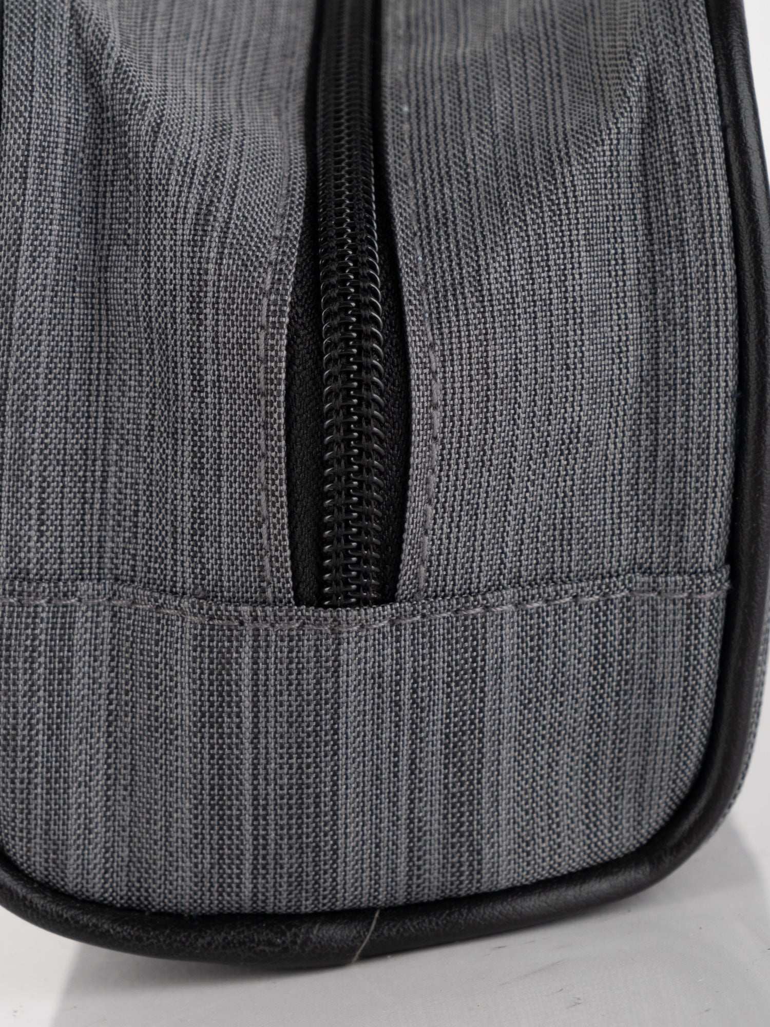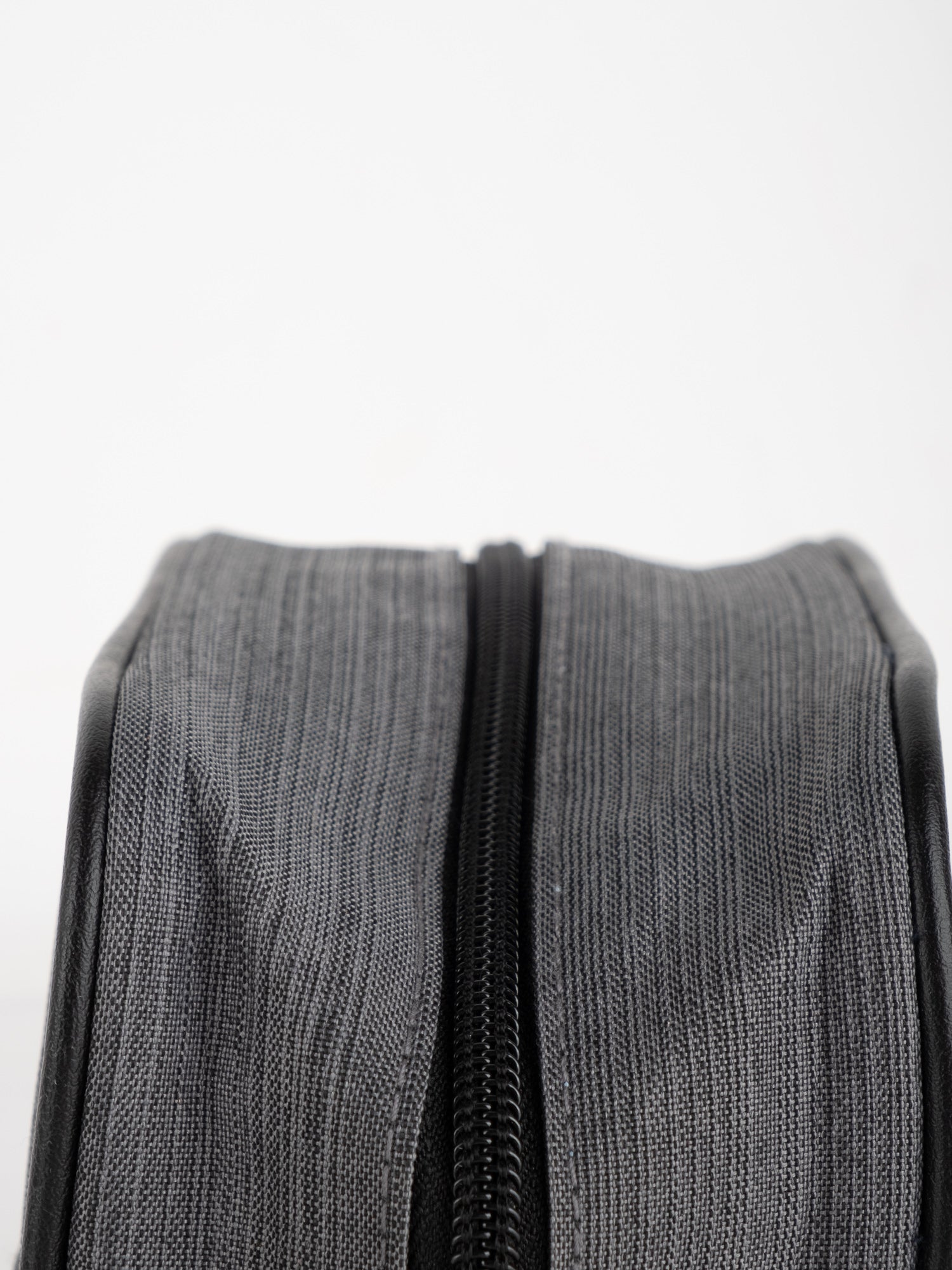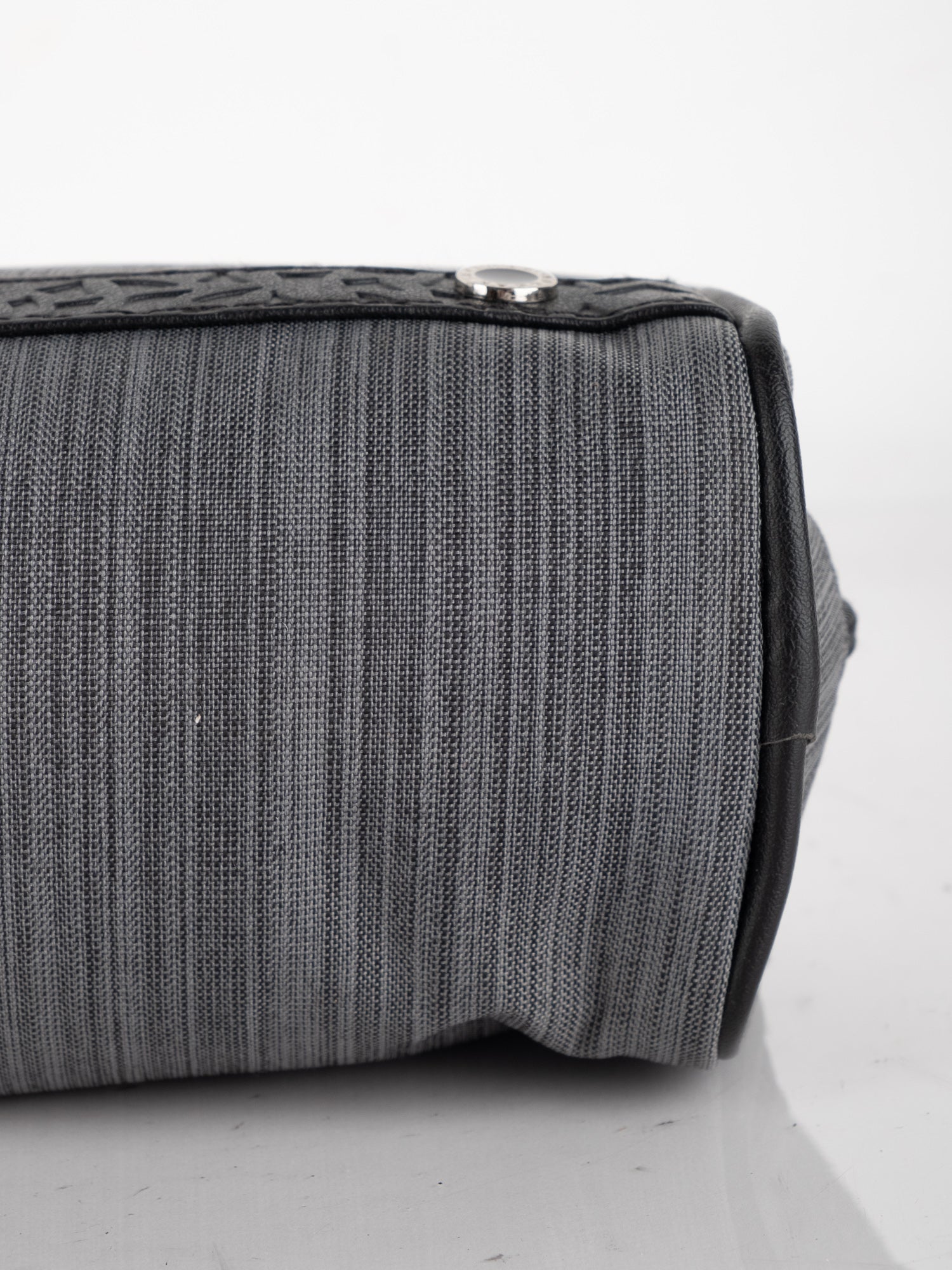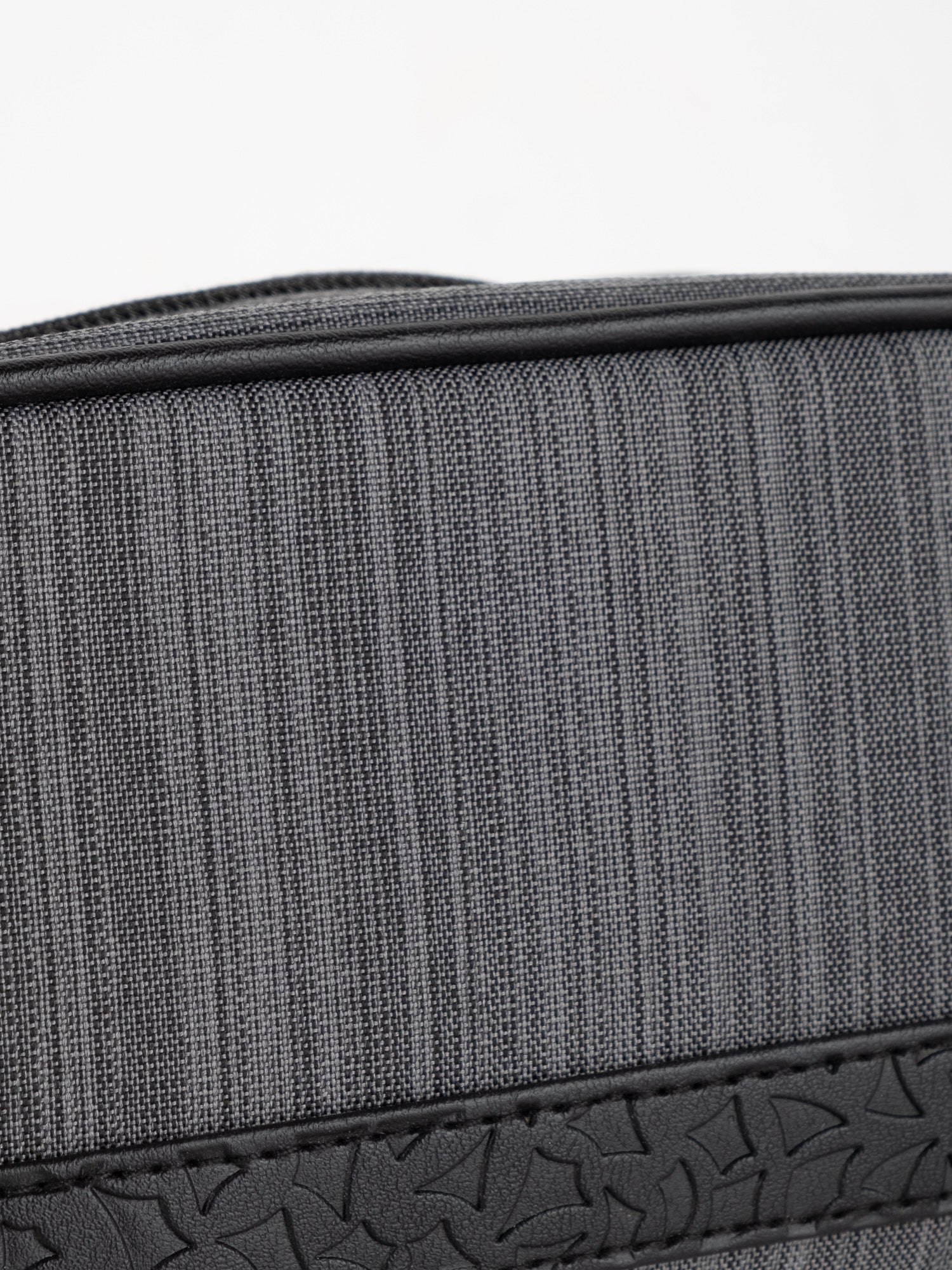 עשוי בד טקסטורתי בגוון אפור עם פס עור שחור בתחתית, רוכסן עליון באיכות גבוהה ותא מרכזי רחב עם בטנת בד פנימית.