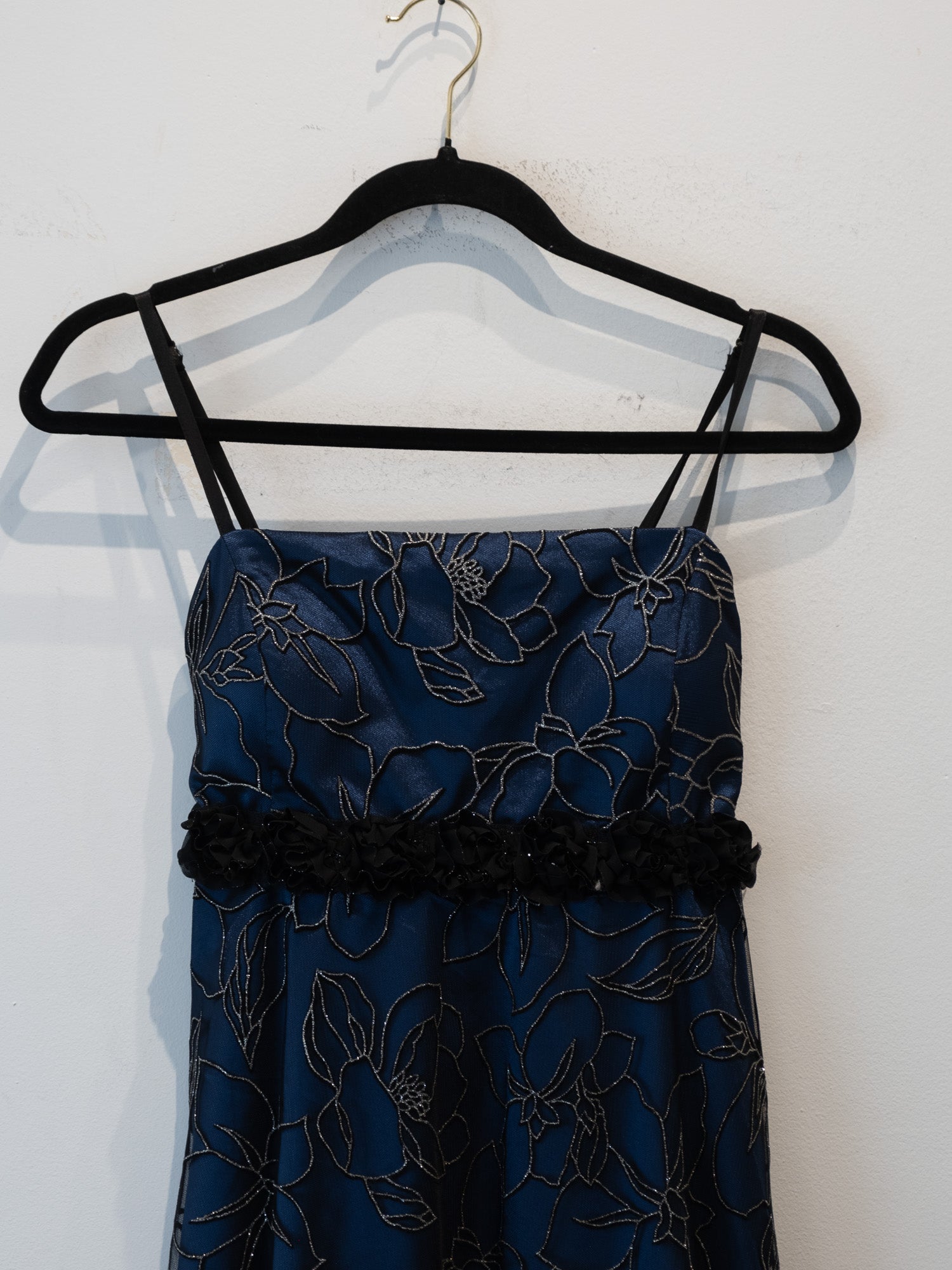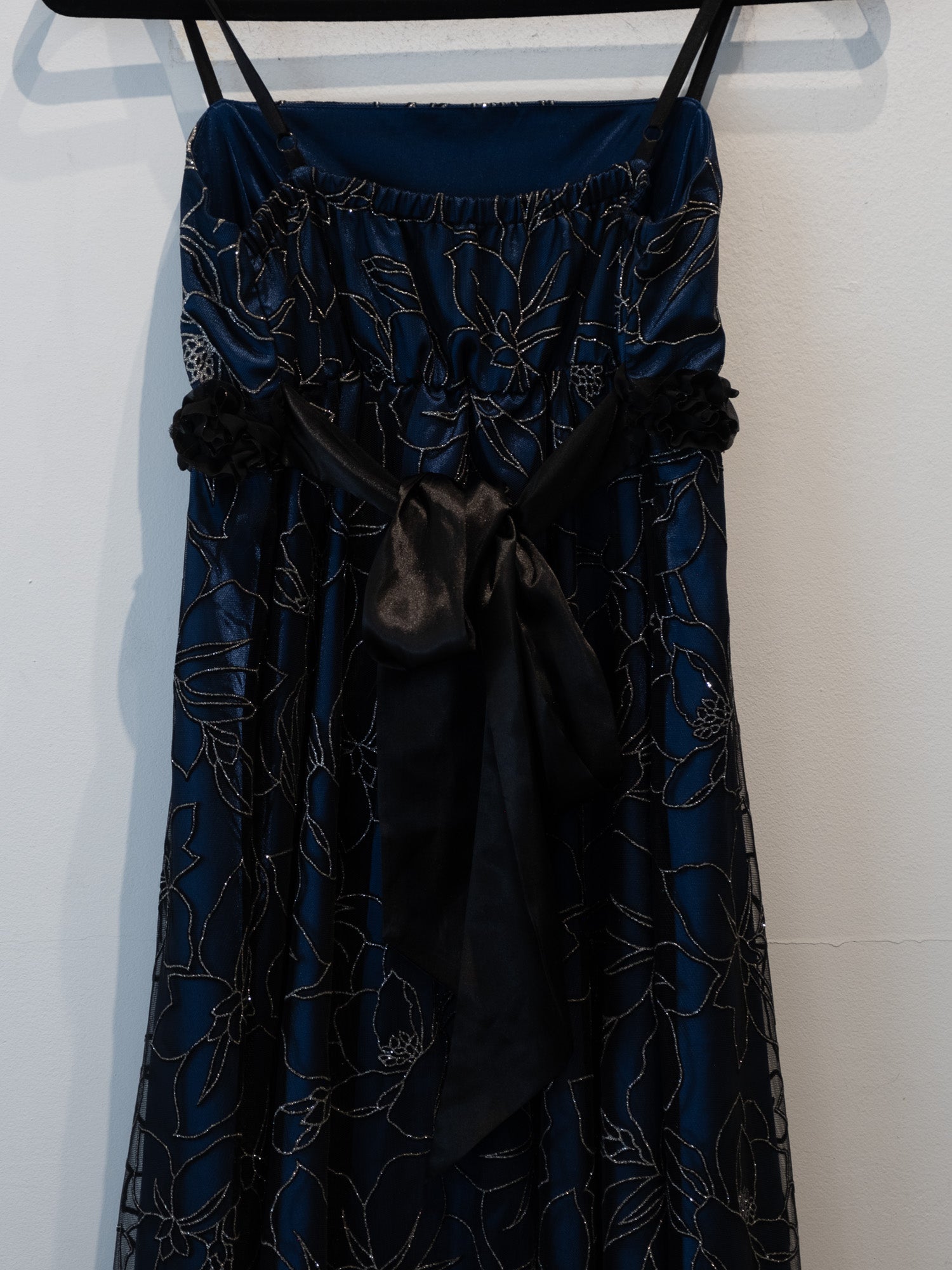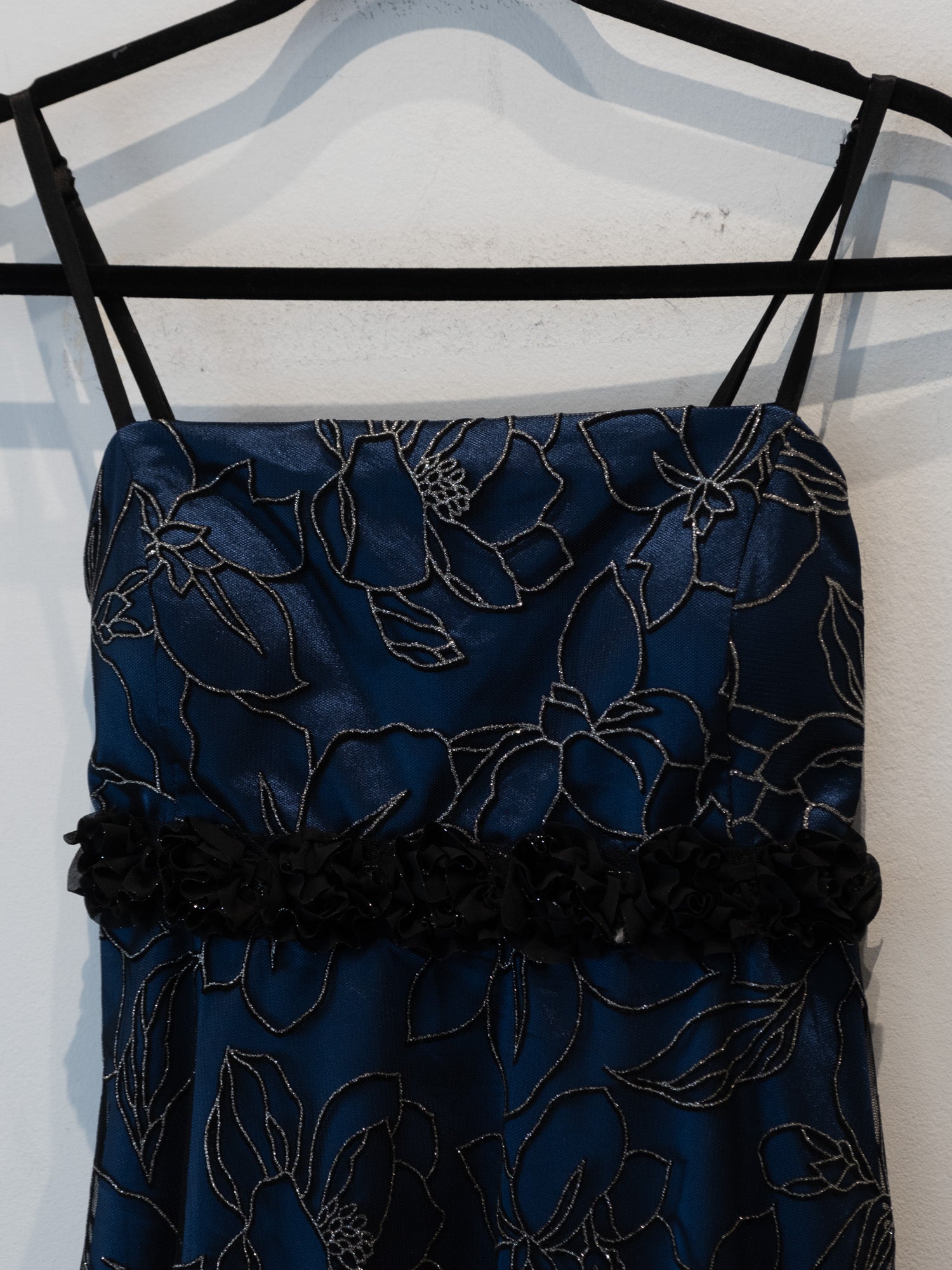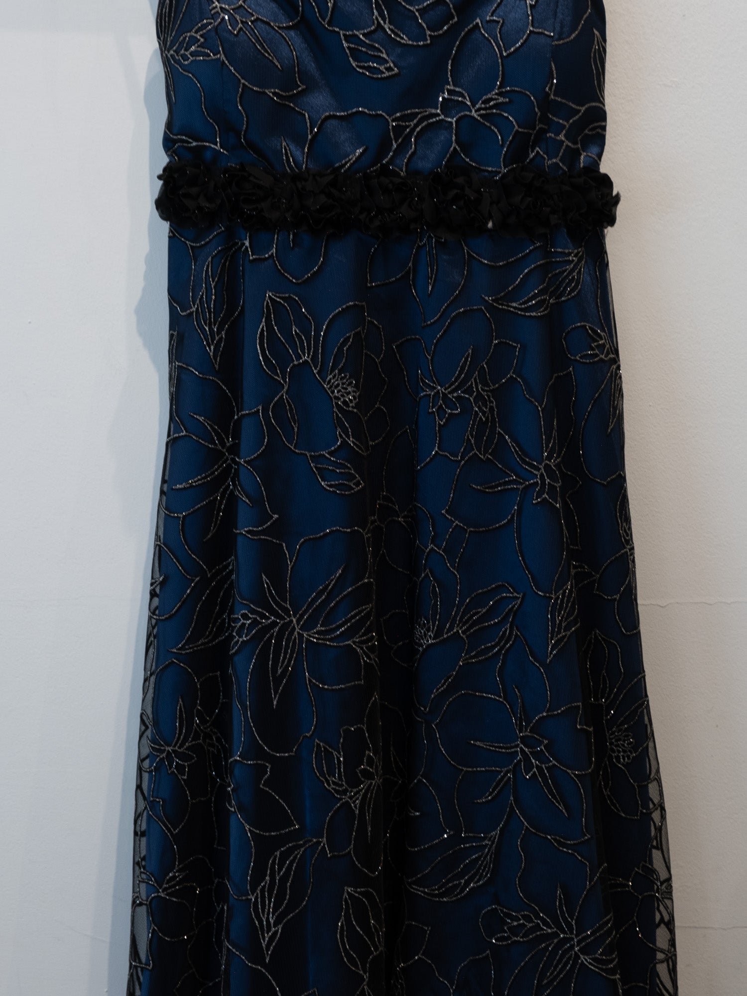 View Similar Productsשמלת וינטג' יד שנייה רומנטי של תחרה כחולה עם פרטים שחורים מעודנים. גזרת סטרפלס מחמיאה, עם חגורת תחרה רכה שמדגישה את קו המותניים. שמלה אלגנטית ונשית שמתאימה לערב או לאירוע מיוחד.