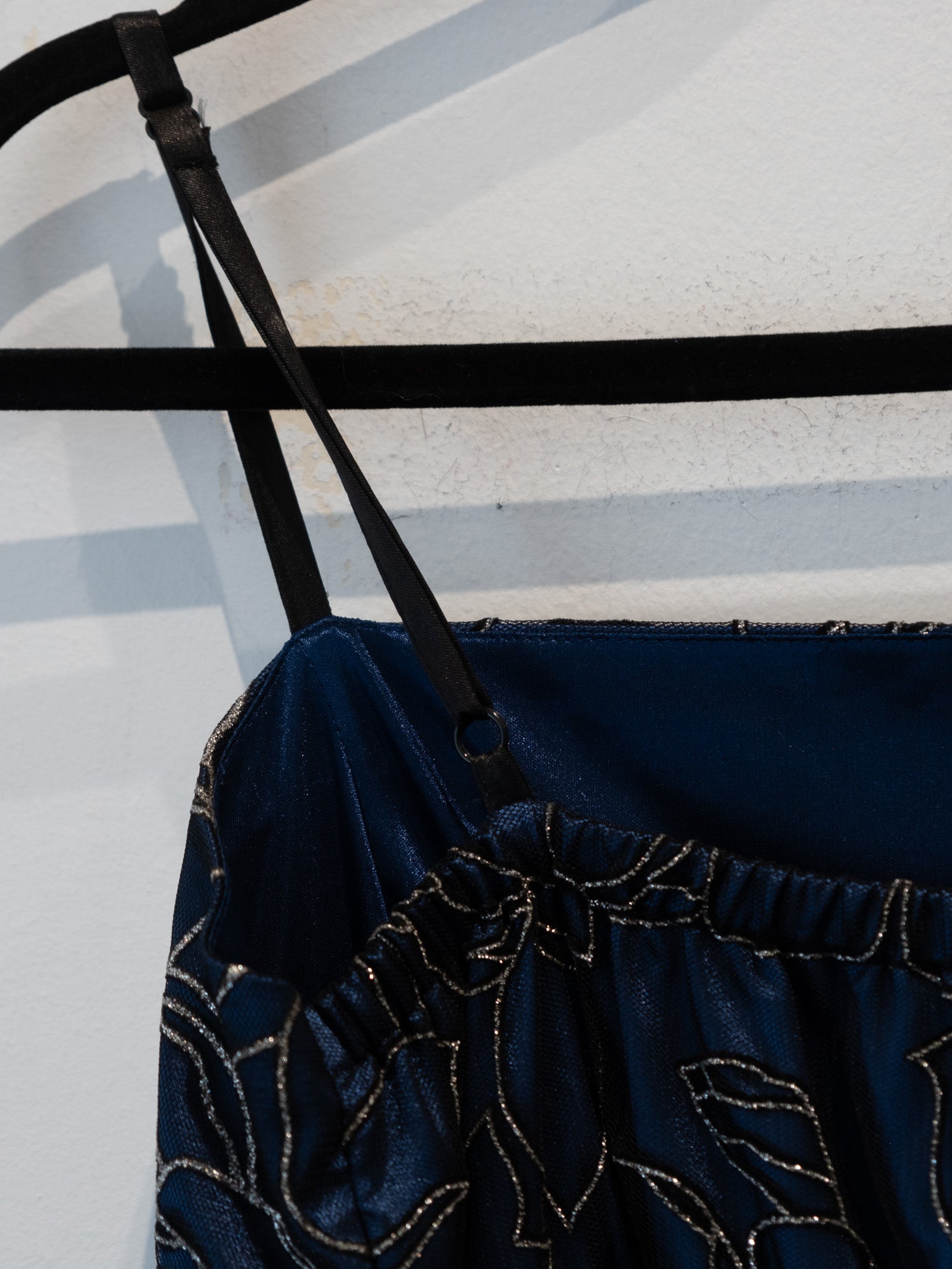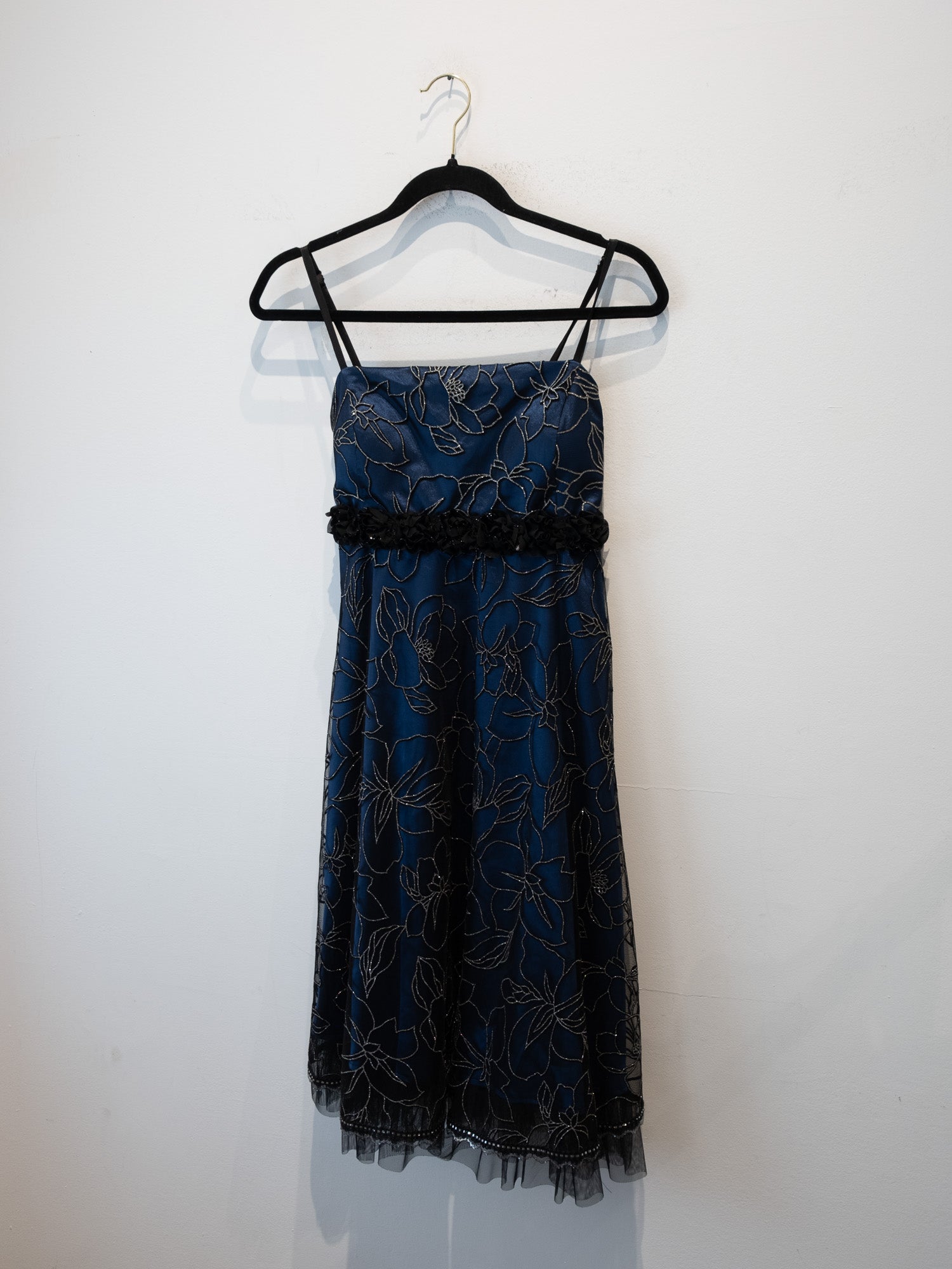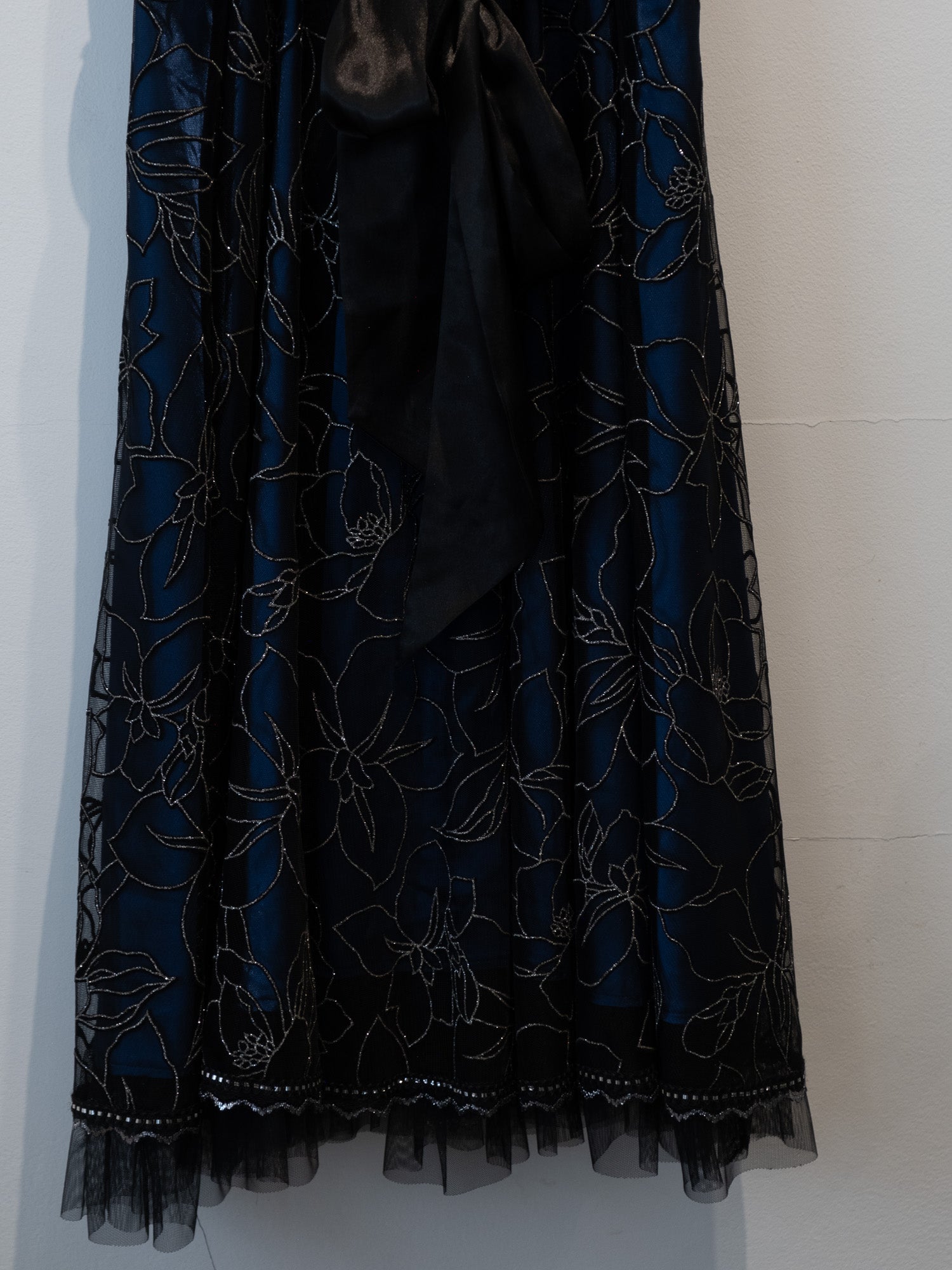 View Similar Productsשמלת וינטג' יד שנייה רומנטי של תחרה כחולה עם פרטים שחורים מעודנים. גזרת סטרפלס מחמיאה, עם חגורת תחרה רכה שמדגישה את קו המותניים. שמלה אלגנטית ונשית שמתאימה לערב או לאירוע מיוחד.