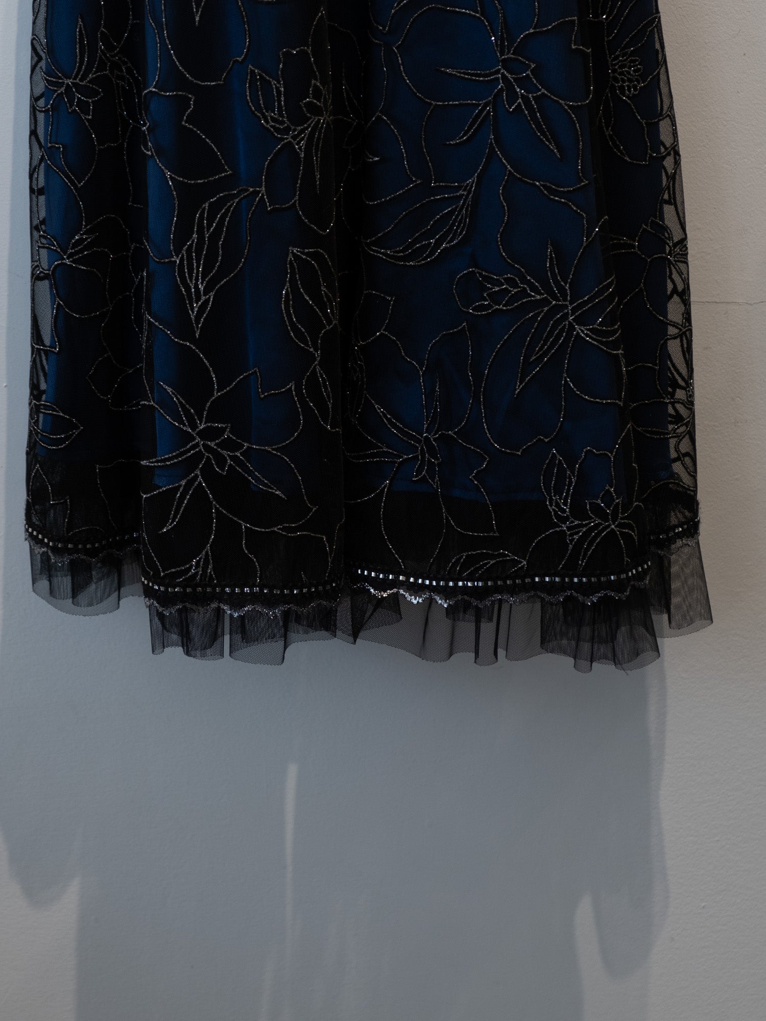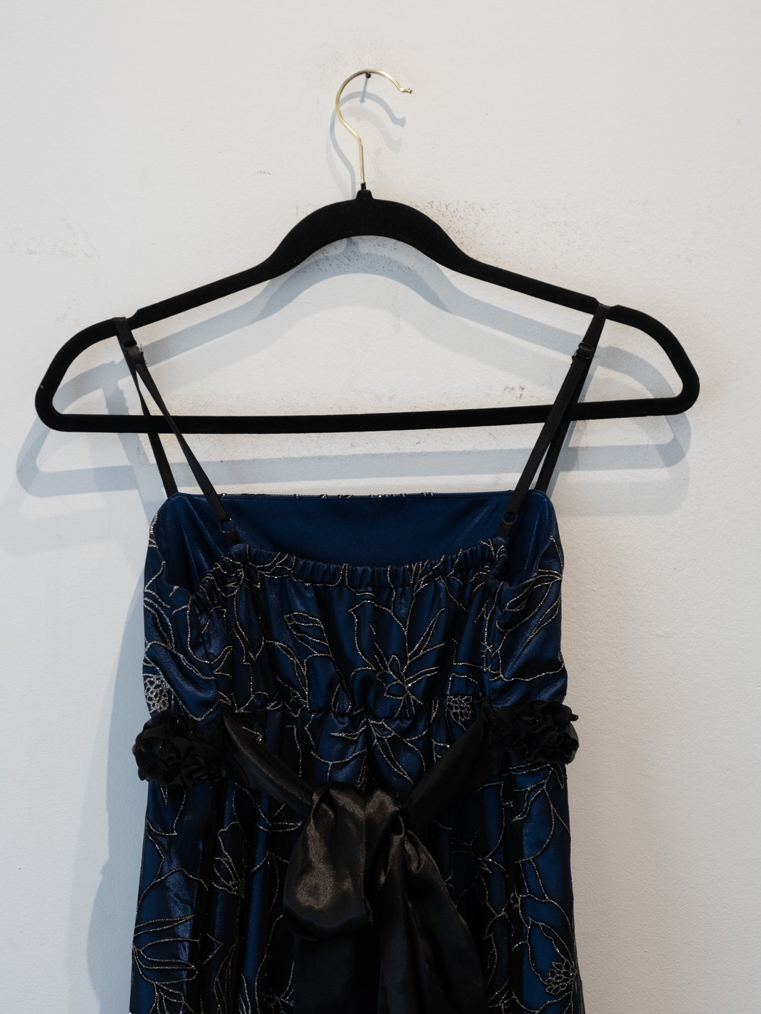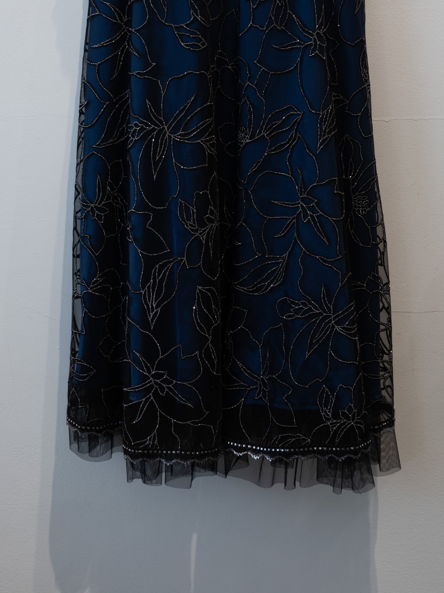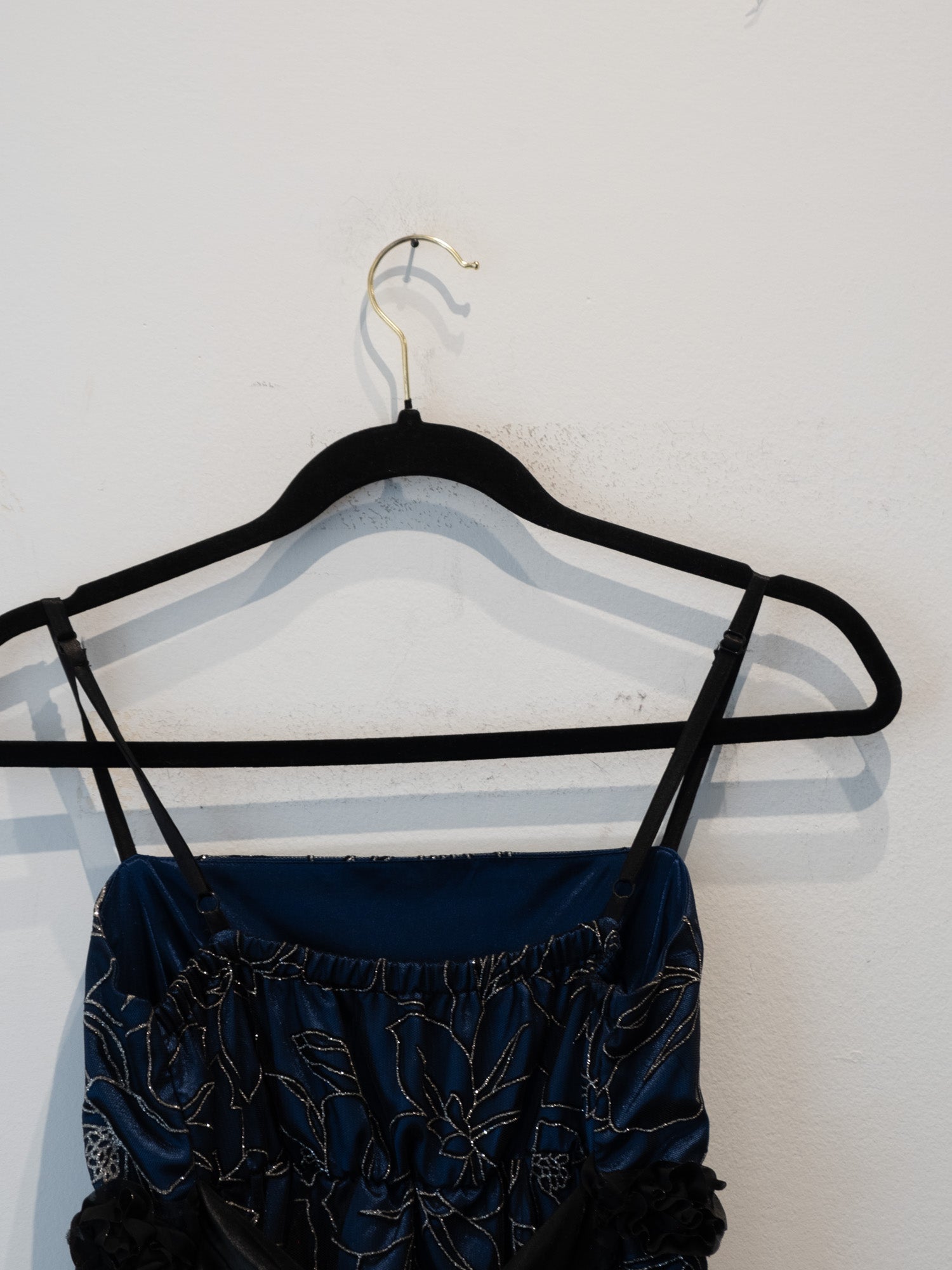 View Similar Productsשמלת וינטג' יד שנייה רומנטי של תחרה כחולה עם פרטים שחורים מעודנים. גזרת סטרפלס מחמיאה, עם חגורת תחרה רכה שמדגישה את קו המותניים. שמלה אלגנטית ונשית שמתאימה לערב או לאירוע מיוחד.