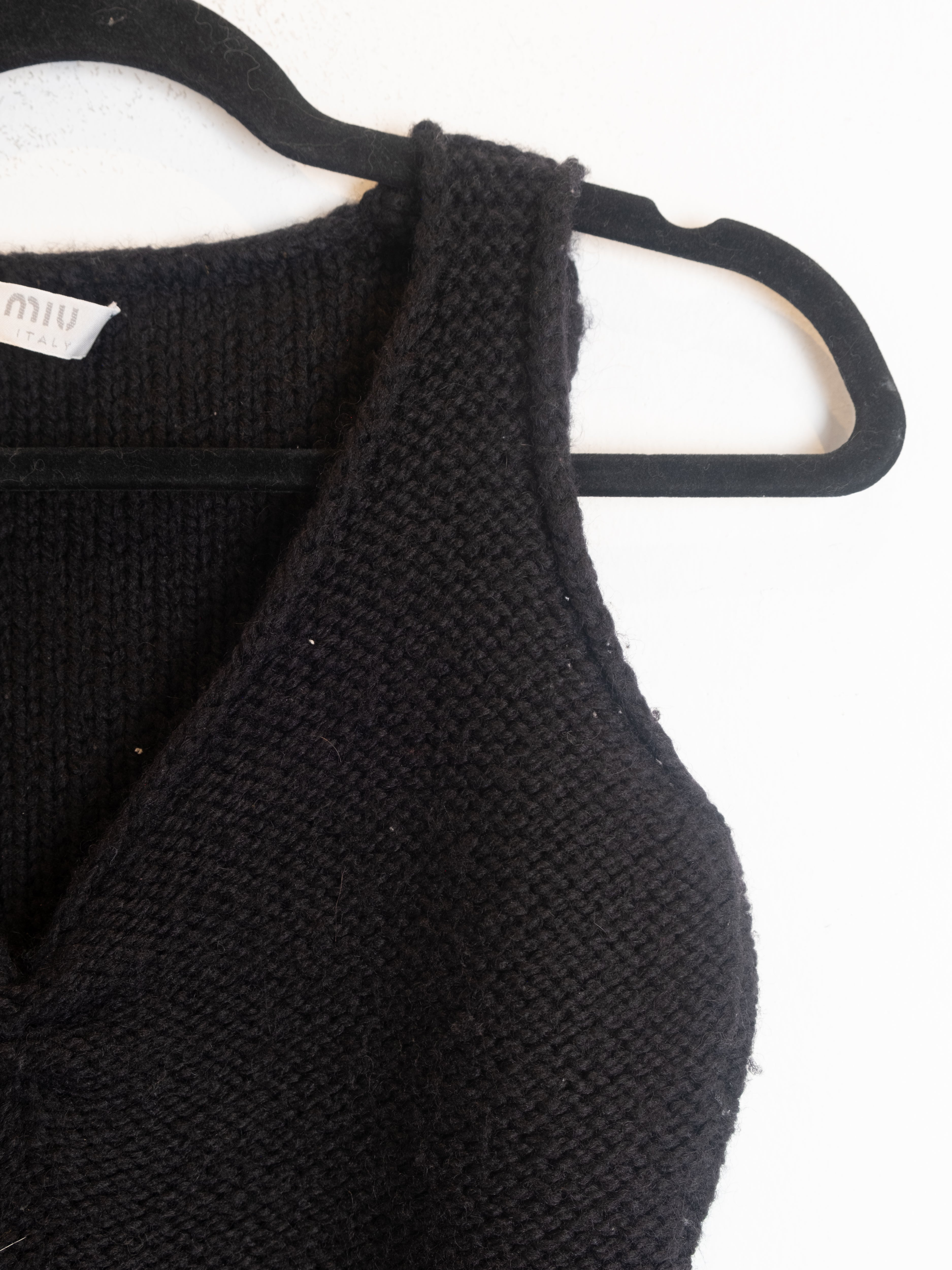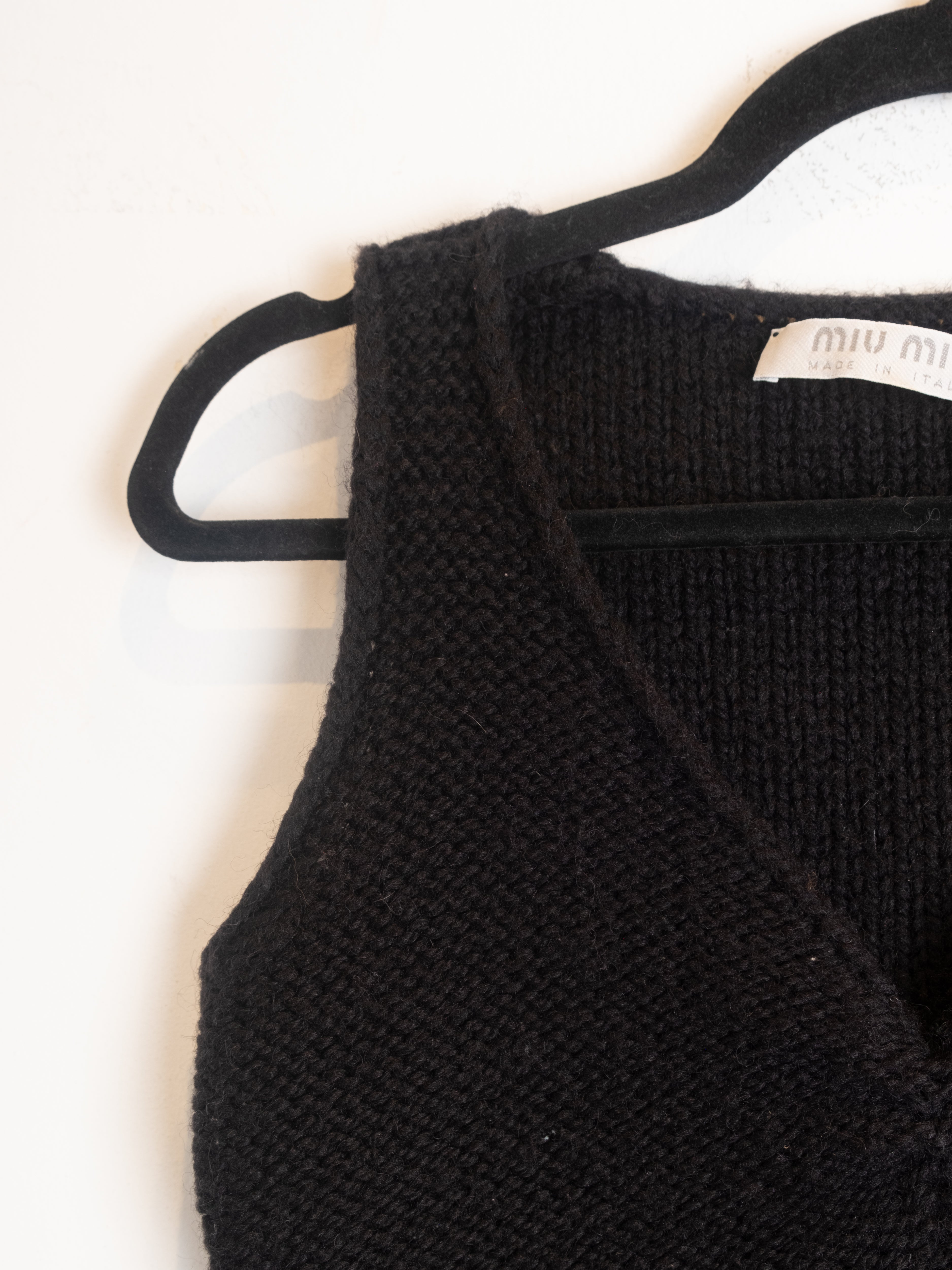 ווסט צמר שחור של Miu Miu וינטג' יד שנייה, בעיצוב מינימליסטי ומדויק עם מפתח V מחמיא וסריגה רכה ונעימה. פריט אלגנטי ונקי המוסיף שכבת סטייל על-זמנית, מושלם לשילוב מעל חולצה, שמלה או לבדו ל־look איטלקי מוקפד.