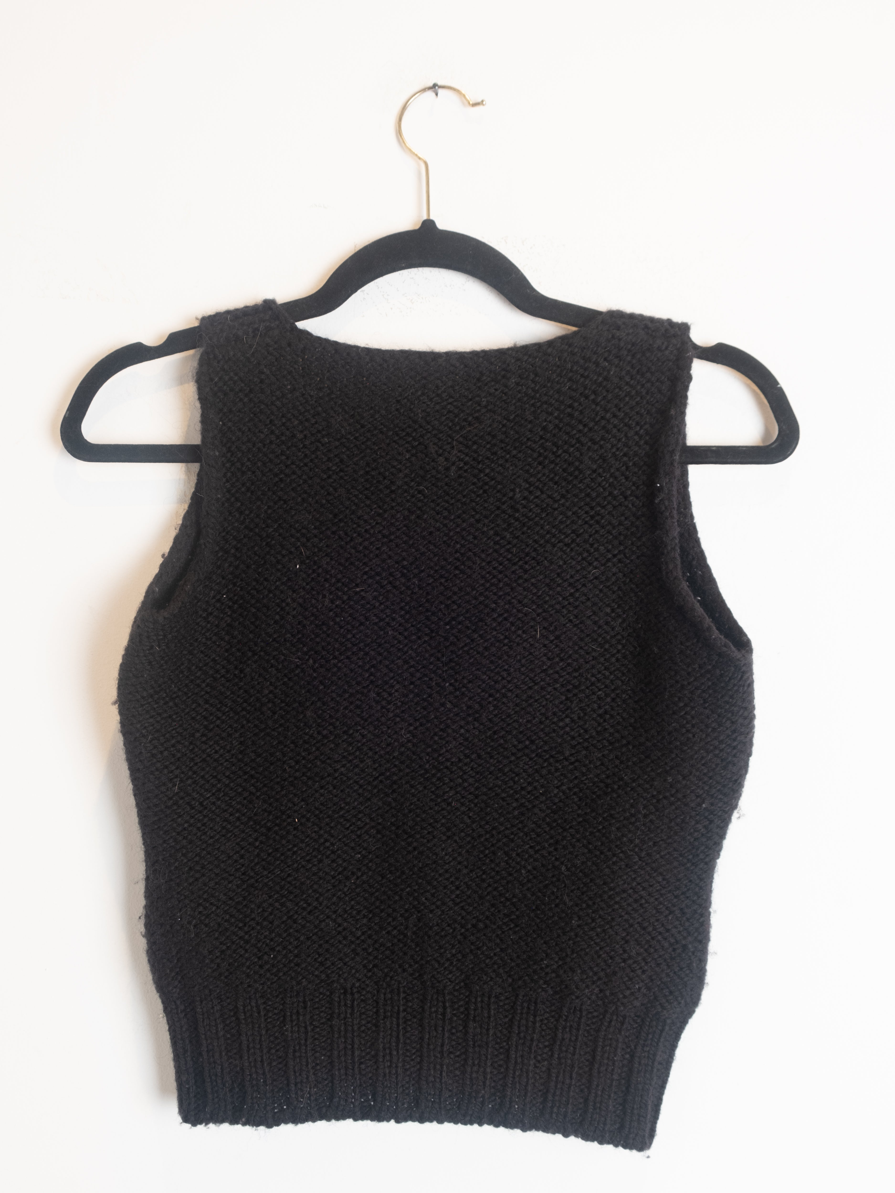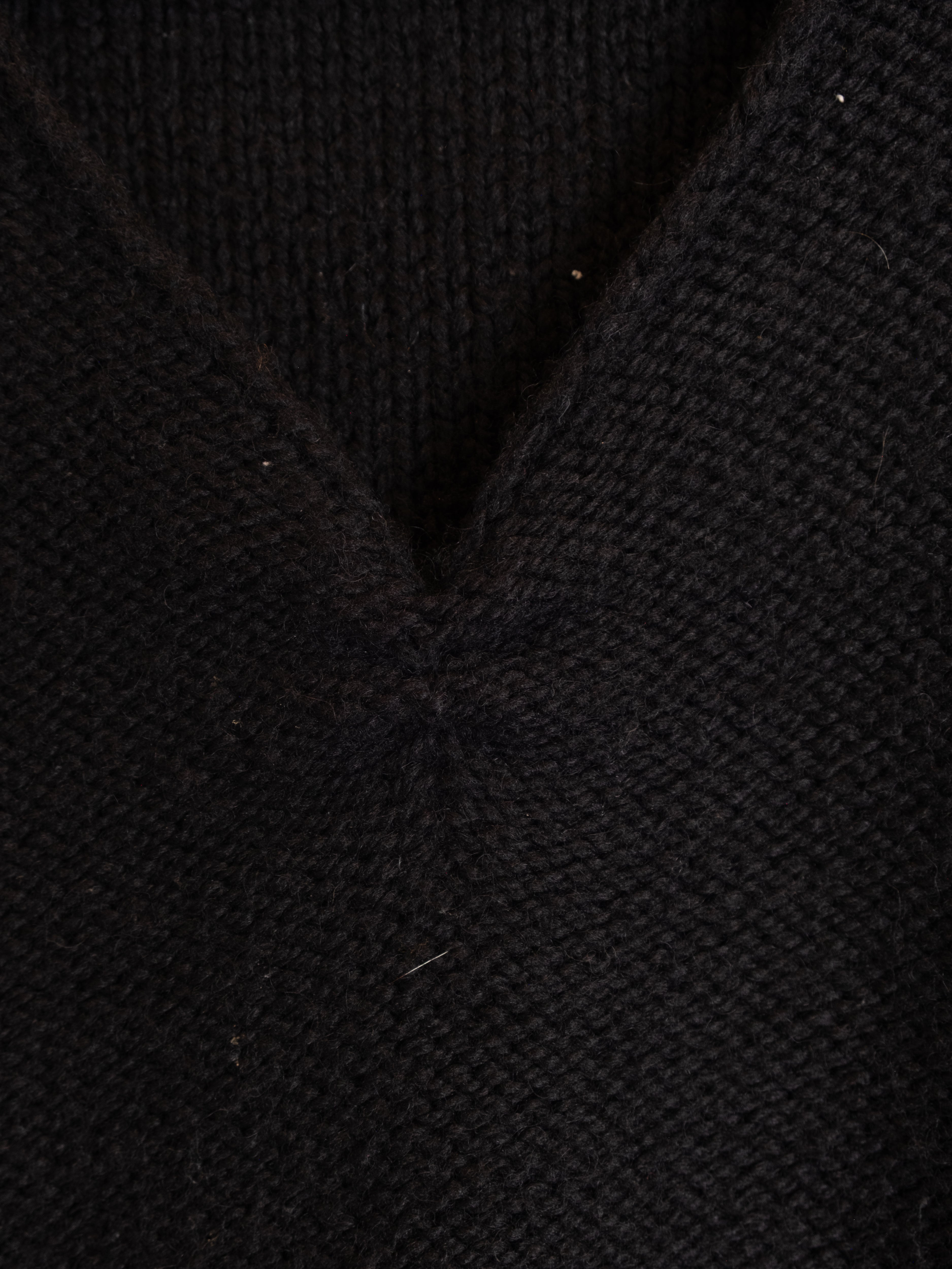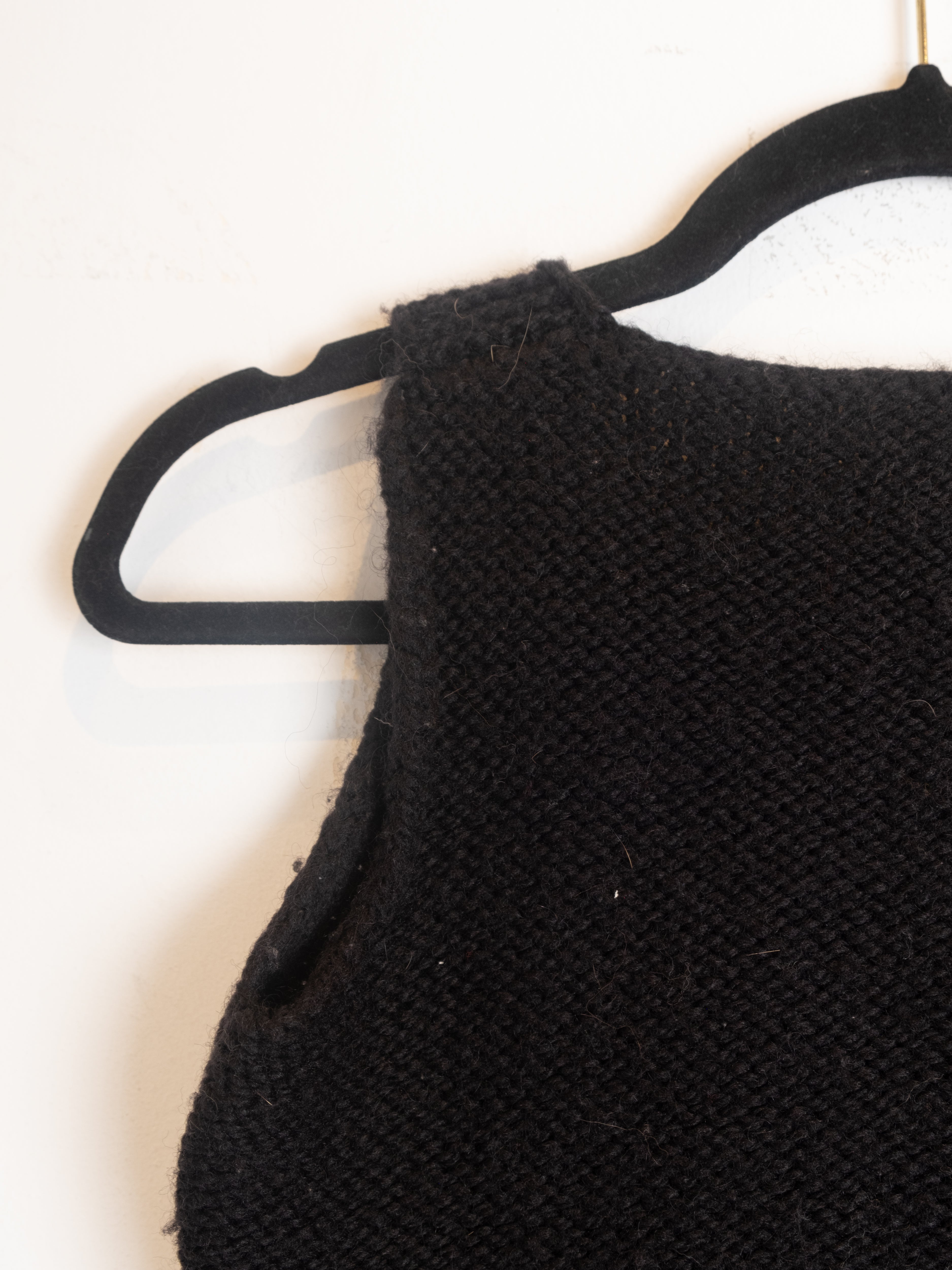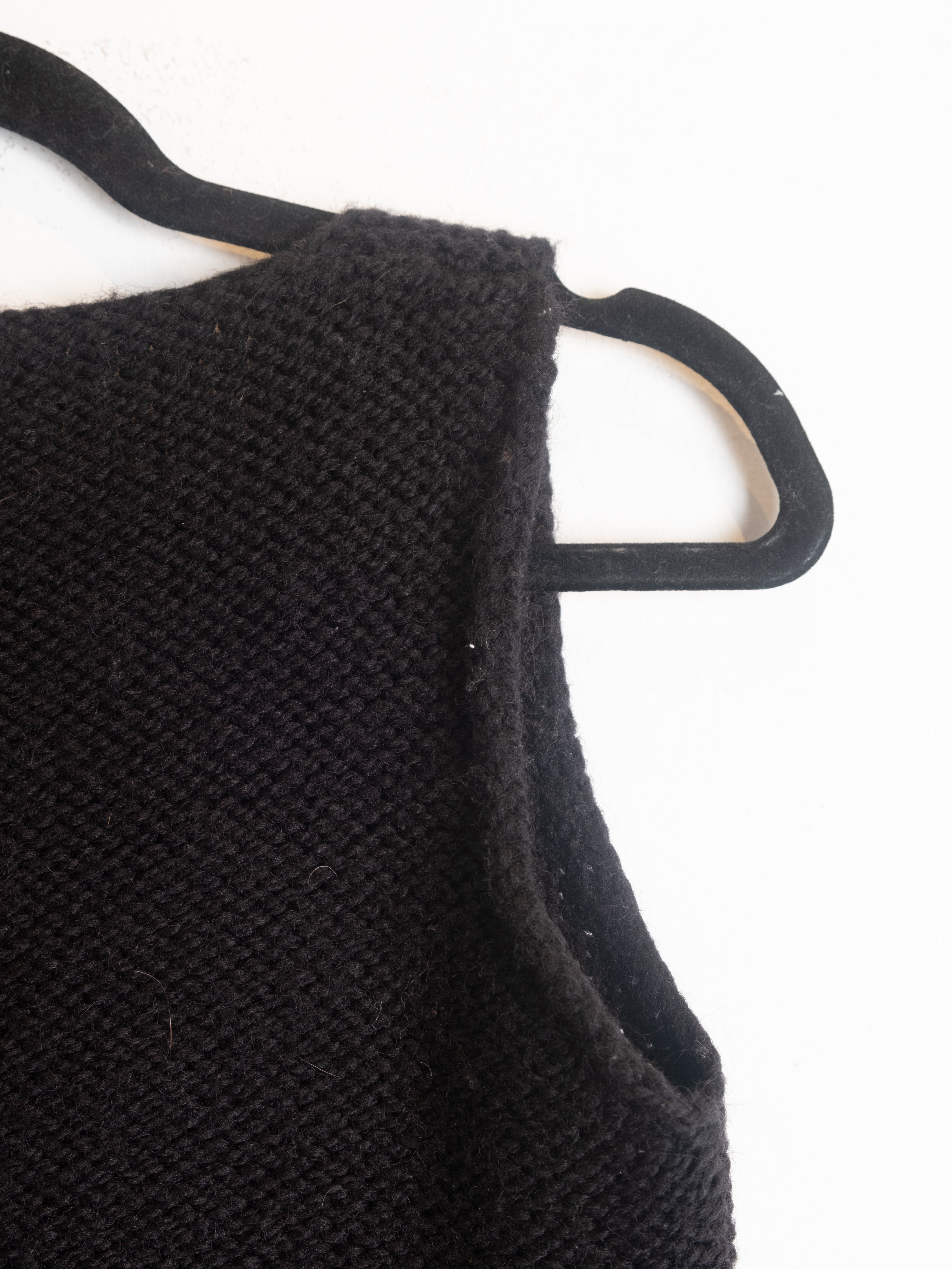 הווסט עשוי צמר רך ונעים למגע, בגוון שחור אחיד. מפתח V קדמי, סריגה אלסטית באזור המותן למראה מחמיא, וגימור נקי ואיכותי לכל אורכו. ללא מידה מצוינת על התווית.