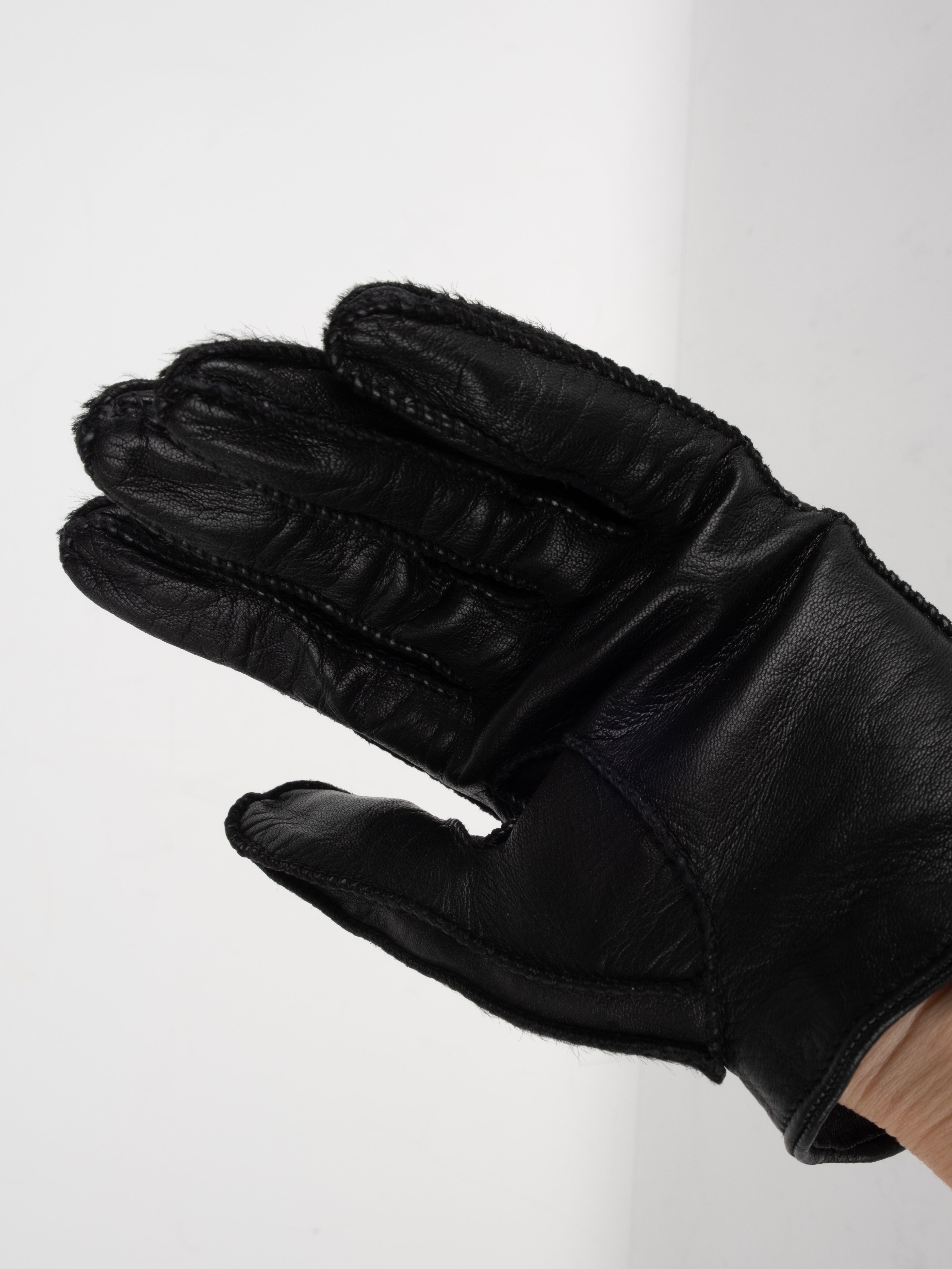 הכפפות עשויות עור שחור רך בחלק הפנימי, וחלק עליון סרוג מלא טקסטורה. גימור עור בקצה הכפפה, תפירה איכותית ומראה קלאסי.