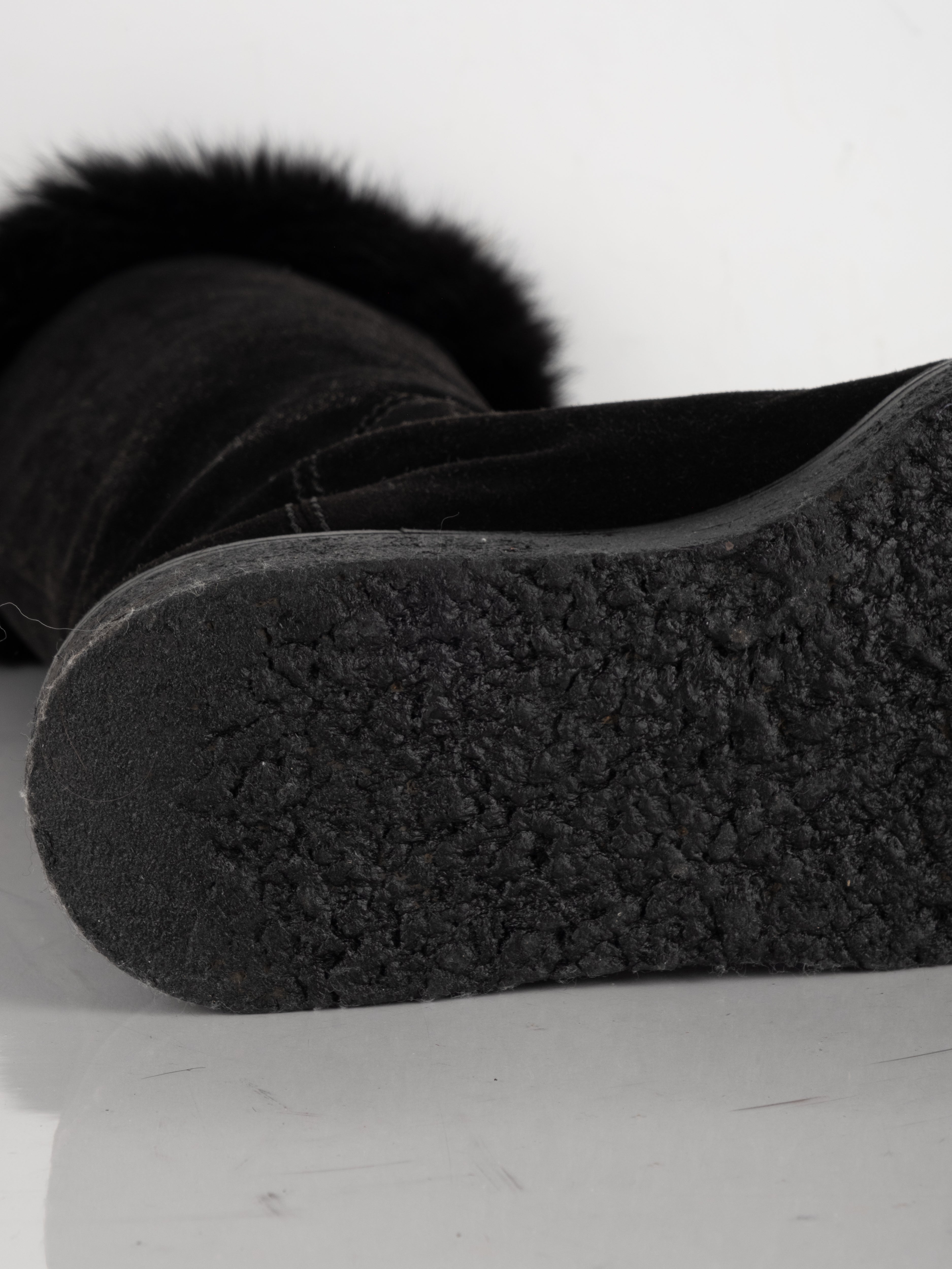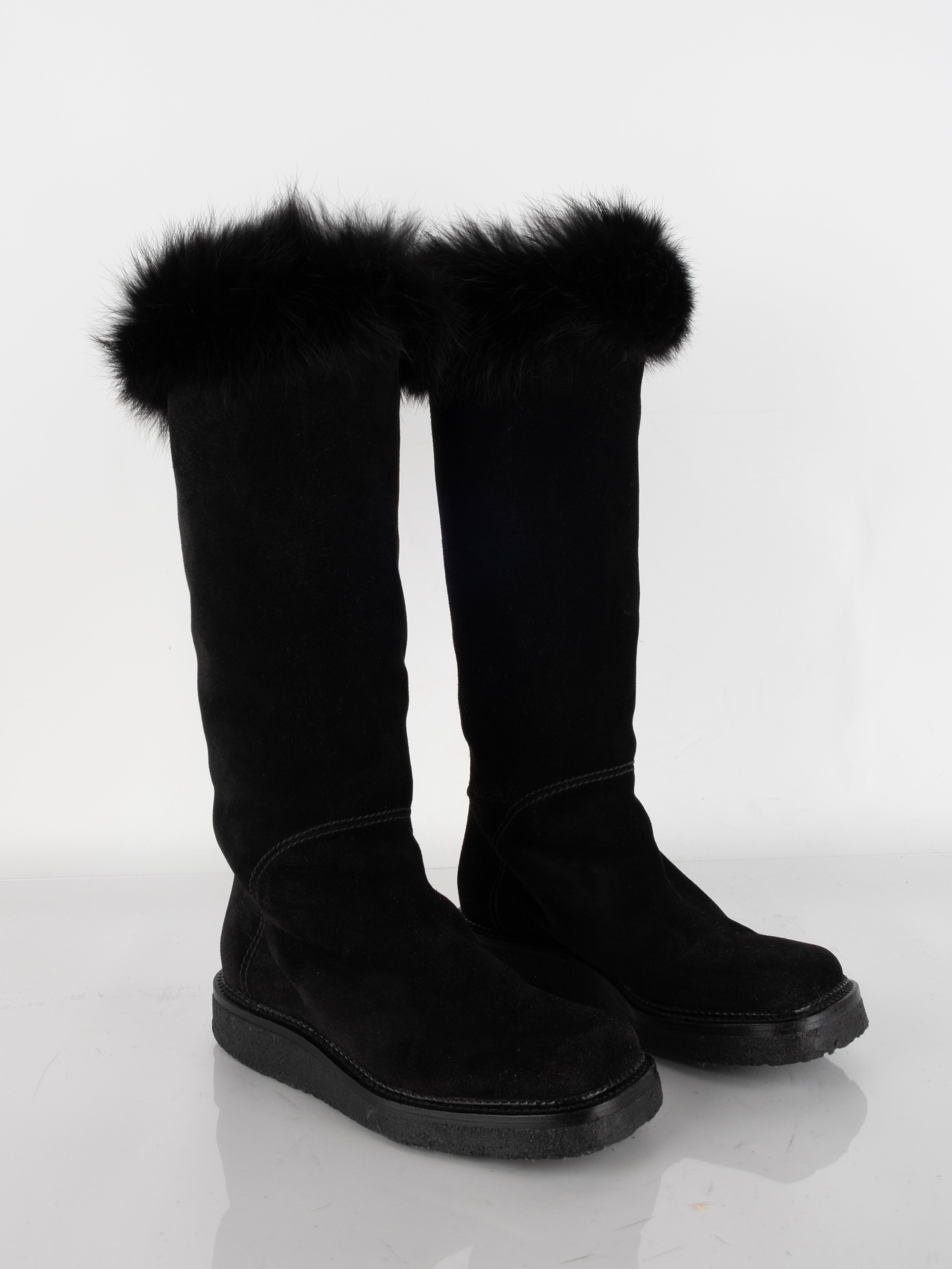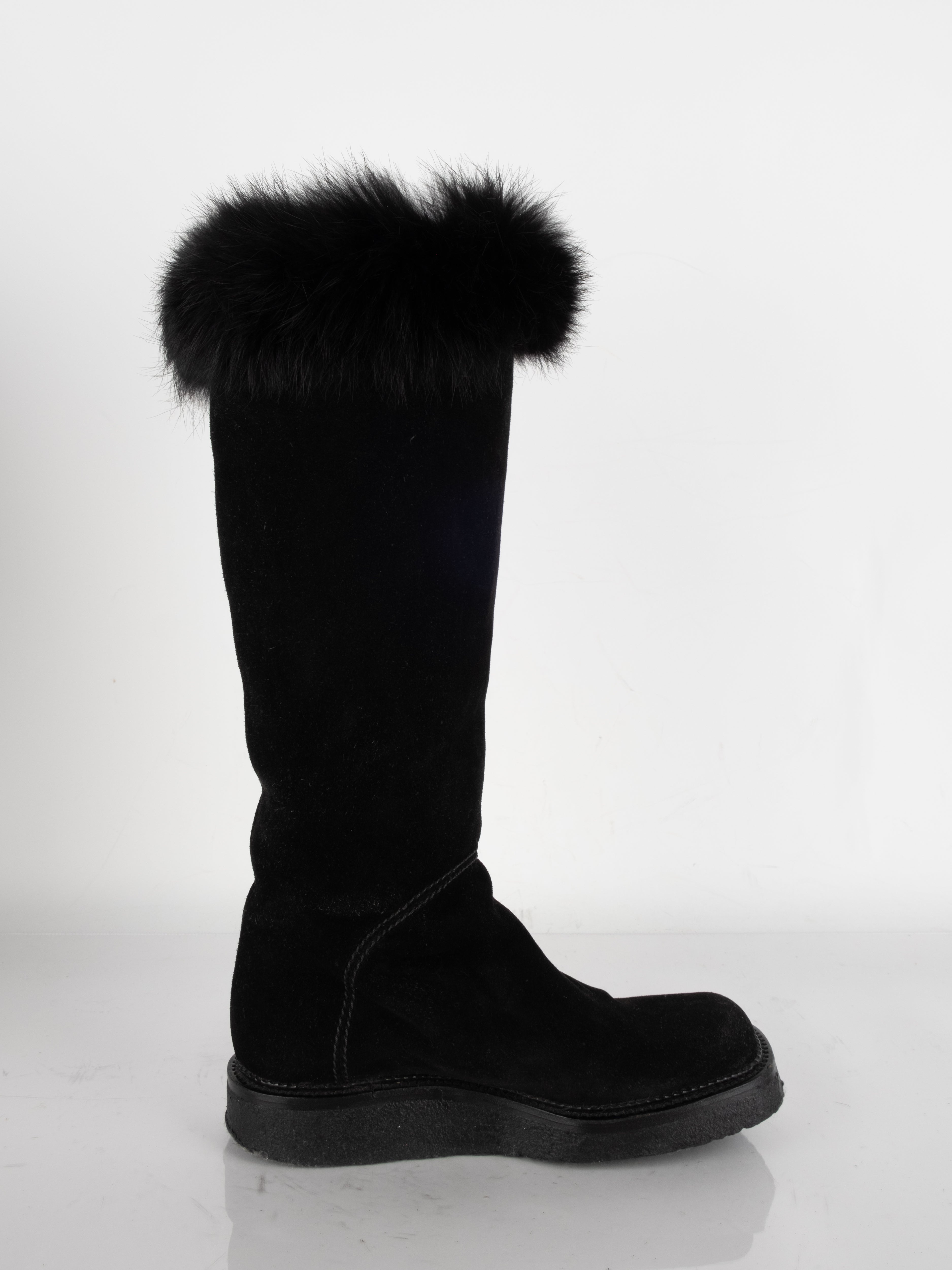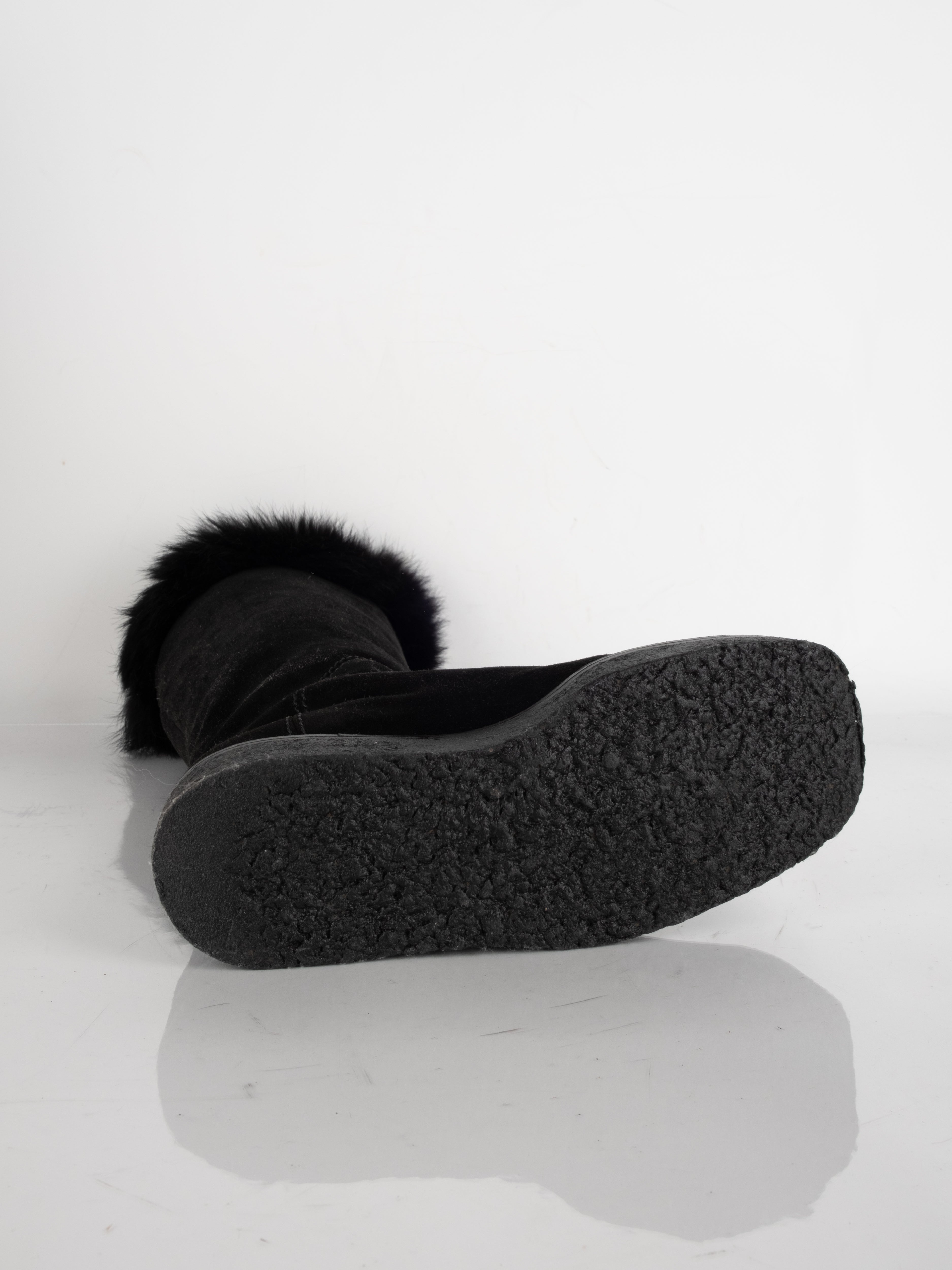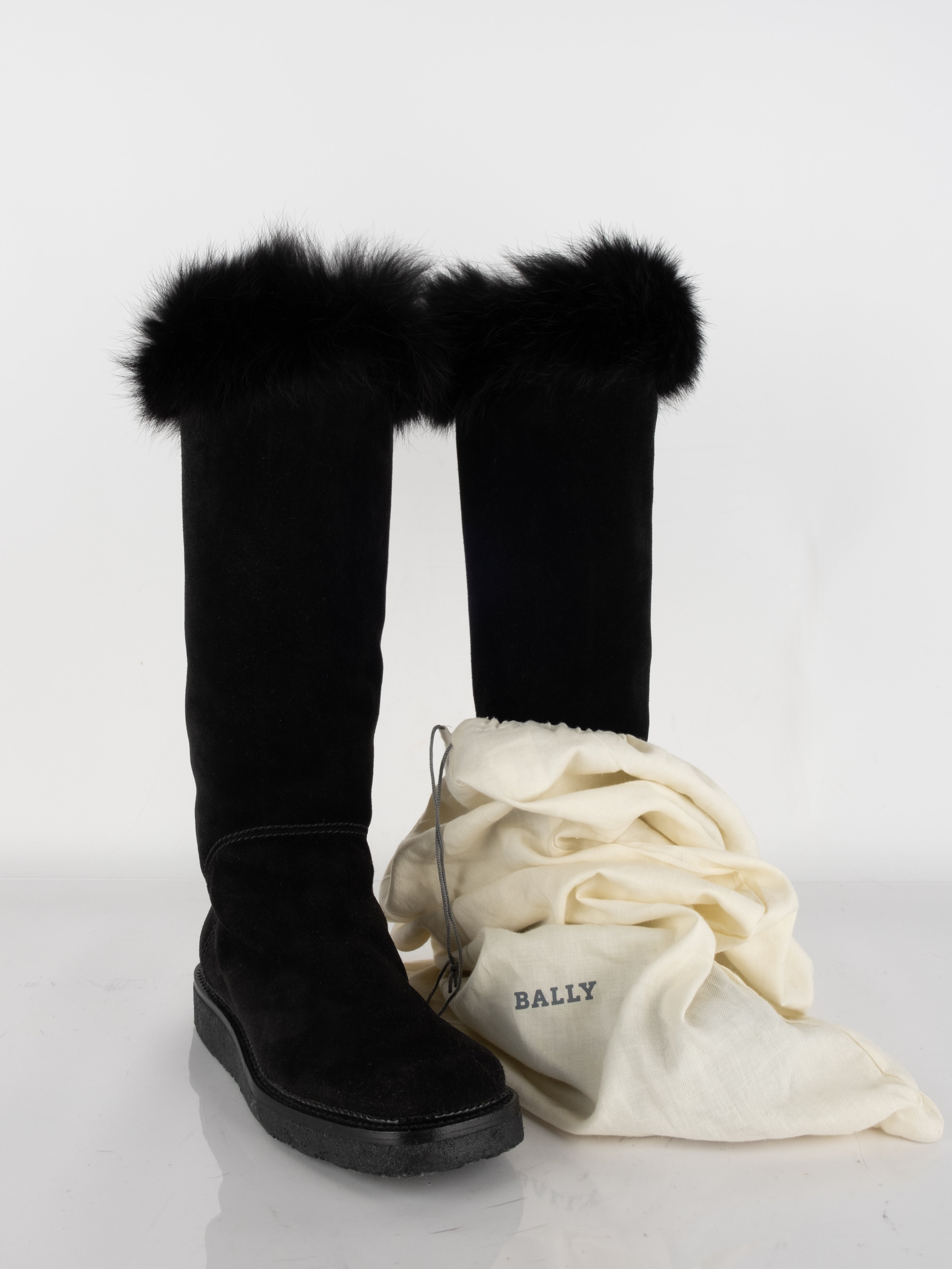 מגפי וינטג' יד שנייה של Bally, שחורים, עם קטרים של פרווה עשירה ורכה. המגפיים משלבים נוחות, עמידות וסגנון אלגנטי שמתאים הן ליום והן לערב — פריט חורפי מושלם.