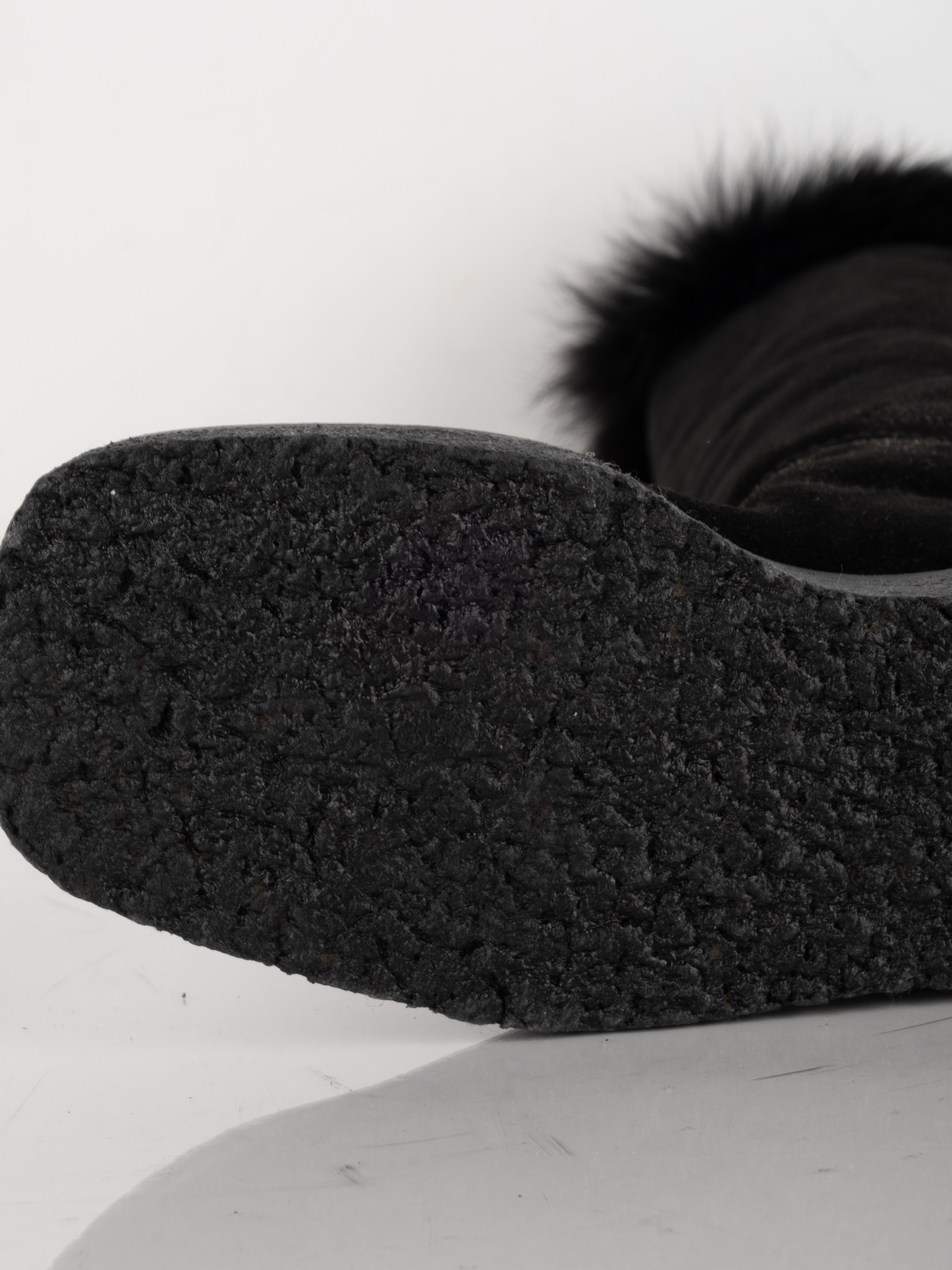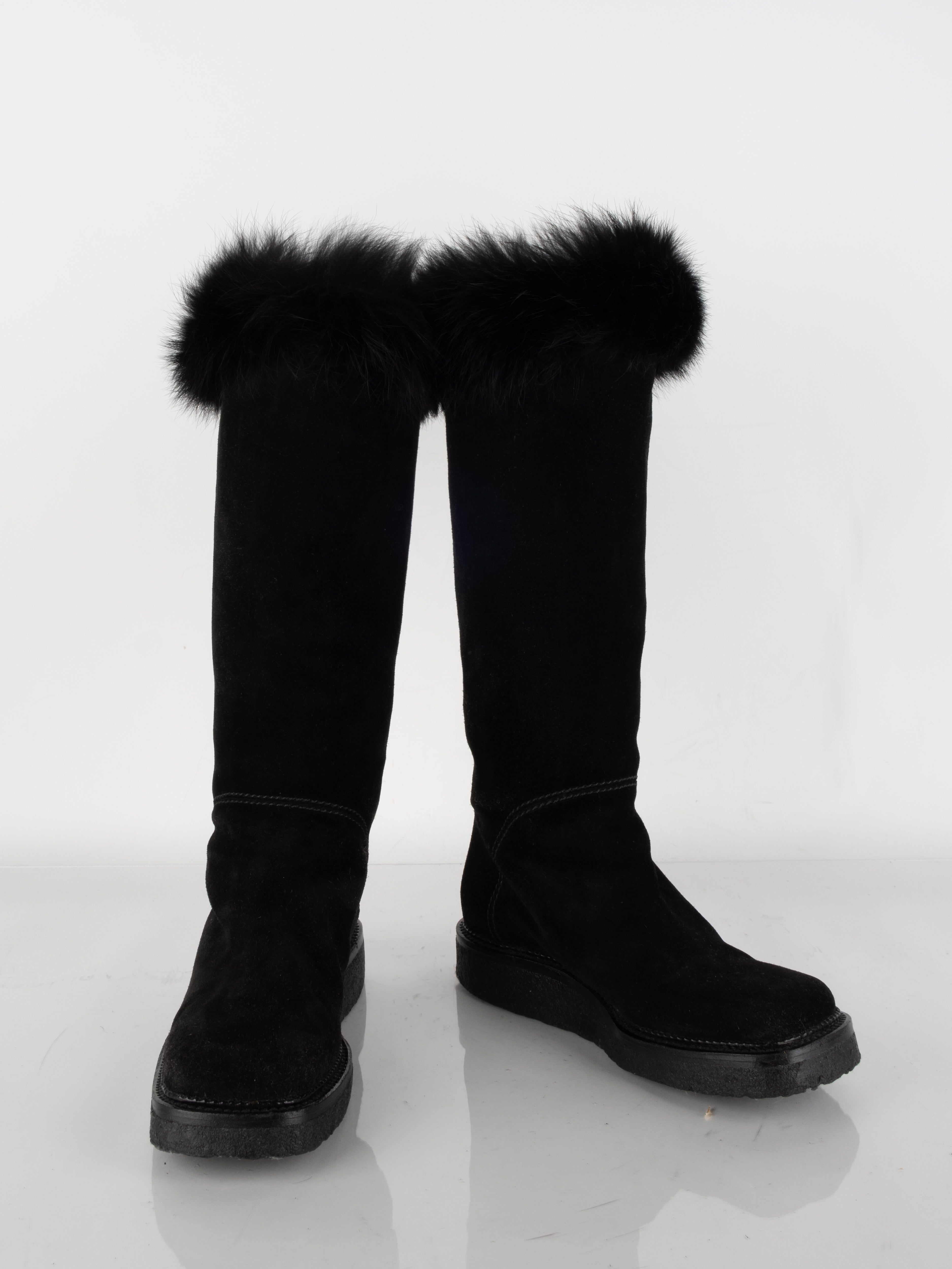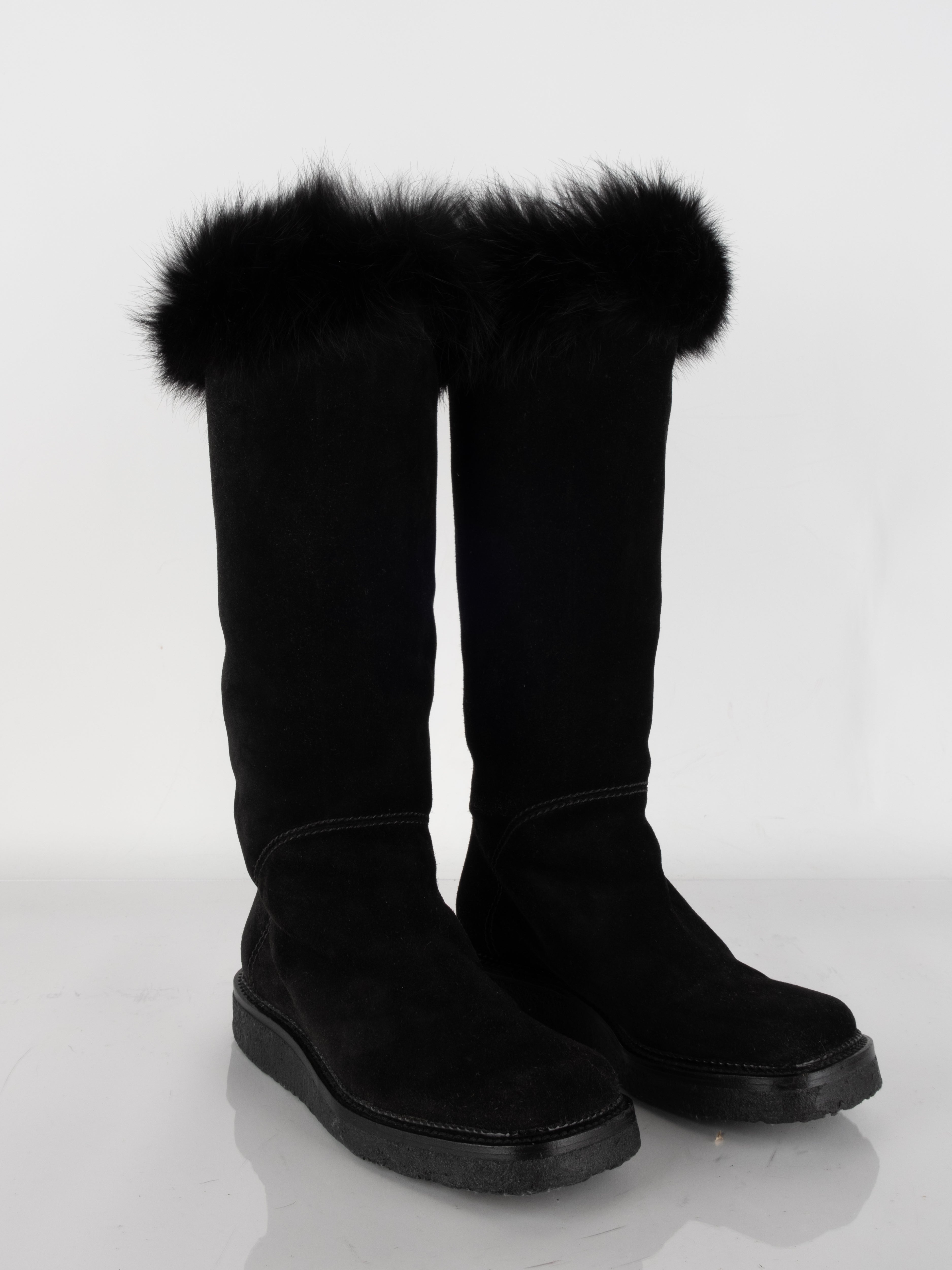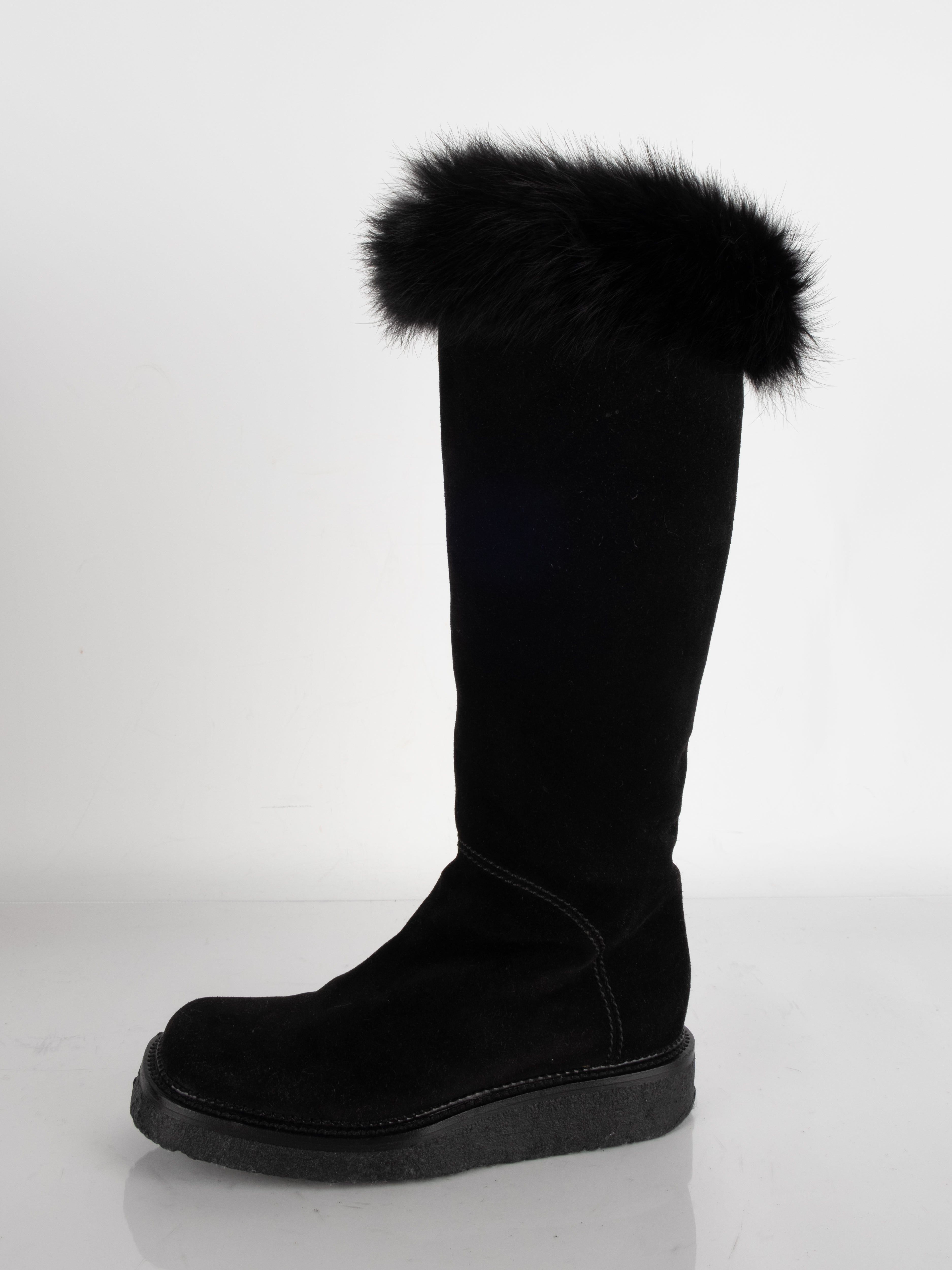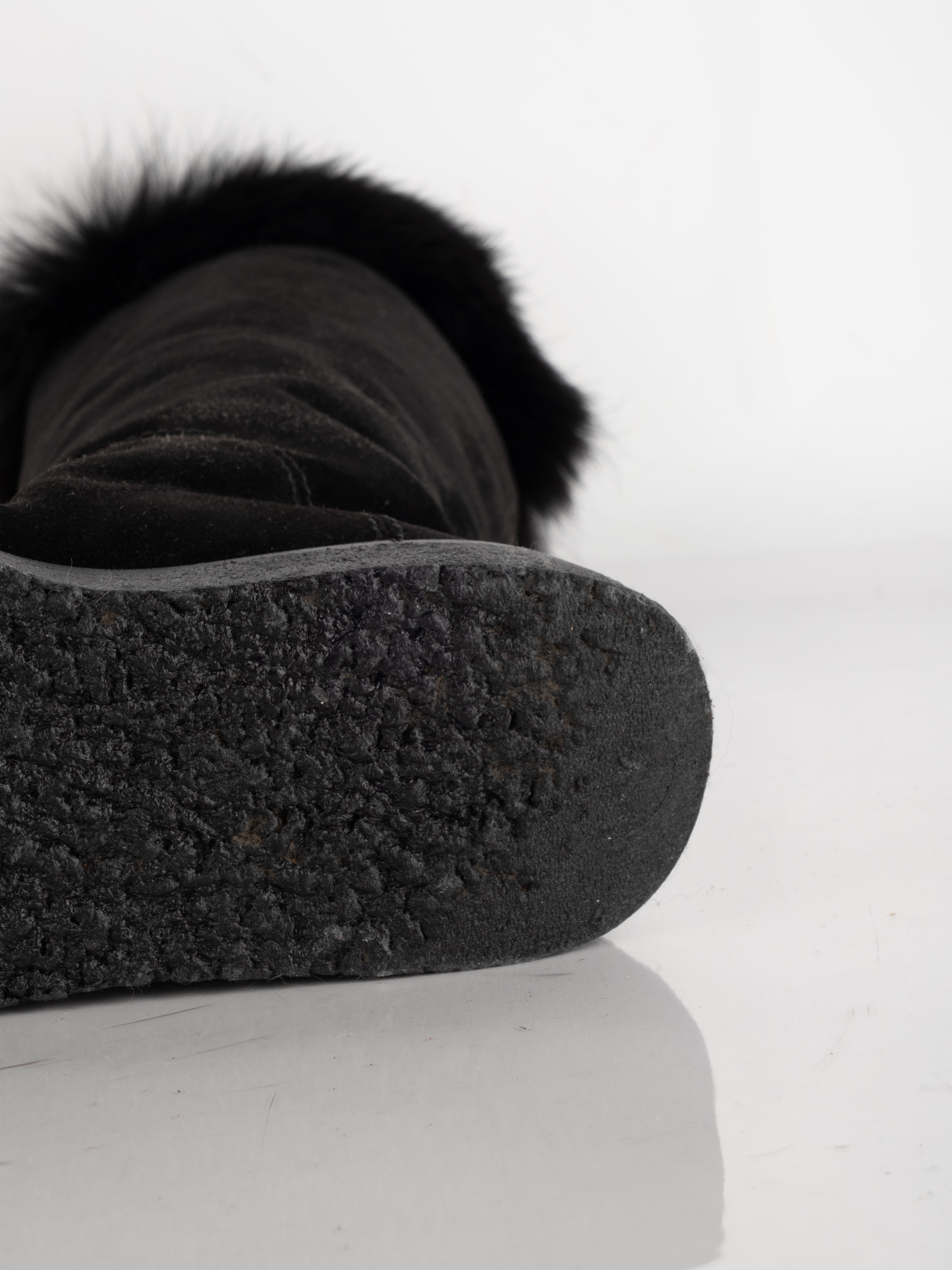 מגפי וינטג' יד שנייה של Bally, שחורים, עם קטרים של פרווה עשירה ורכה. המגפיים משלבים נוחות, עמידות וסגנון אלגנטי שמתאים הן ליום והן לערב — פריט חורפי מושלם.