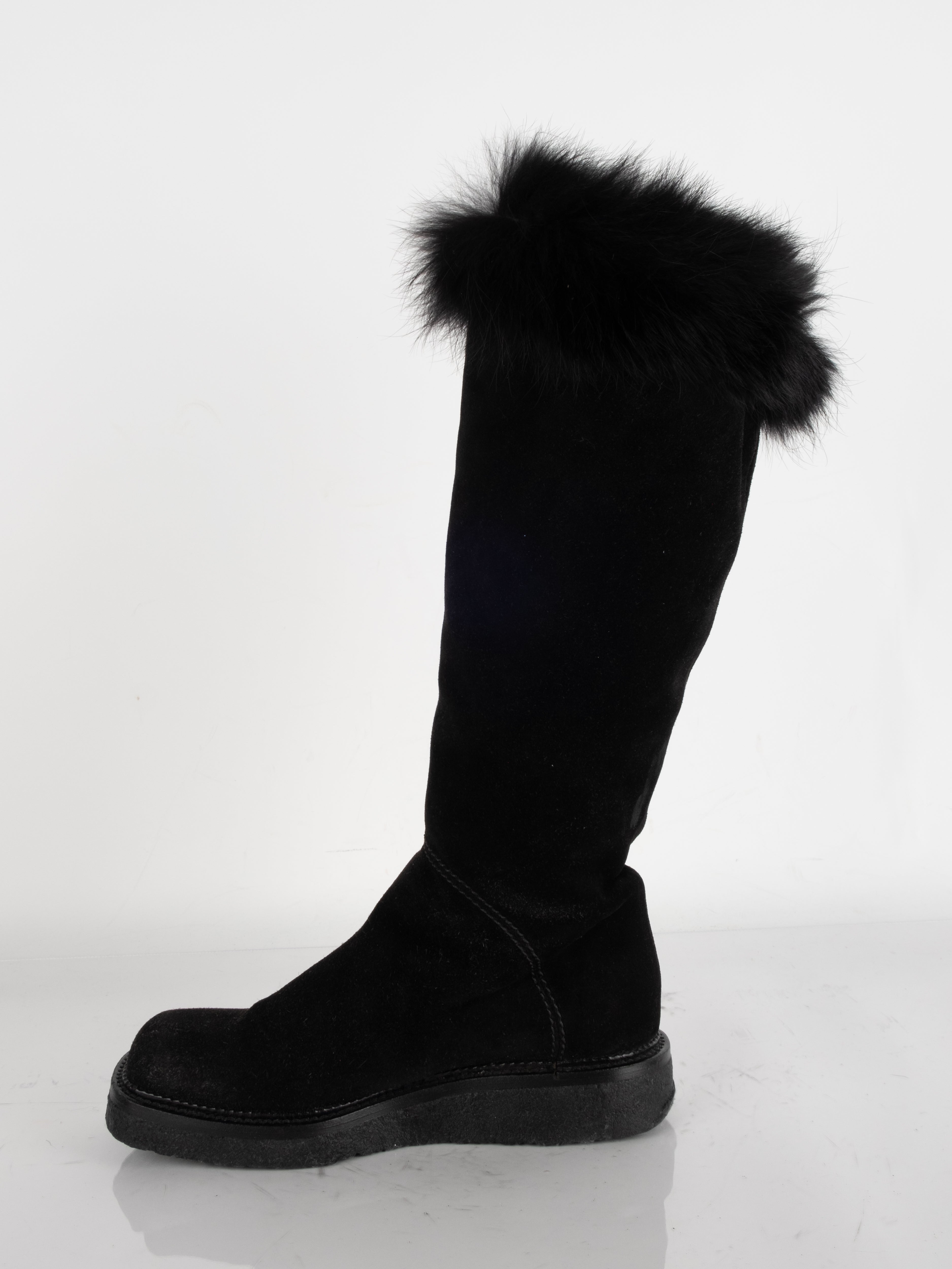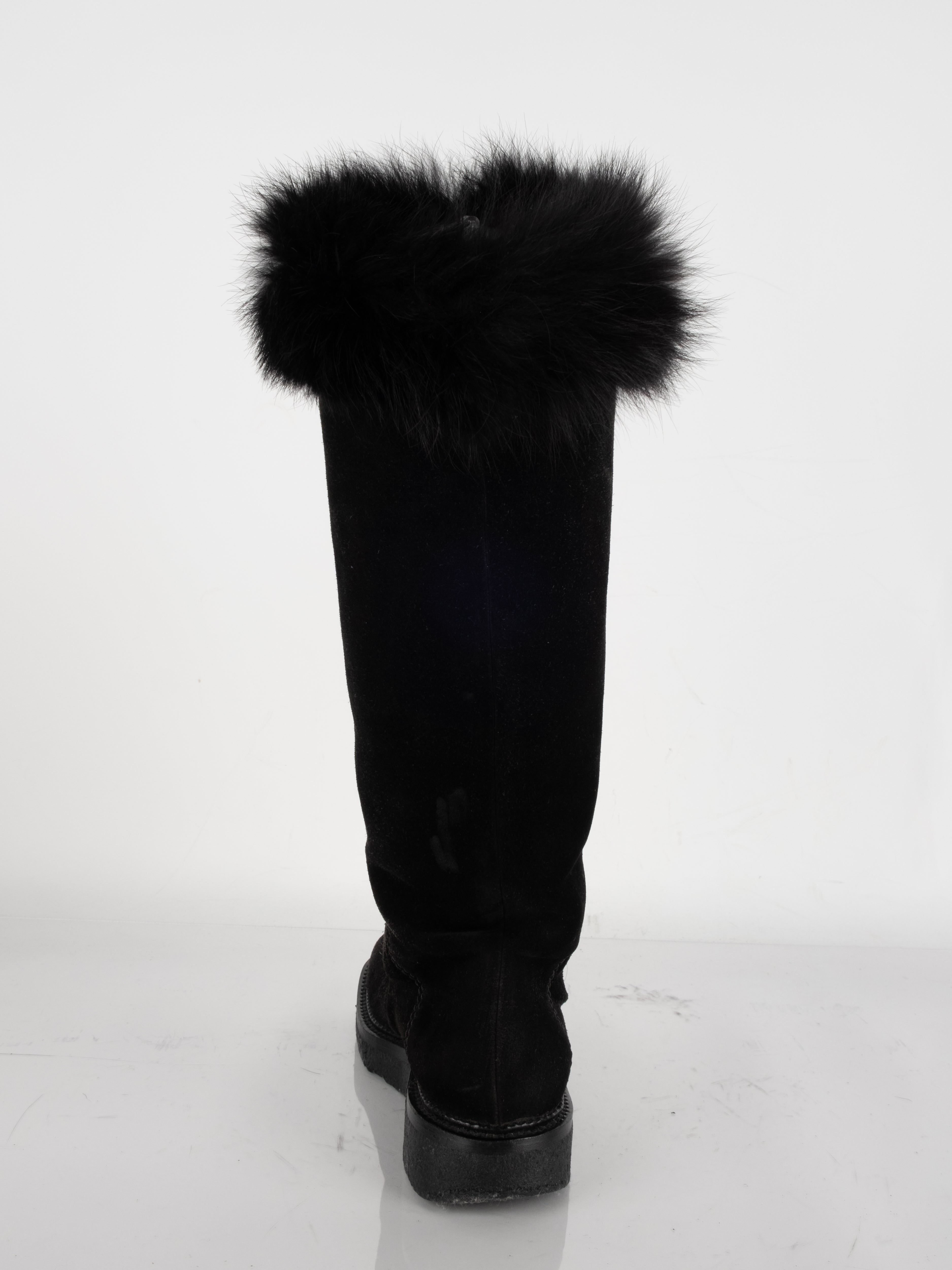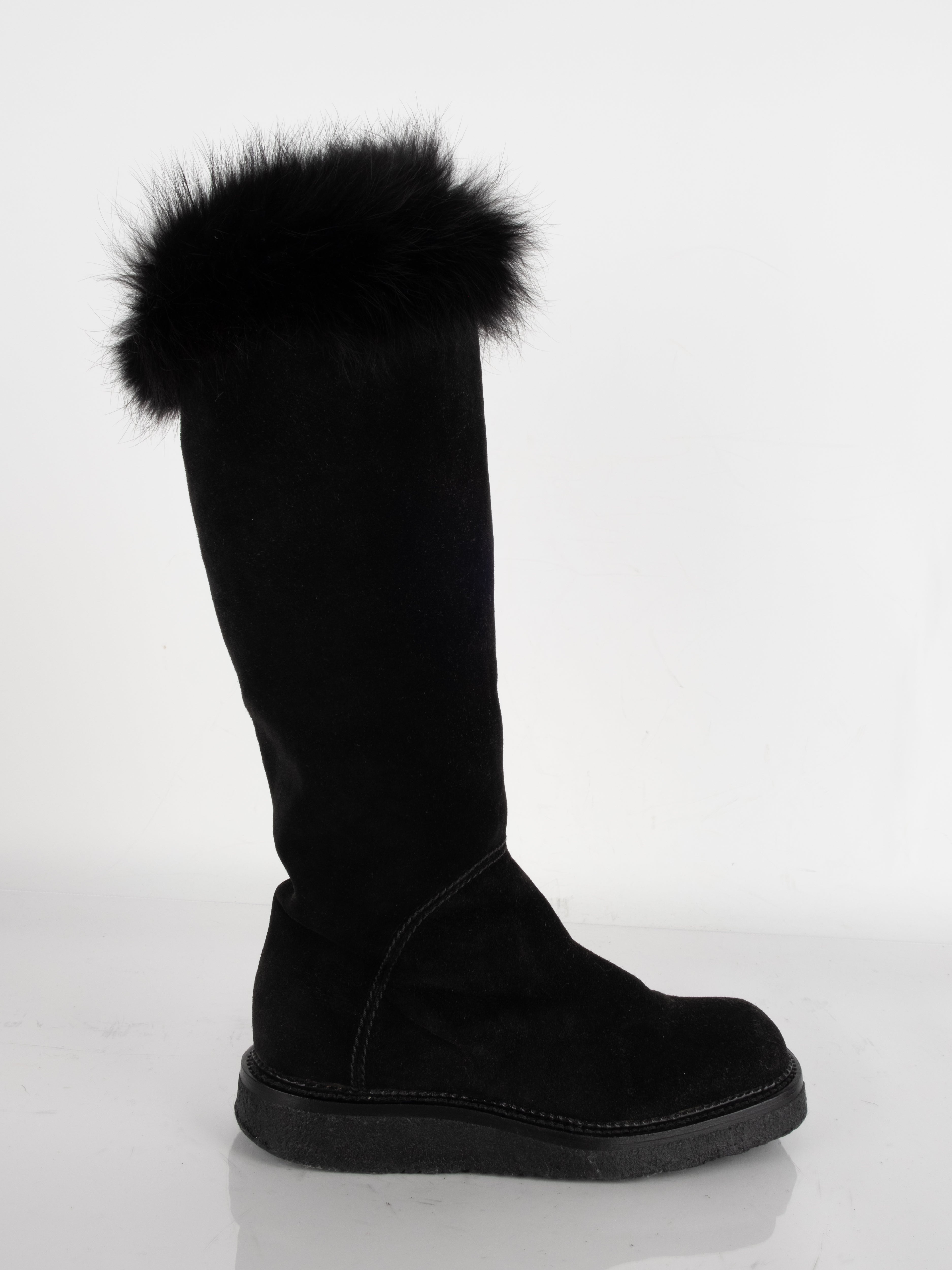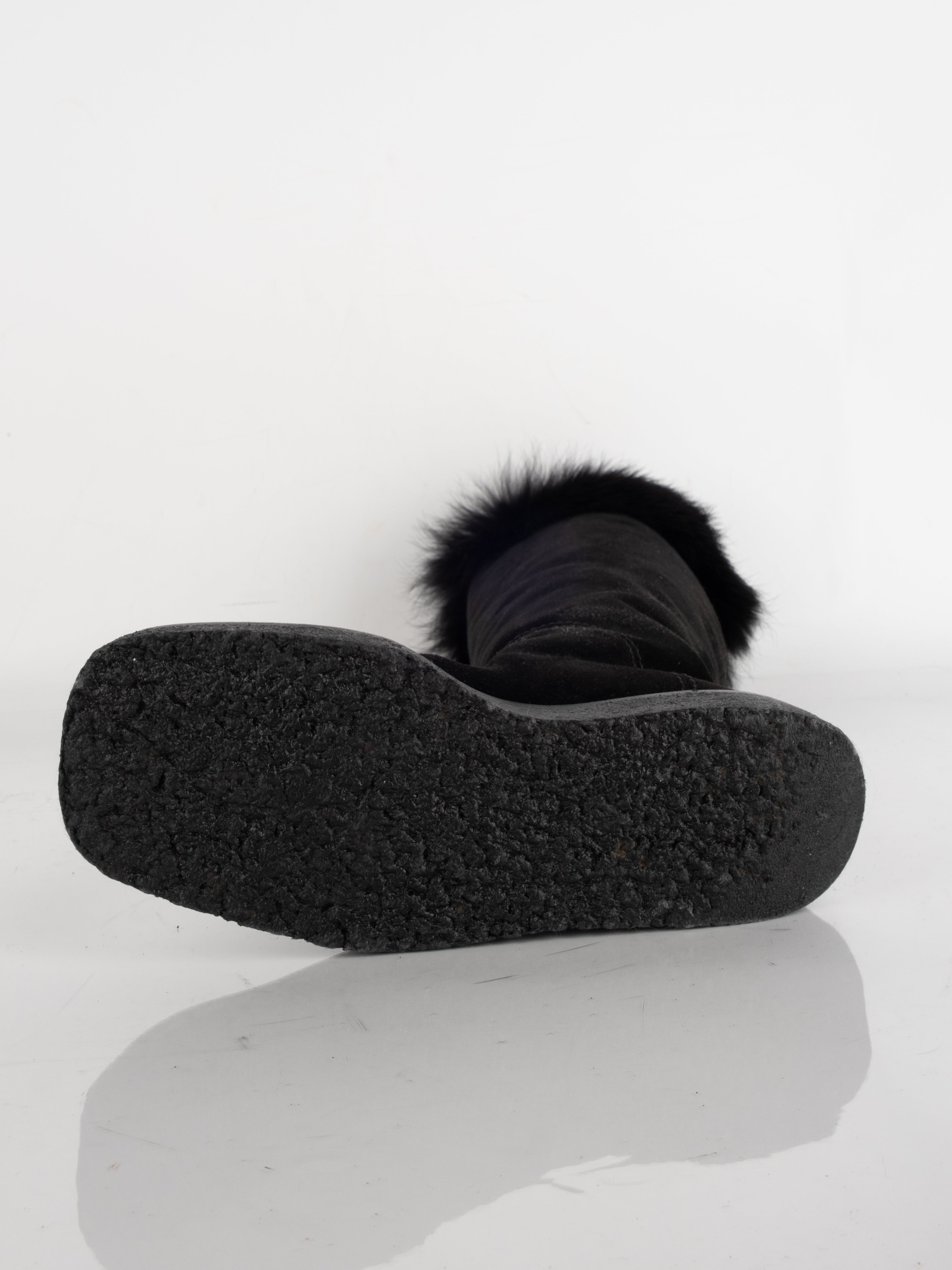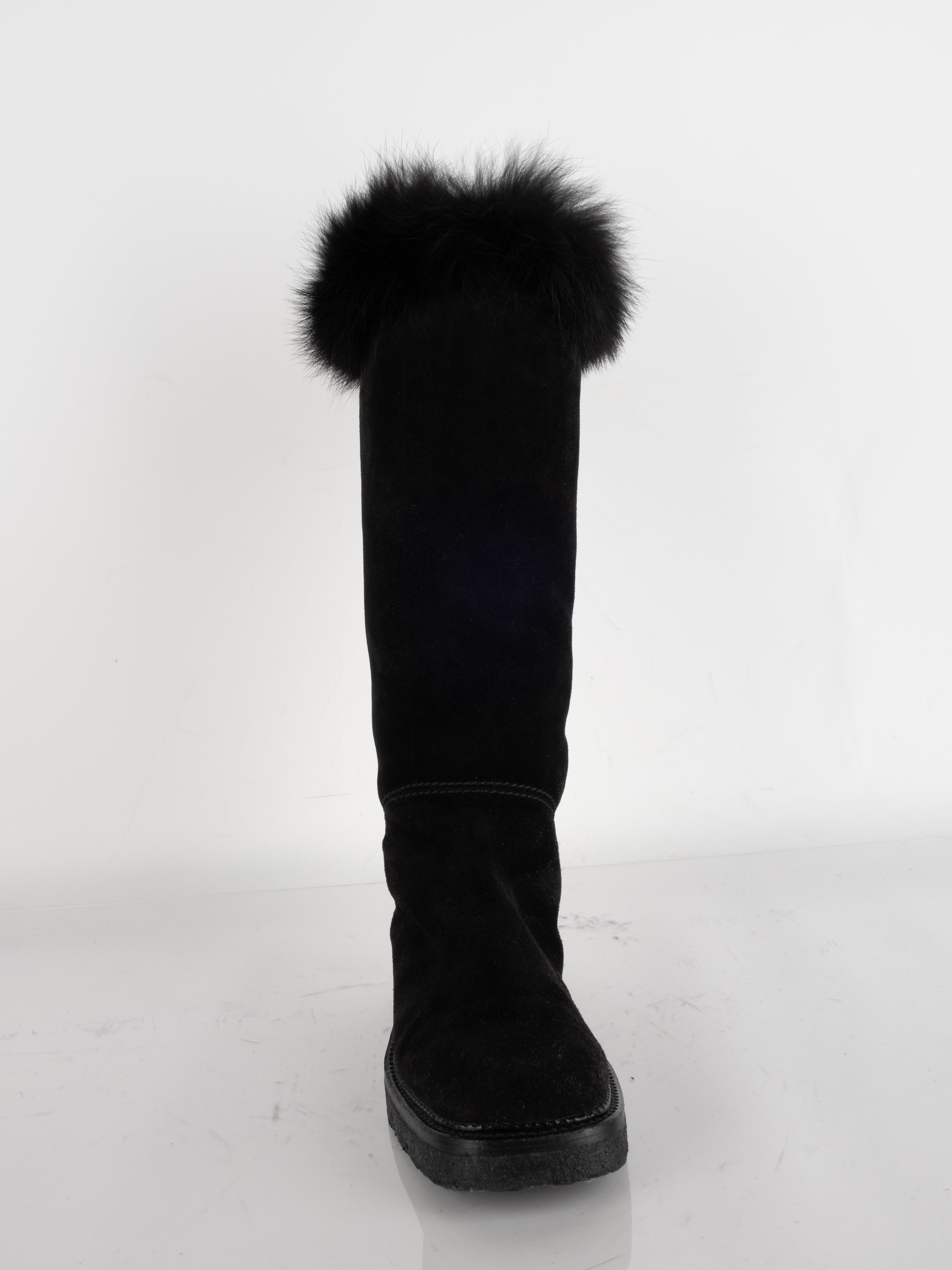 מגפי וינטג' יד שנייה של Bally, שחורים, עם קטרים של פרווה עשירה ורכה. המגפיים משלבים נוחות, עמידות וסגנון אלגנטי שמתאים הן ליום והן לערב — פריט חורפי מושלם.