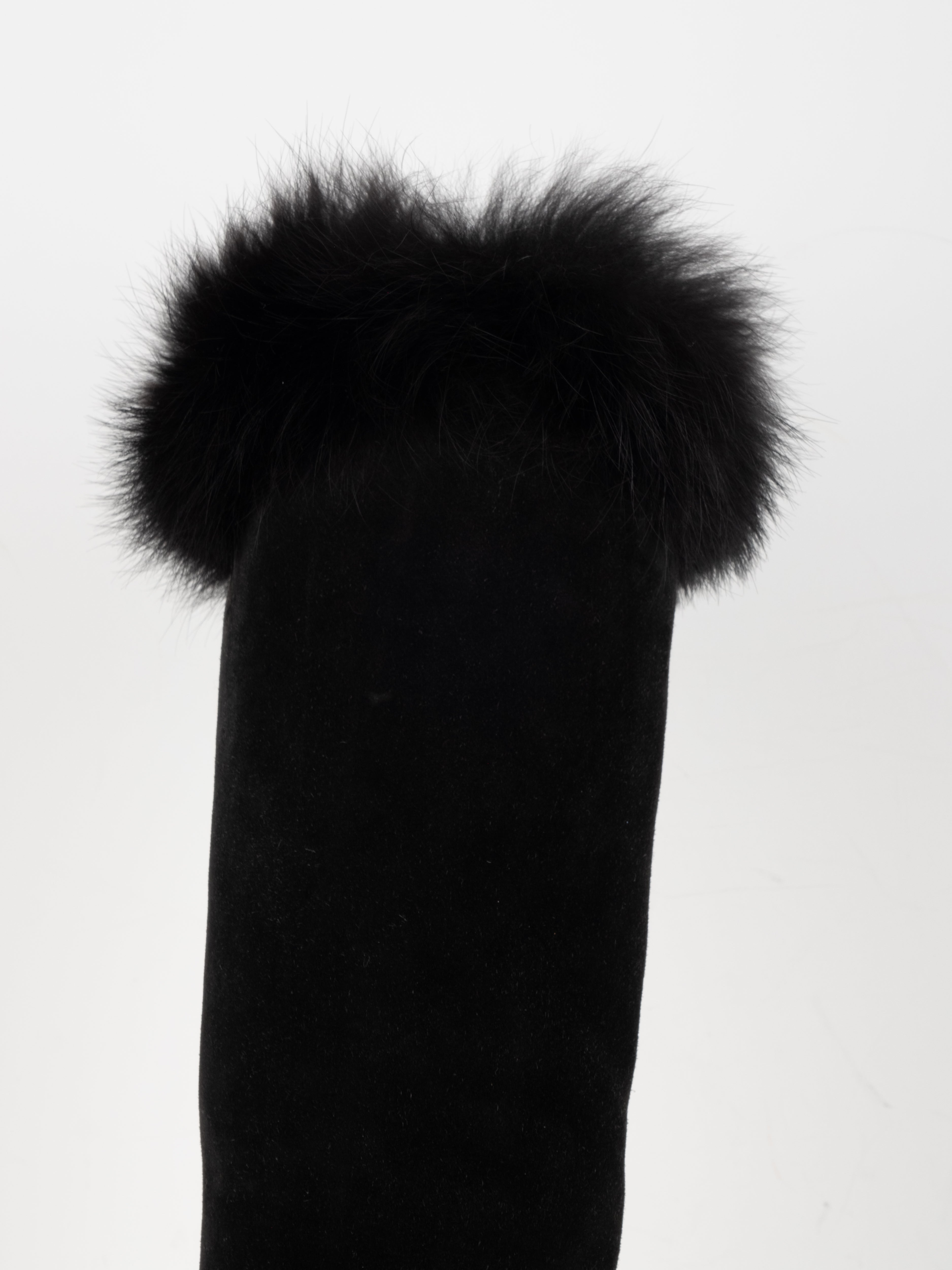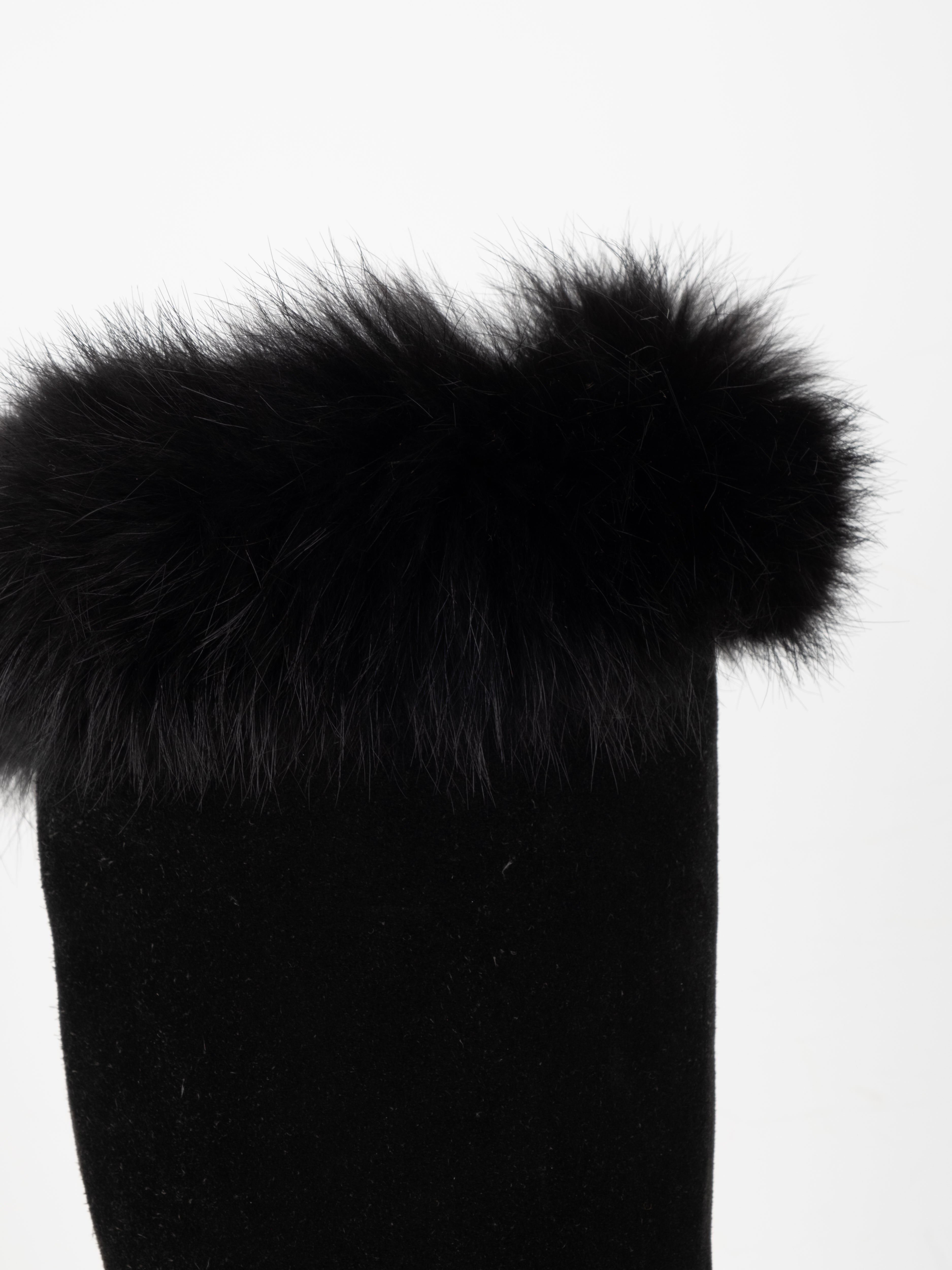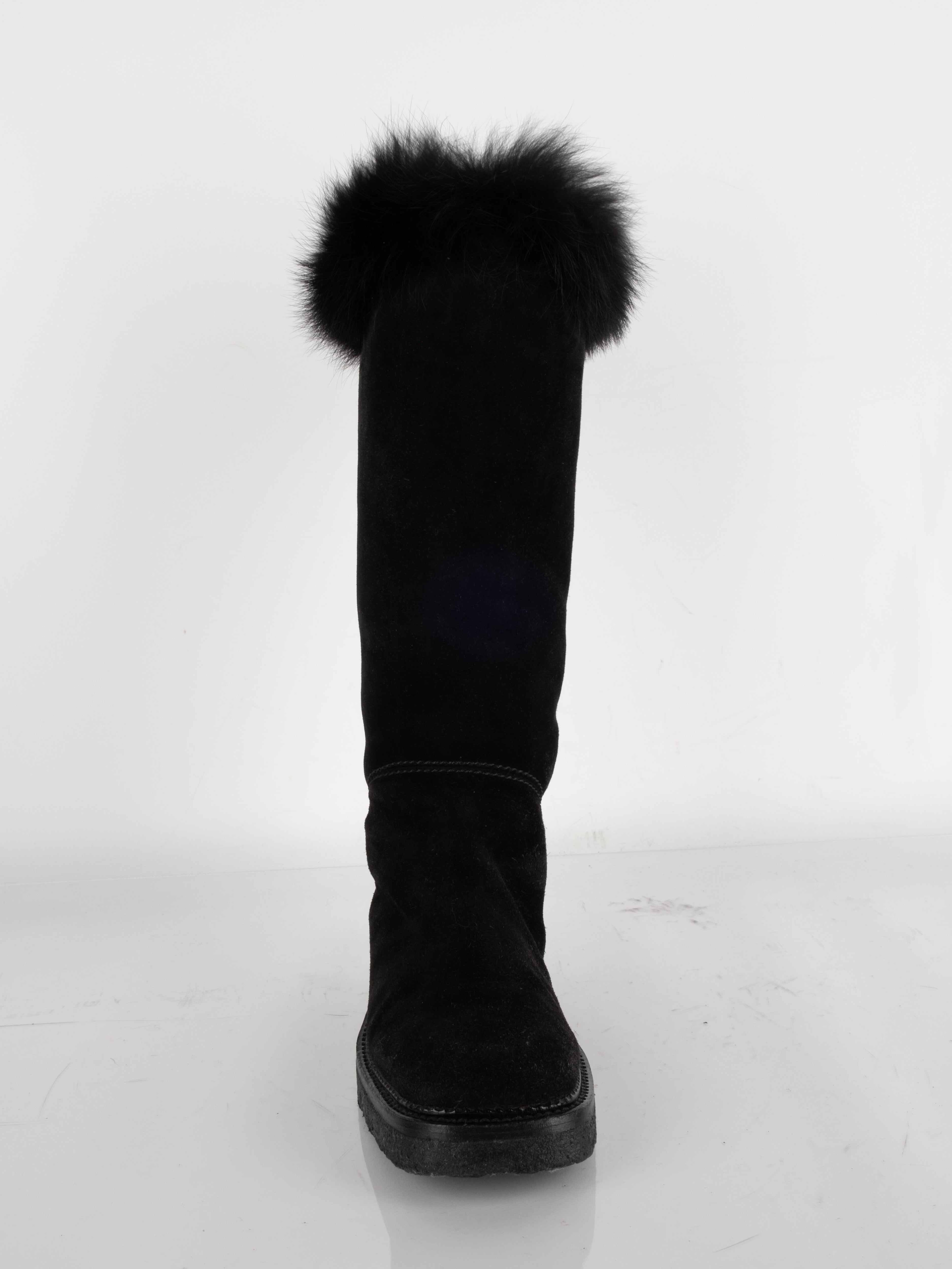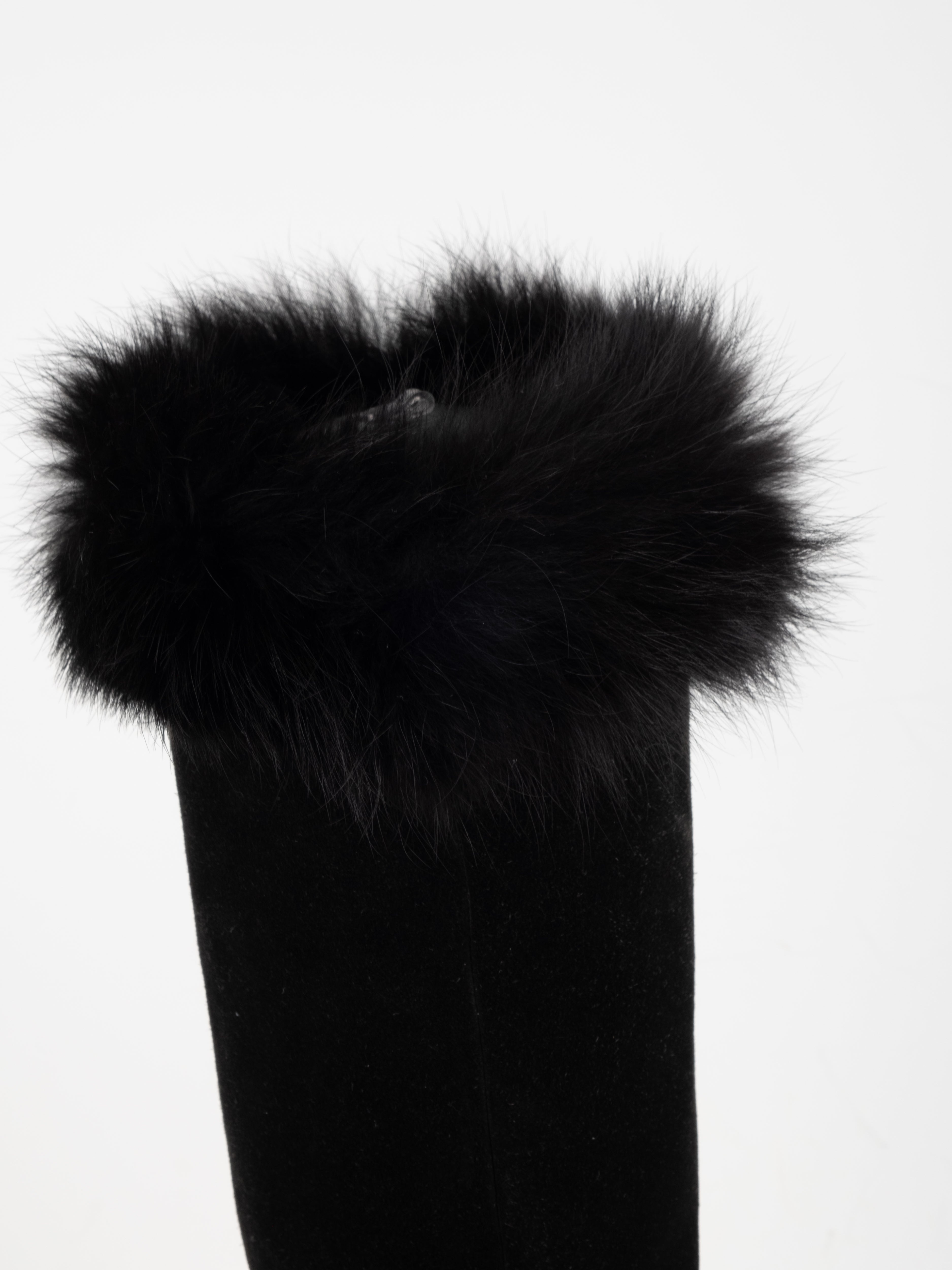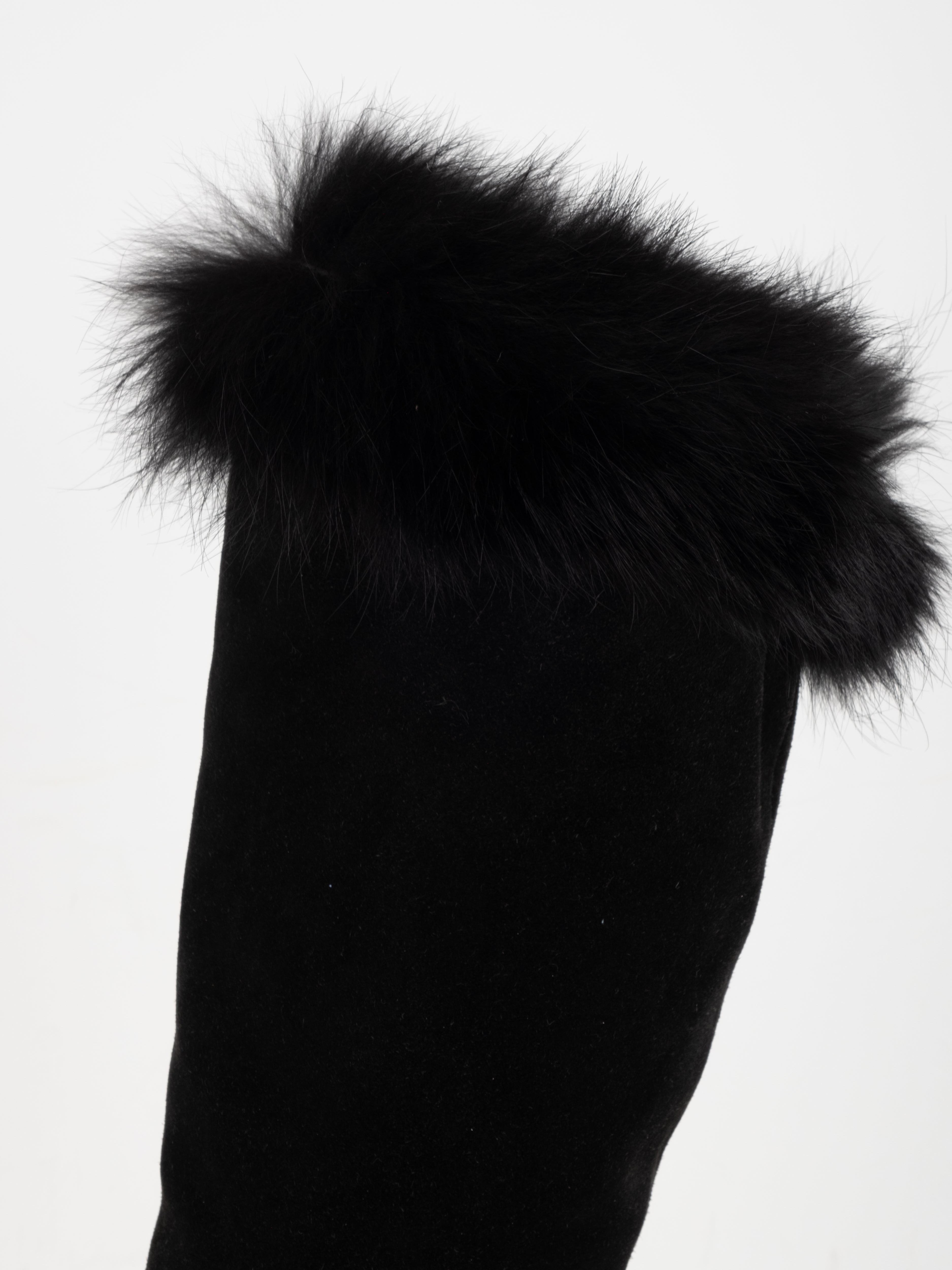 מגפי וינטג' יד שנייה של Bally, שחורים, עם קטרים של פרווה עשירה ורכה. המגפיים משלבים נוחות, עמידות וסגנון אלגנטי שמתאים הן ליום והן לערב — פריט חורפי מושלם.