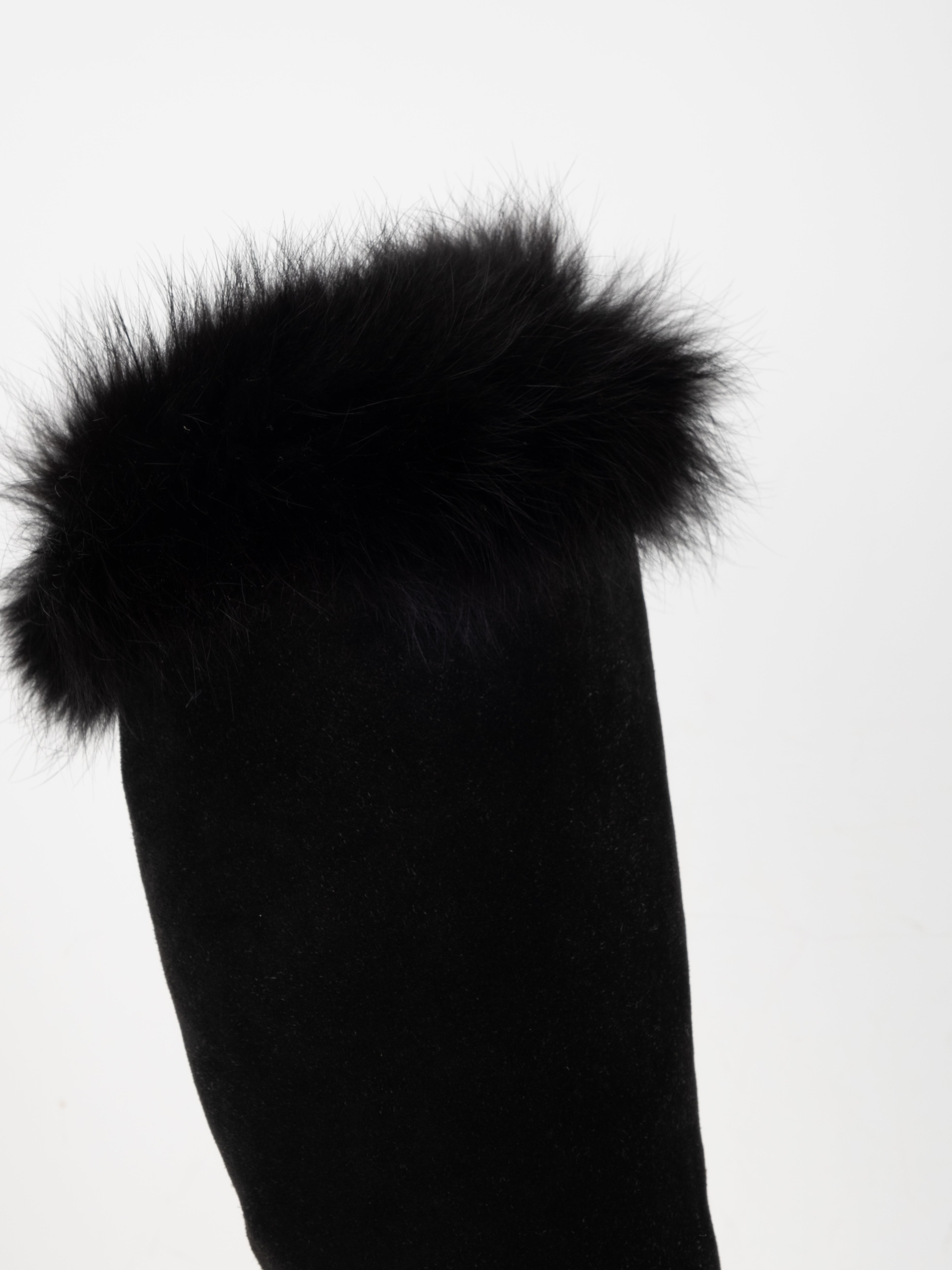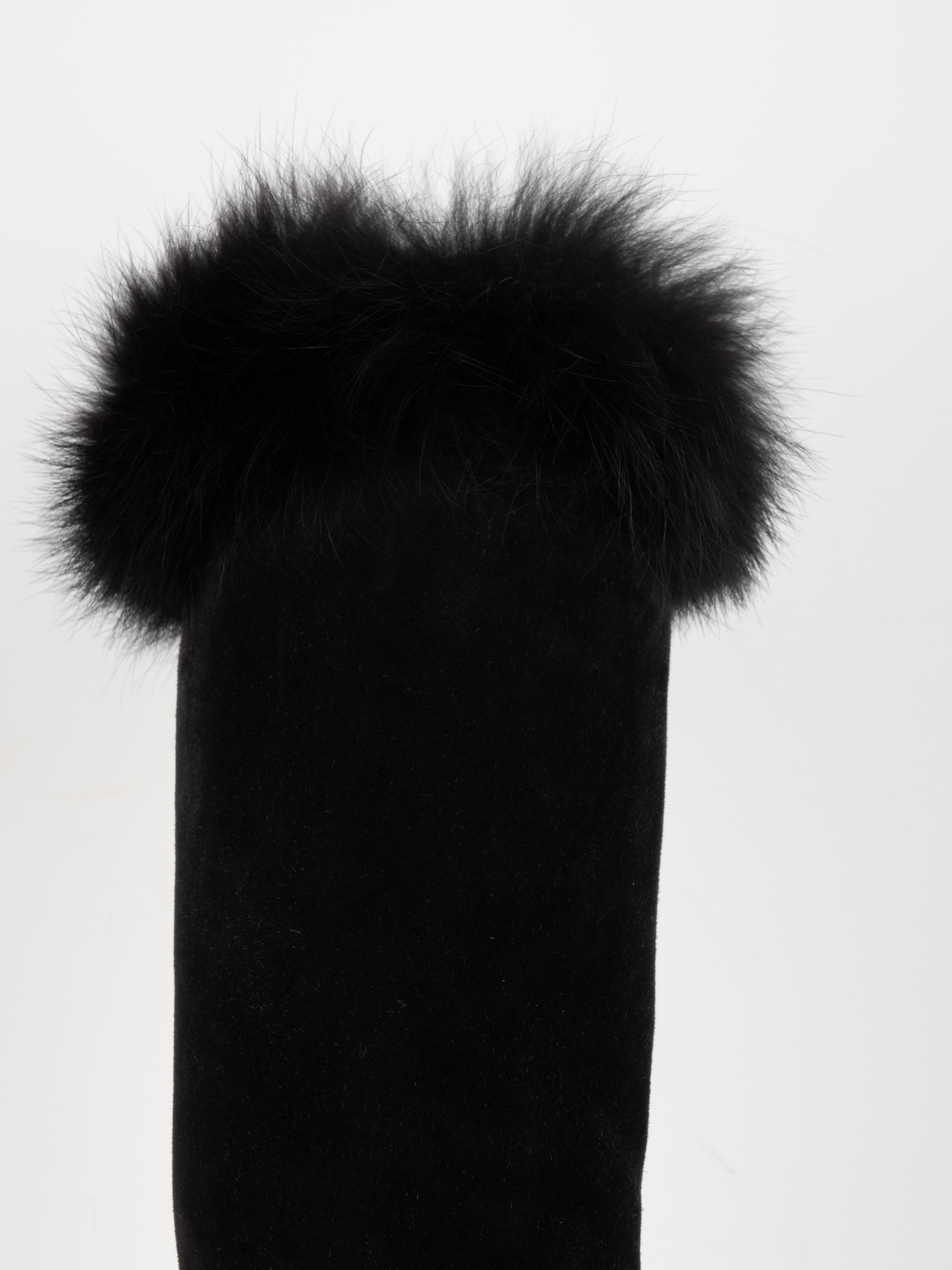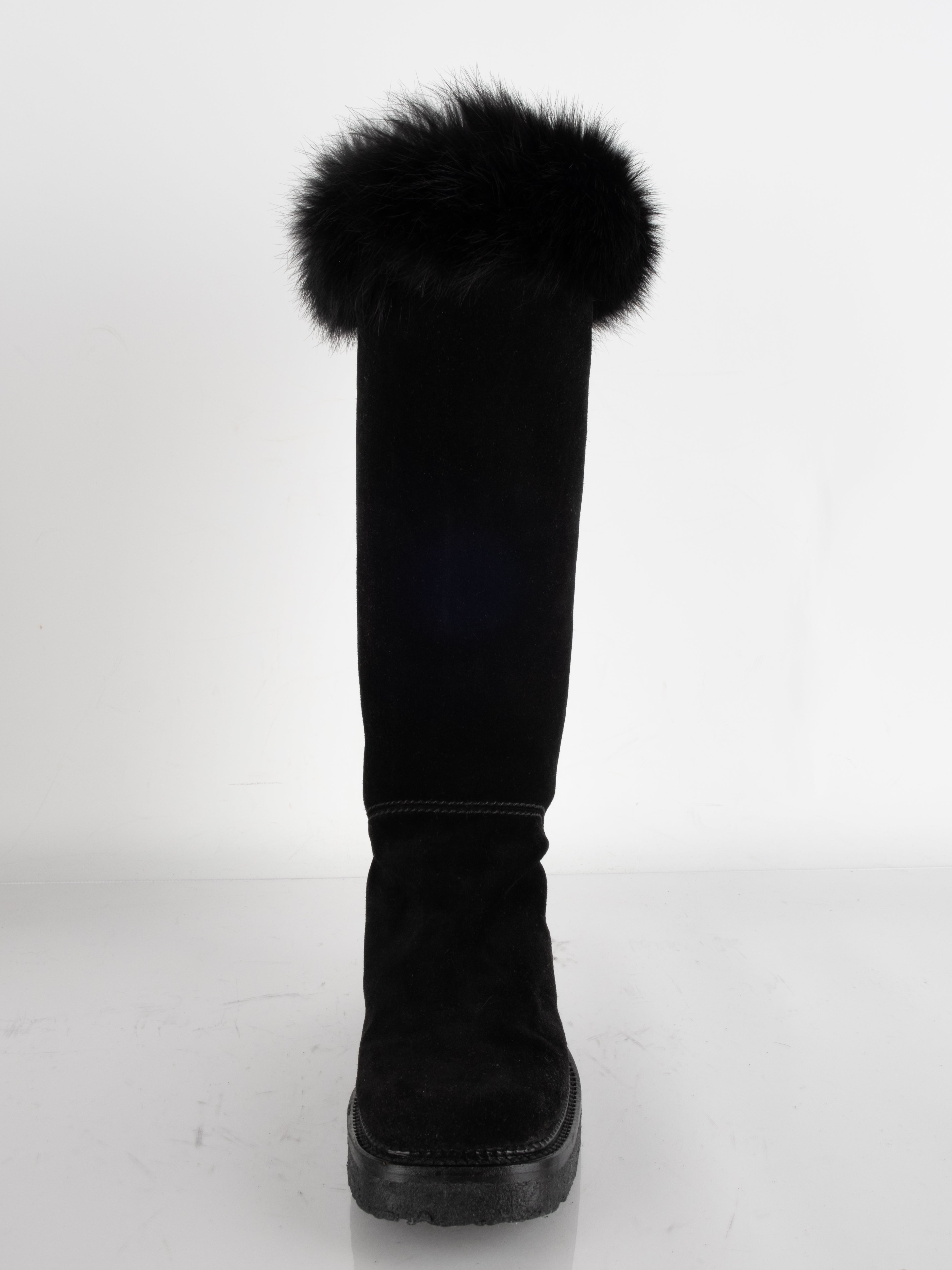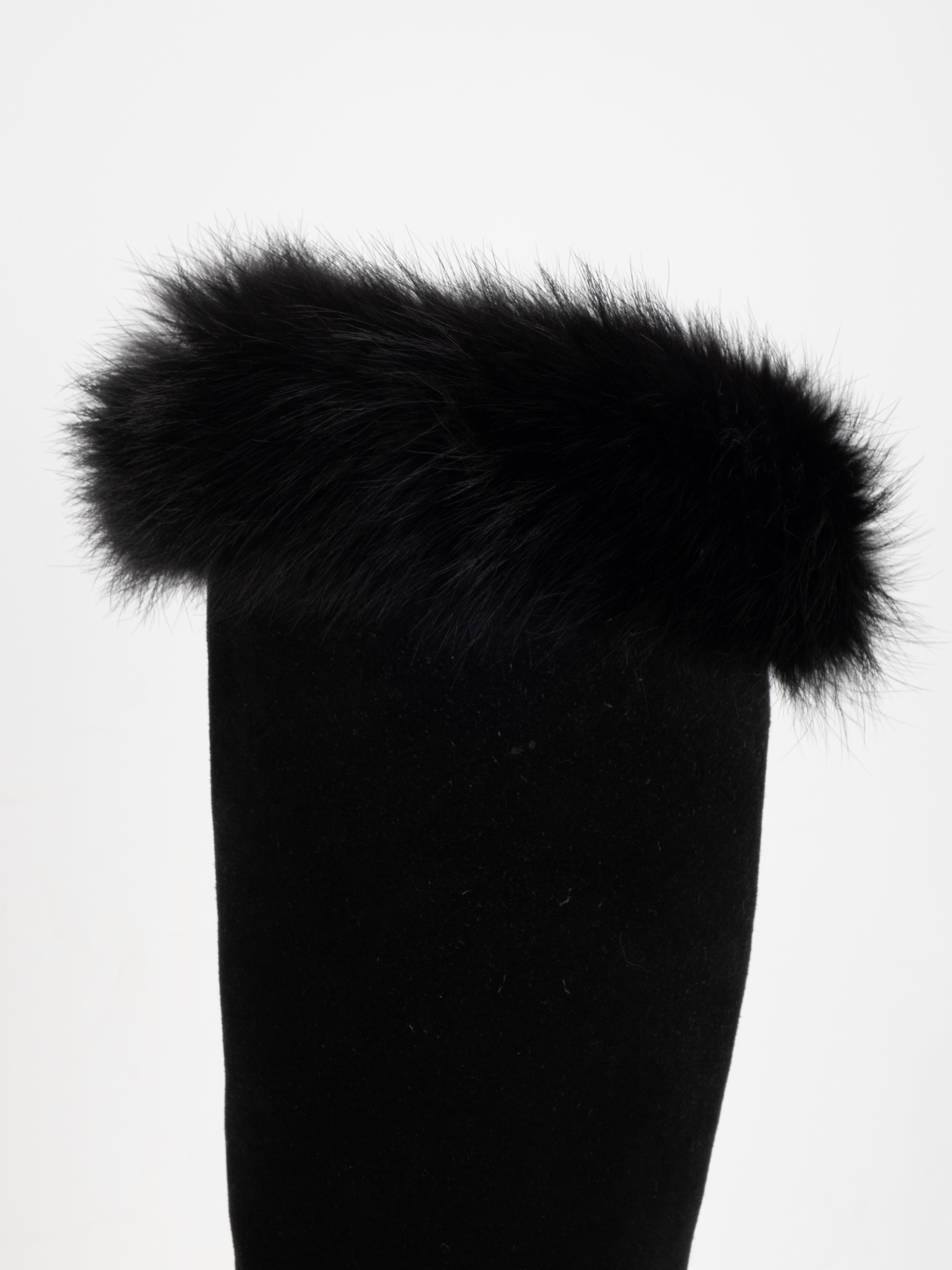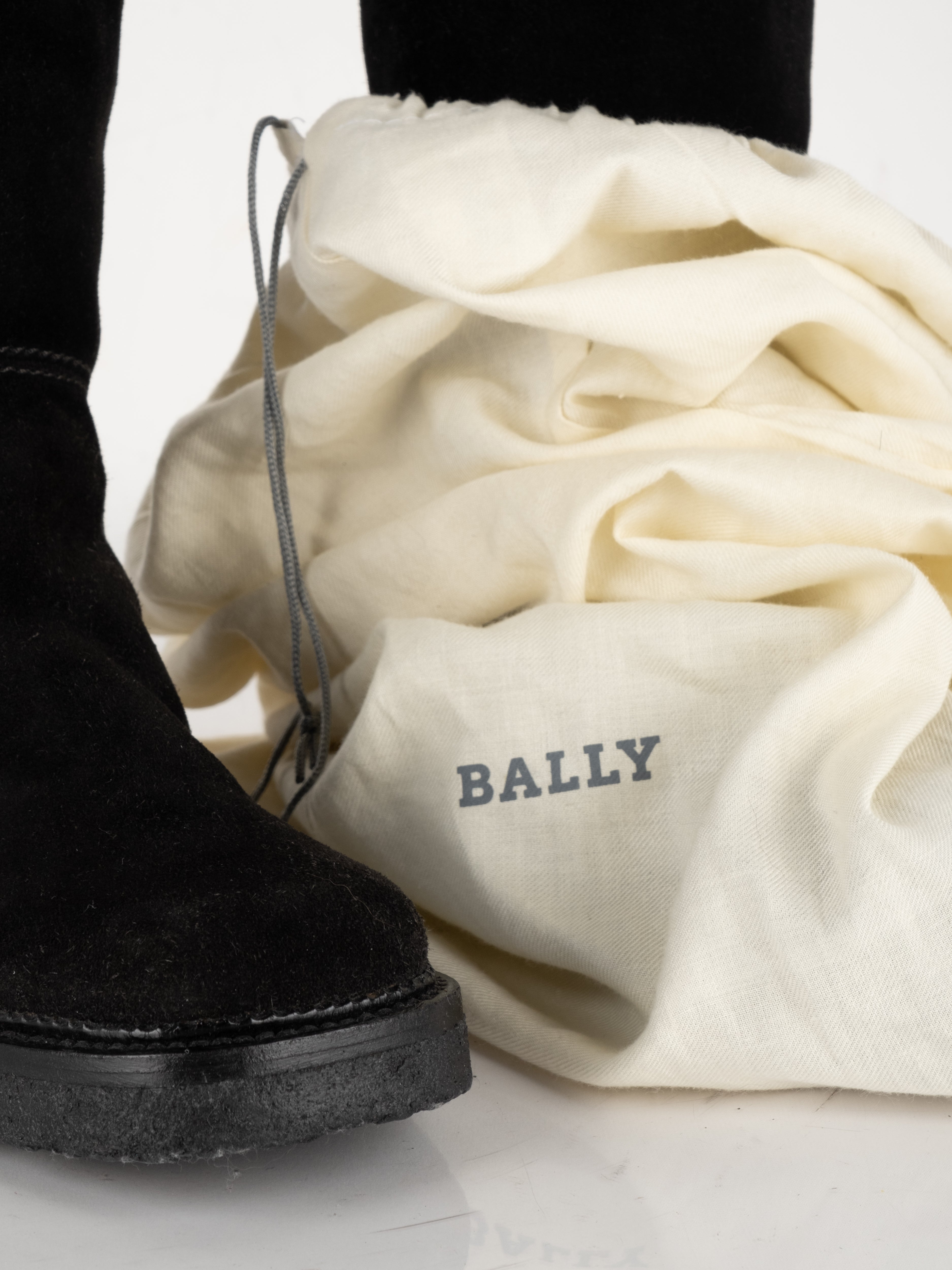מגפי וינטג' יד שנייה של Bally, שחורים, עם קטרים של פרווה עשירה ורכה. המגפיים משלבים נוחות, עמידות וסגנון אלגנטי שמתאים הן ליום והן לערב — פריט חורפי מושלם.