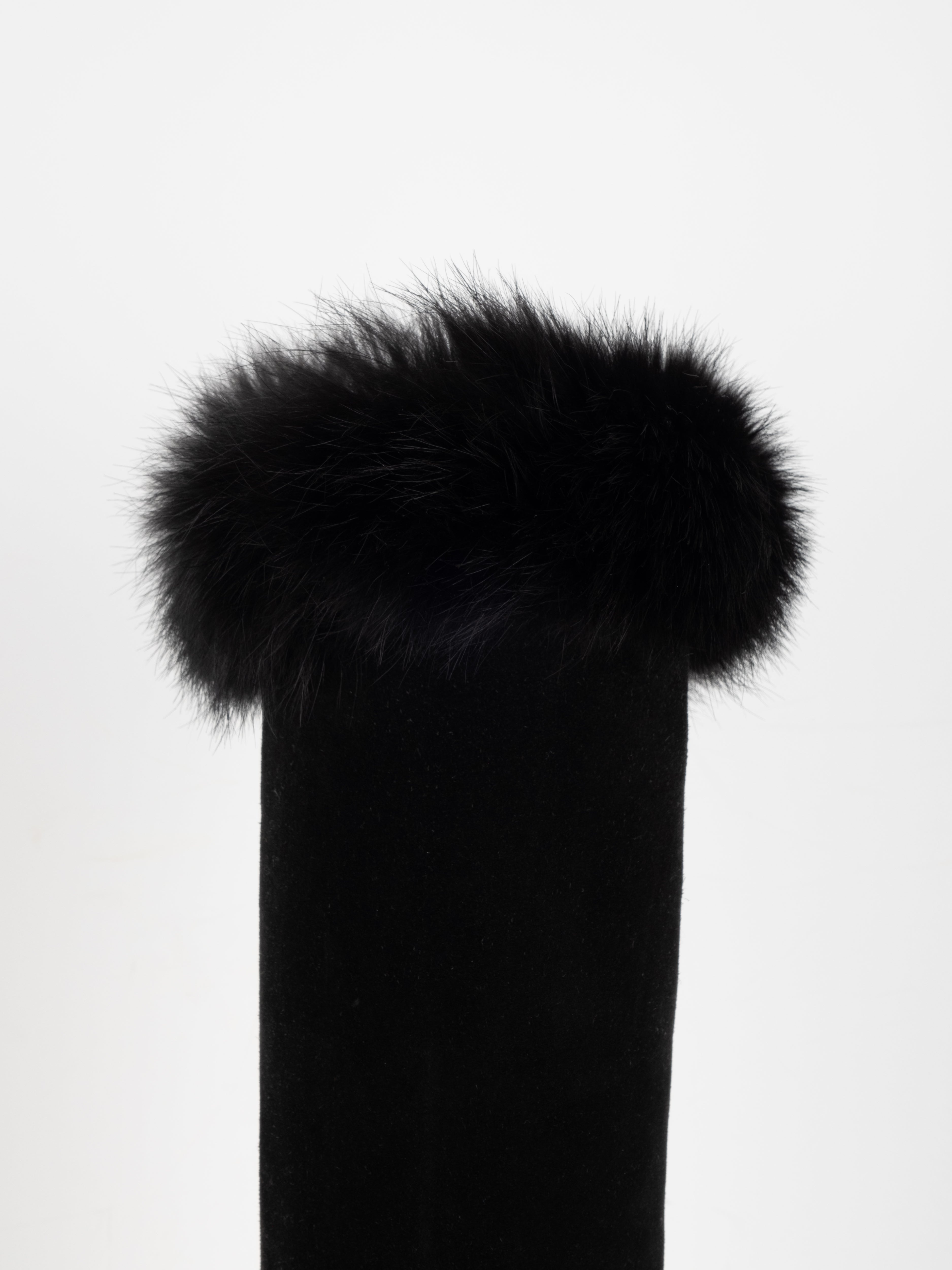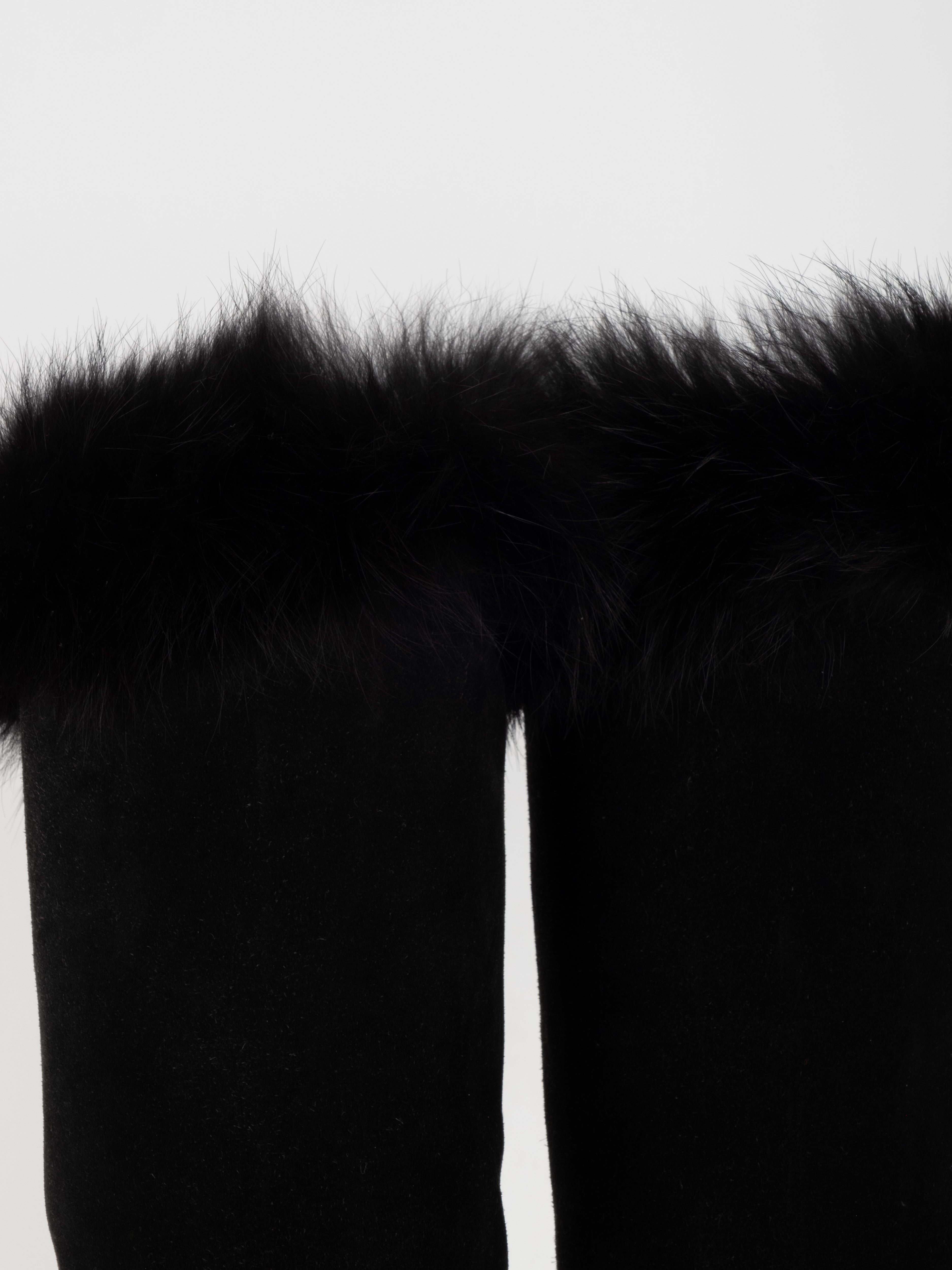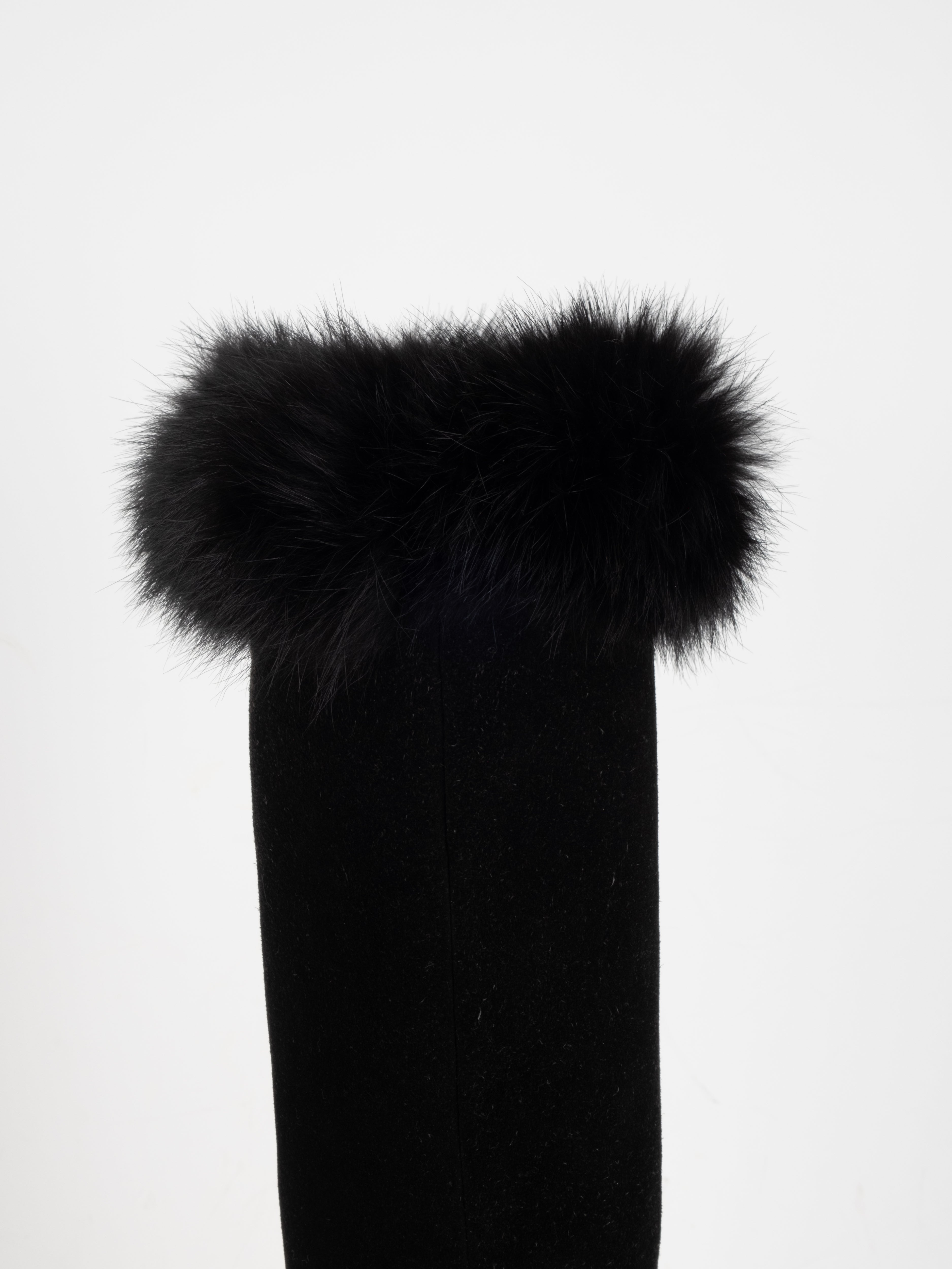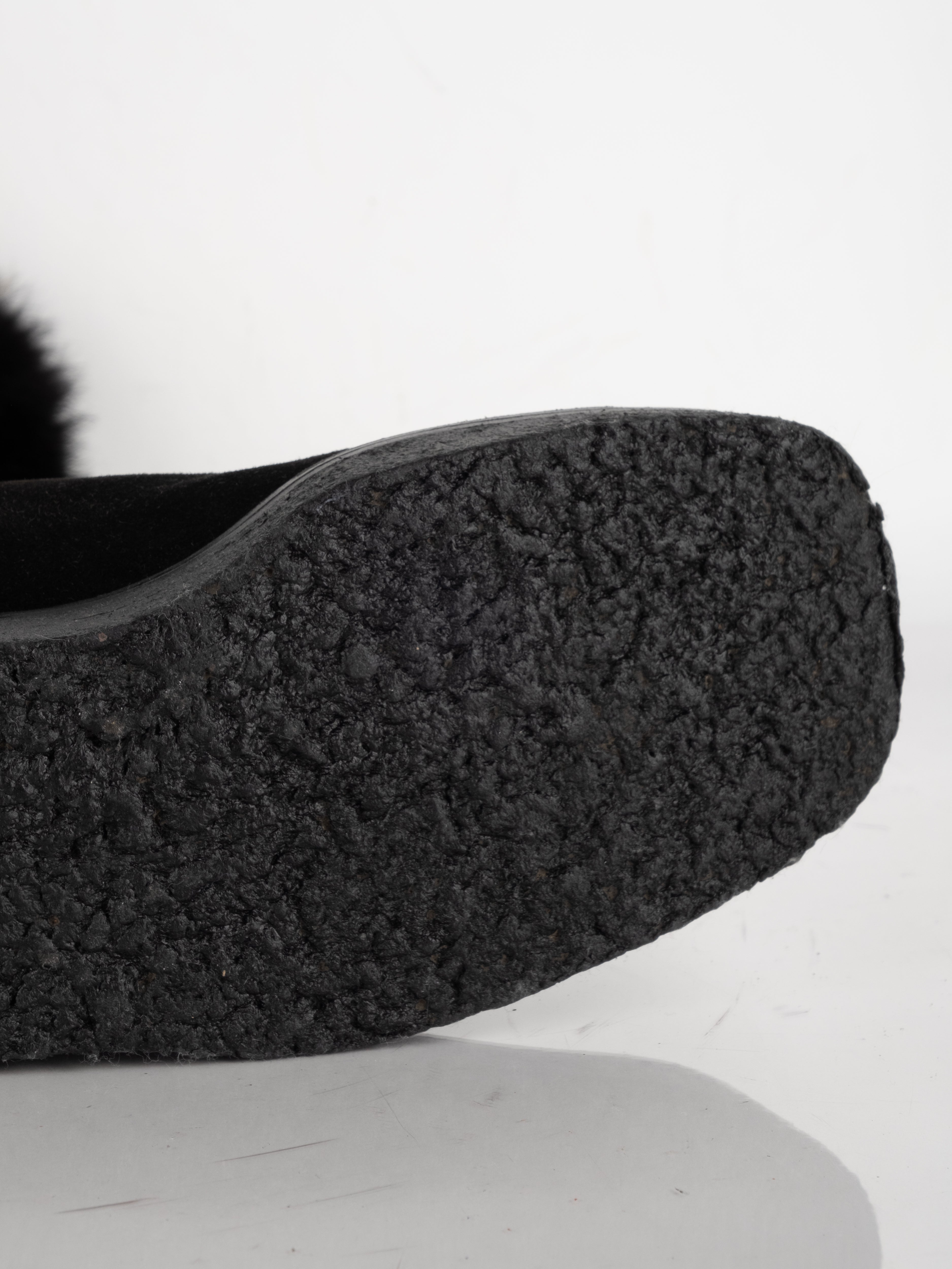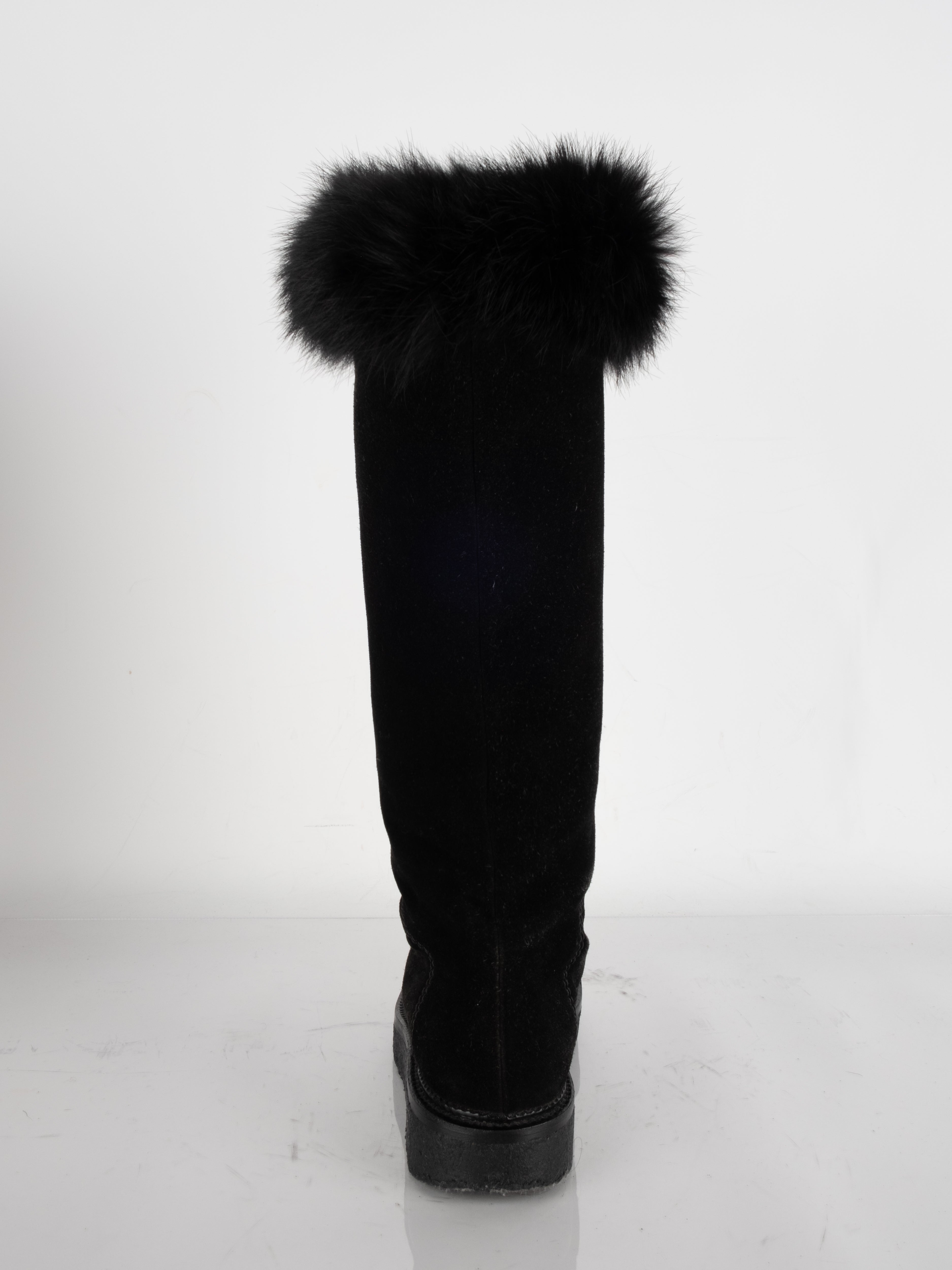 מגפי וינטג' יד שנייה של Bally, שחורים, עם קטרים של פרווה עשירה ורכה. המגפיים משלבים נוחות, עמידות וסגנון אלגנטי שמתאים הן ליום והן לערב — פריט חורפי מושלם.