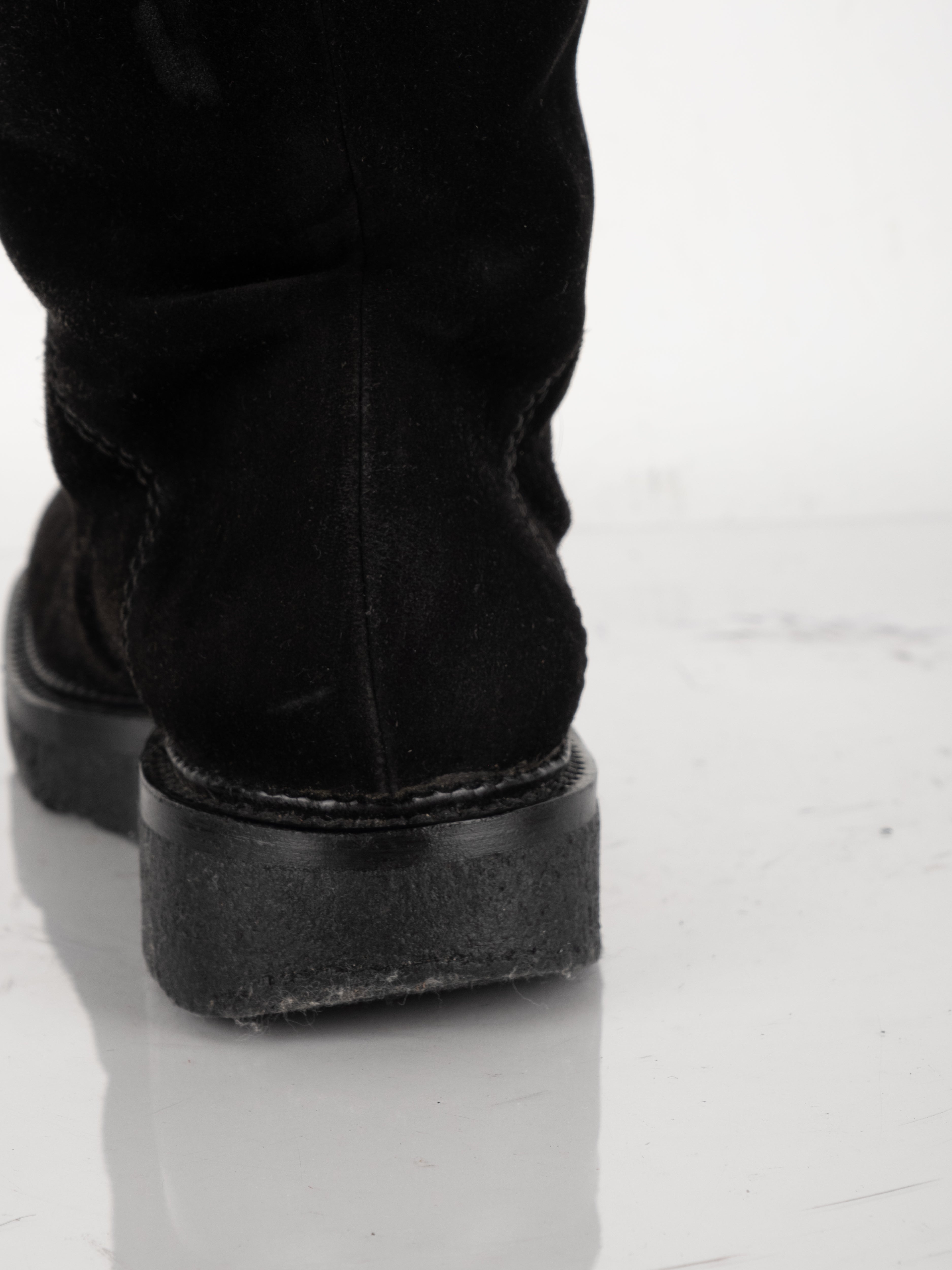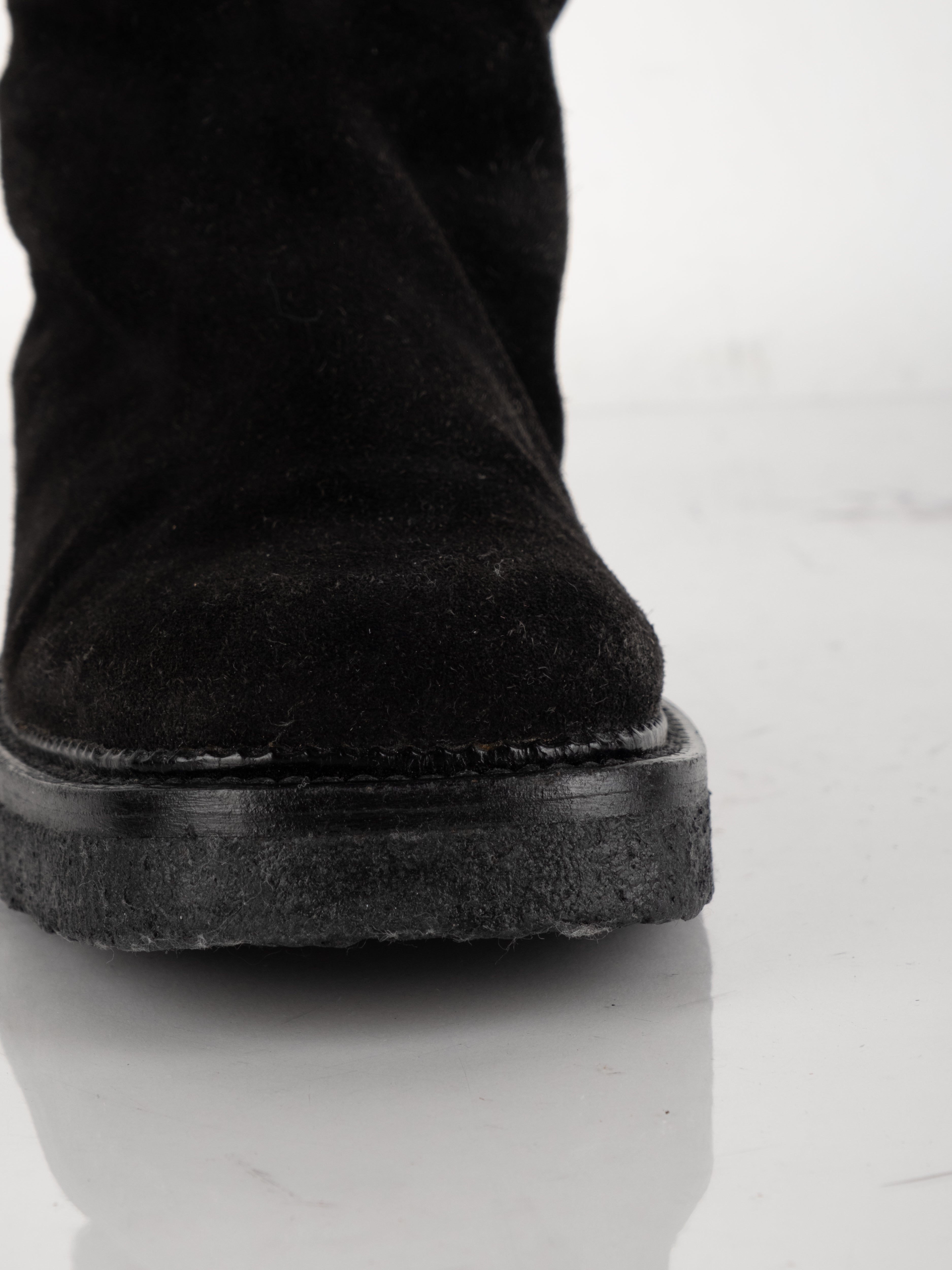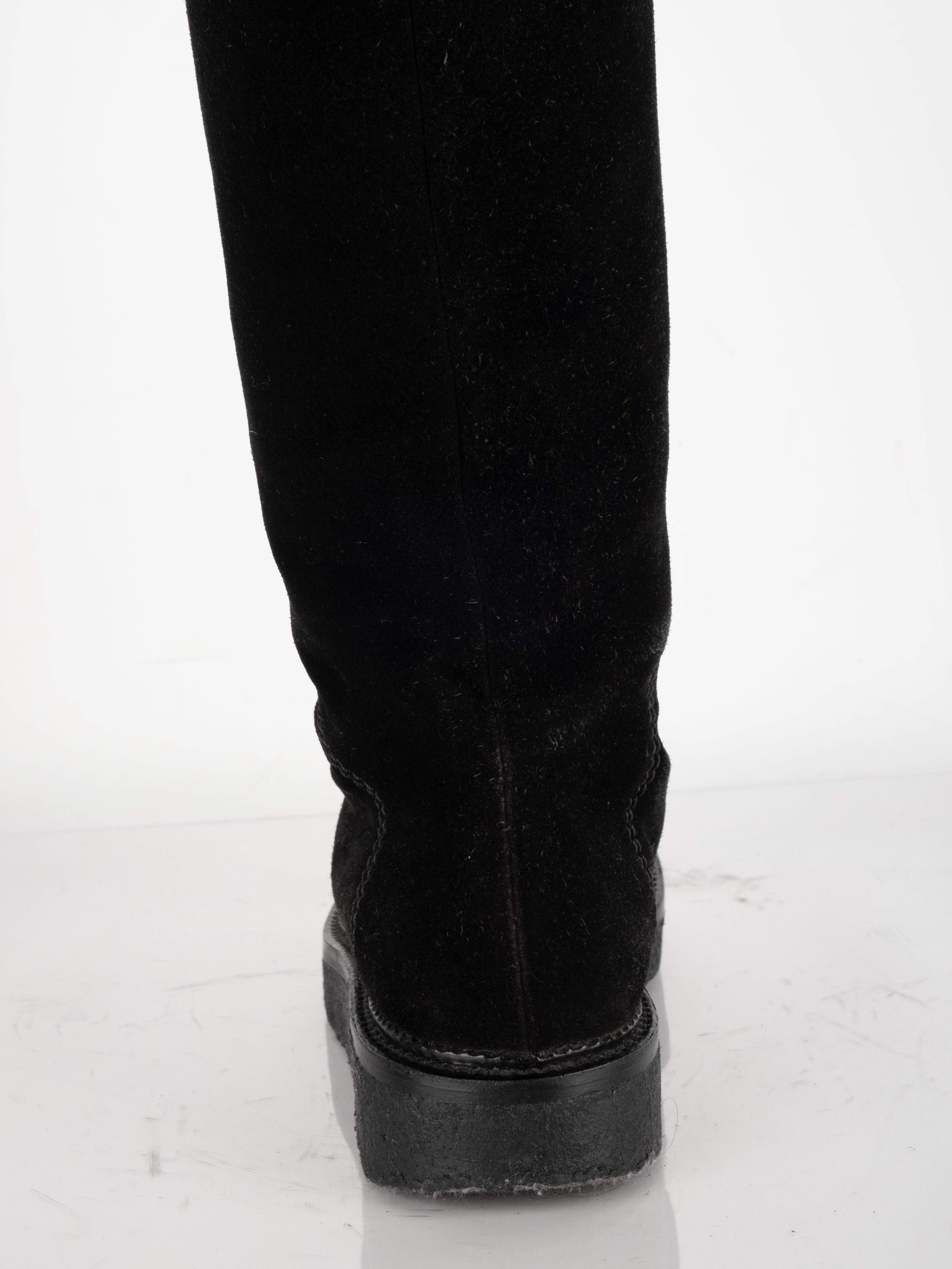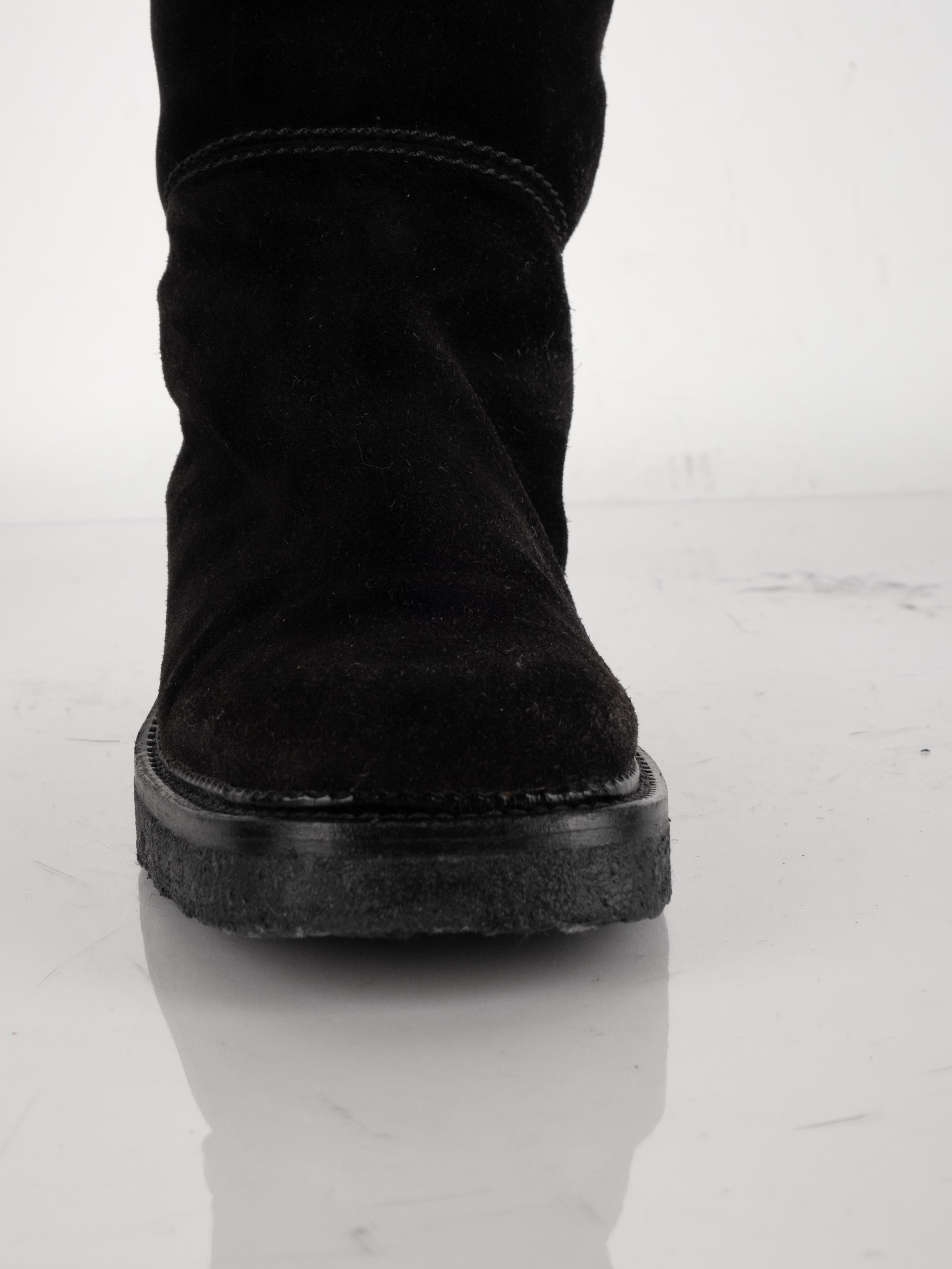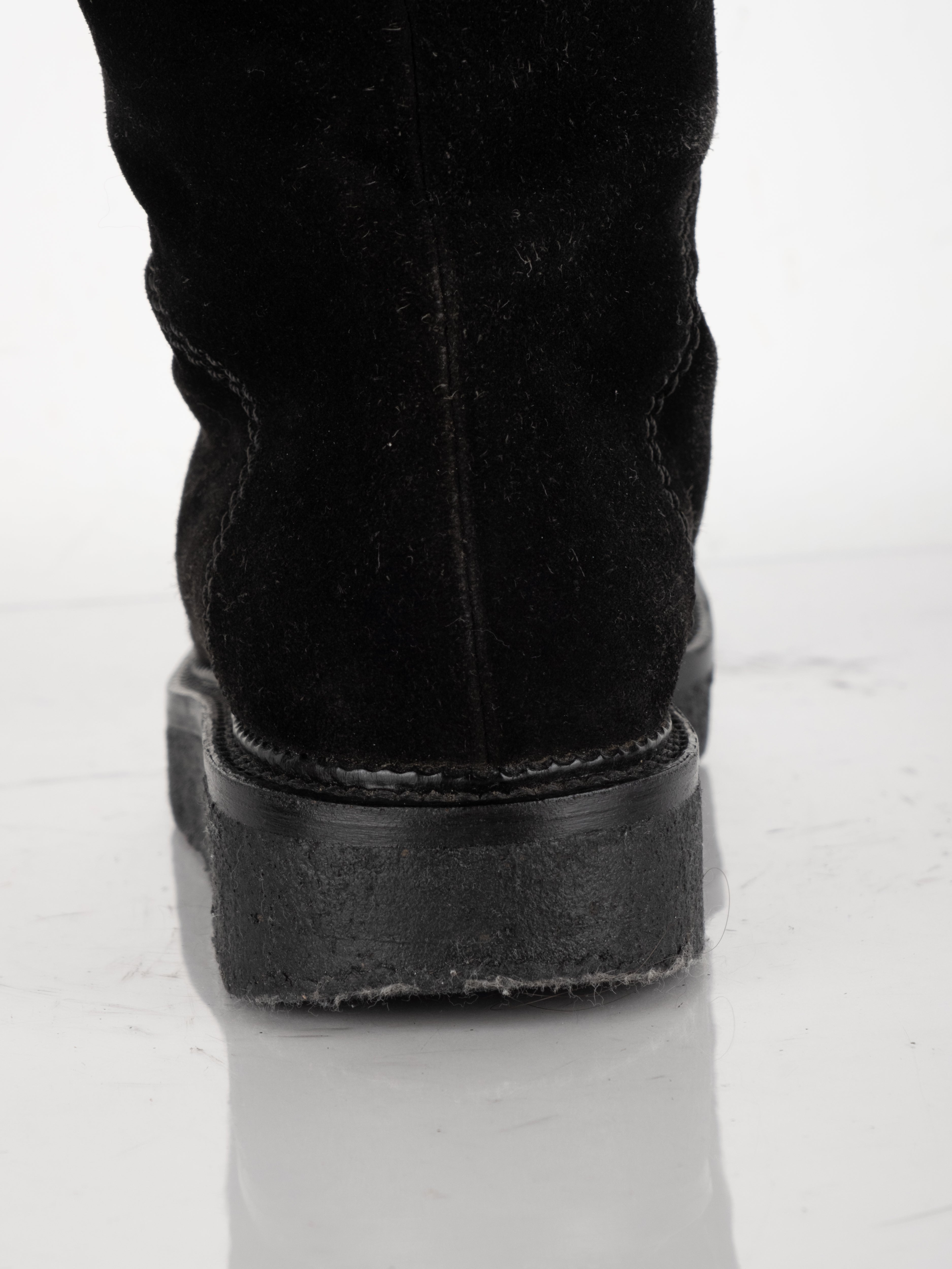 מגפי וינטג' יד שנייה של Bally, שחורים, עם קטרים של פרווה עשירה ורכה. המגפיים משלבים נוחות, עמידות וסגנון אלגנטי שמתאים הן ליום והן לערב — פריט חורפי מושלם.