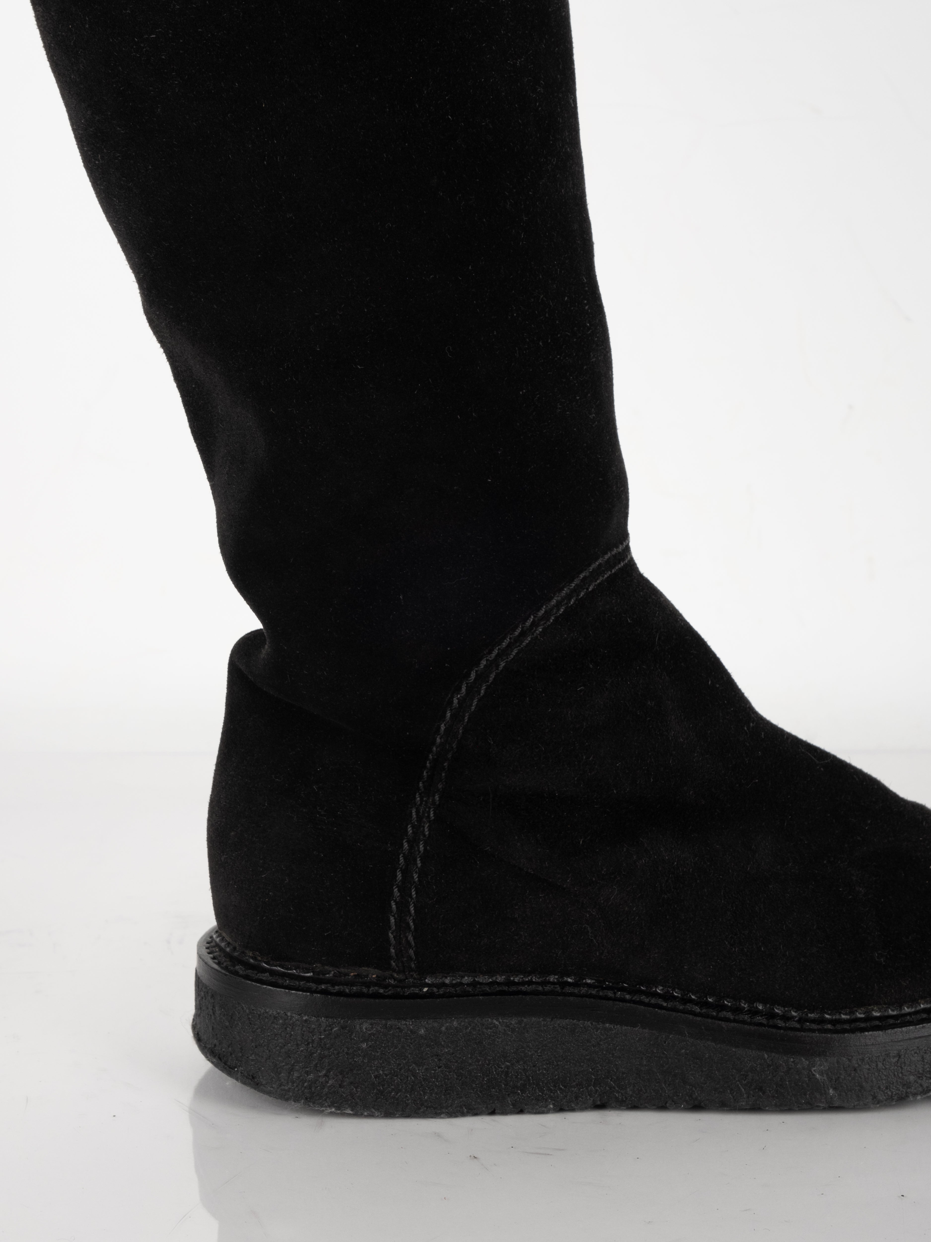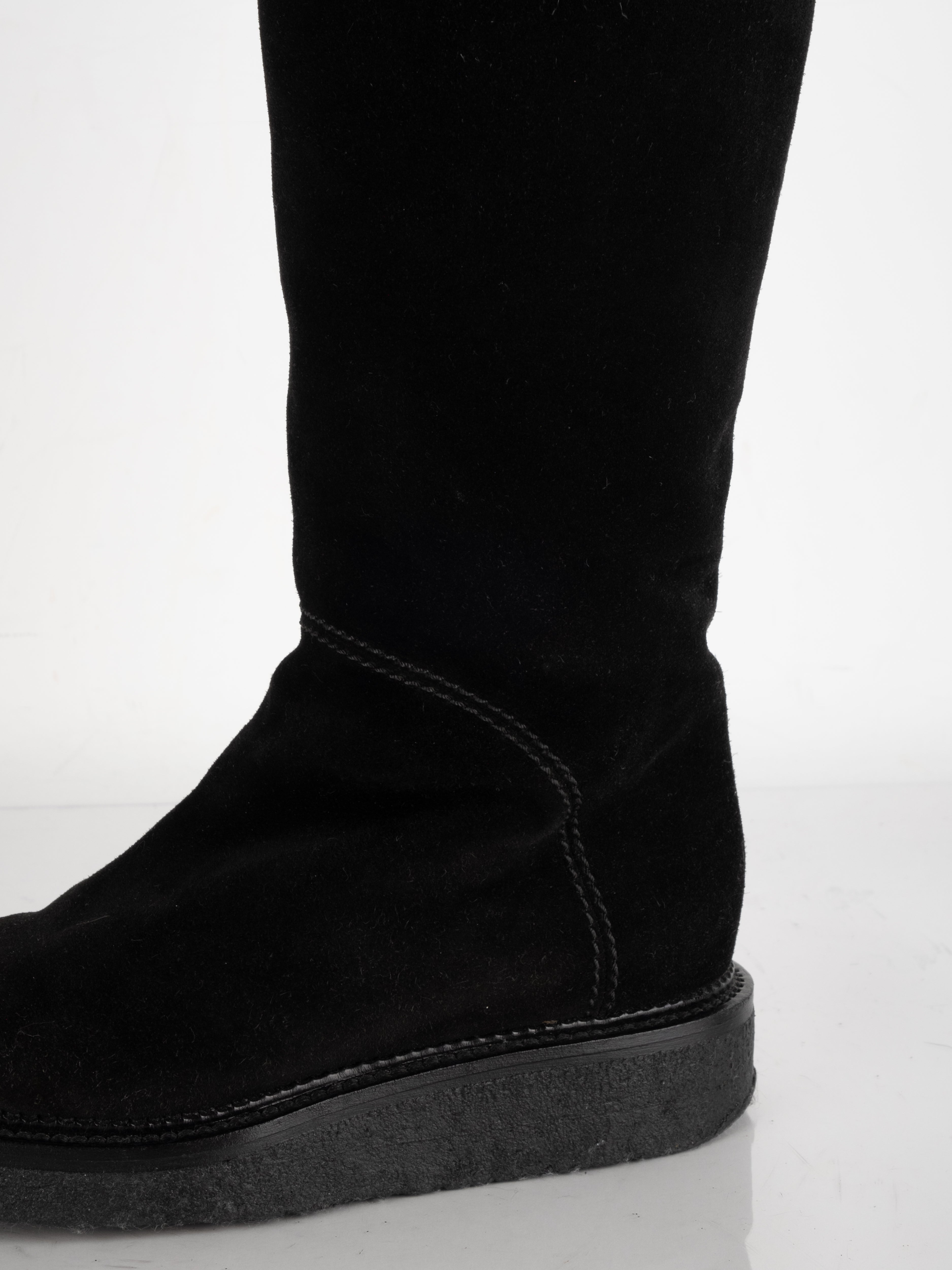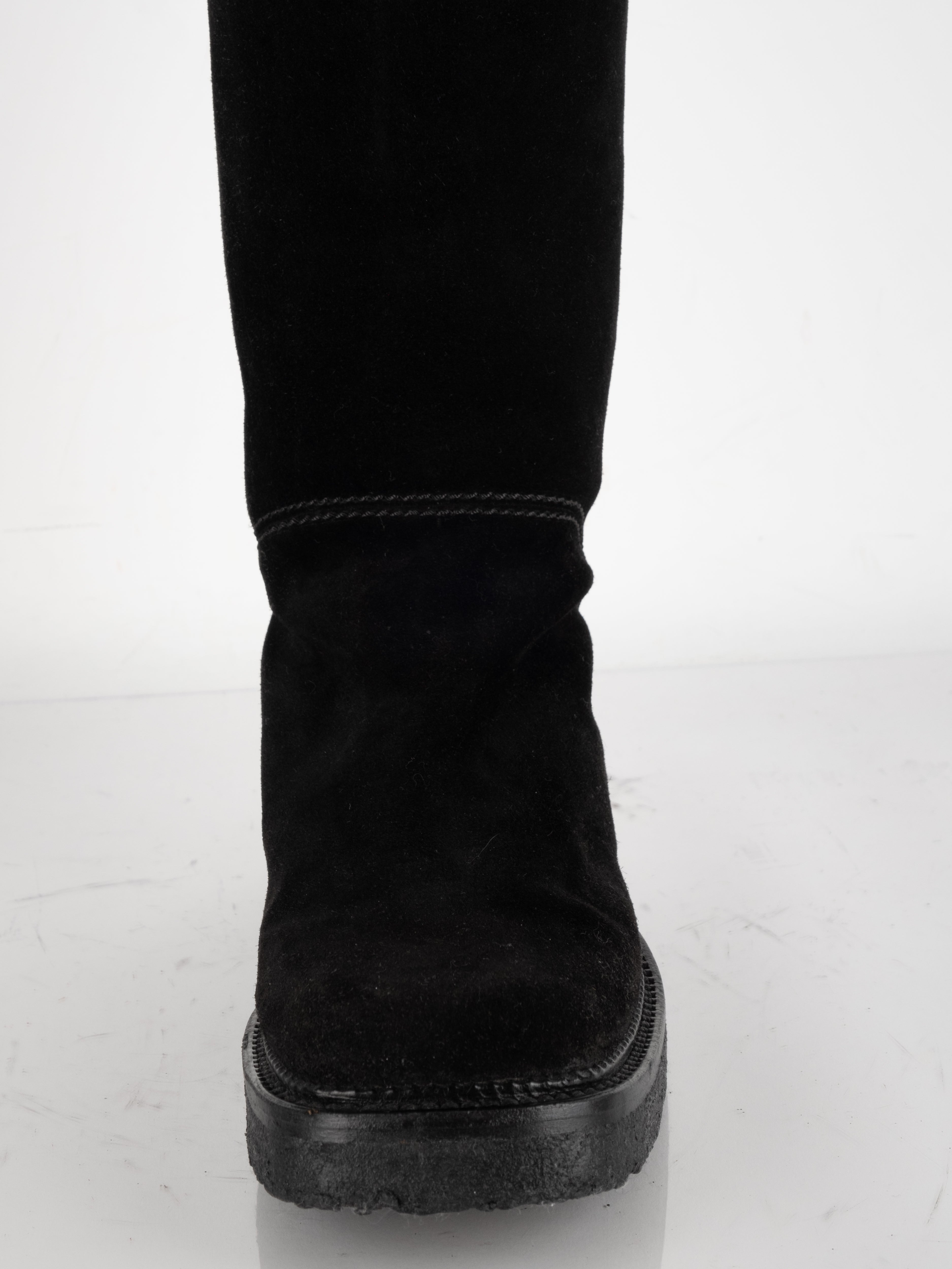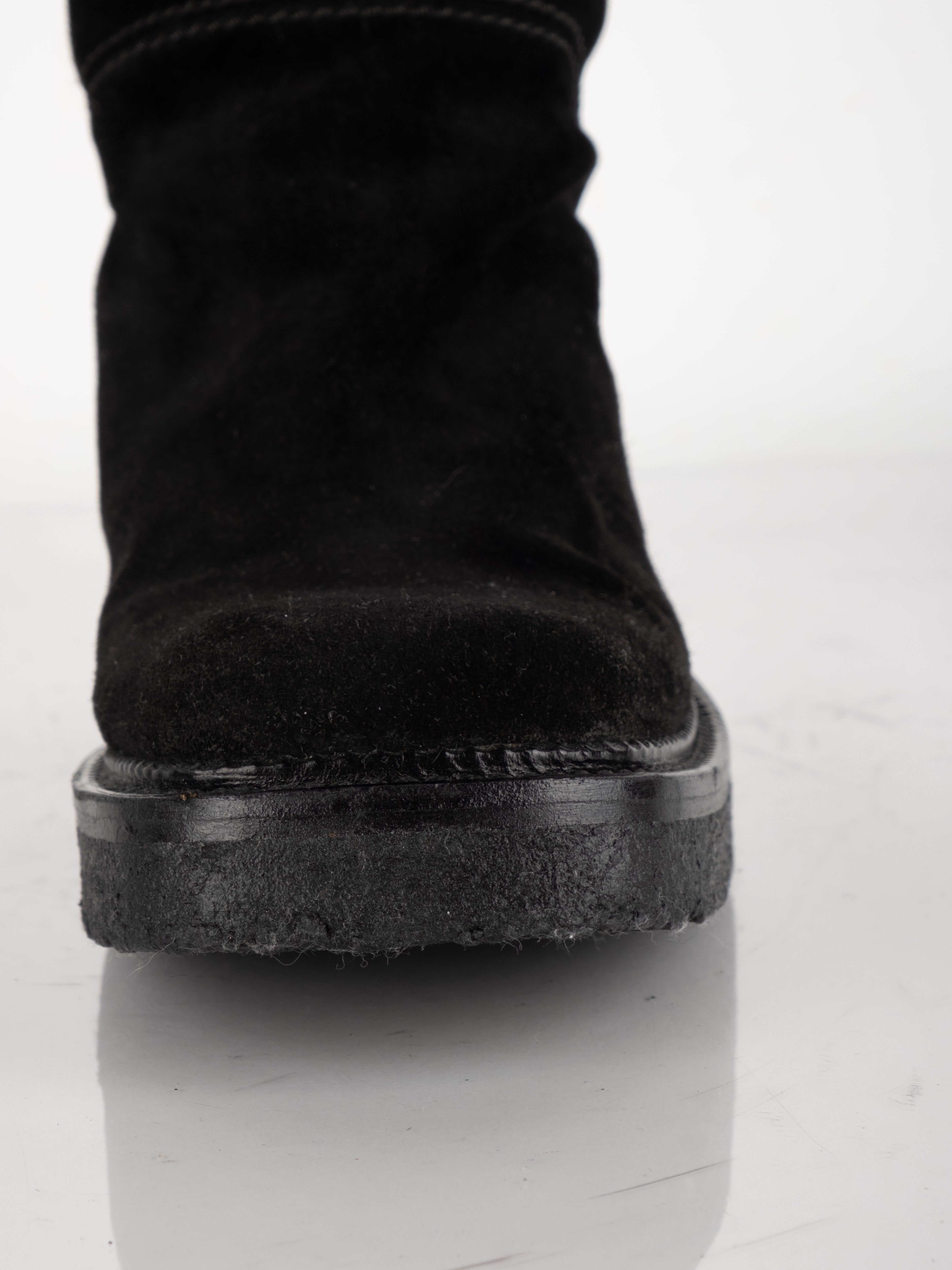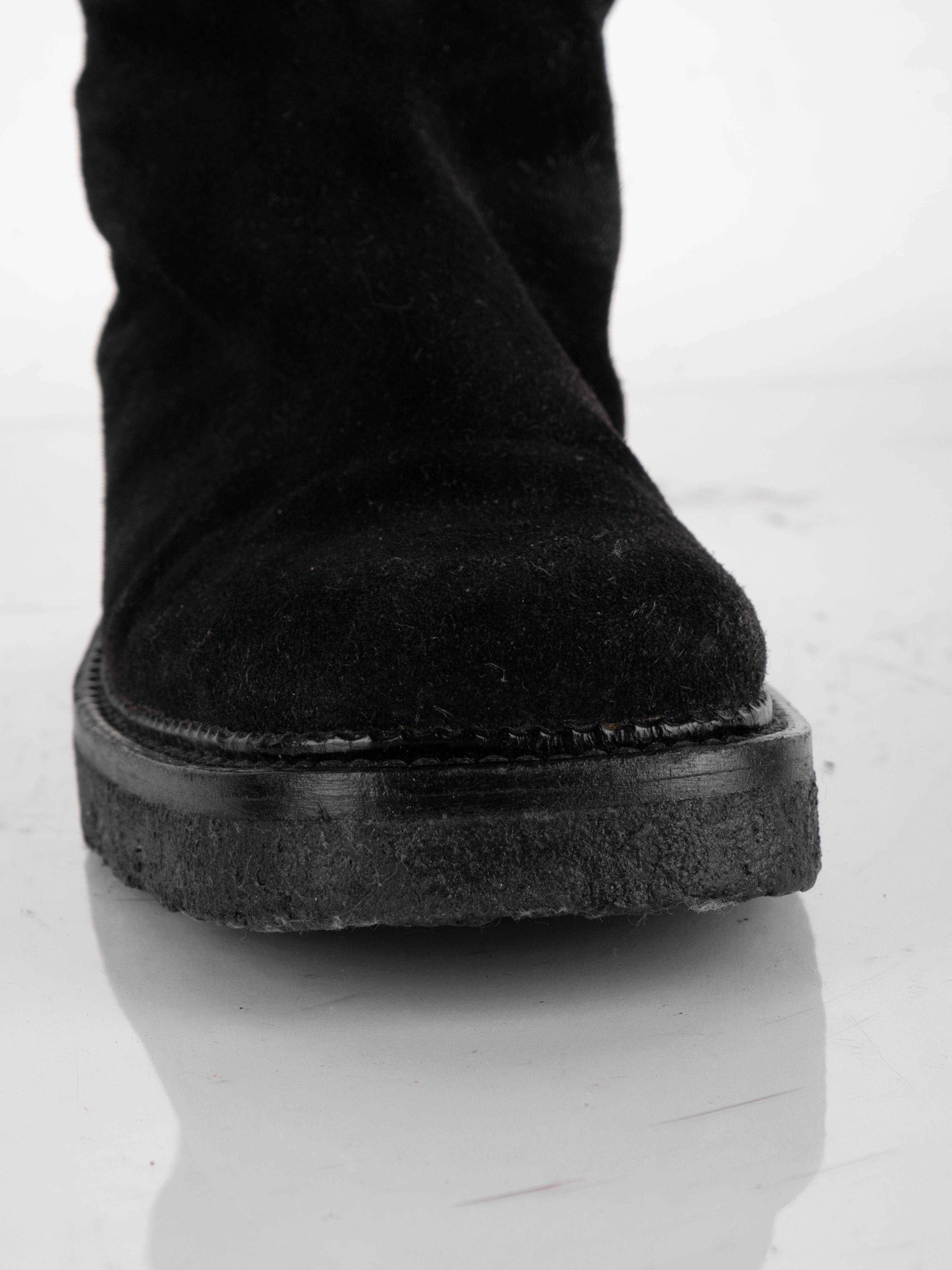 מגפי וינטג' יד שנייה של Bally, שחורים, עם קטרים של פרווה עשירה ורכה. המגפיים משלבים נוחות, עמידות וסגנון אלגנטי שמתאים הן ליום והן לערב — פריט חורפי מושלם.