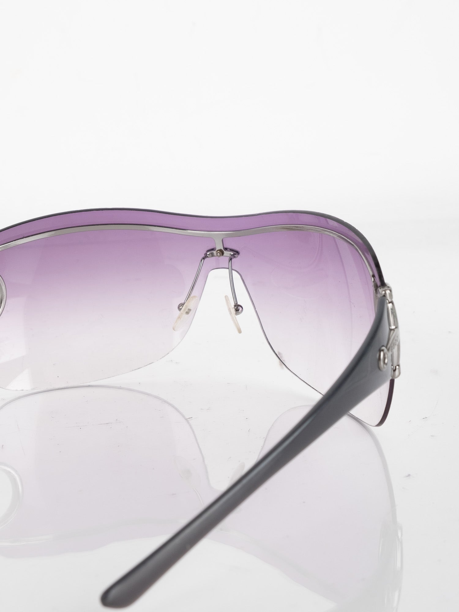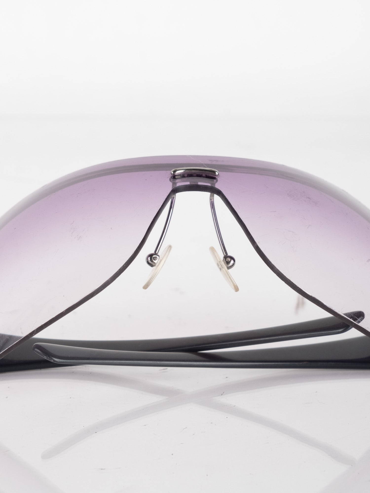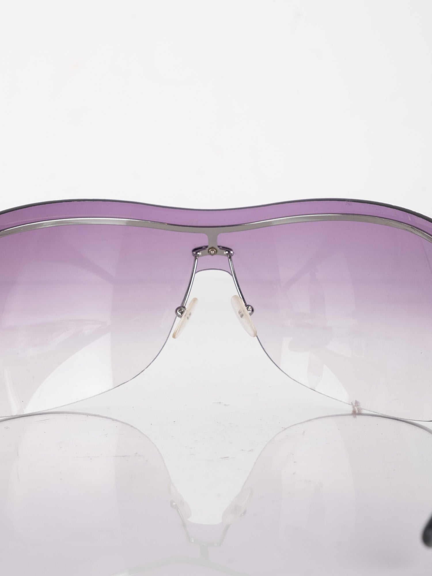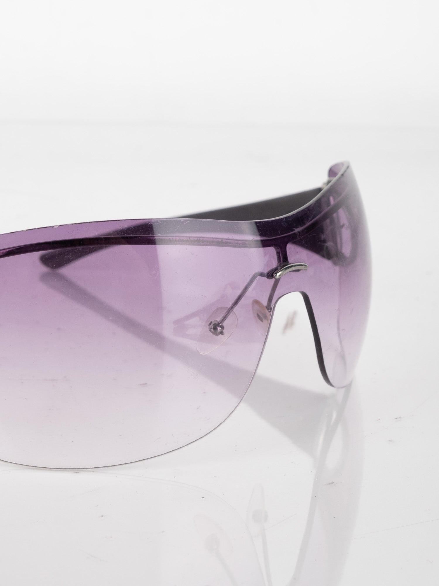 משקפי שמש שיילד ללא מסגרת מלאה, עדשה סגולה, זרועות מתכת כהות עם טבעות צד כסופות.