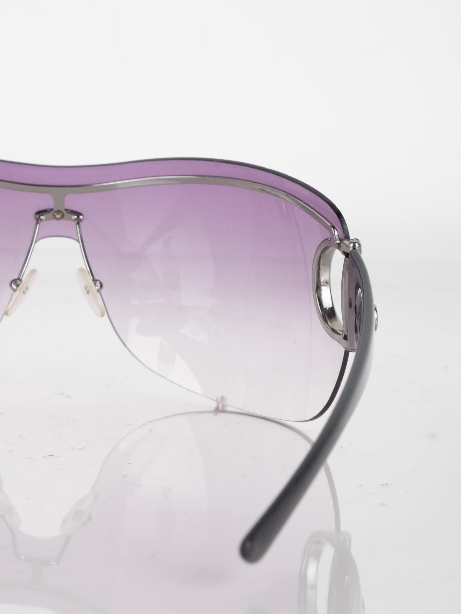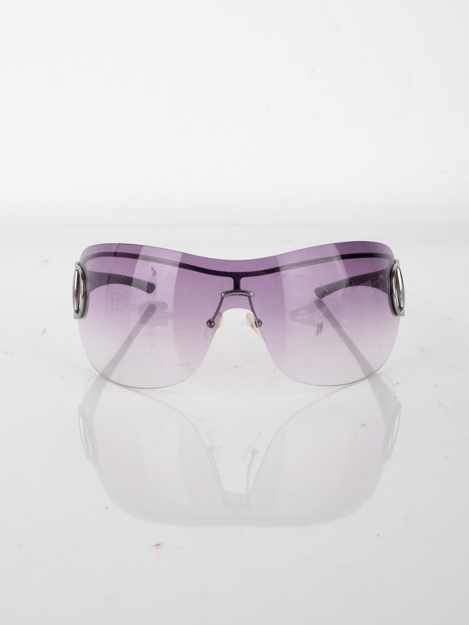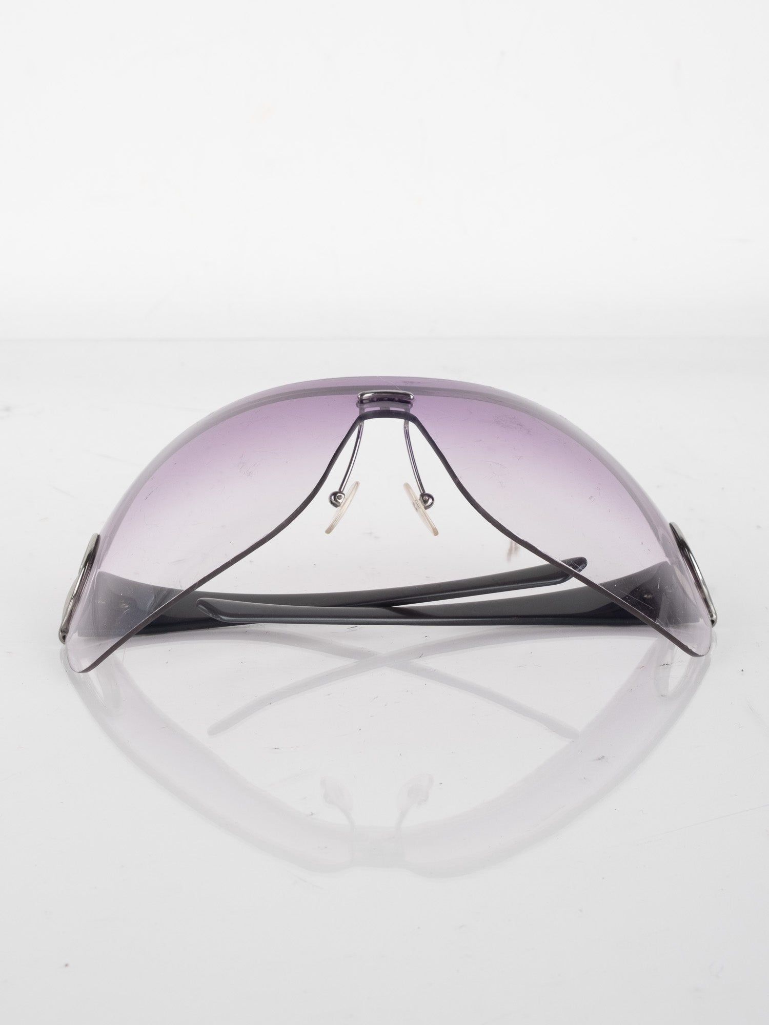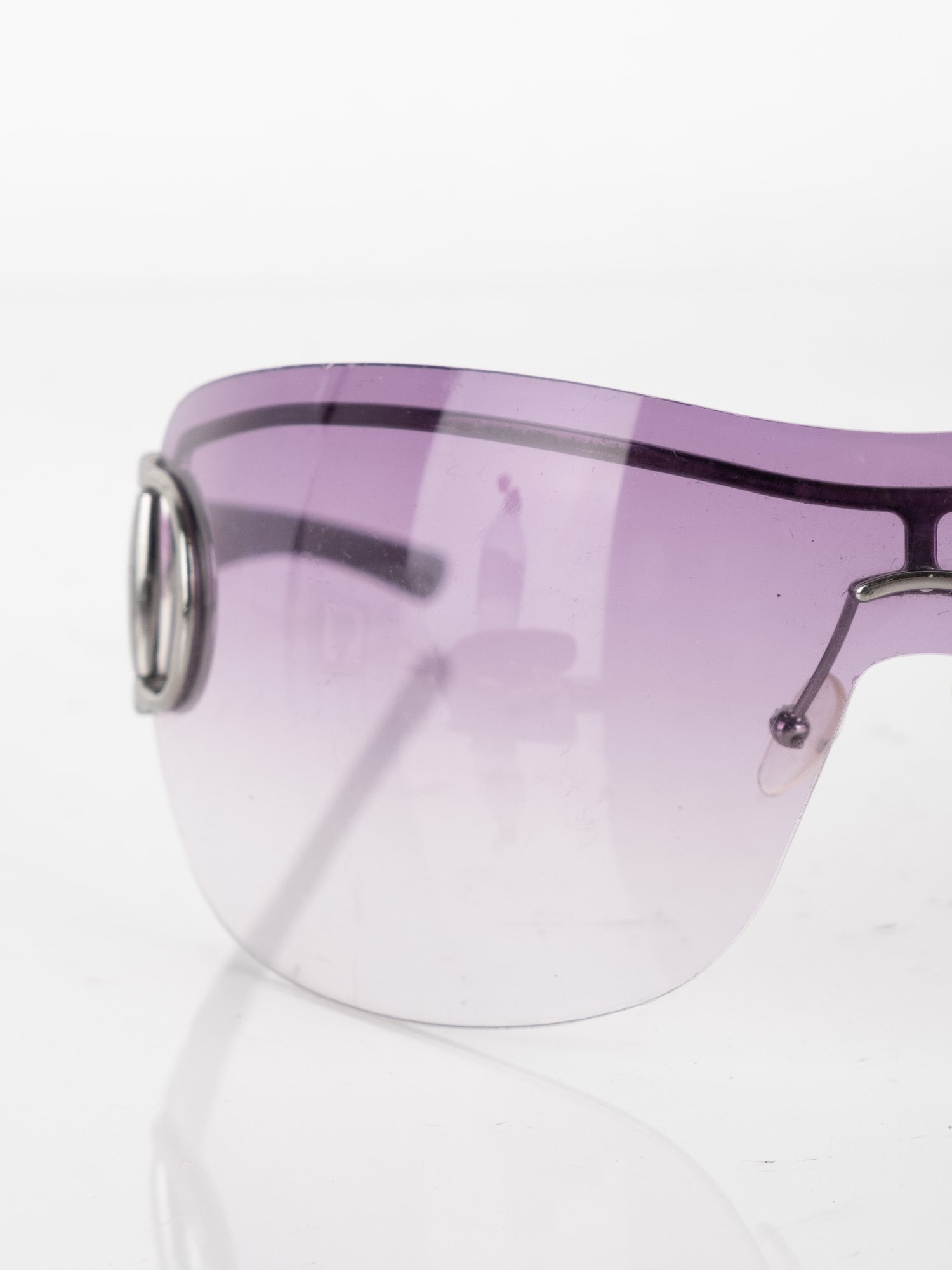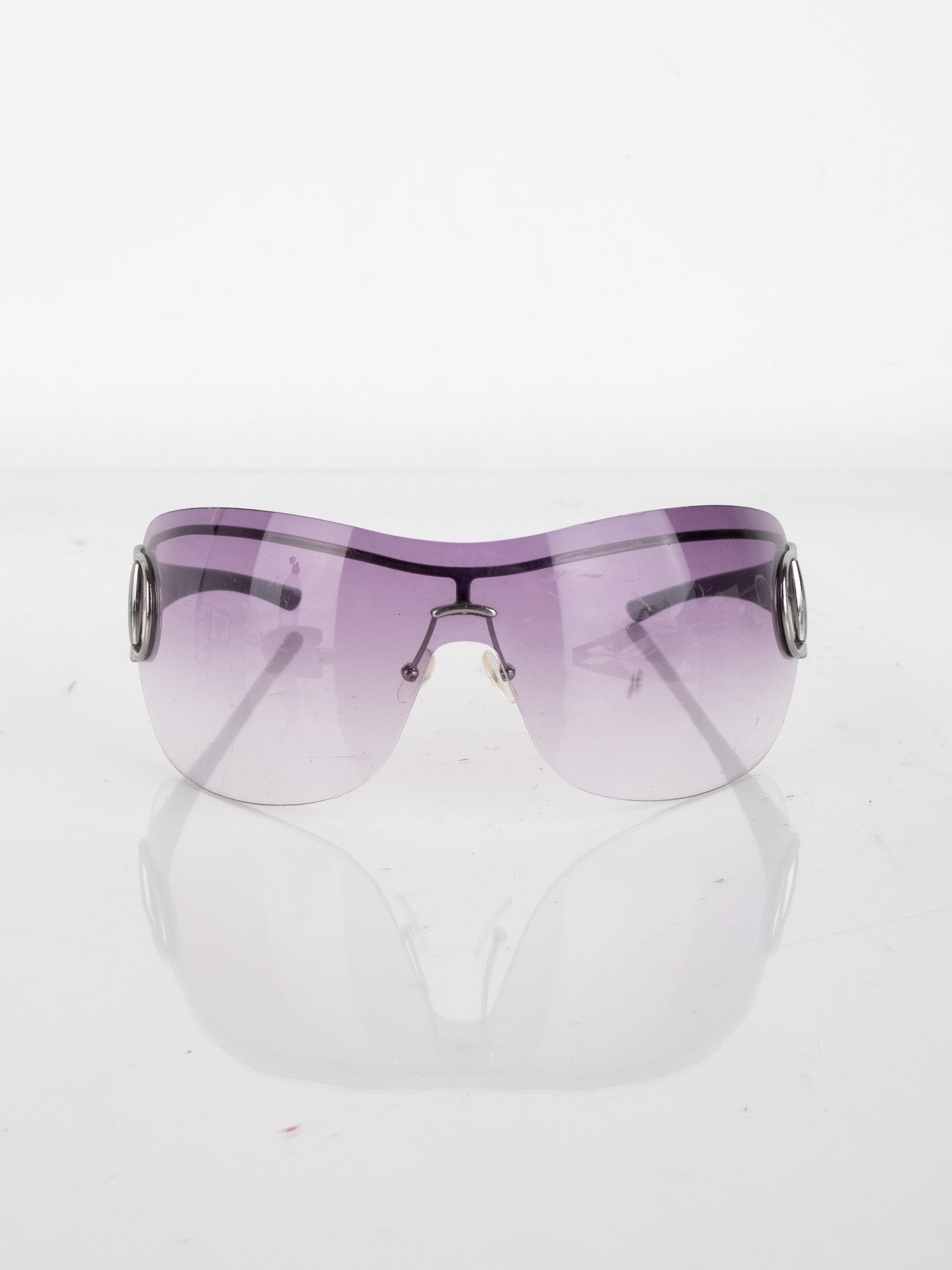 משקפי שמש שיילד ללא מסגרת מלאה, עדשה סגולה, זרועות מתכת כהות עם טבעות צד כסופות.