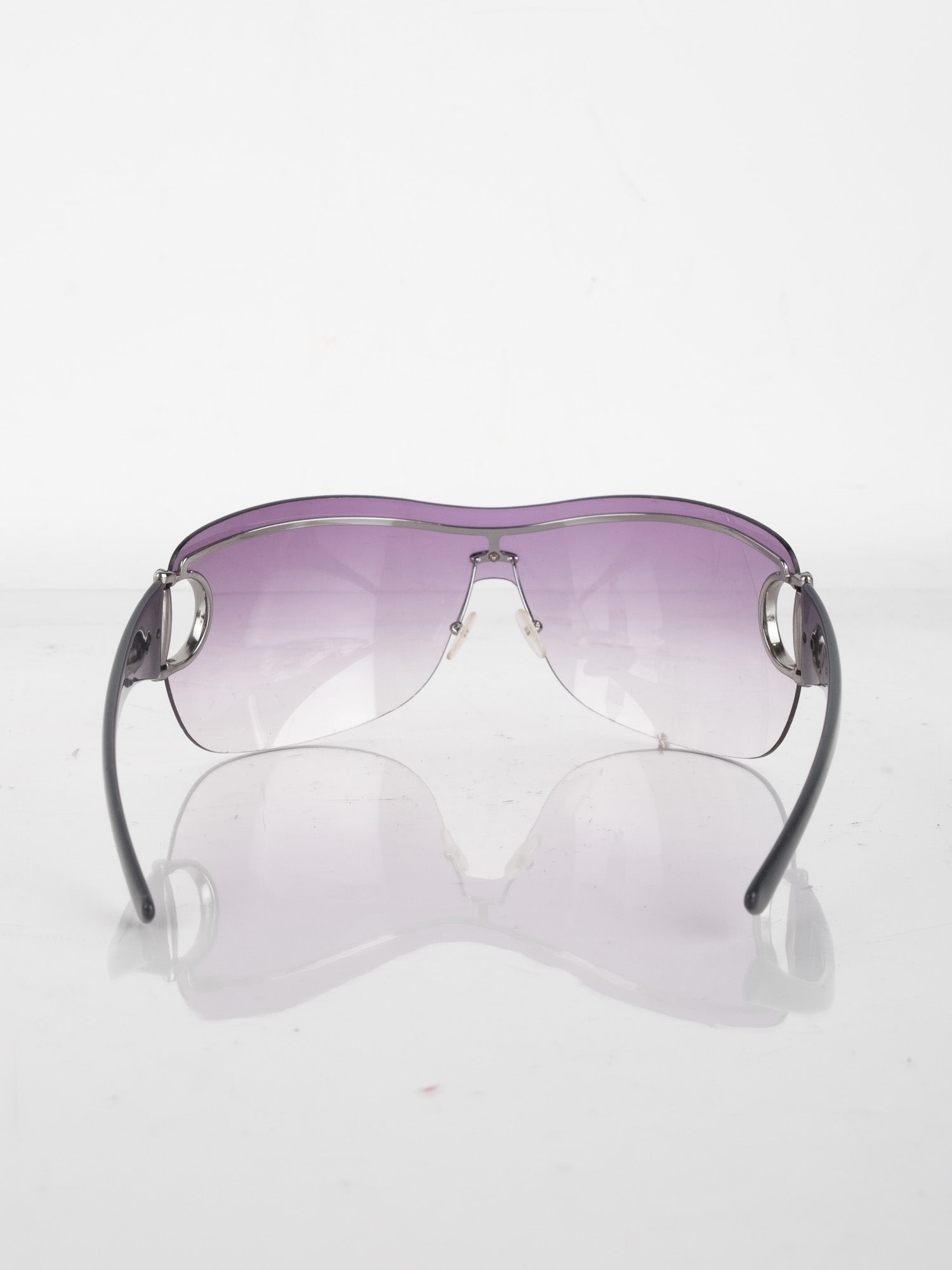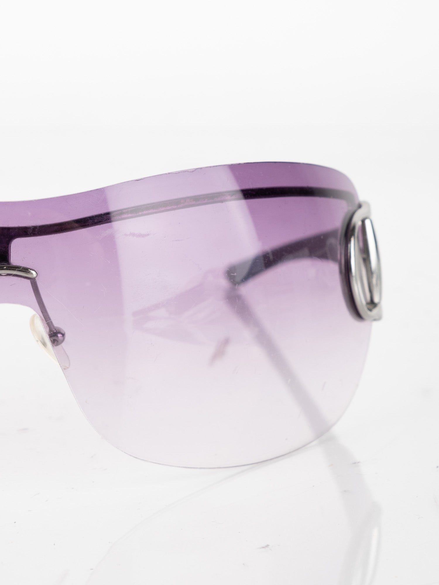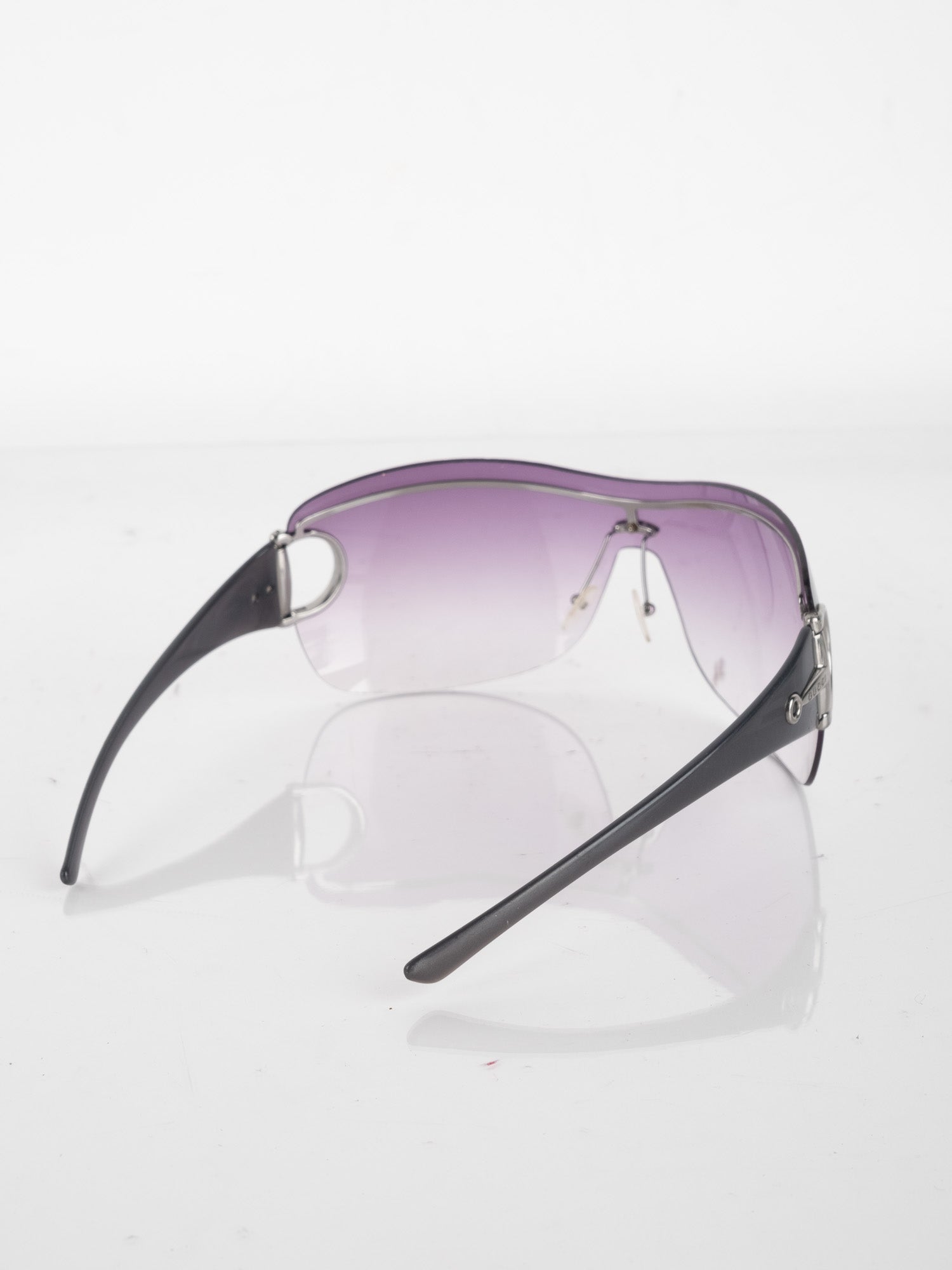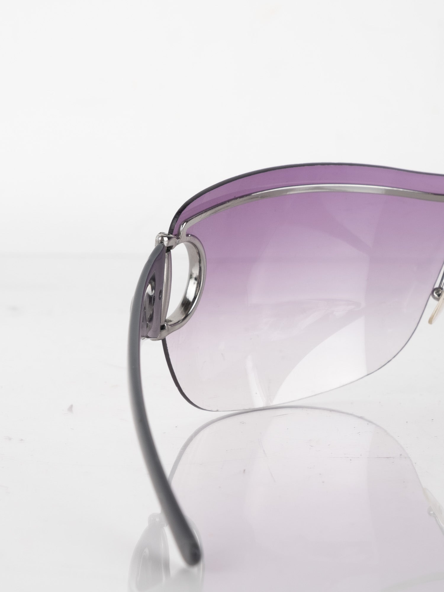 משקפי שמש שיילד ללא מסגרת מלאה, עדשה סגולה, זרועות מתכת כהות עם טבעות צד כסופות.