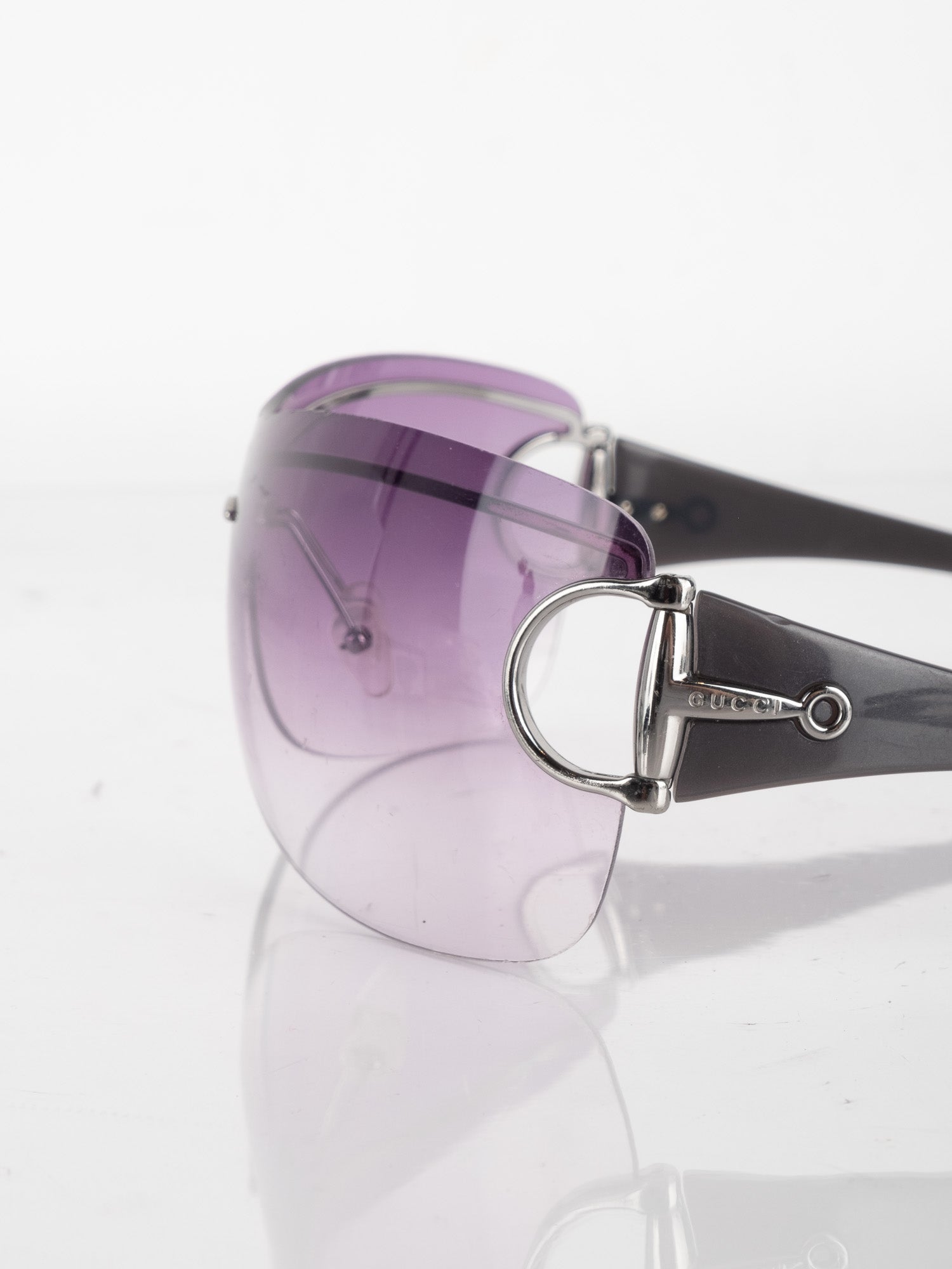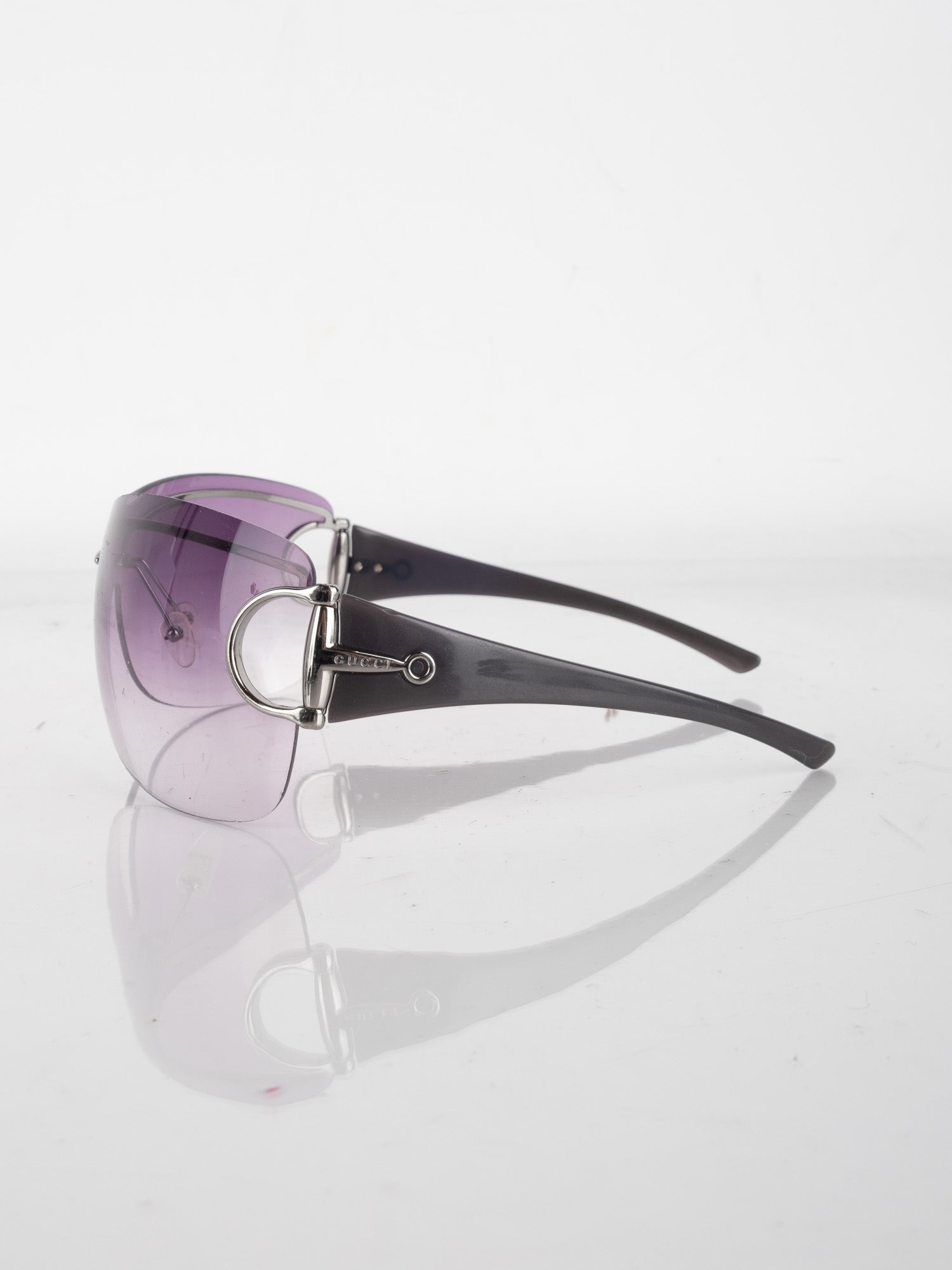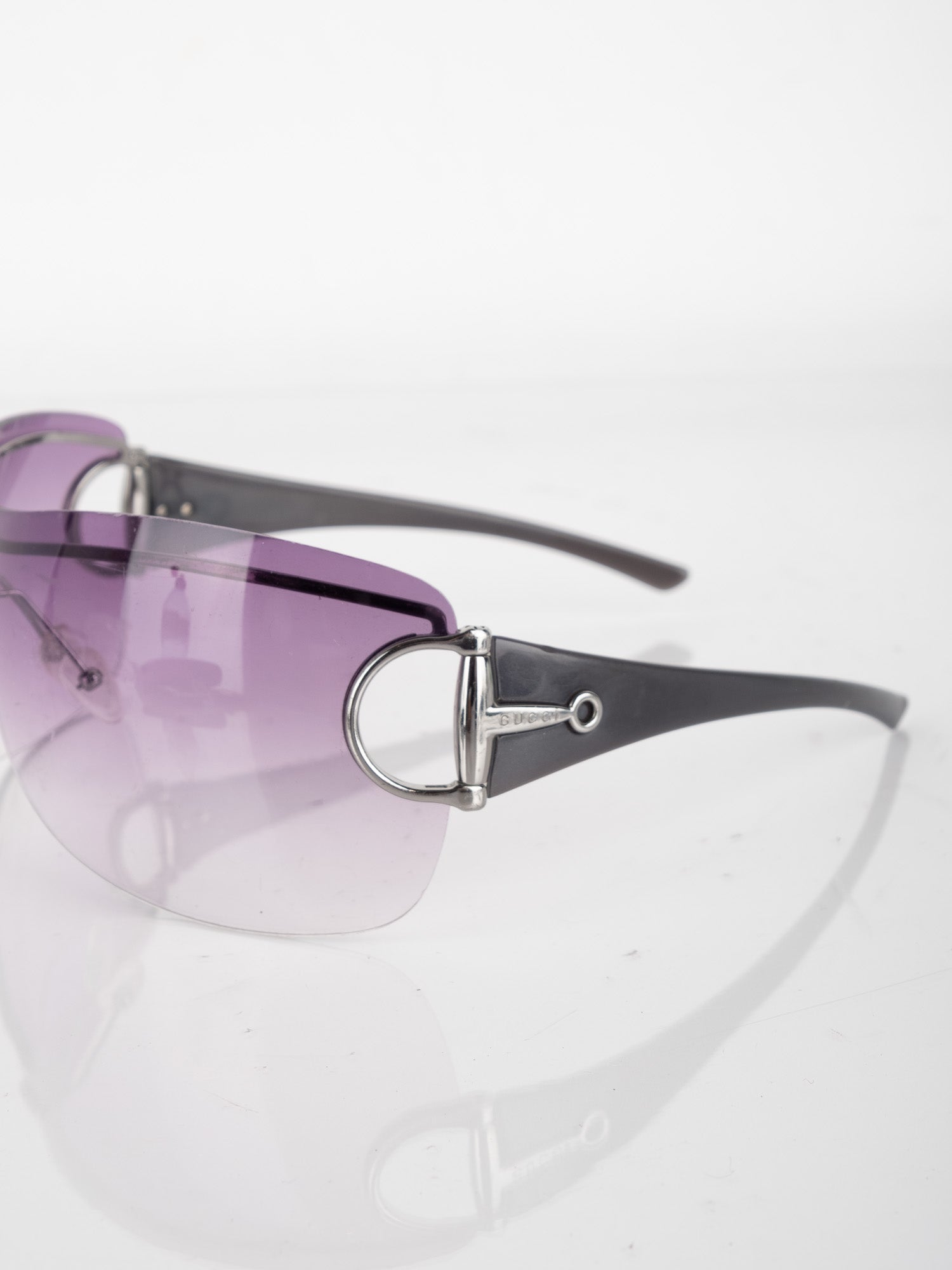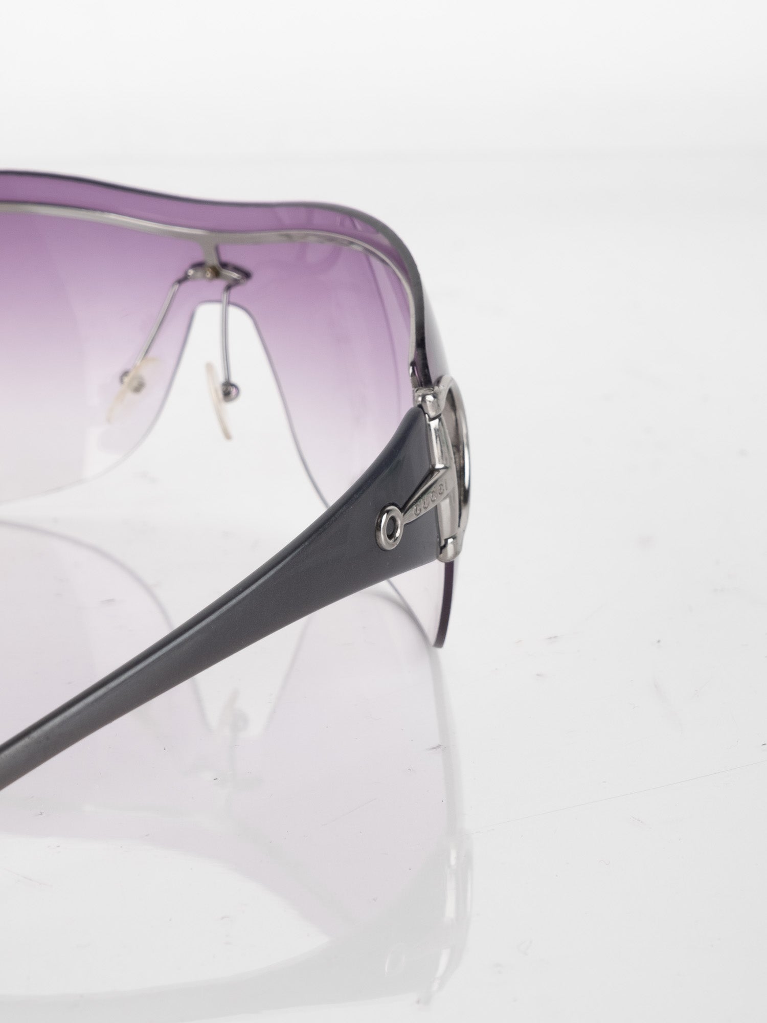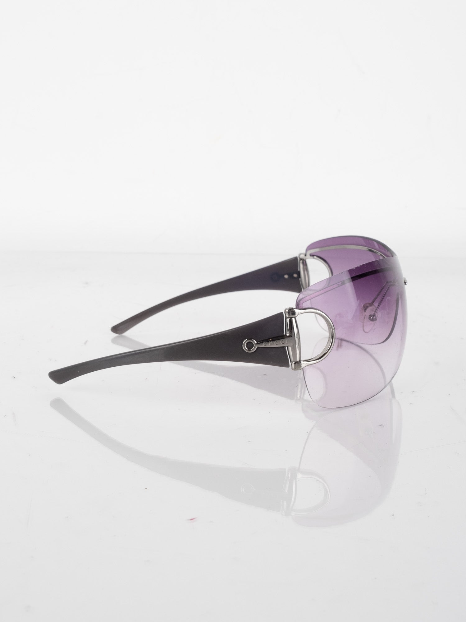 משקפי שמש שיילד ללא מסגרת מלאה, עדשה סגולה, זרועות מתכת כהות עם טבעות צד כסופות.
