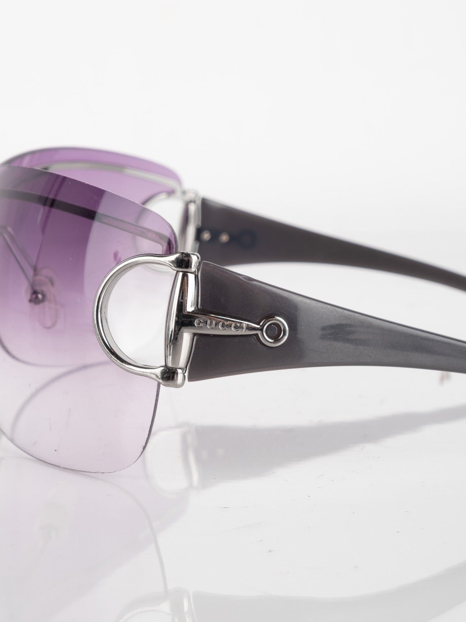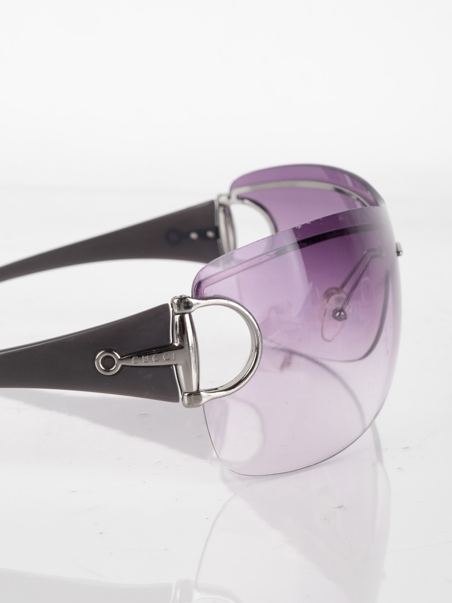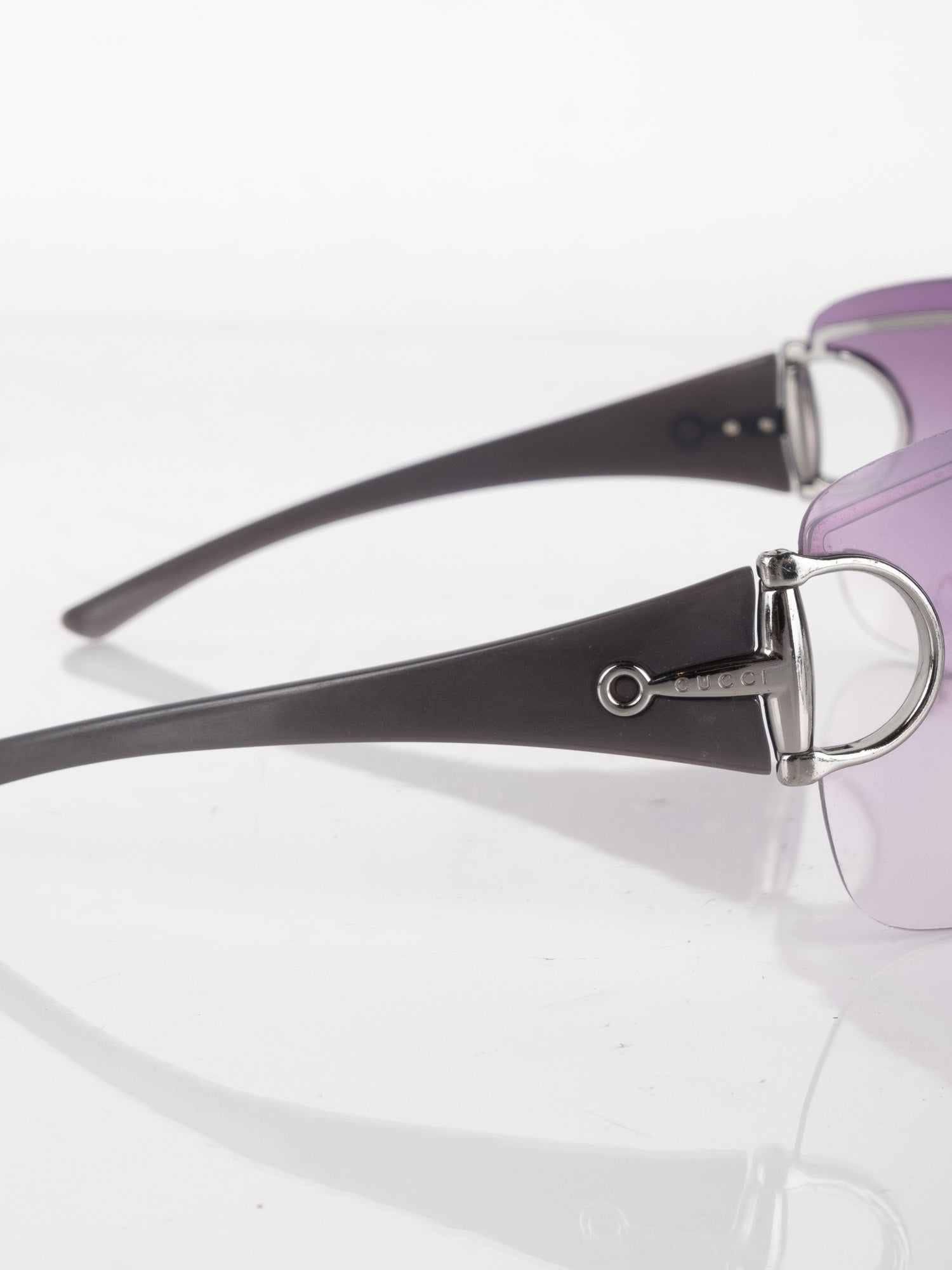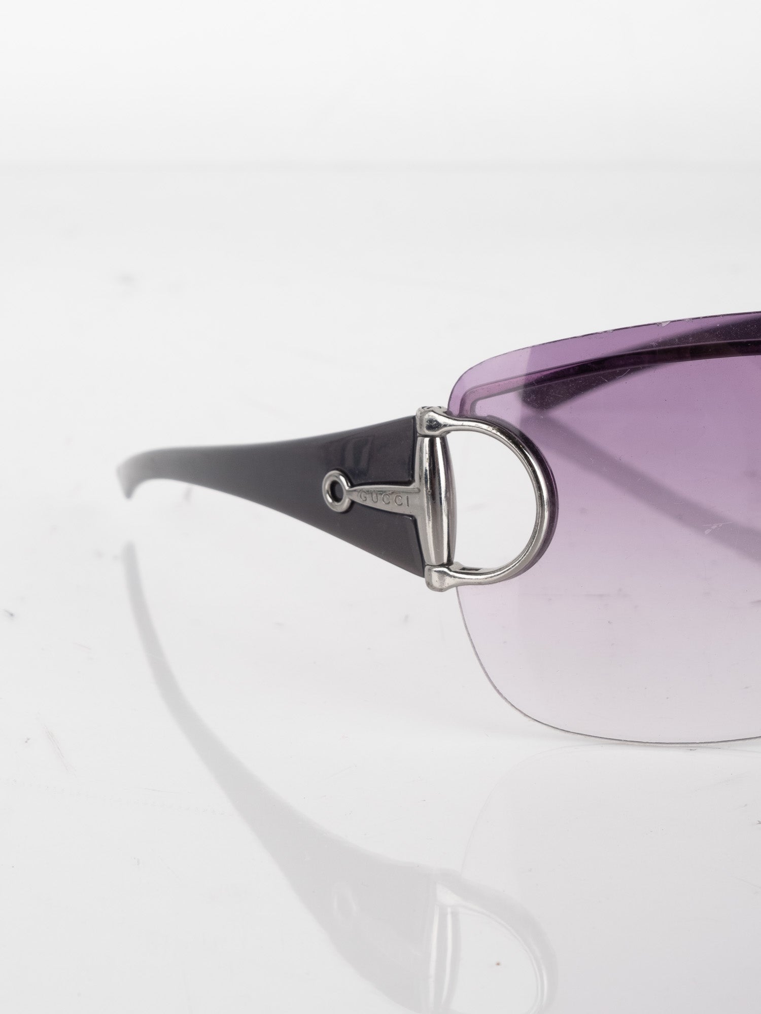 משקפי שמש שיילד ללא מסגרת מלאה, עדשה סגולה, זרועות מתכת כהות עם טבעות צד כסופות.