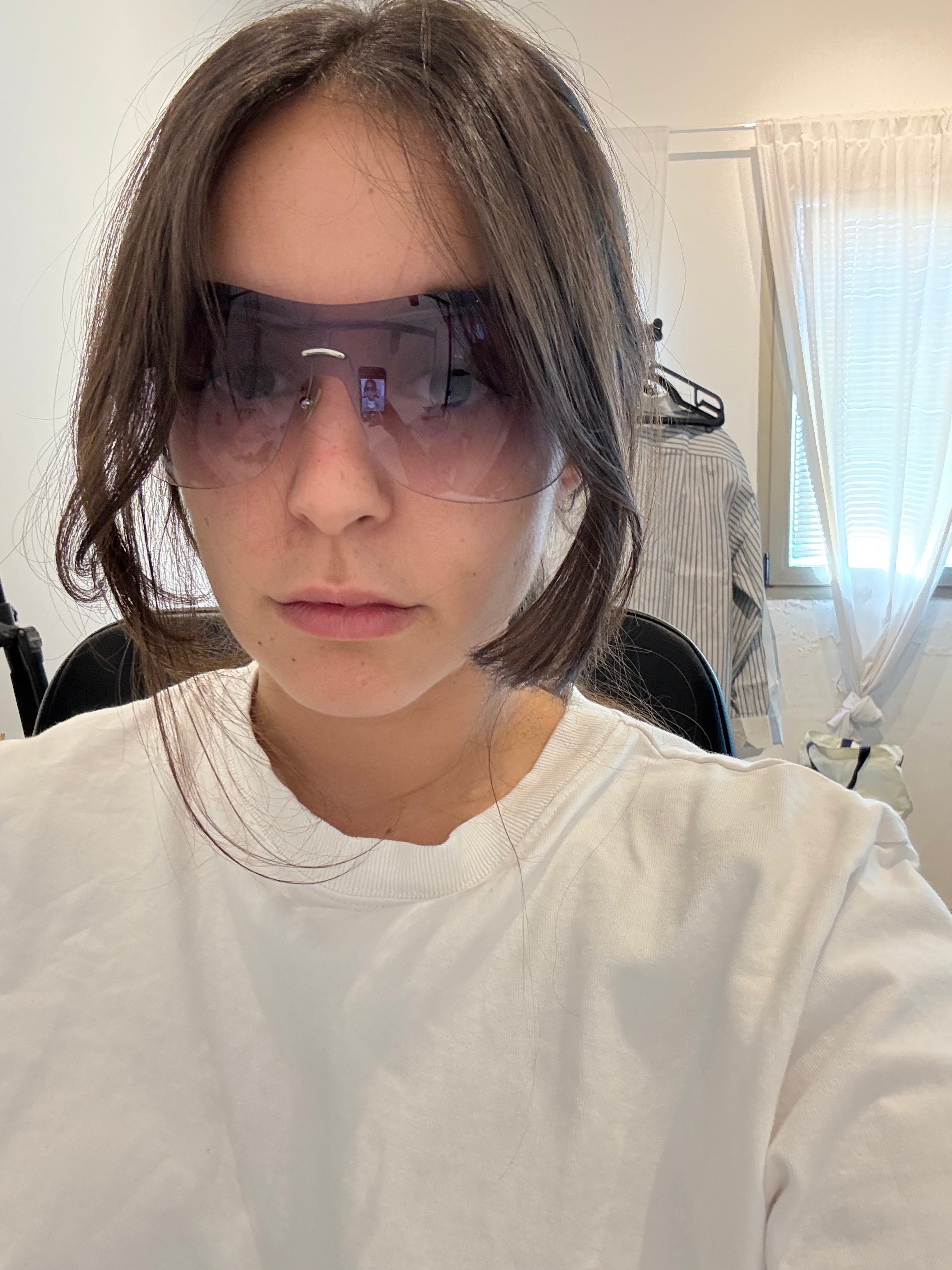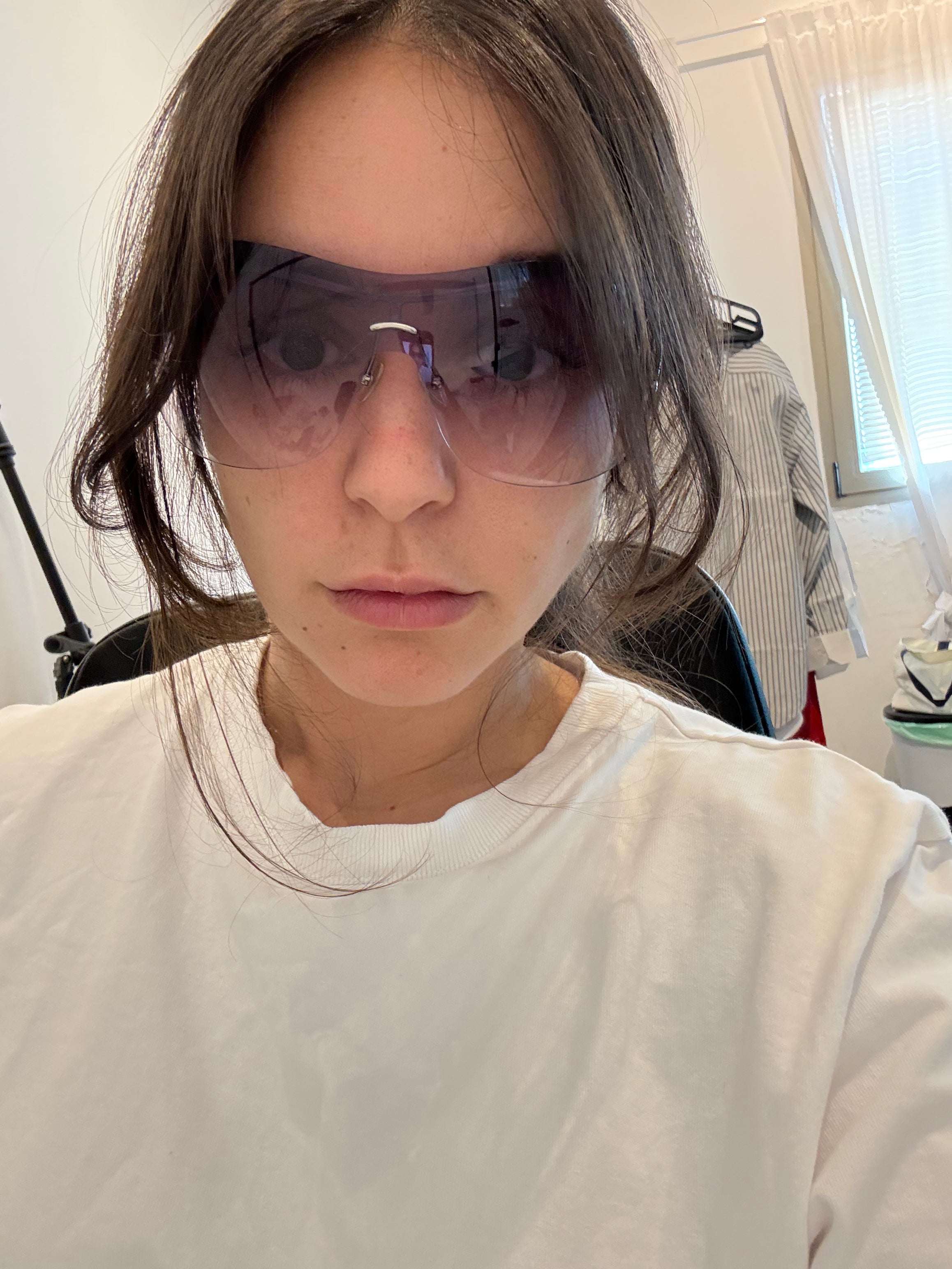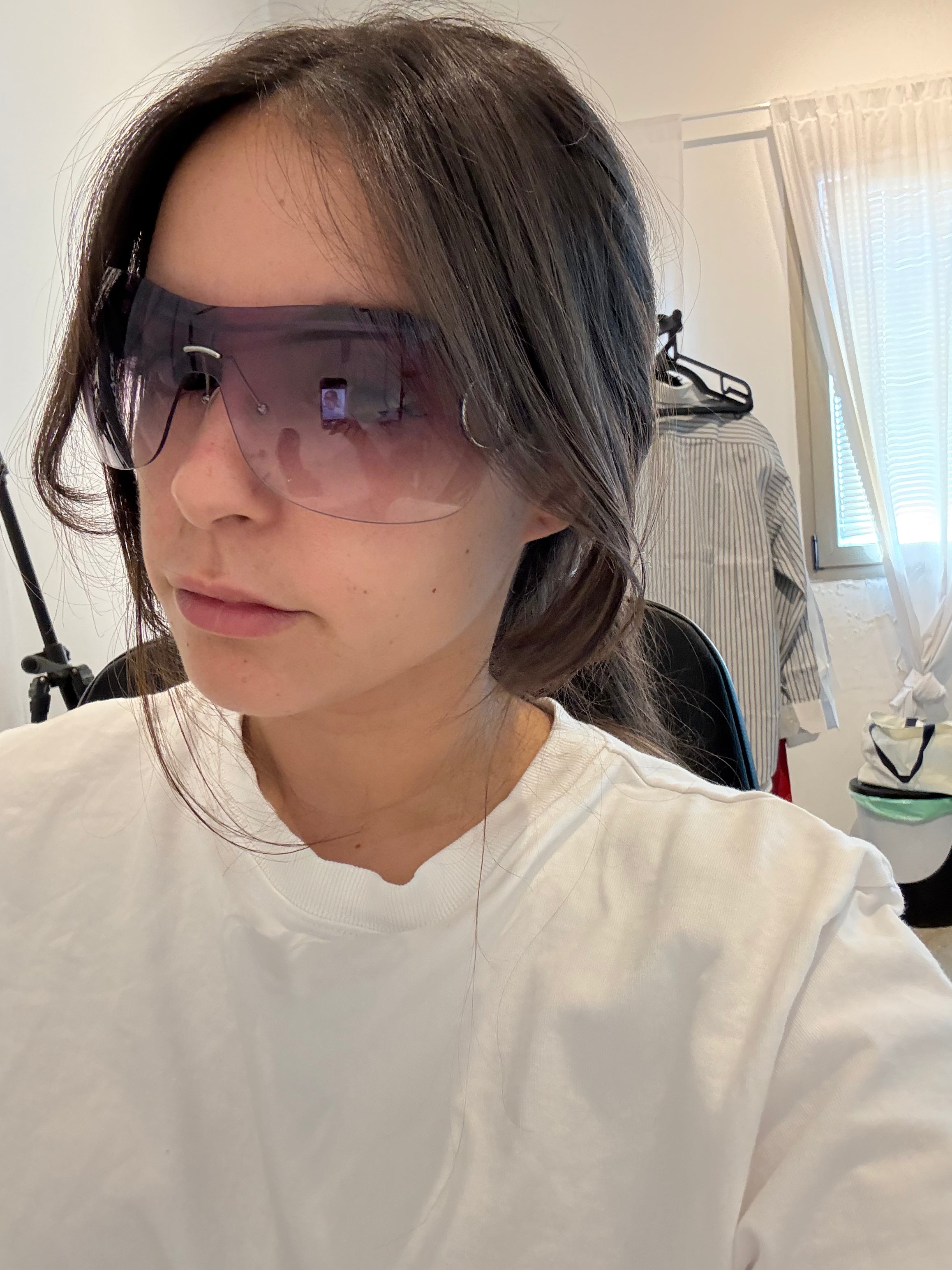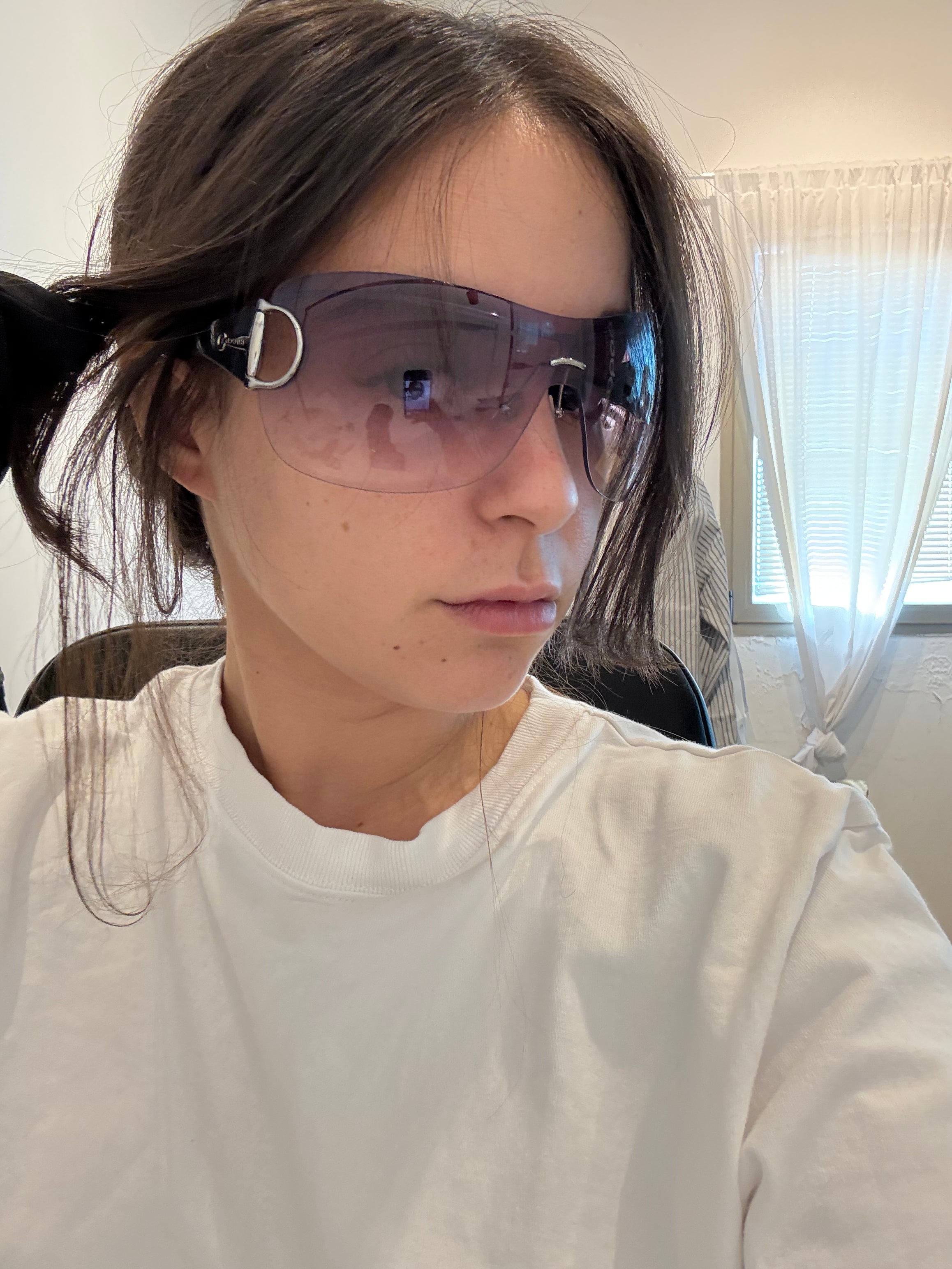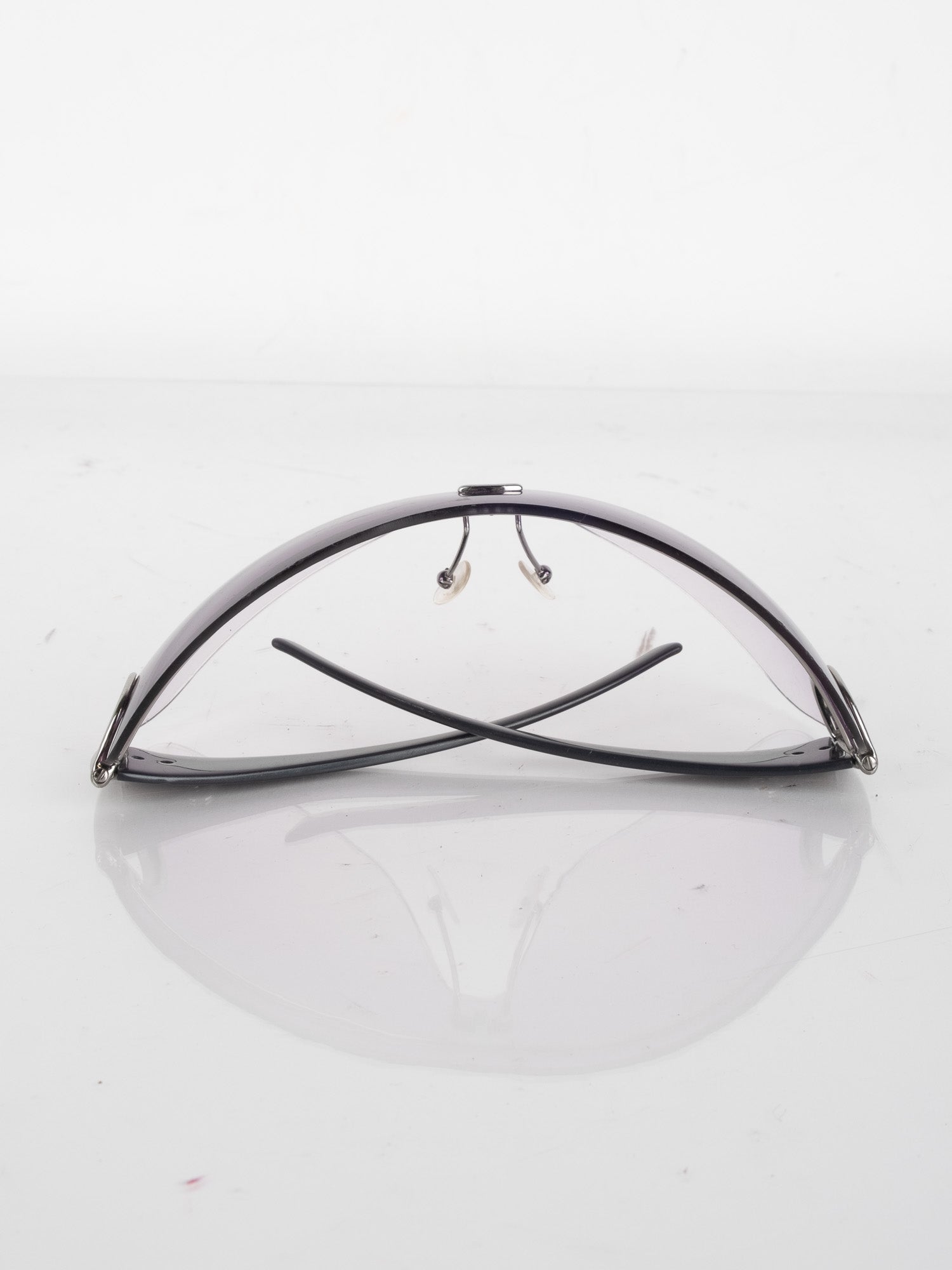 משקפי שמש שיילד ללא מסגרת מלאה, עדשה סגולה, זרועות מתכת כהות עם טבעות צד כסופות.