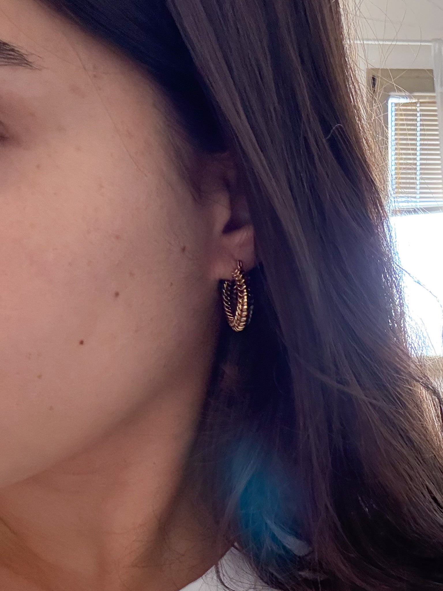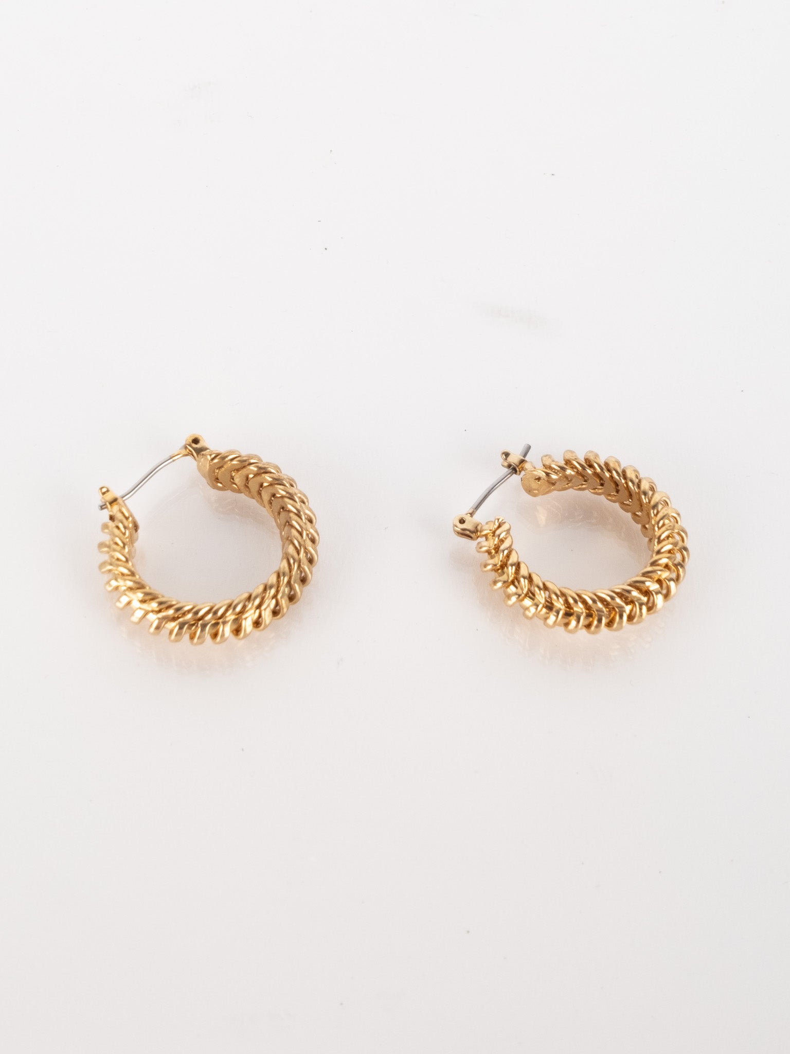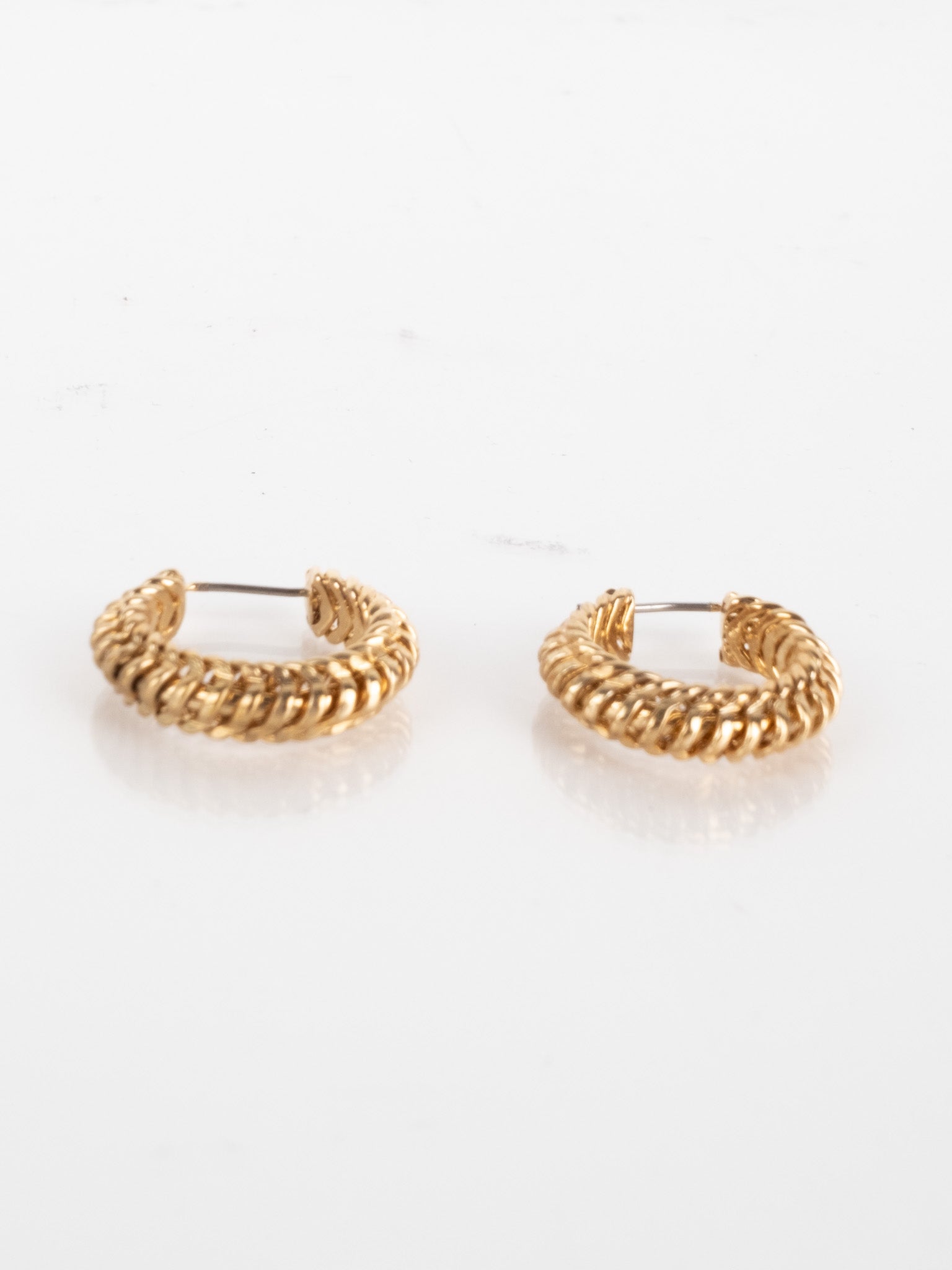 וינטג' יד שנייה. עגילי חישוק בציפוי זהב, בעיצוב אלגנטי עם טקסטורה עדינה שיושבת יפה על האוזן ומוסיפה מגע קלאסי ומואר לכל לוק.