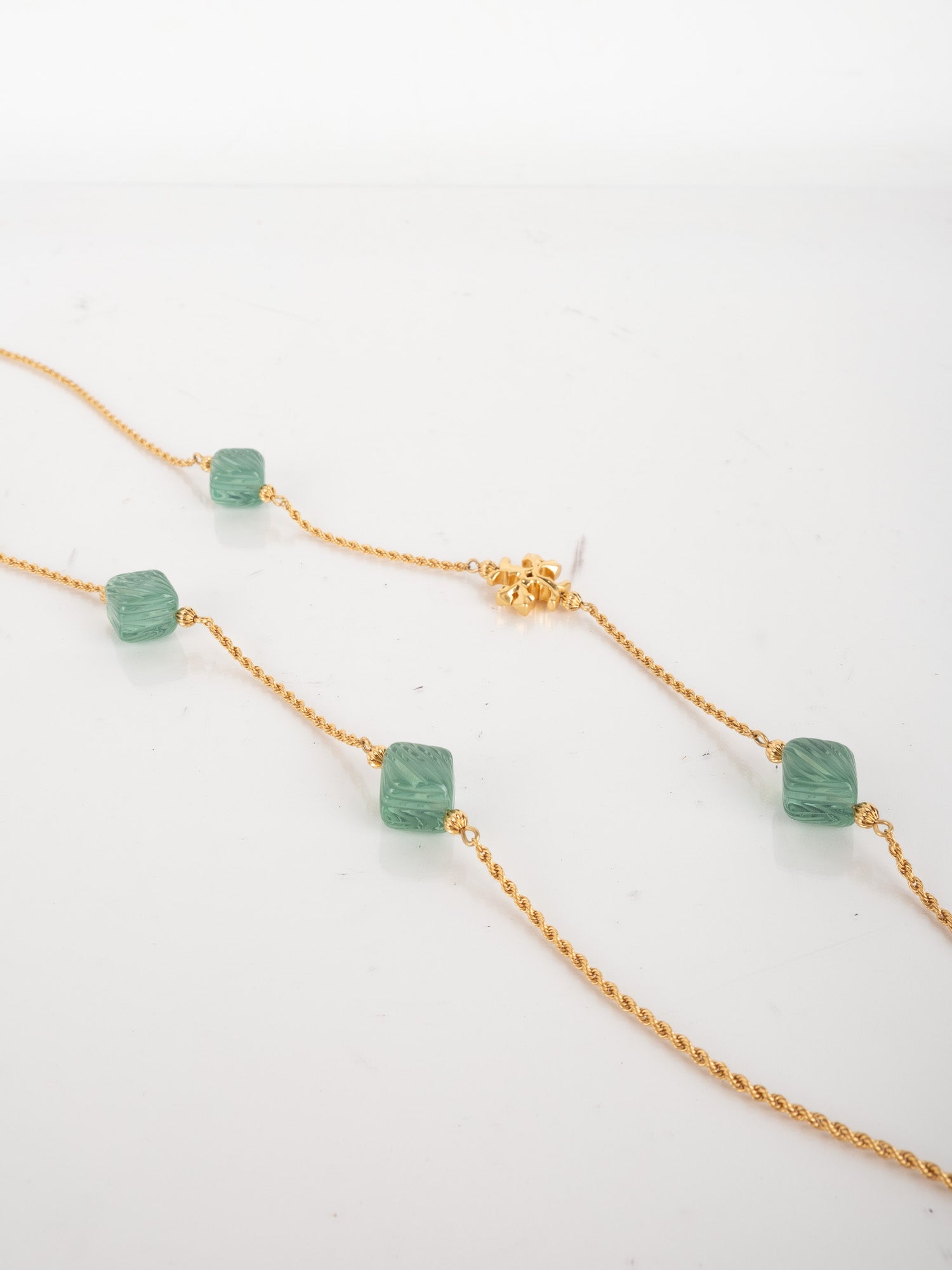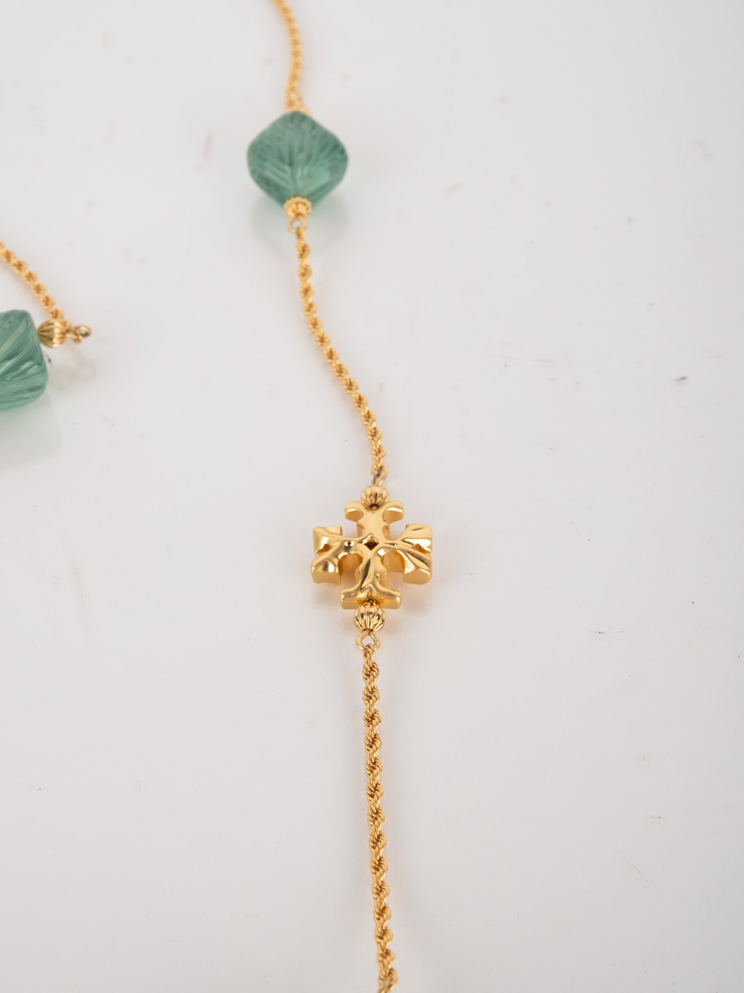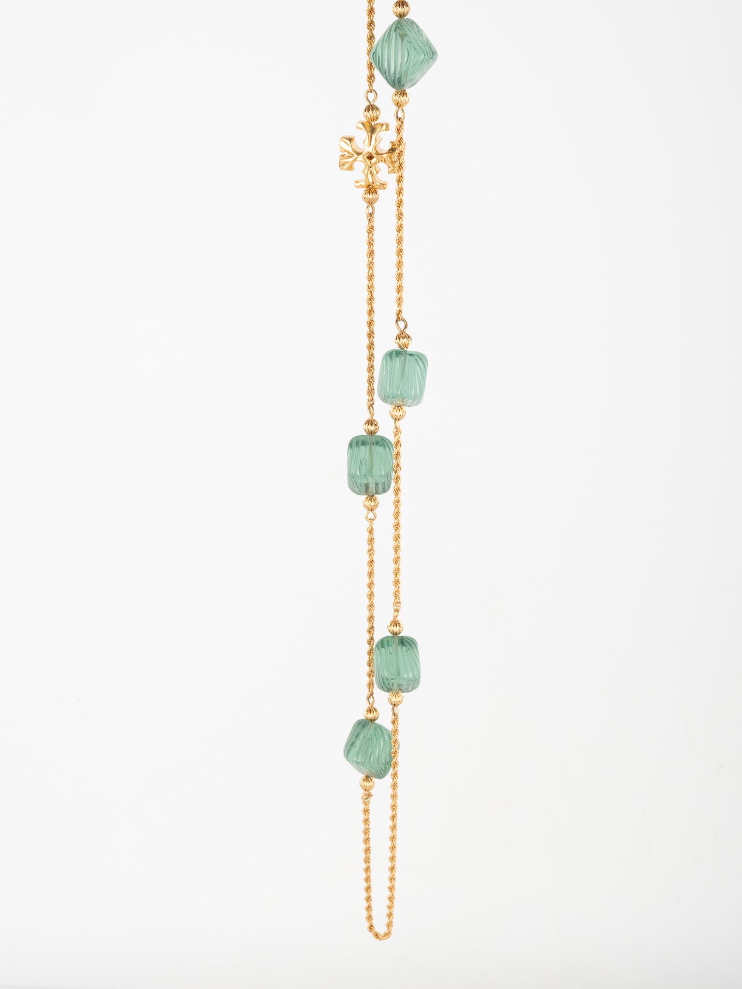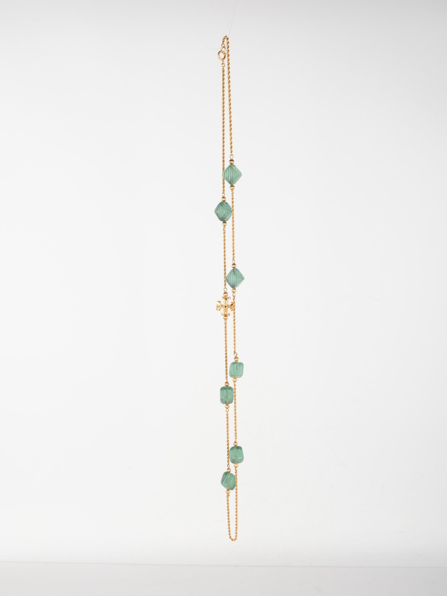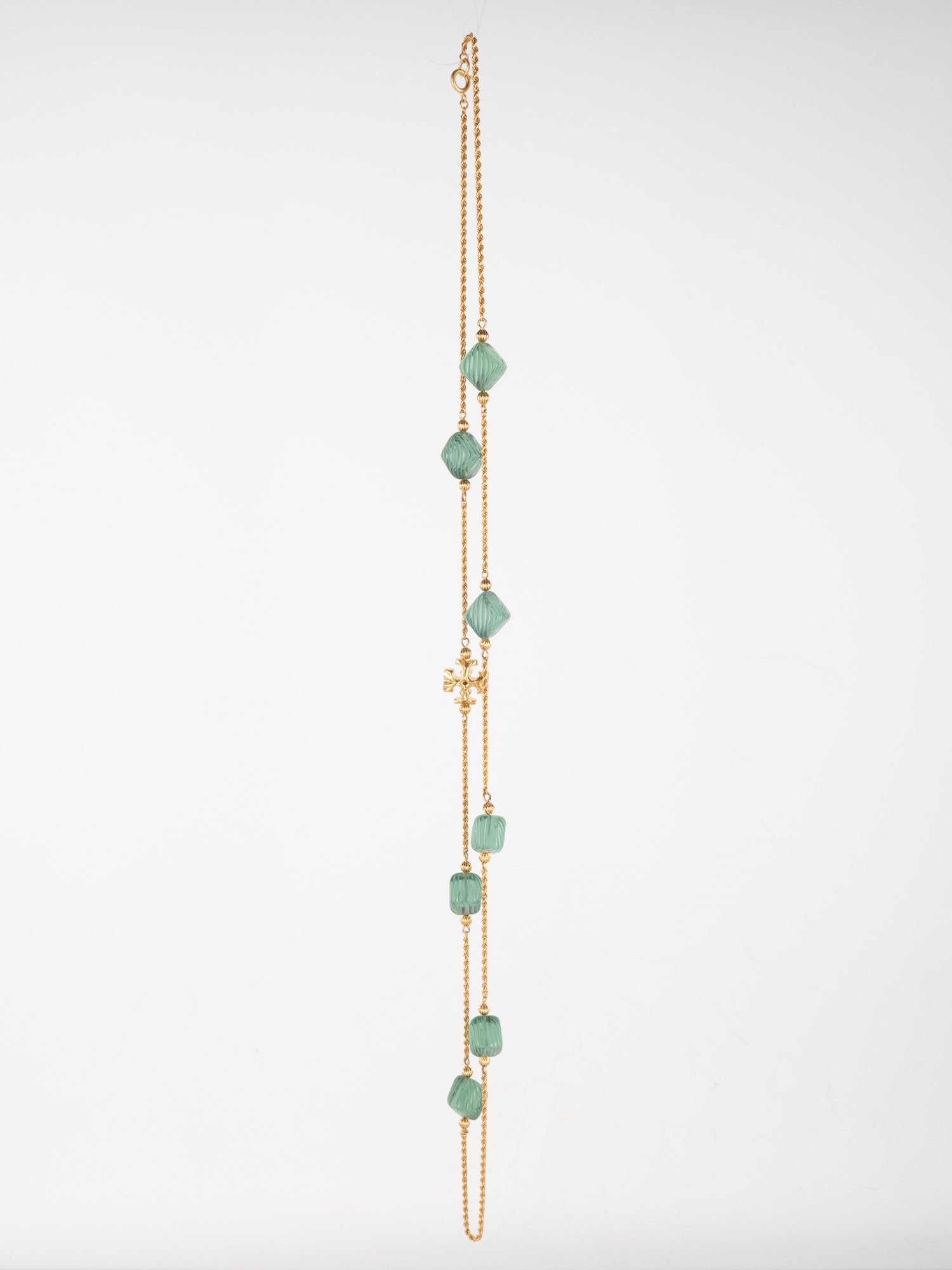 View Similar Productsשרשרת וינטג׳ יד שנייה של טורי ברץ' (Tory Burch) בעיצוב עדין ואלגנטי, משובצת אבנים ירוקות בגוון עמוק ומרקם מלוטש.