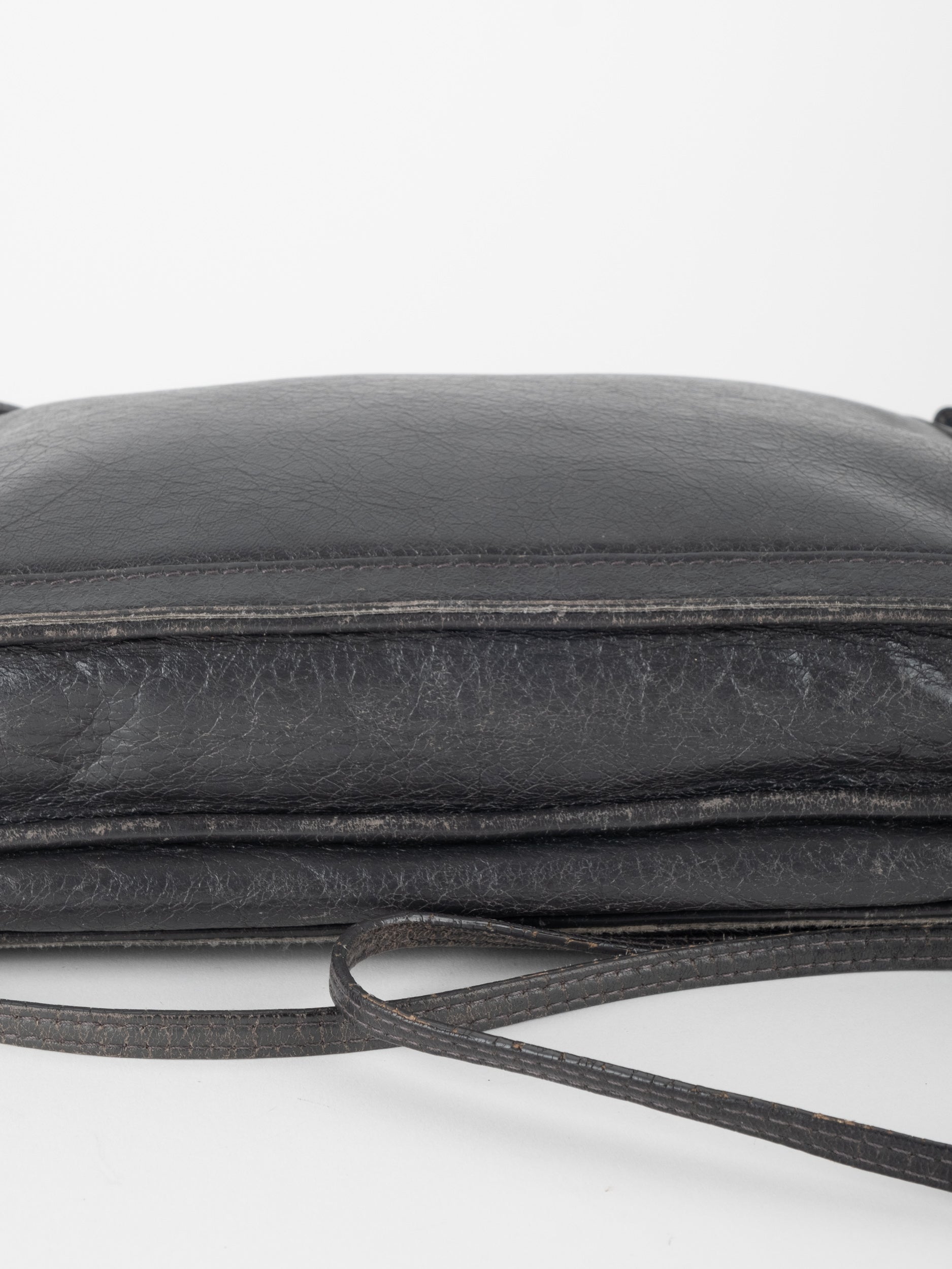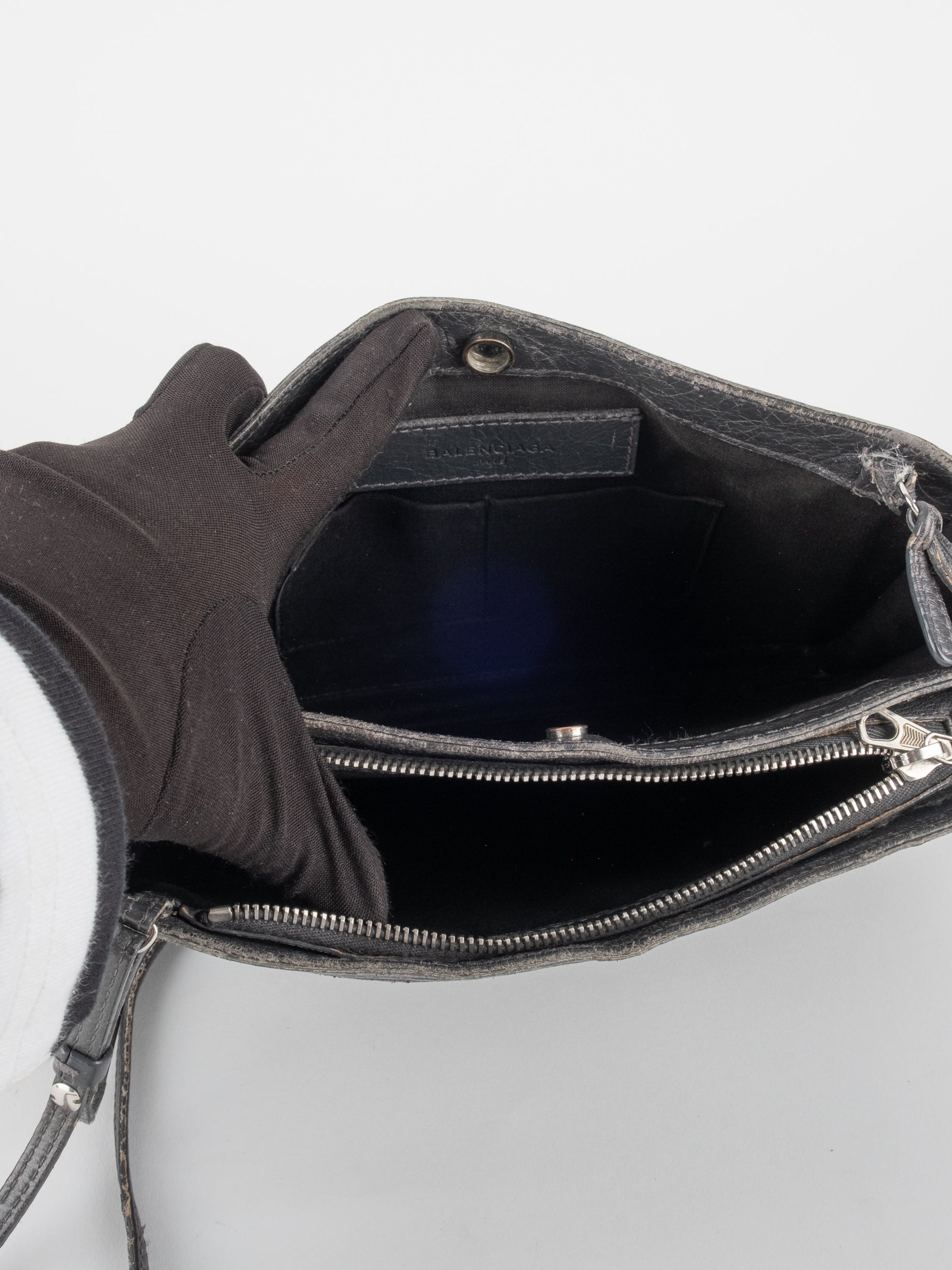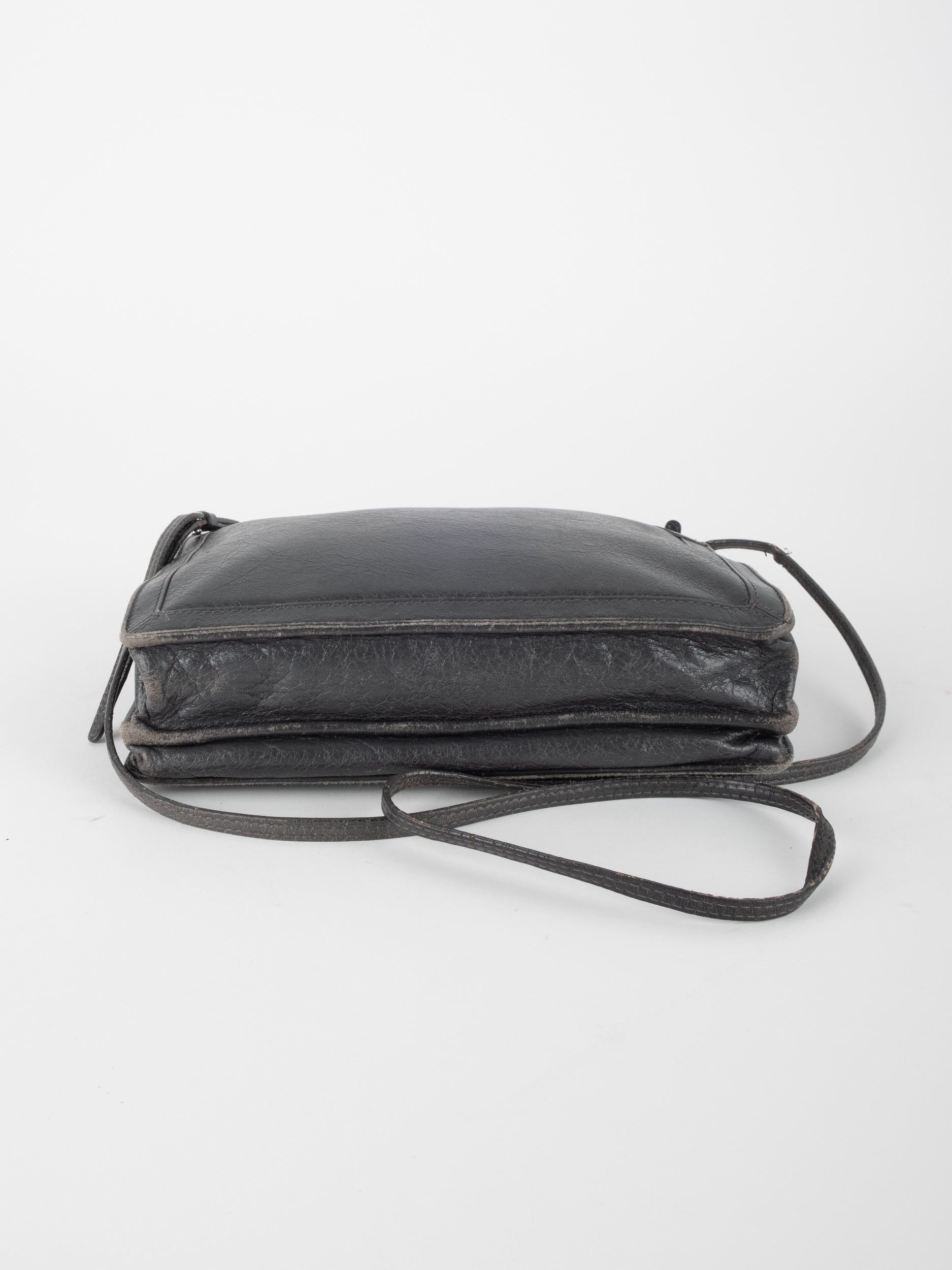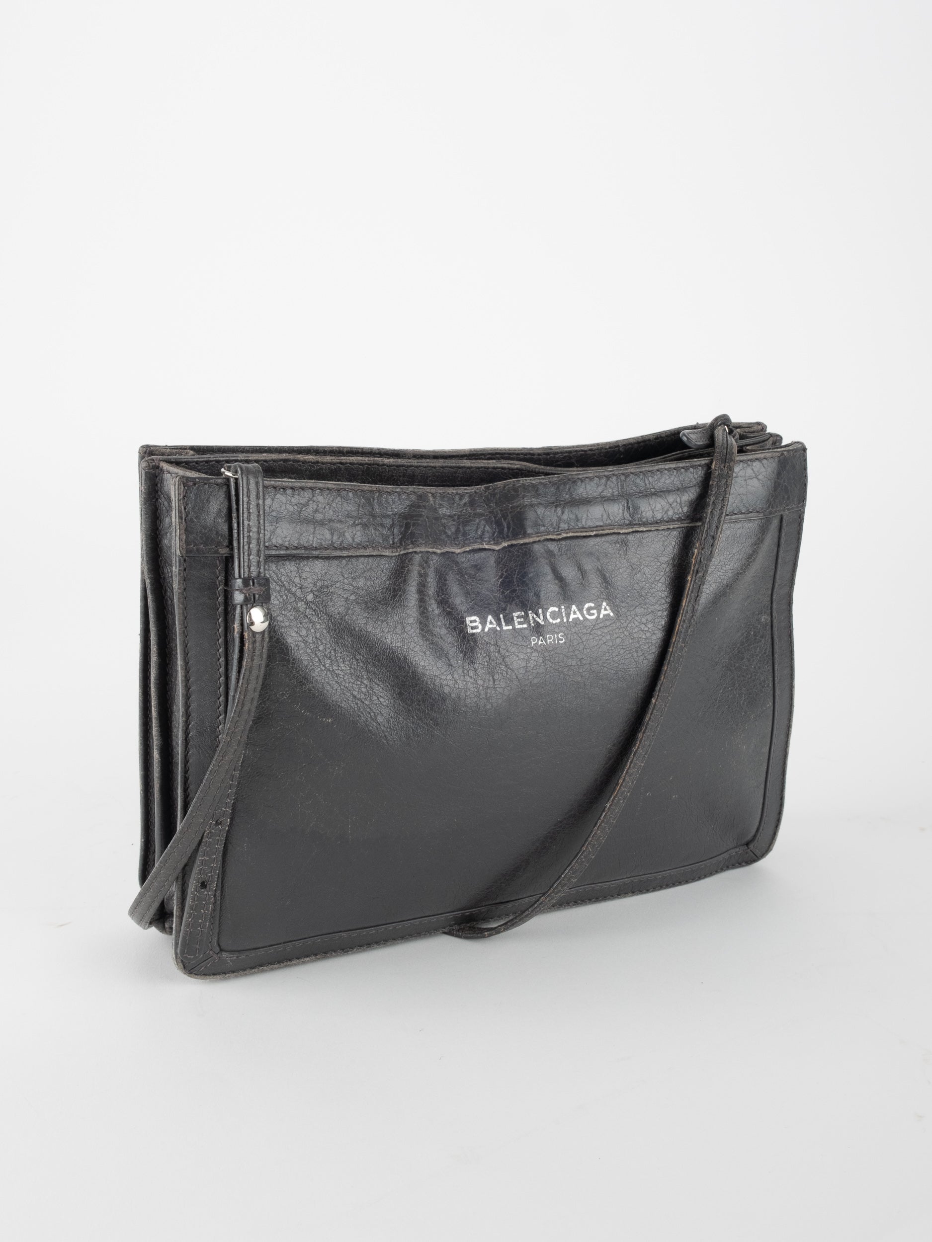 התיק עשוי עור במרקם טבעי בגוון שחור, עם רצועת כתף דקה ומתכווננת לנשיאה באלכסון או על הכתף. סגירת רוכסן עליונה ותא פנימי המחולק לשני תאים שטוחים, המאפשרים ארגון נוח של פריטים חיוניים. לוגו BALENCIAGA מודפס בחזית באופן עדין ואלגנטי. המבנה רך וגמיש אך שומר על צורה נקייה.