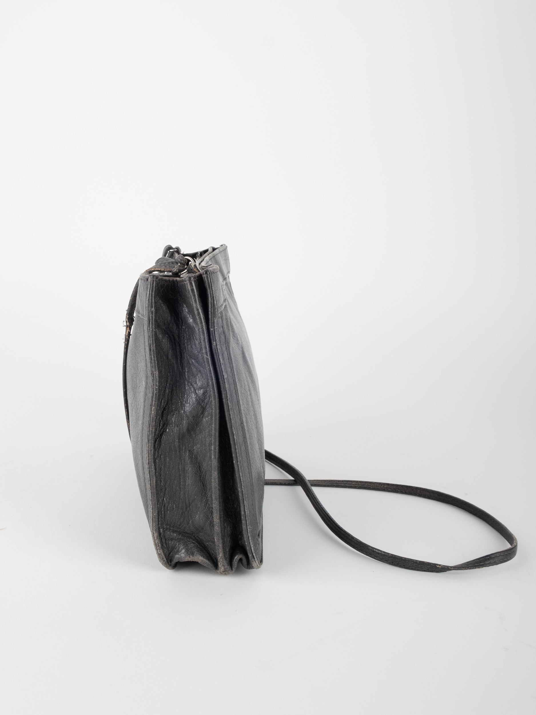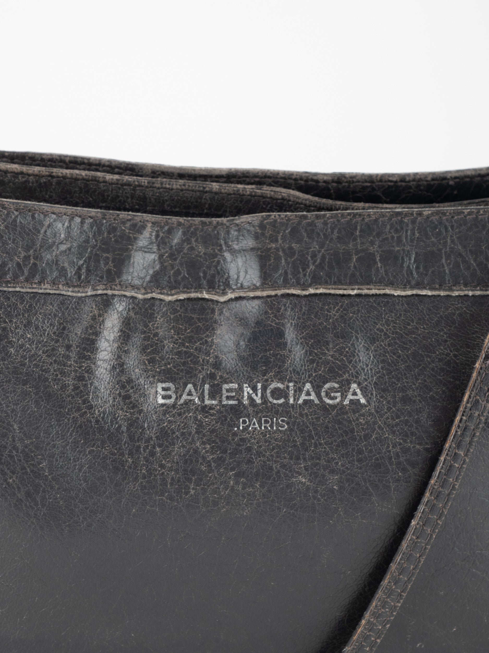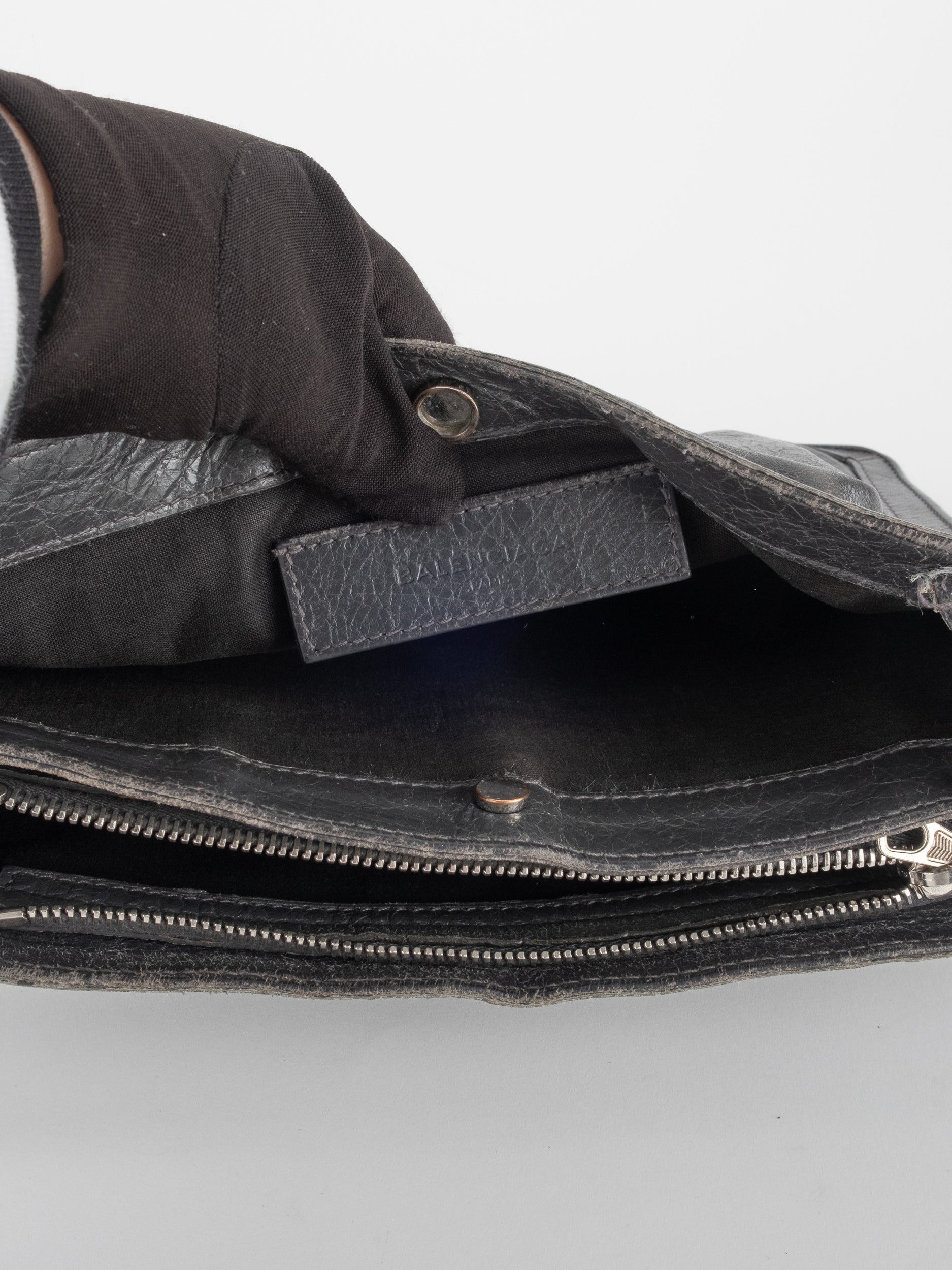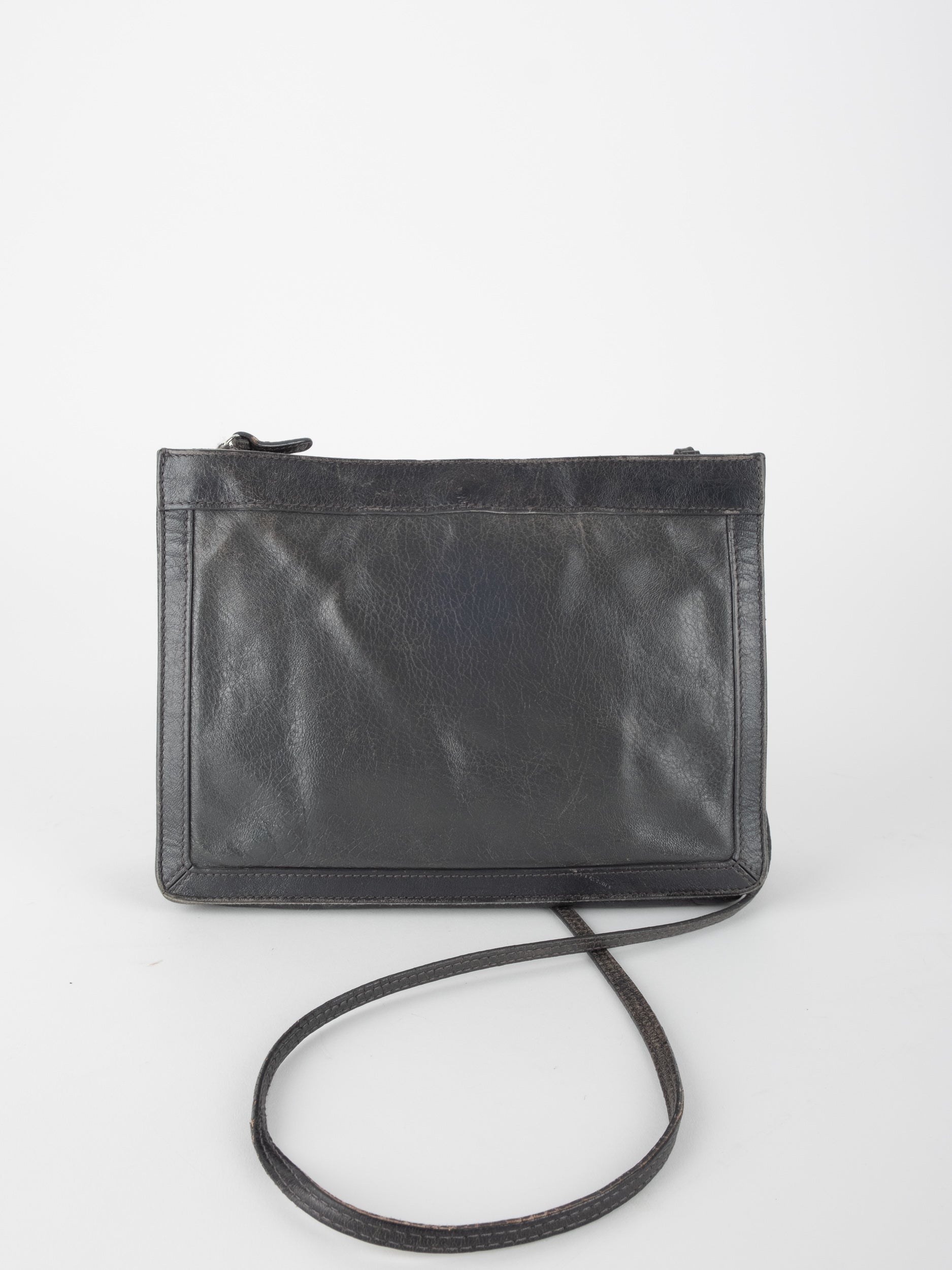 התיק עשוי עור במרקם טבעי בגוון שחור, עם רצועת כתף דקה ומתכווננת לנשיאה באלכסון או על הכתף. סגירת רוכסן עליונה ותא פנימי המחולק לשני תאים שטוחים, המאפשרים ארגון נוח של פריטים חיוניים. לוגו BALENCIAGA מודפס בחזית באופן עדין ואלגנטי. המבנה רך וגמיש אך שומר על צורה נקייה.