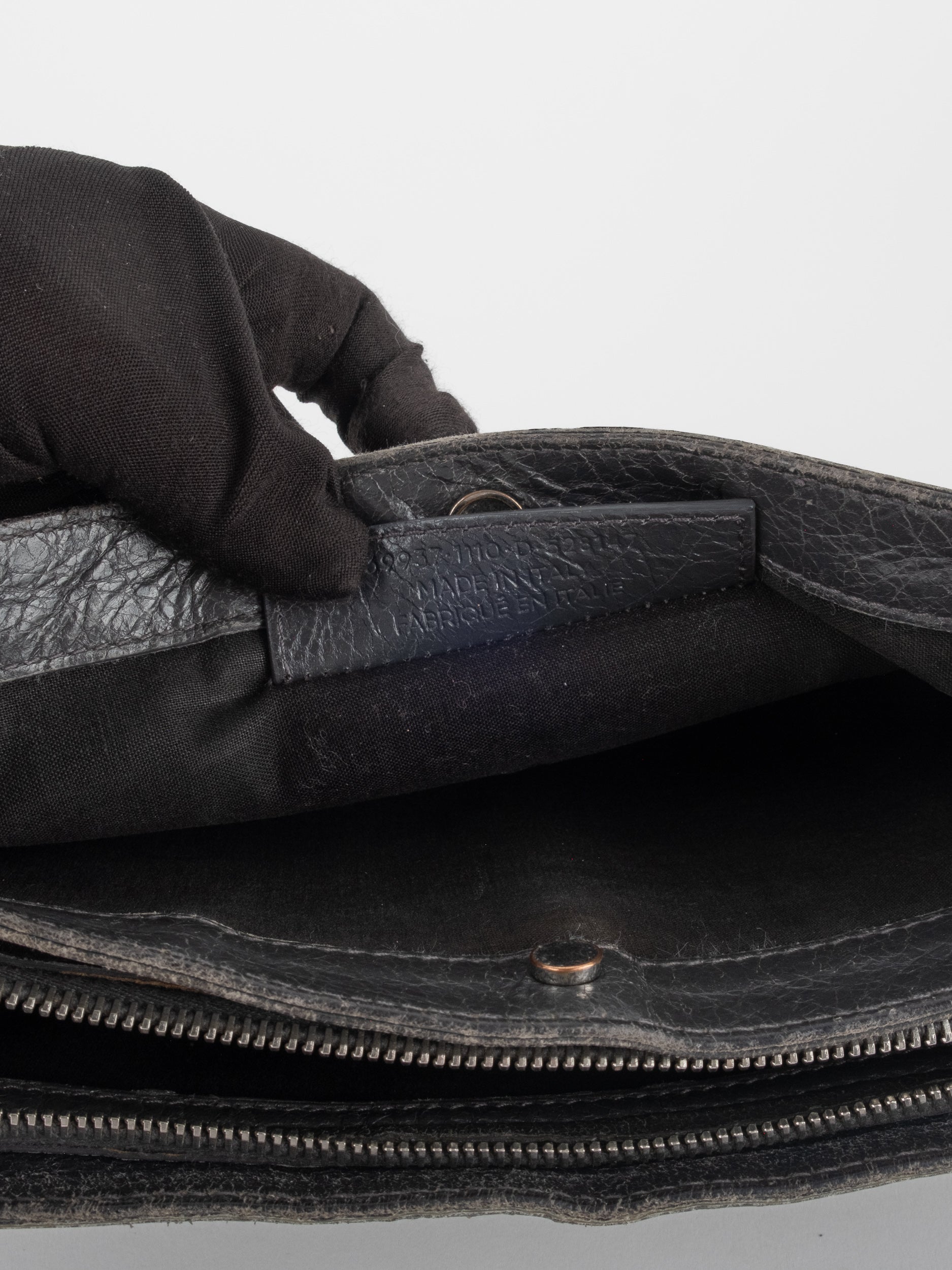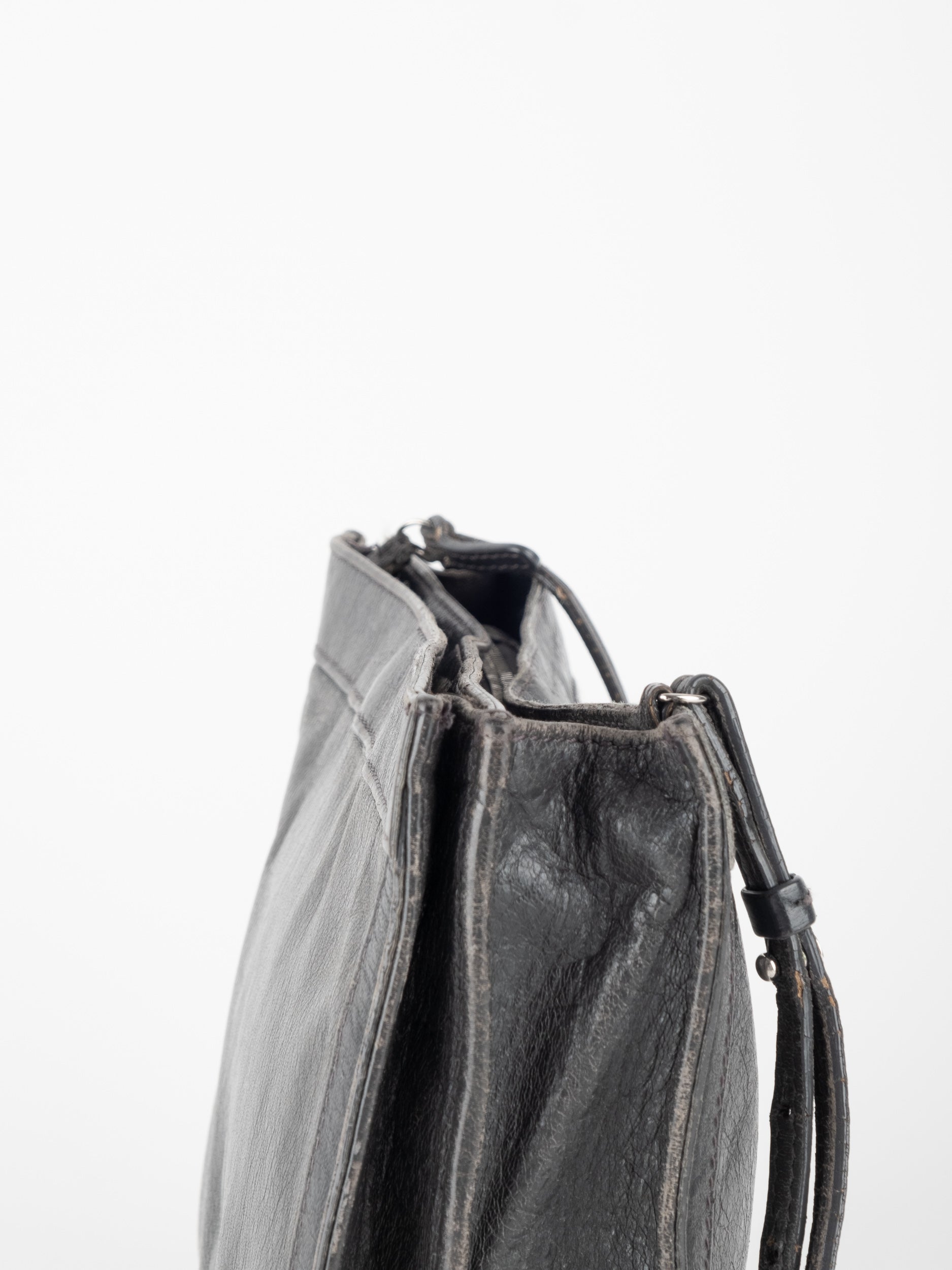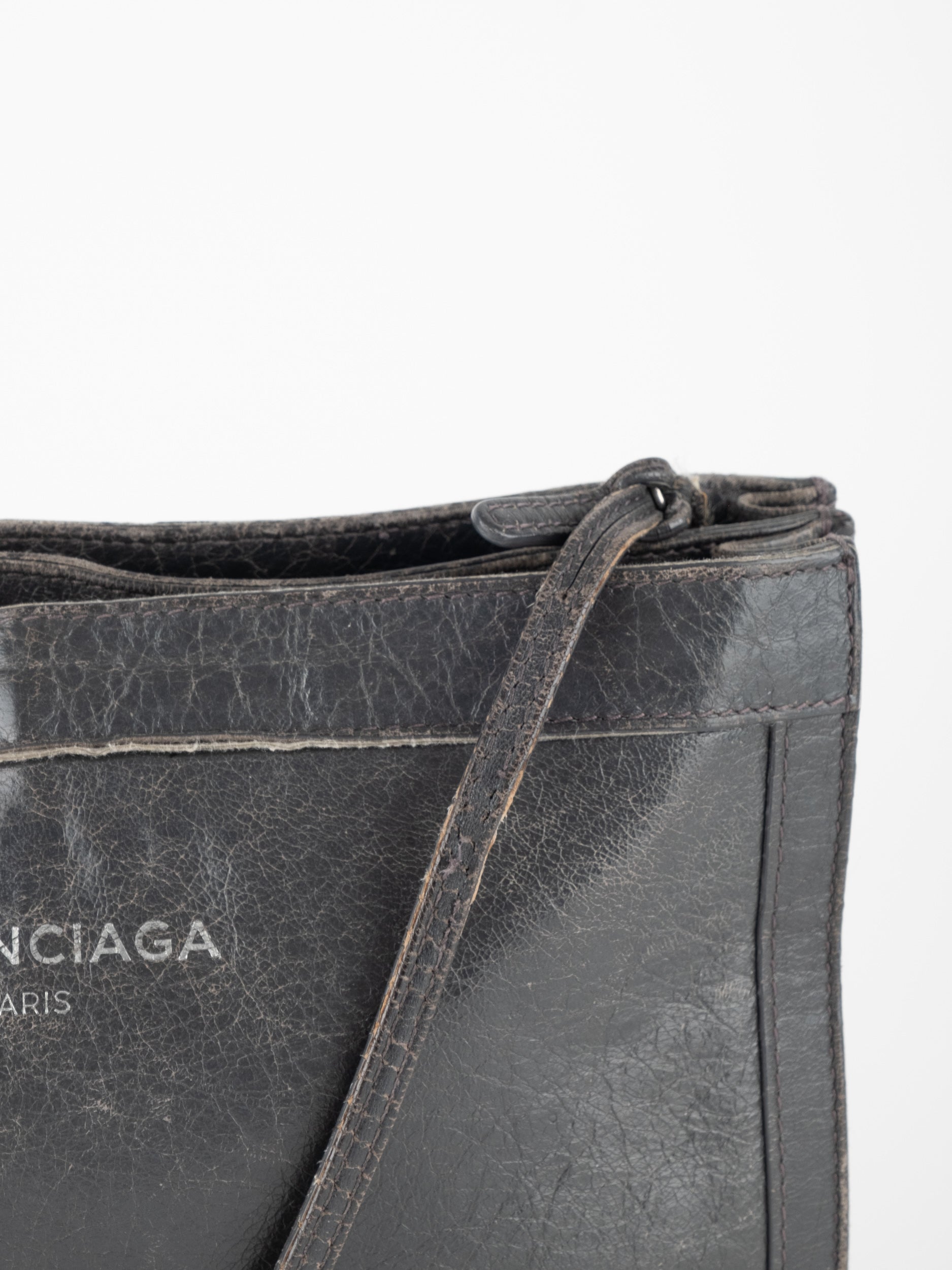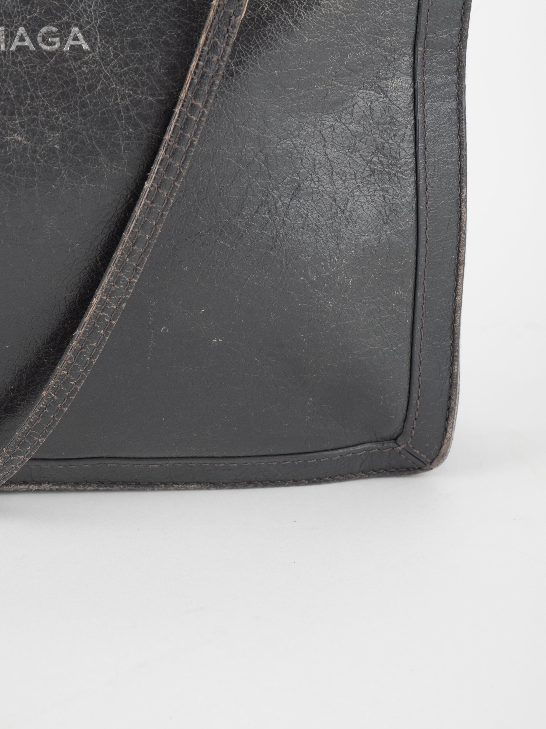 התיק עשוי עור במרקם טבעי בגוון שחור, עם רצועת כתף דקה ומתכווננת לנשיאה באלכסון או על הכתף. סגירת רוכסן עליונה ותא פנימי המחולק לשני תאים שטוחים, המאפשרים ארגון נוח של פריטים חיוניים. לוגו BALENCIAGA מודפס בחזית באופן עדין ואלגנטי. המבנה רך וגמיש אך שומר על צורה נקייה.