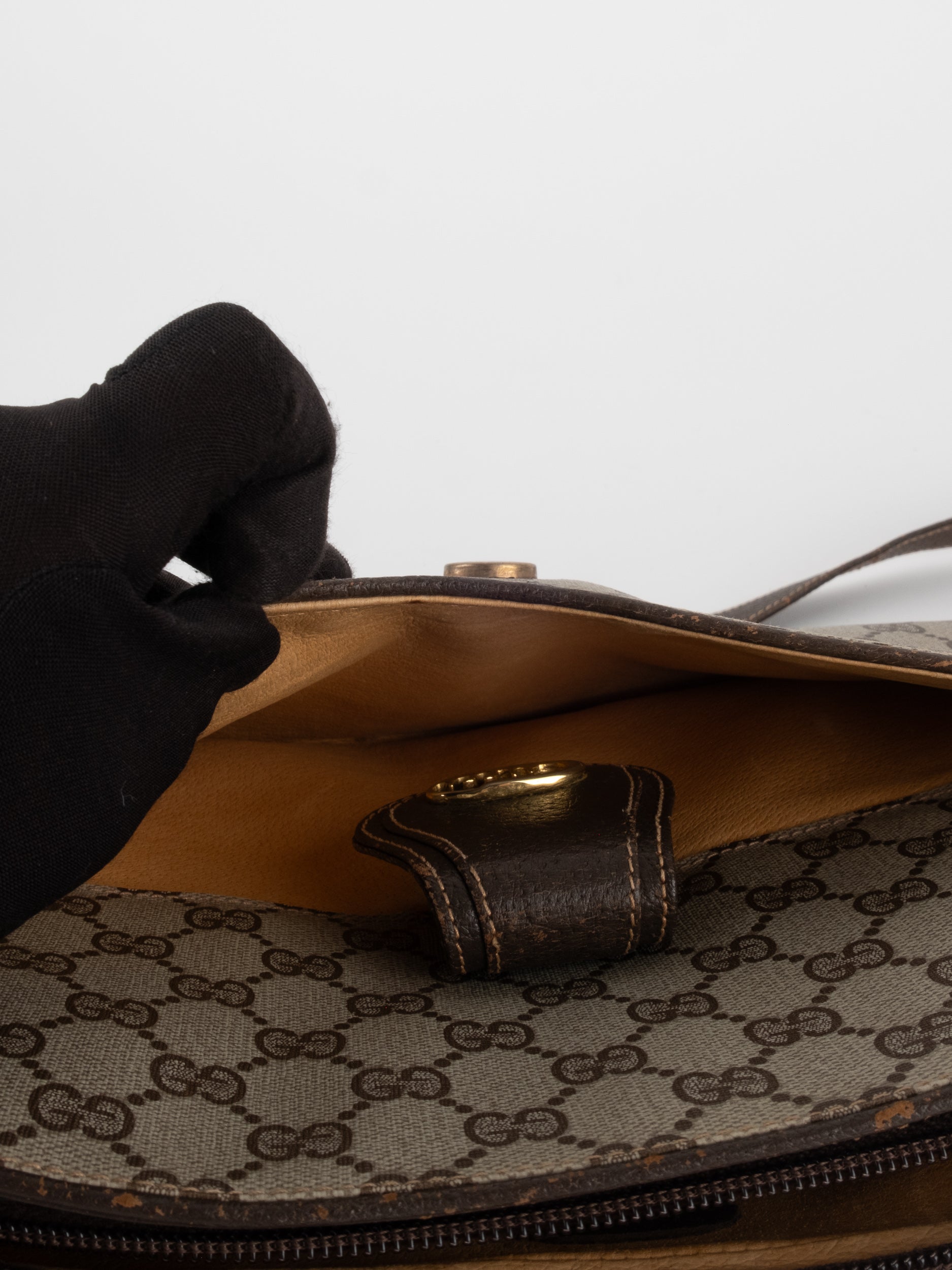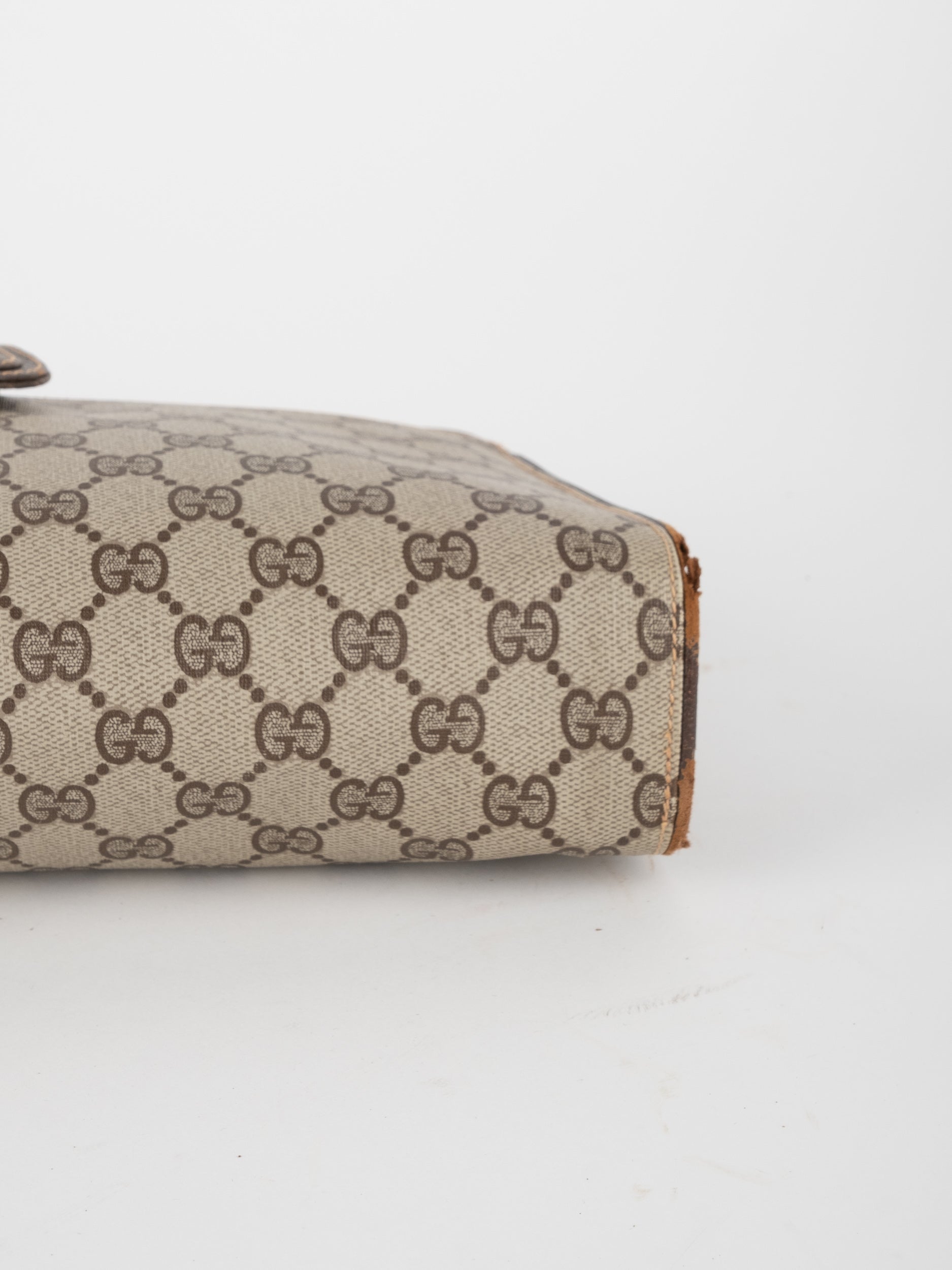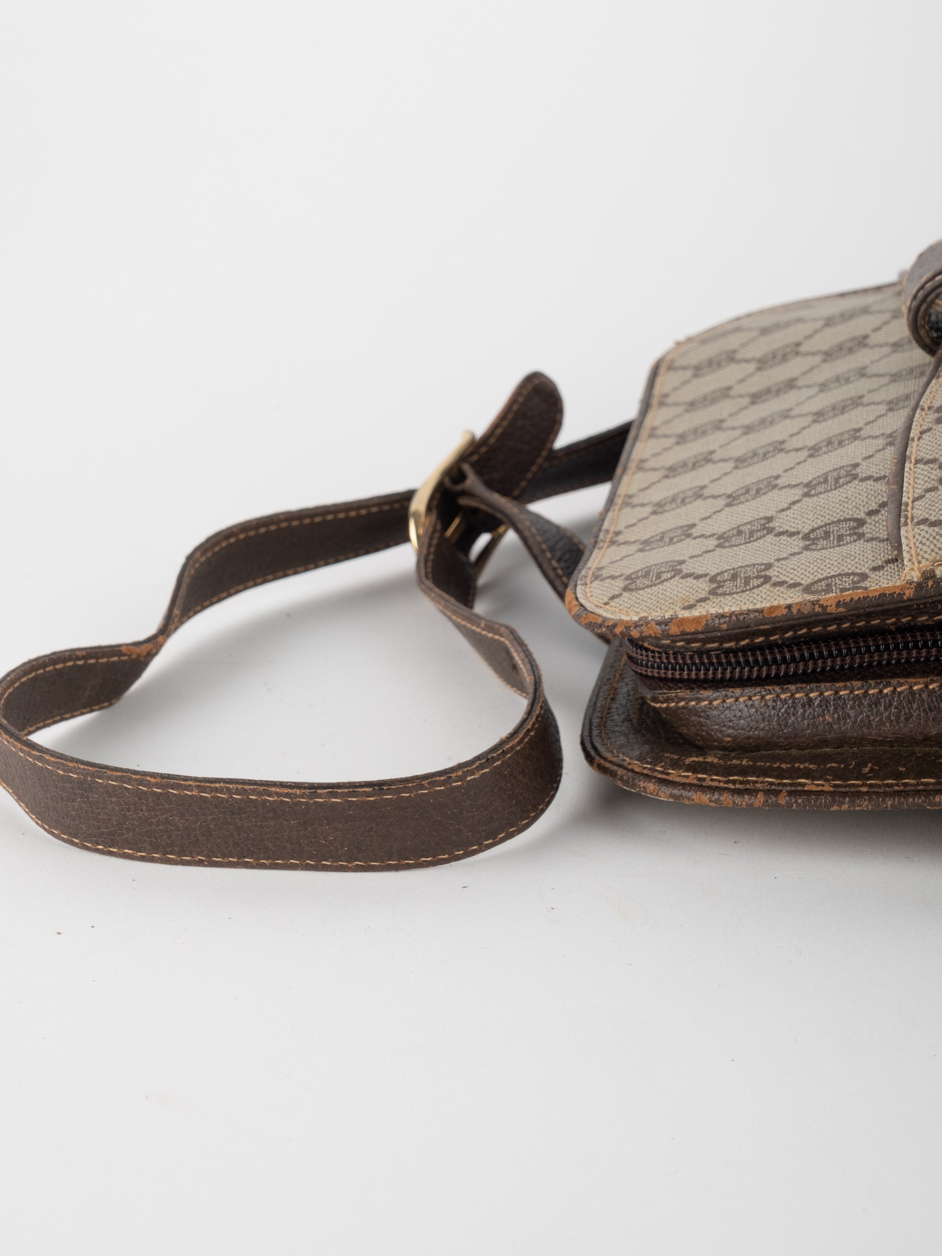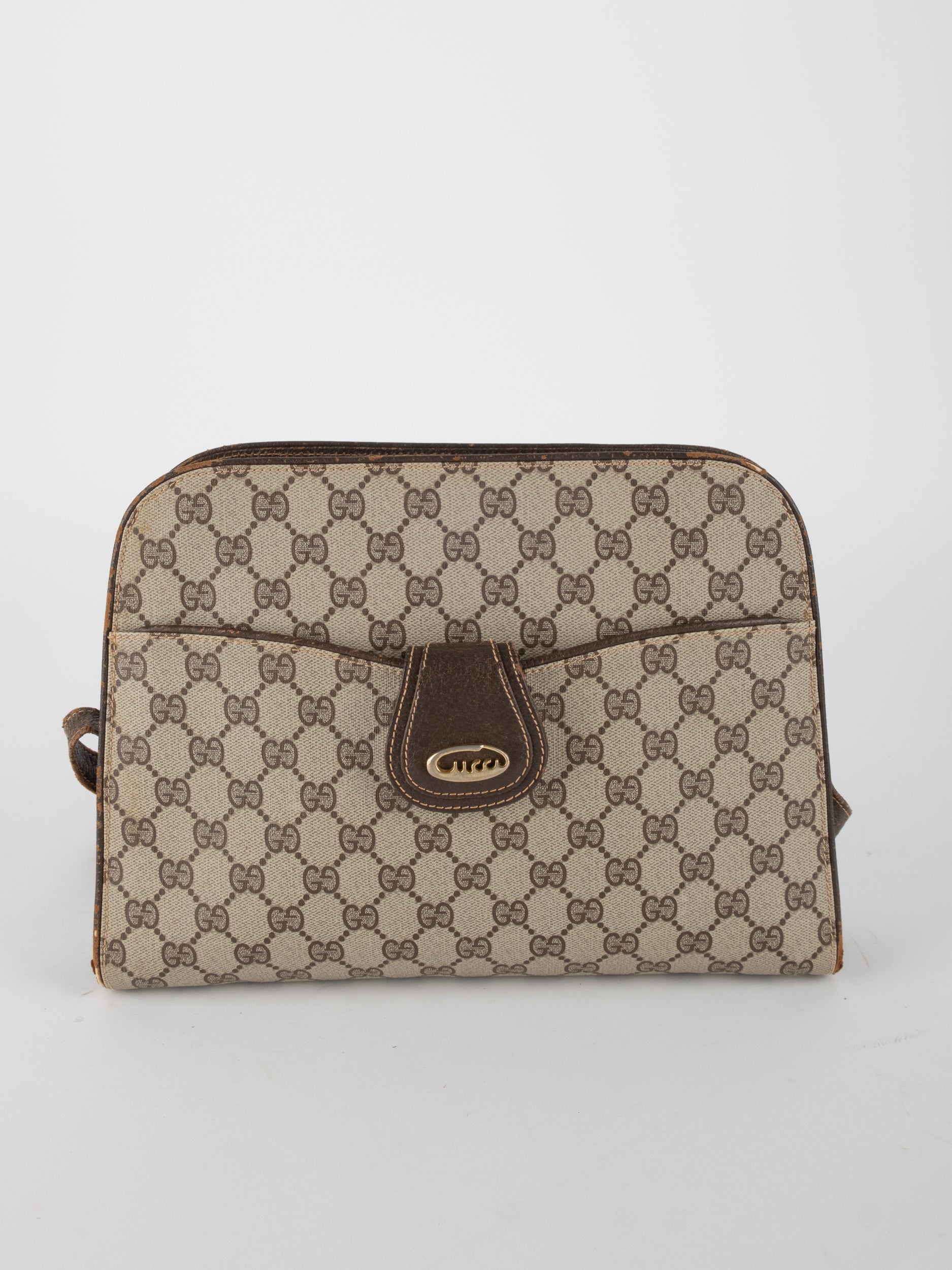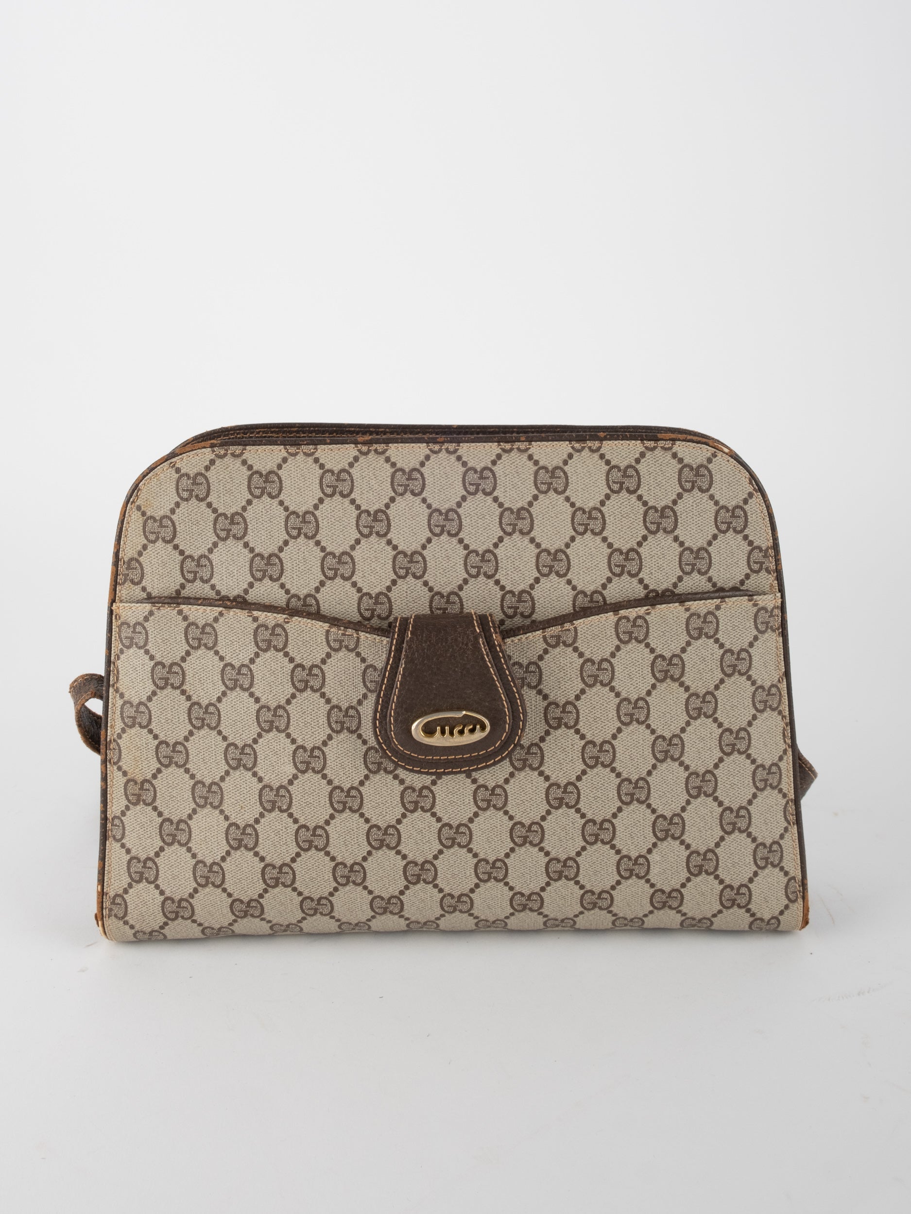 גוצי GUCCI וינטג' יד שנייה בעיצוב קלאסי ועדין עם דוגמת GG מונוגרמה בגווני בז’ וחום. תיק קומפקטי עם קווים מעוגלים ורצועת כתף דקה, שמשלב סטייל איטלקי על־זמני עם שימושיות יומיומית ונוכחות שקטה.