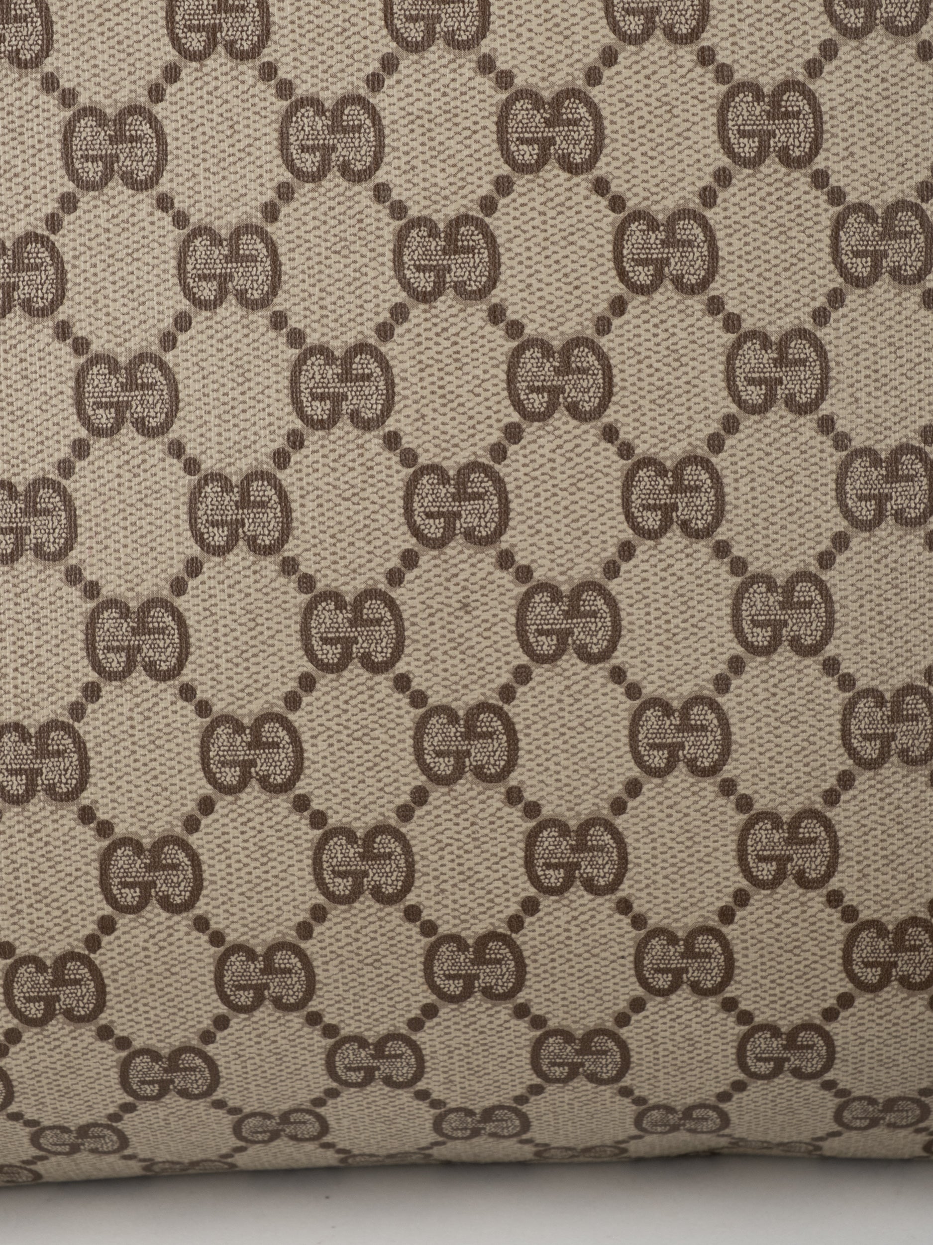 התיק עשוי בד קנבס מצופה בדוגמת GG בגווני בז’ עם עיטורי עור חום כהה. סגירה קדמית באמצעות לשונית עור עם כפתור לחיצה מתכתי, רצועת כתף ארוכה לנשיאה נוחה, ומבנה שטוח יחסית עם חלל פנימי מסודר. גודל אידיאלי לשימוש יומיומי קליל או כפריט משלים לערב.