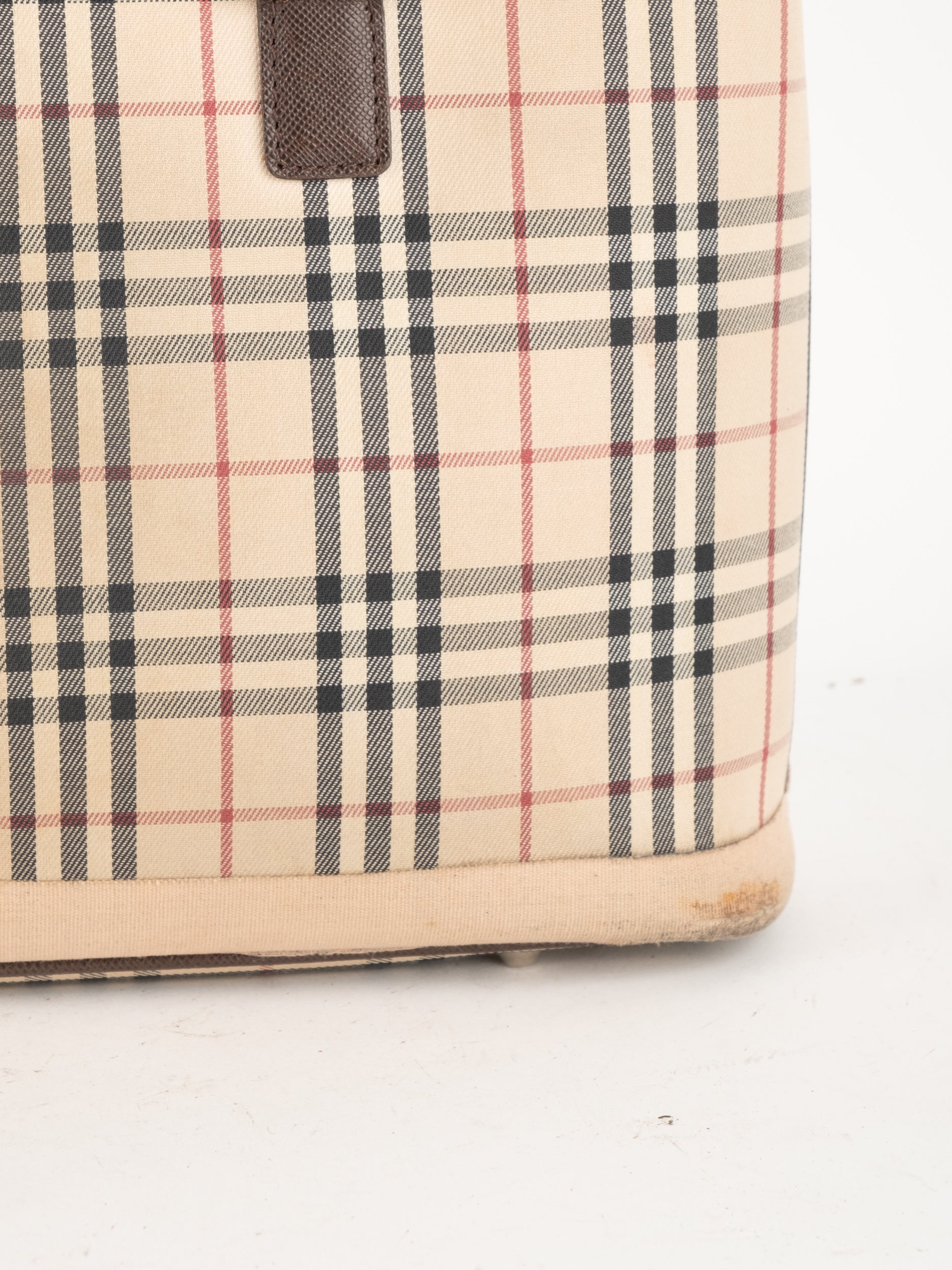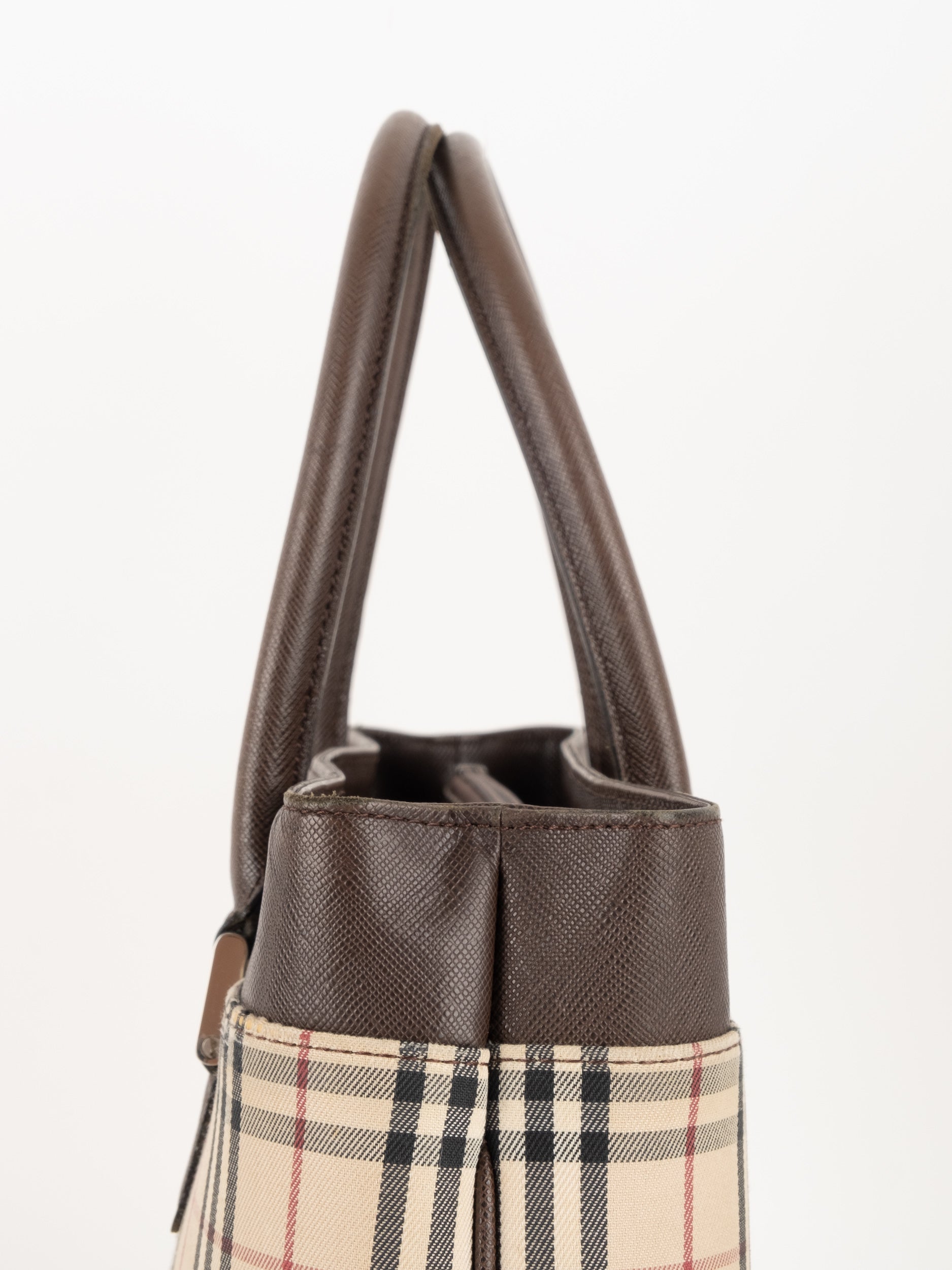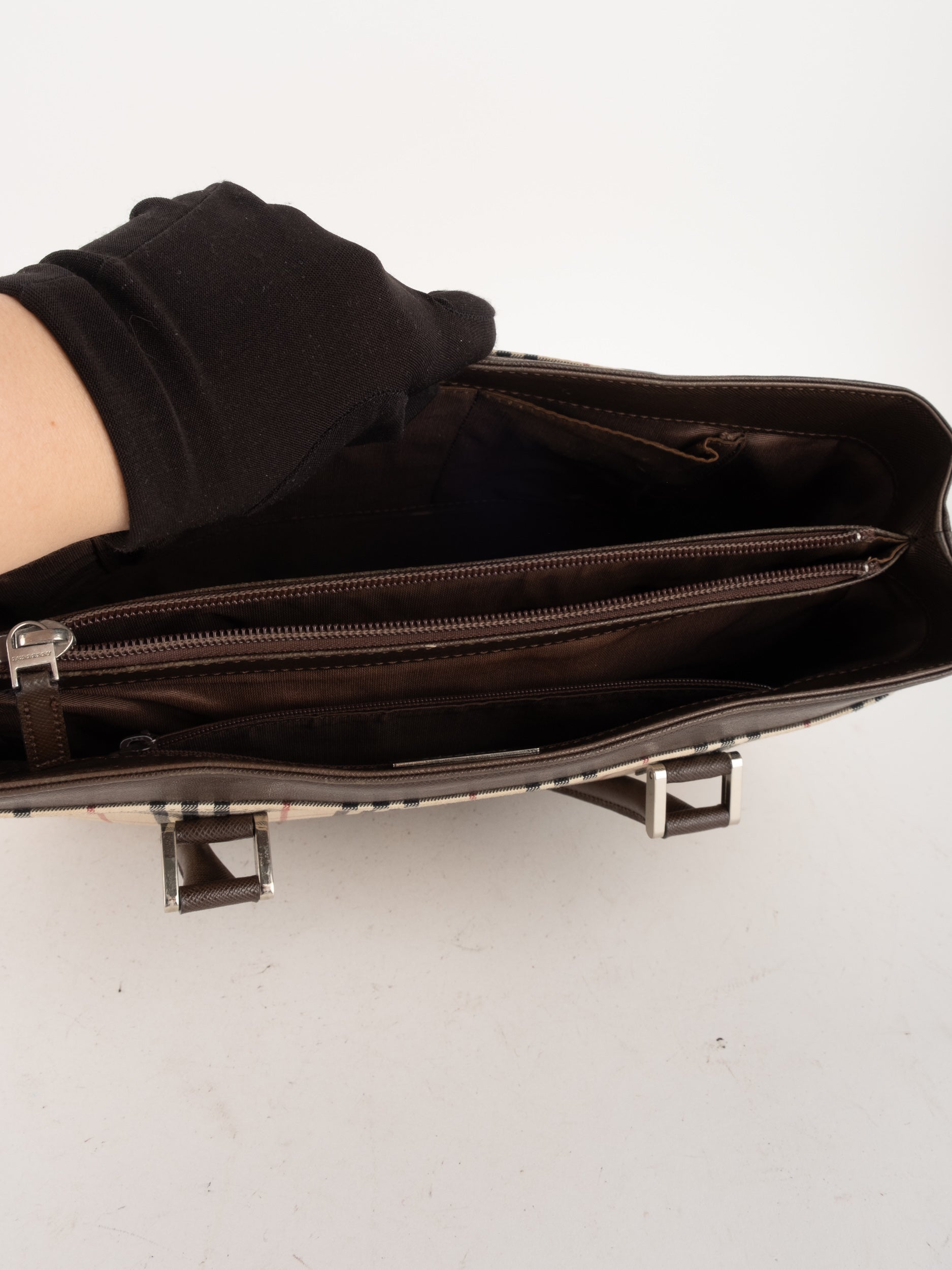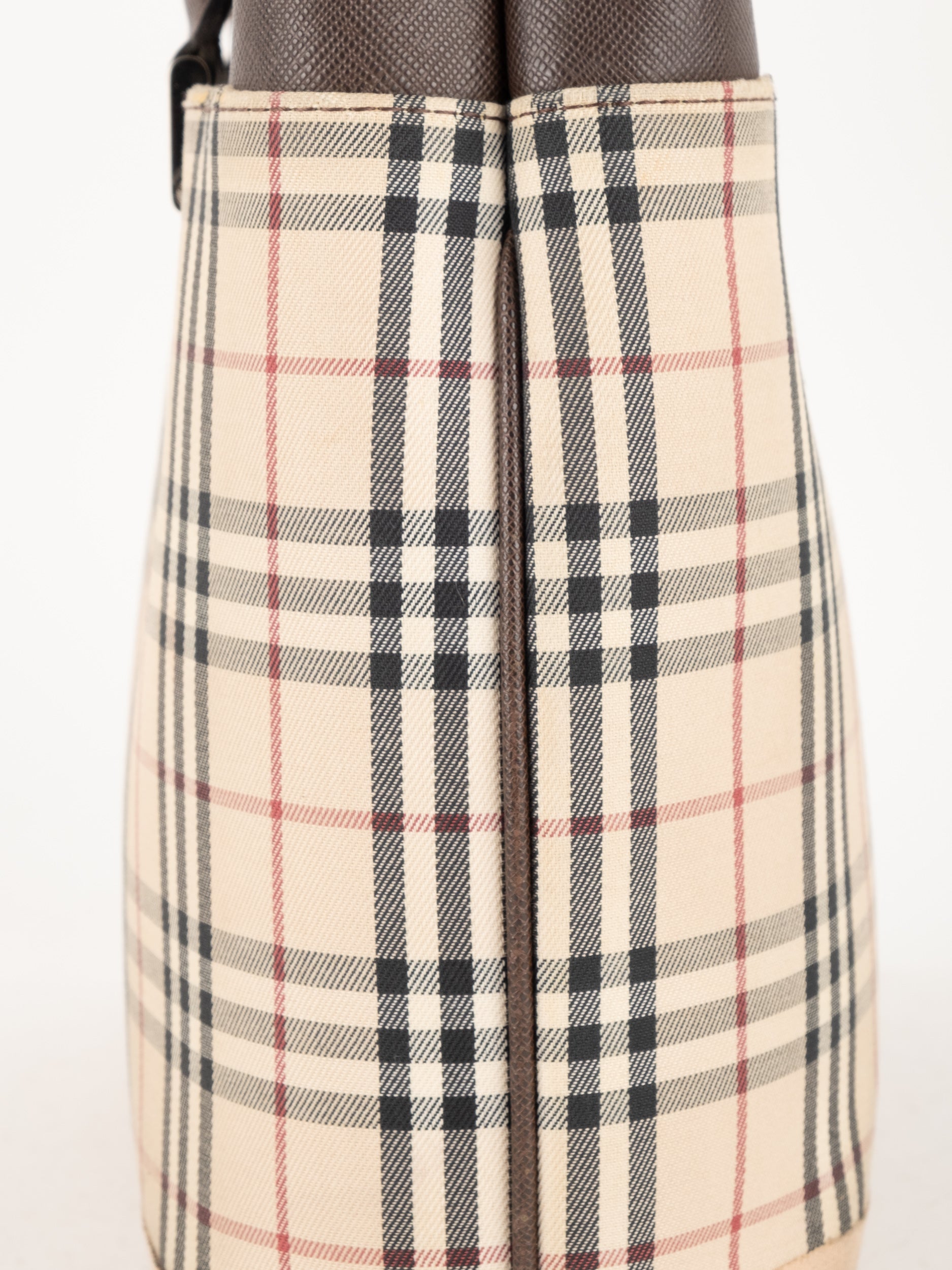 תיק של בית האופנה הבריטי Burberry ברברי – וינטג' יד שנייה, בעיצוב קלאסי מדוגמת Nova Check האייקונית של המותג. דוגמת המשבצות המזוהה עם Burberry הפכה במשך השנים לאחד הסמלים הבולטים של אופנה בריטית אלגנטית ועל-זמנית.