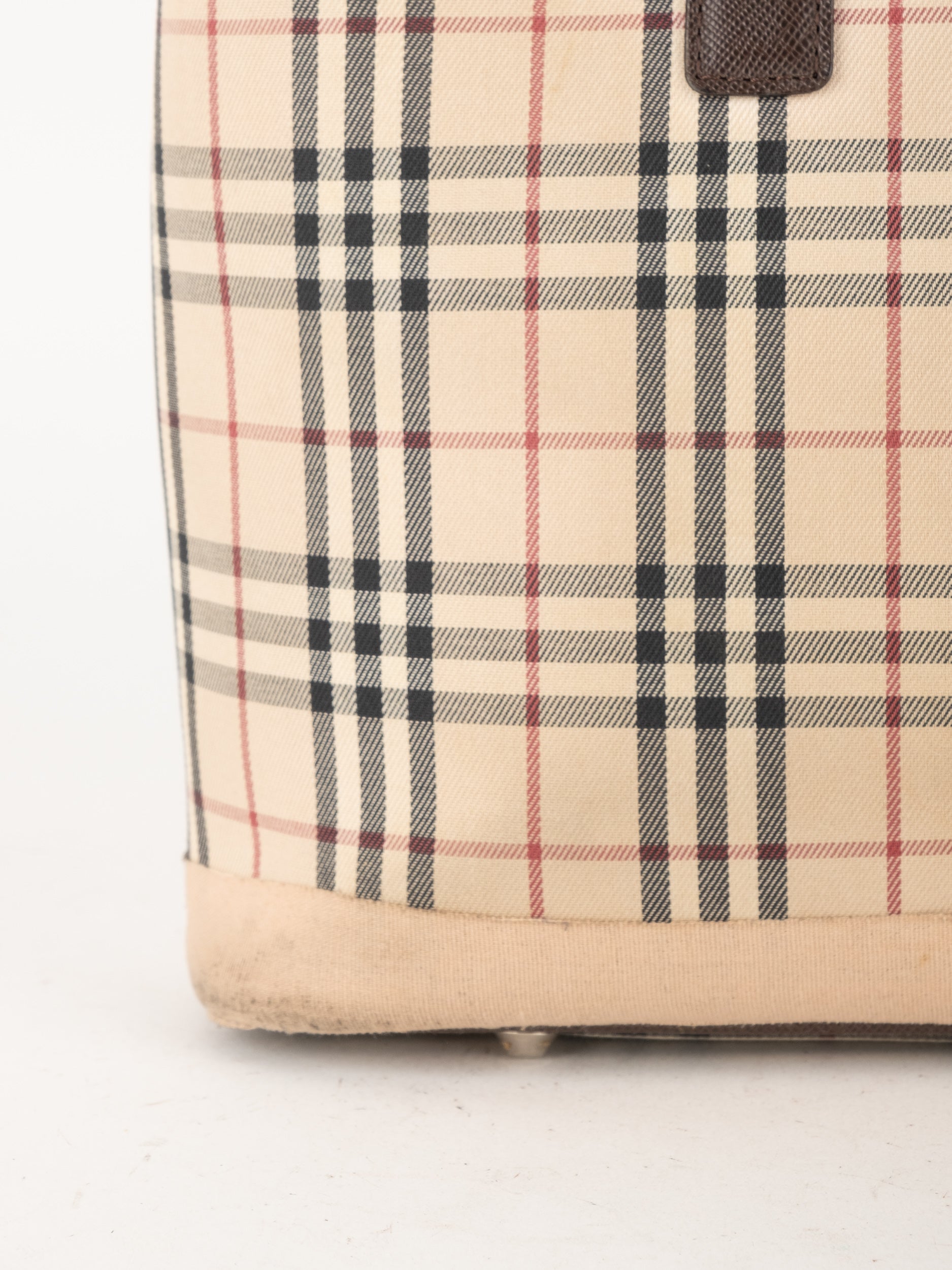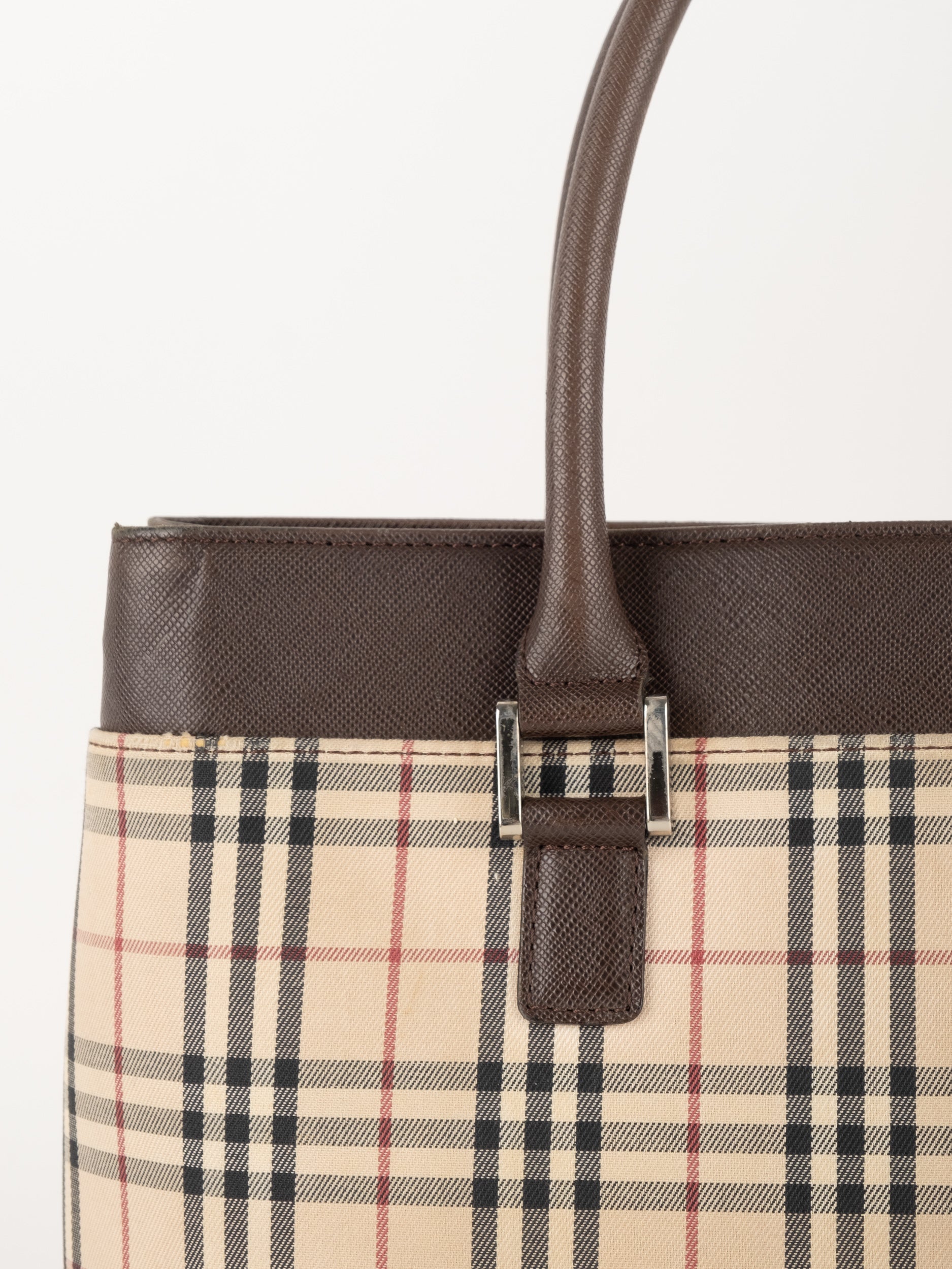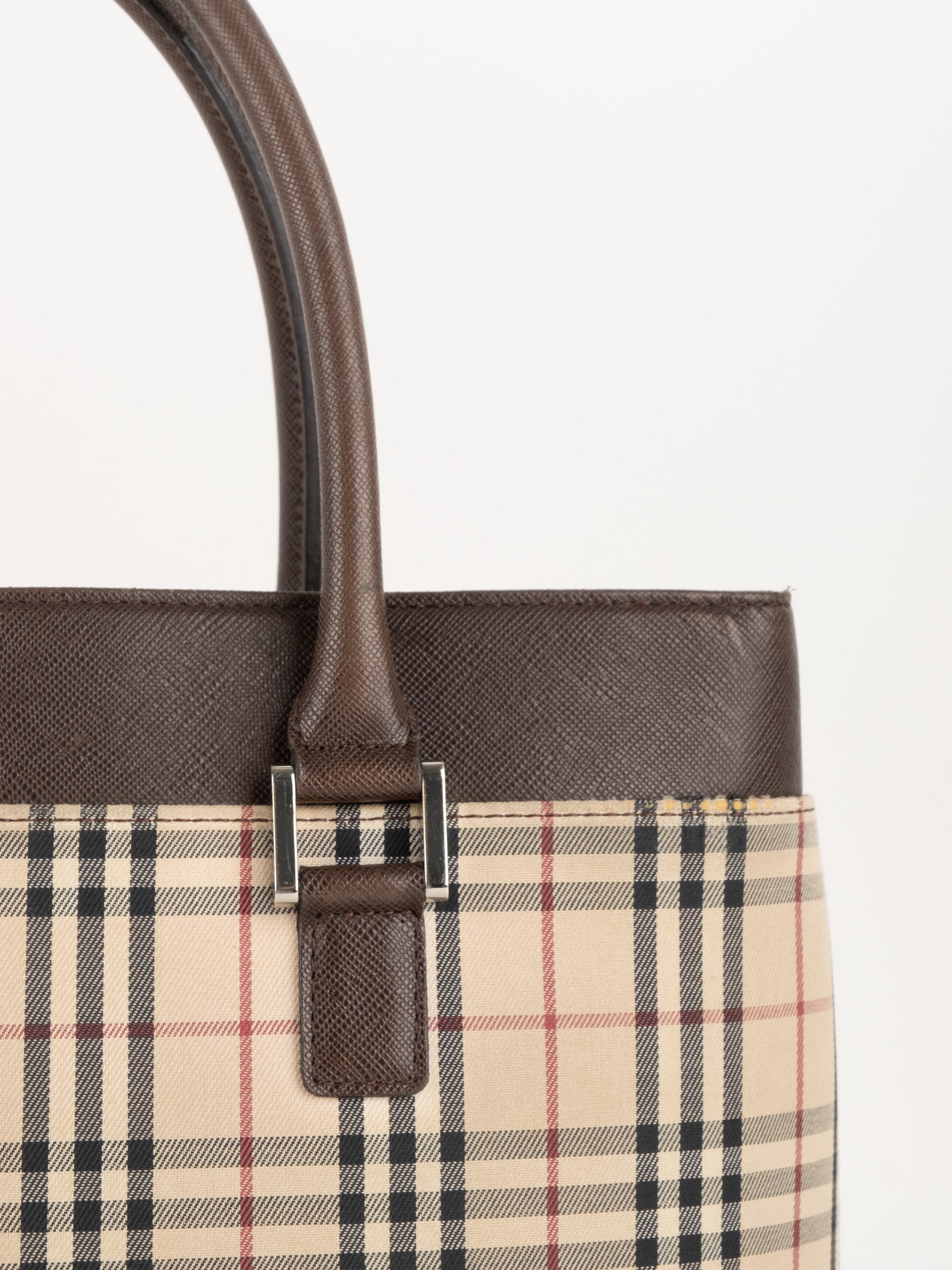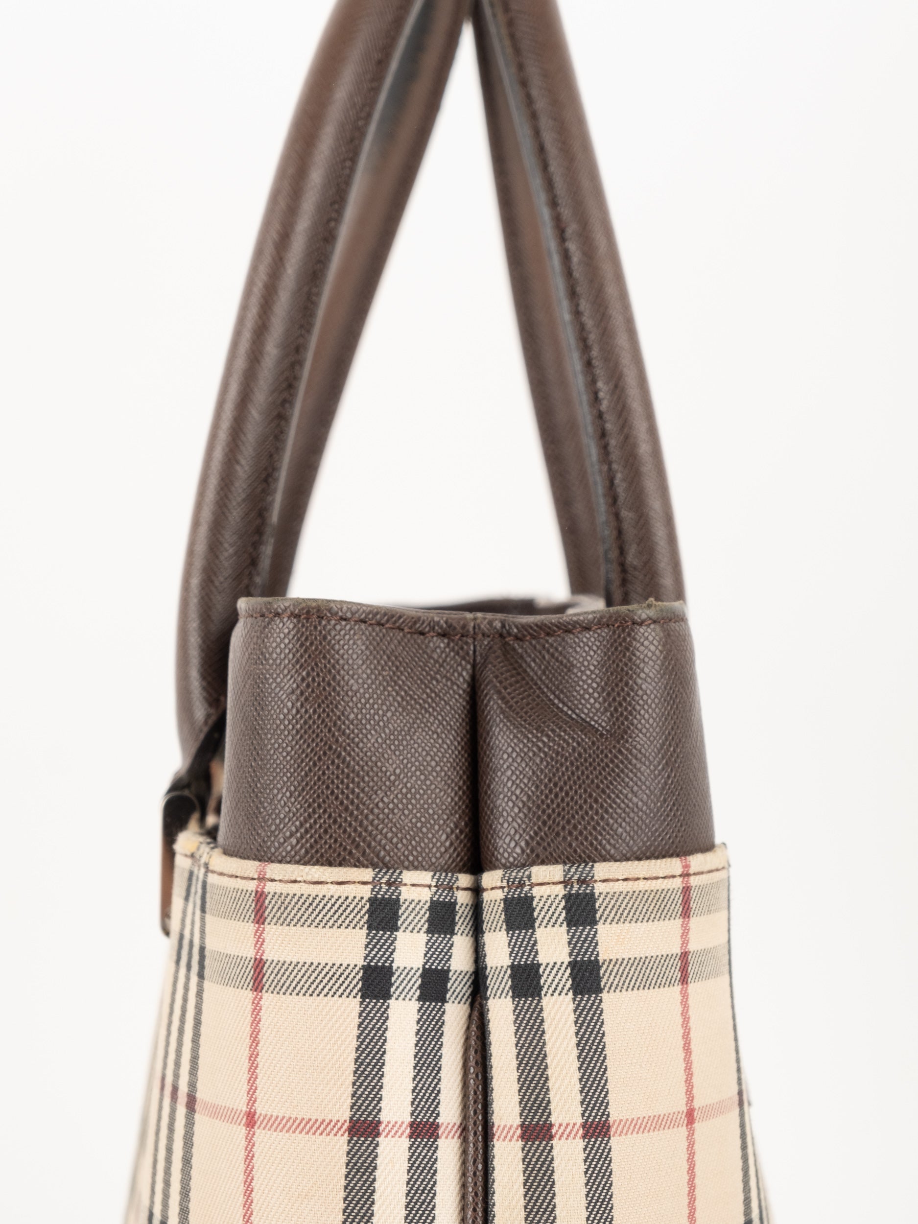תיק של בית האופנה הבריטי Burberry ברברי – וינטג' יד שנייה, בעיצוב קלאסי מדוגמת Nova Check האייקונית של המותג. דוגמת המשבצות המזוהה עם Burberry הפכה במשך השנים לאחד הסמלים הבולטים של אופנה בריטית אלגנטית ועל-זמנית.