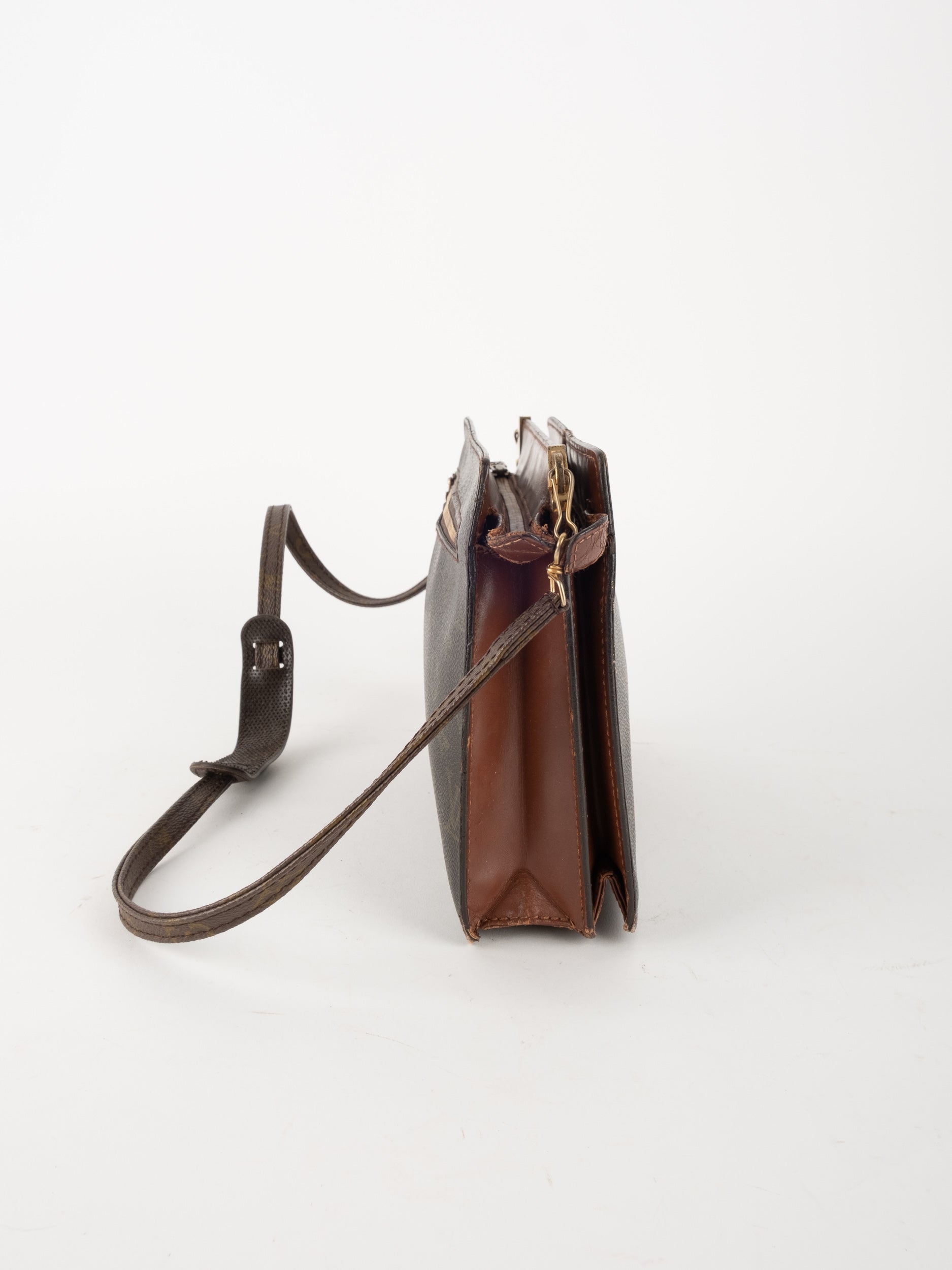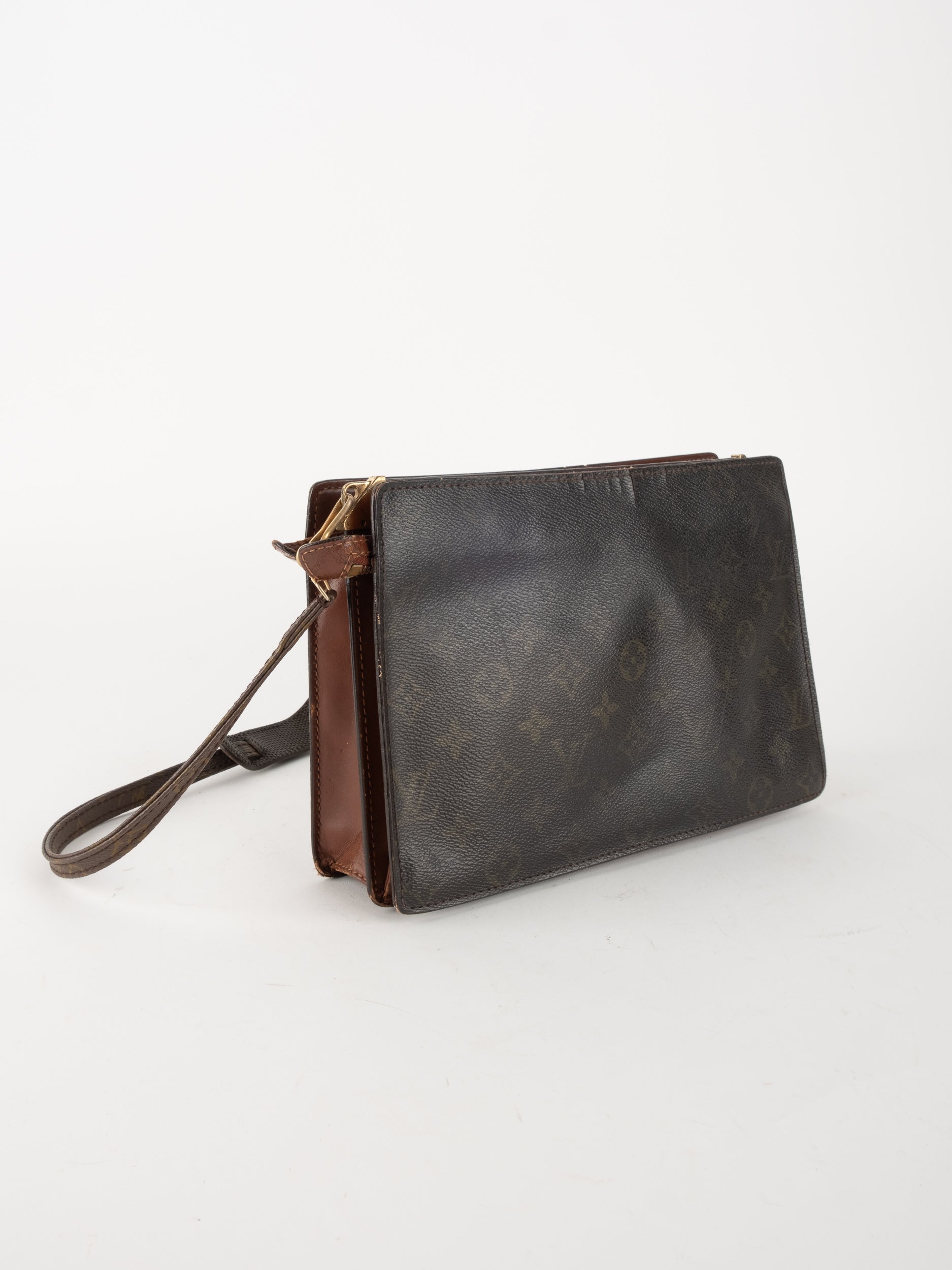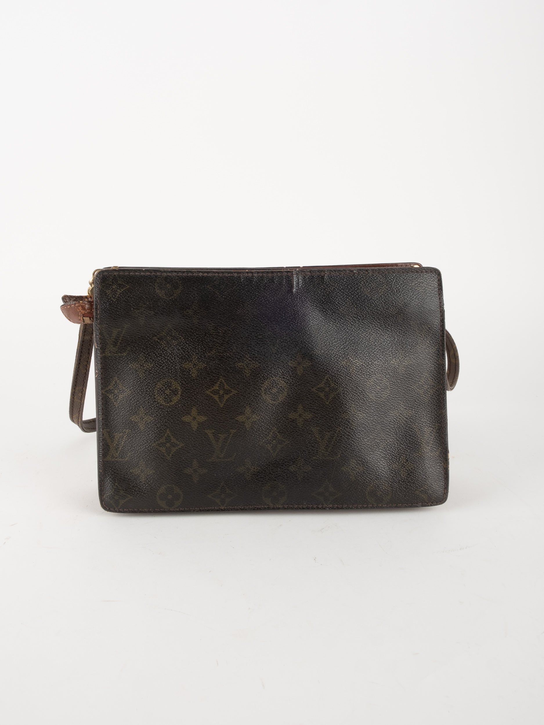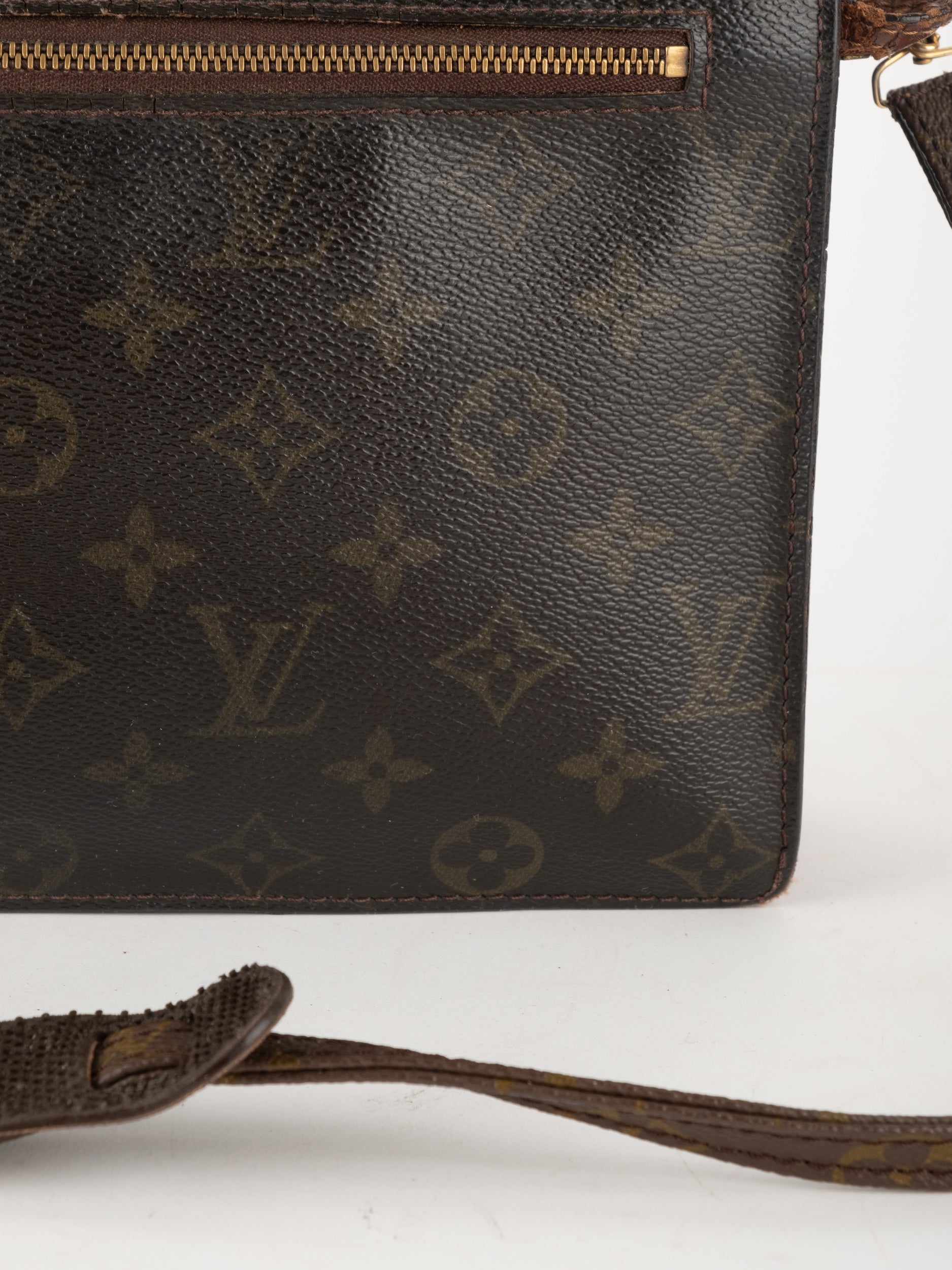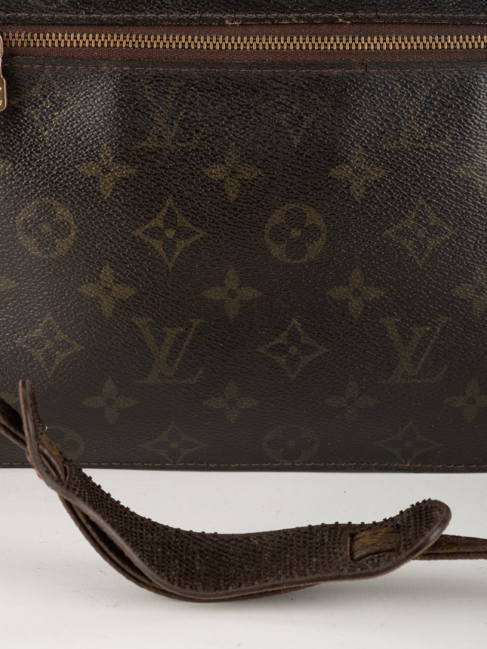 התיק עשוי קנבס בדוגמת Monogram עם עיטורי עור חום וסגירת רוכסן עליונה. כולל רצועת צד הניתנת להסרה, כך שניתן להשתמש בו כפאוץ', קלאץ' או כתיק קטן לנשיאה ביד. מבנה שטוח ונוח לשימוש יומיומי קליל.