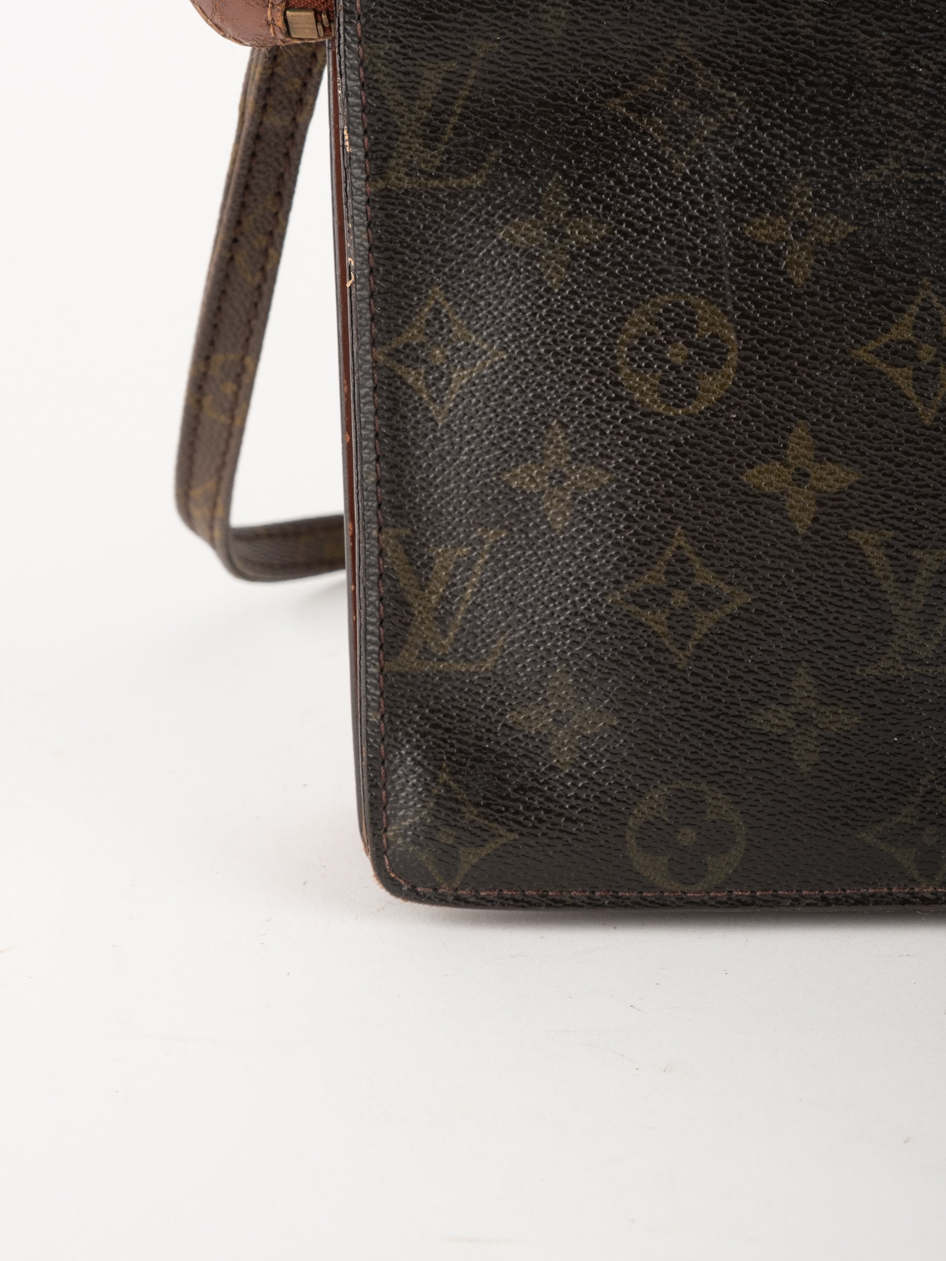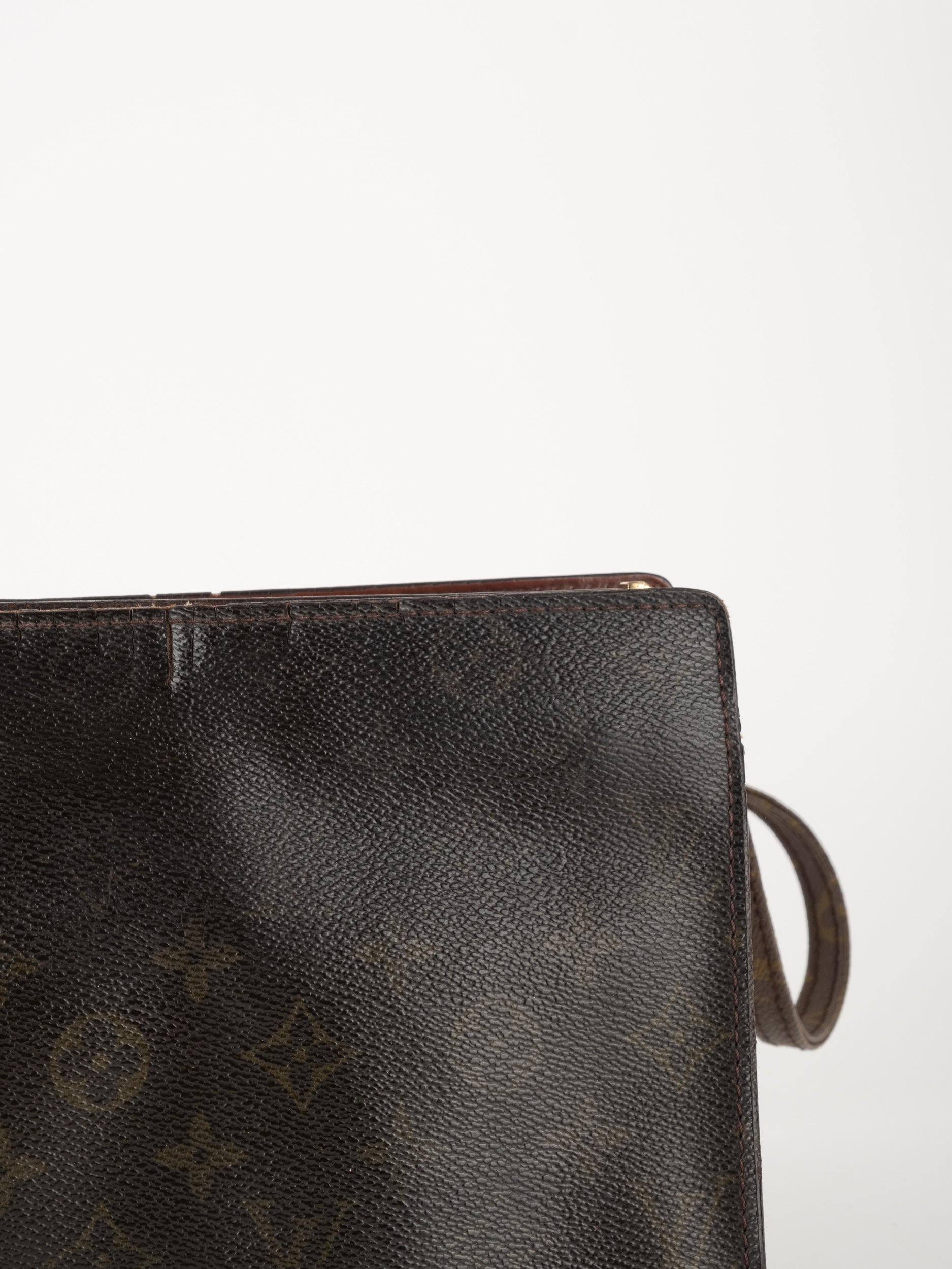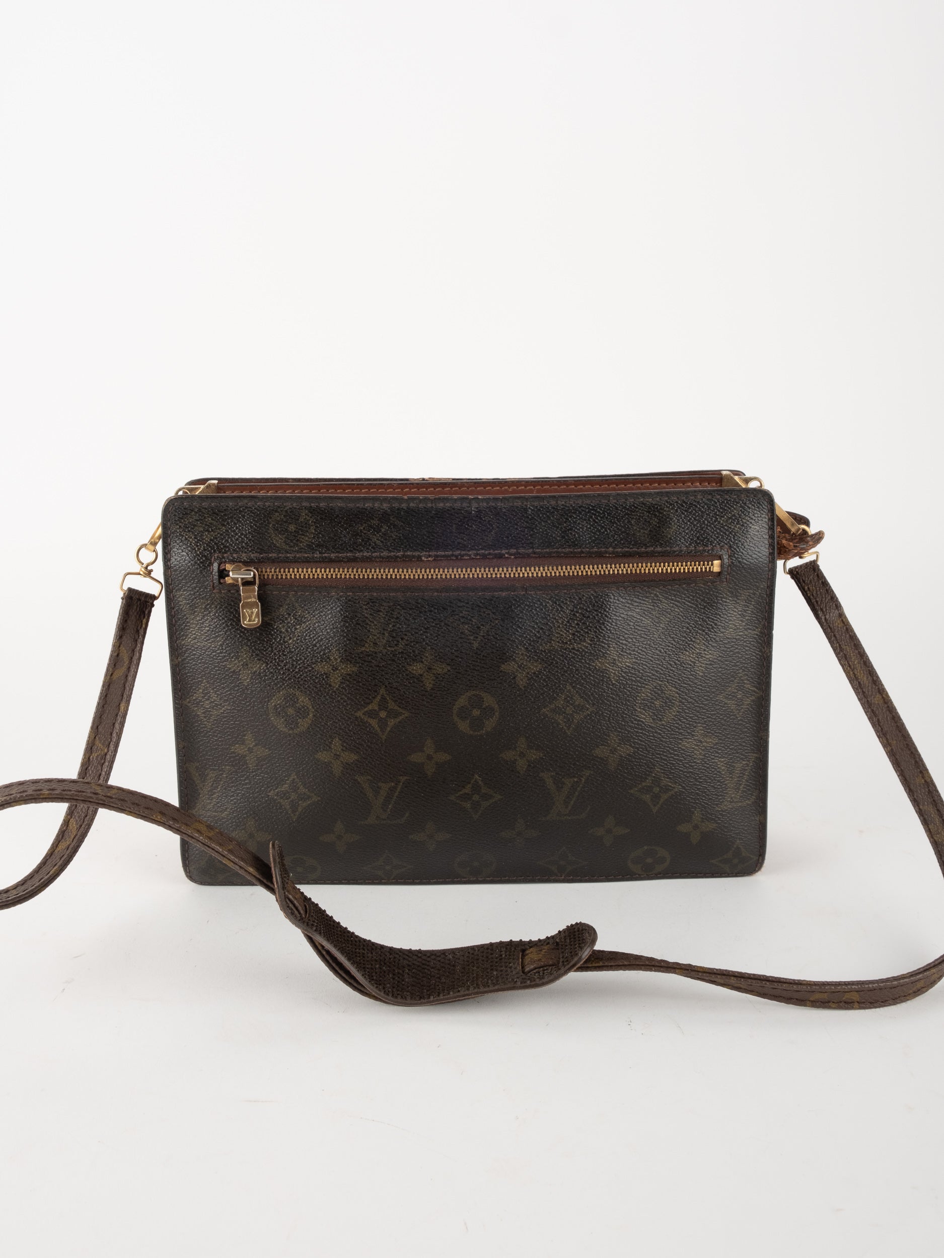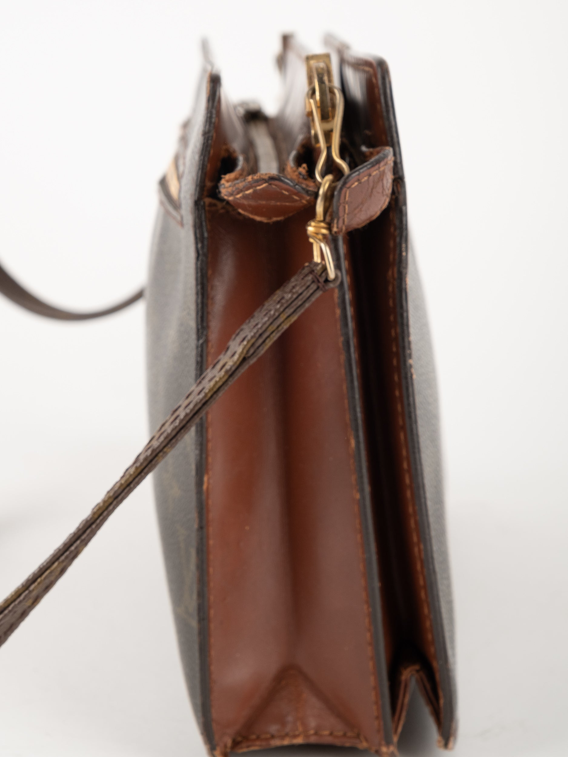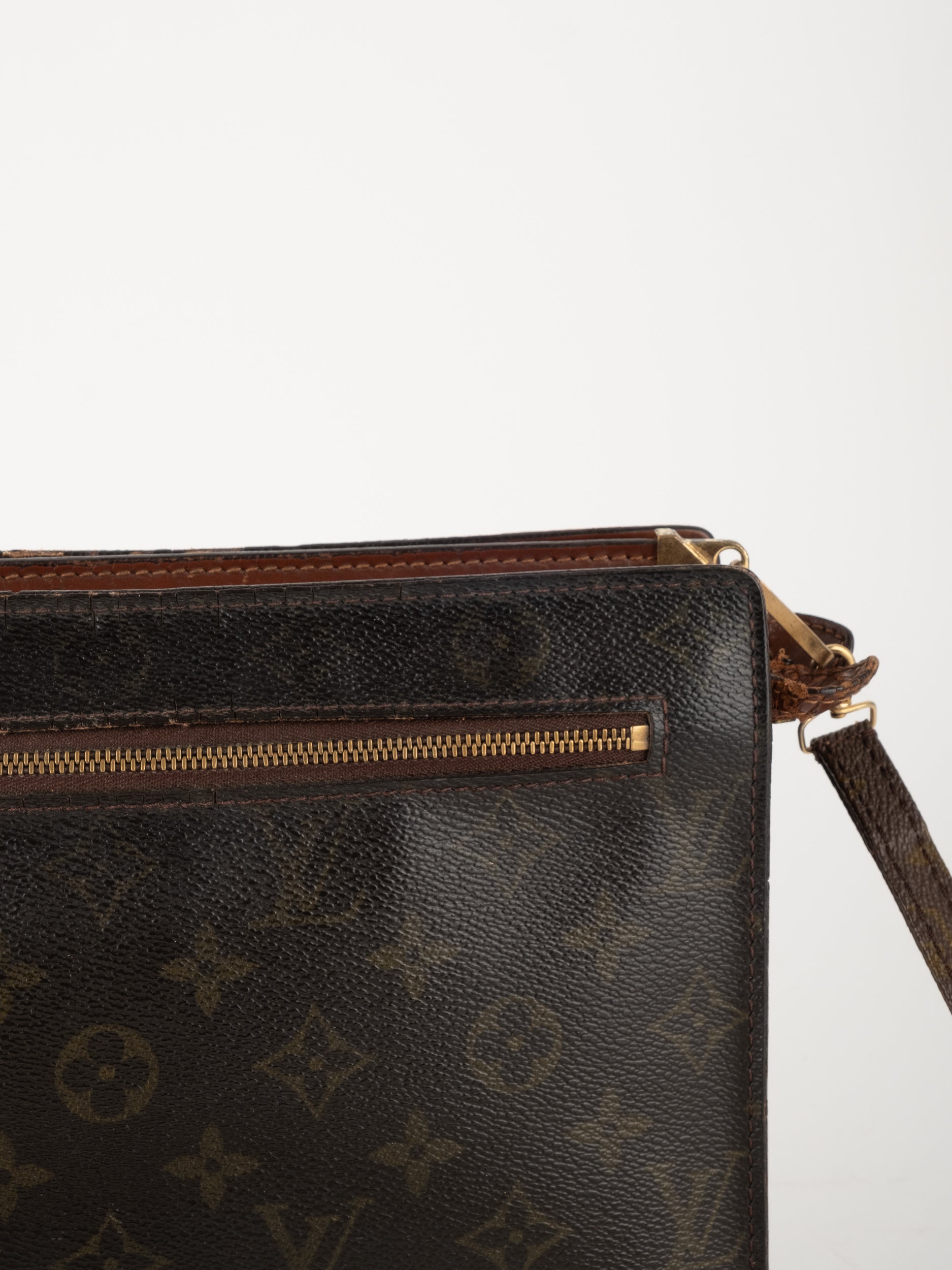 התיק עשוי קנבס בדוגמת Monogram עם עיטורי עור חום וסגירת רוכסן עליונה. כולל רצועת צד הניתנת להסרה, כך שניתן להשתמש בו כפאוץ', קלאץ' או כתיק קטן לנשיאה ביד. מבנה שטוח ונוח לשימוש יומיומי קליל.