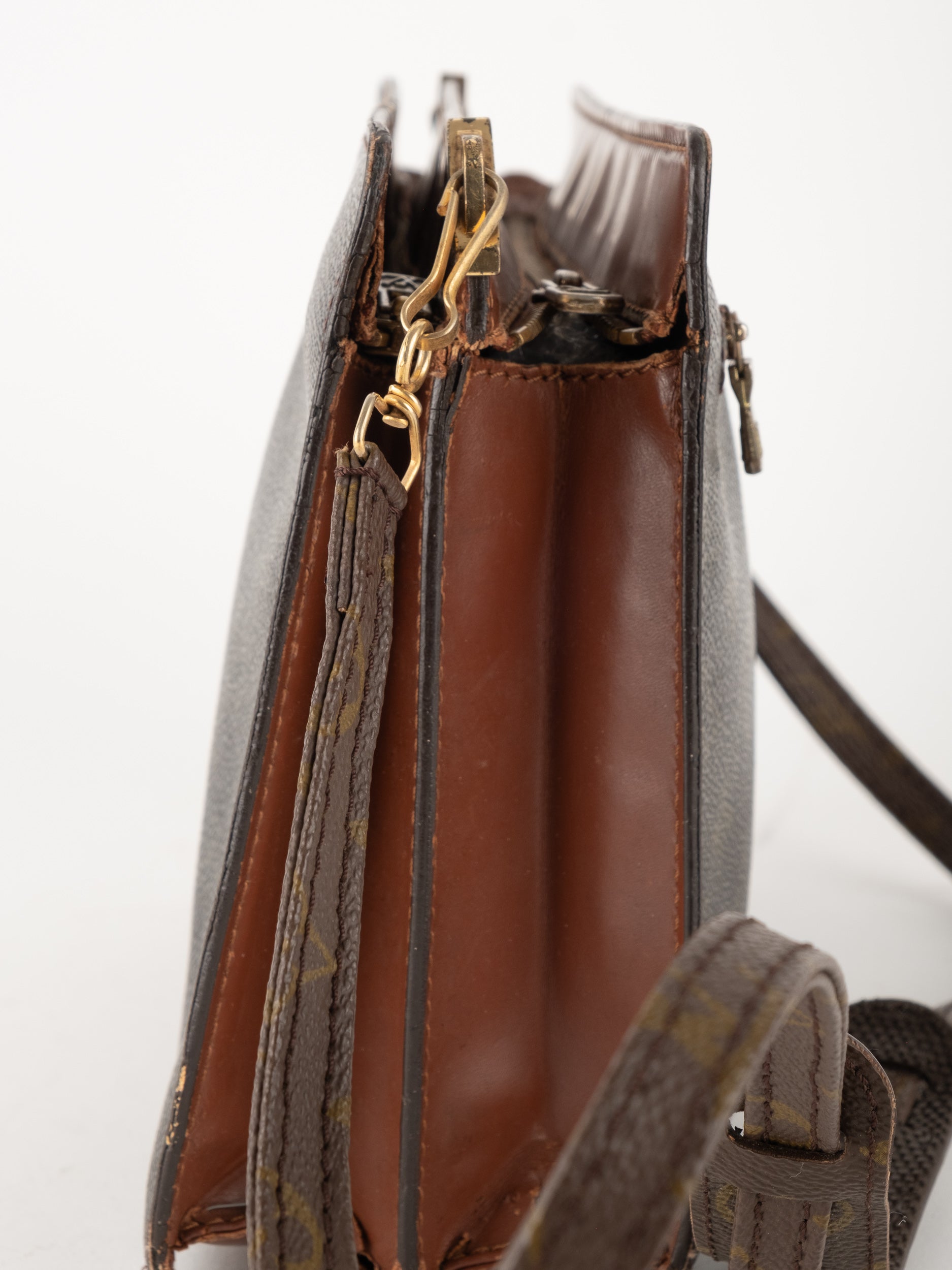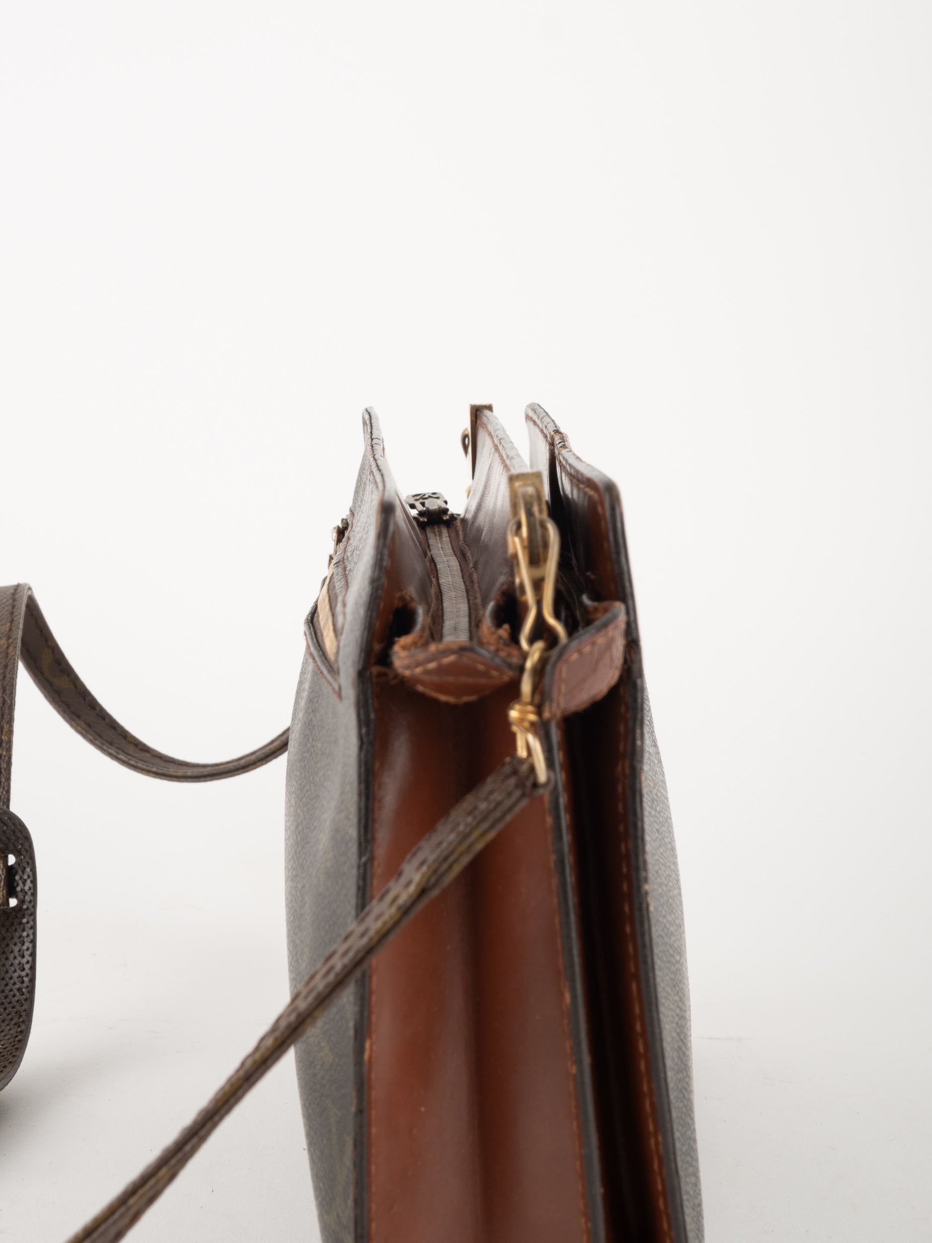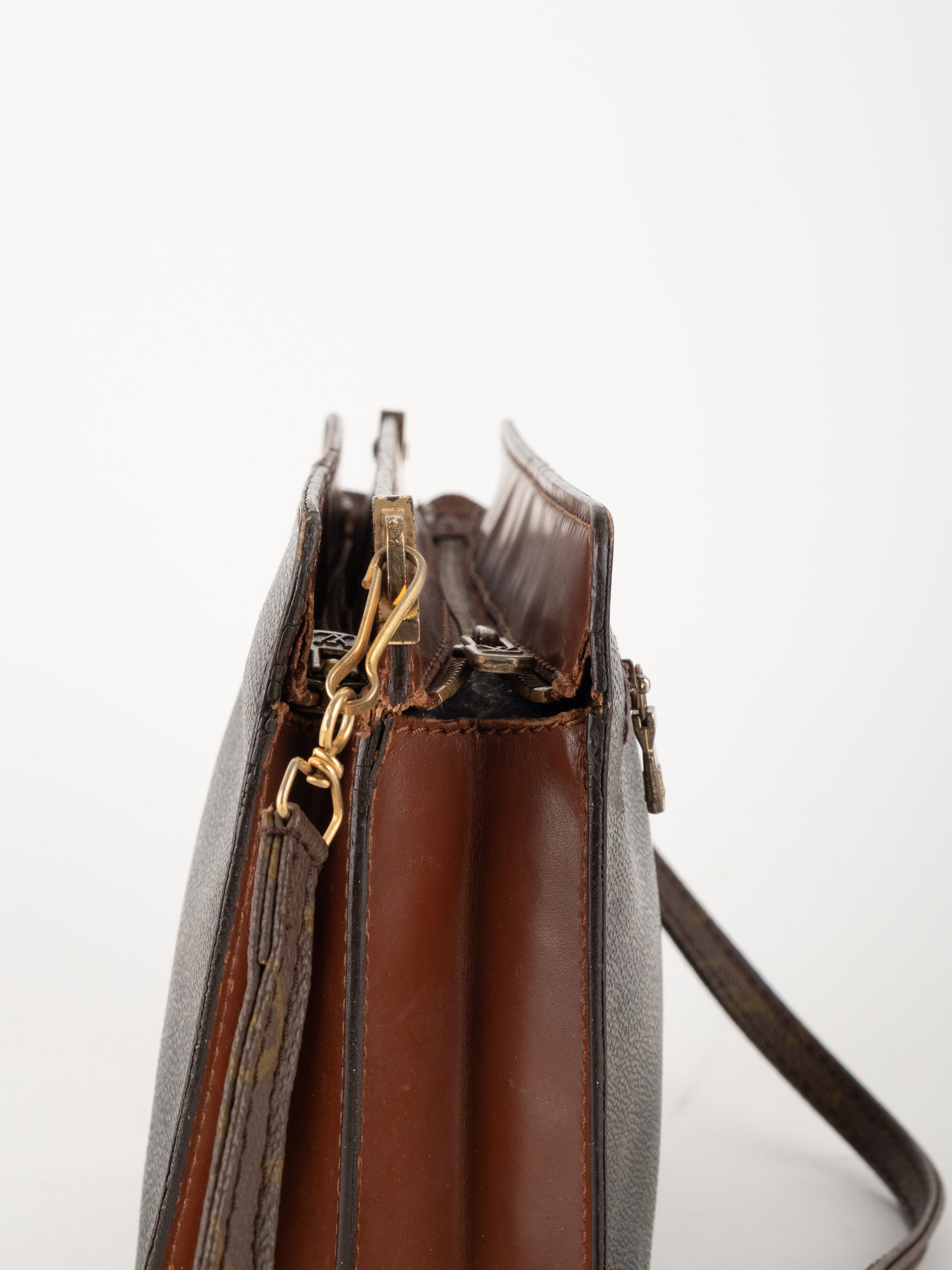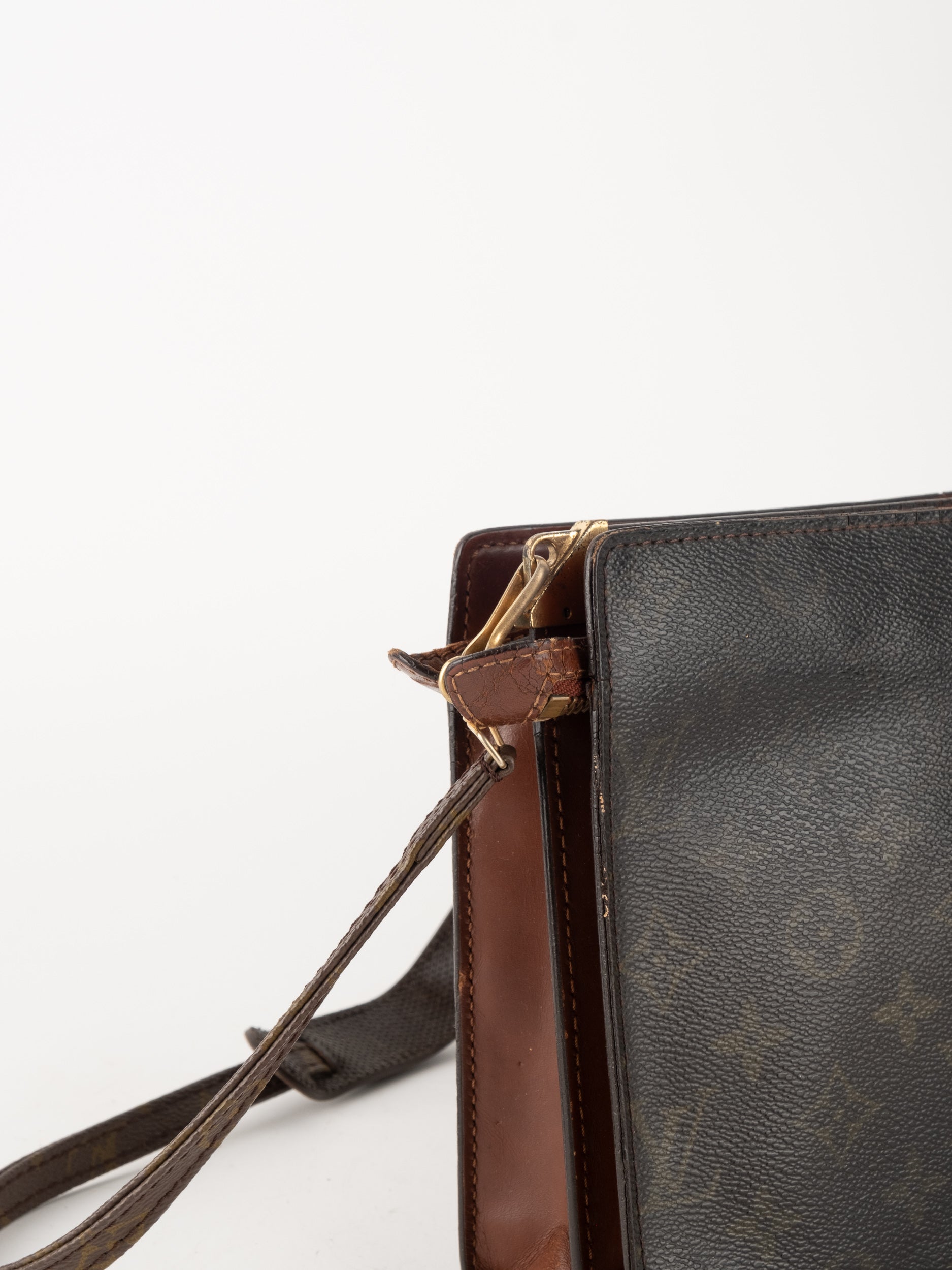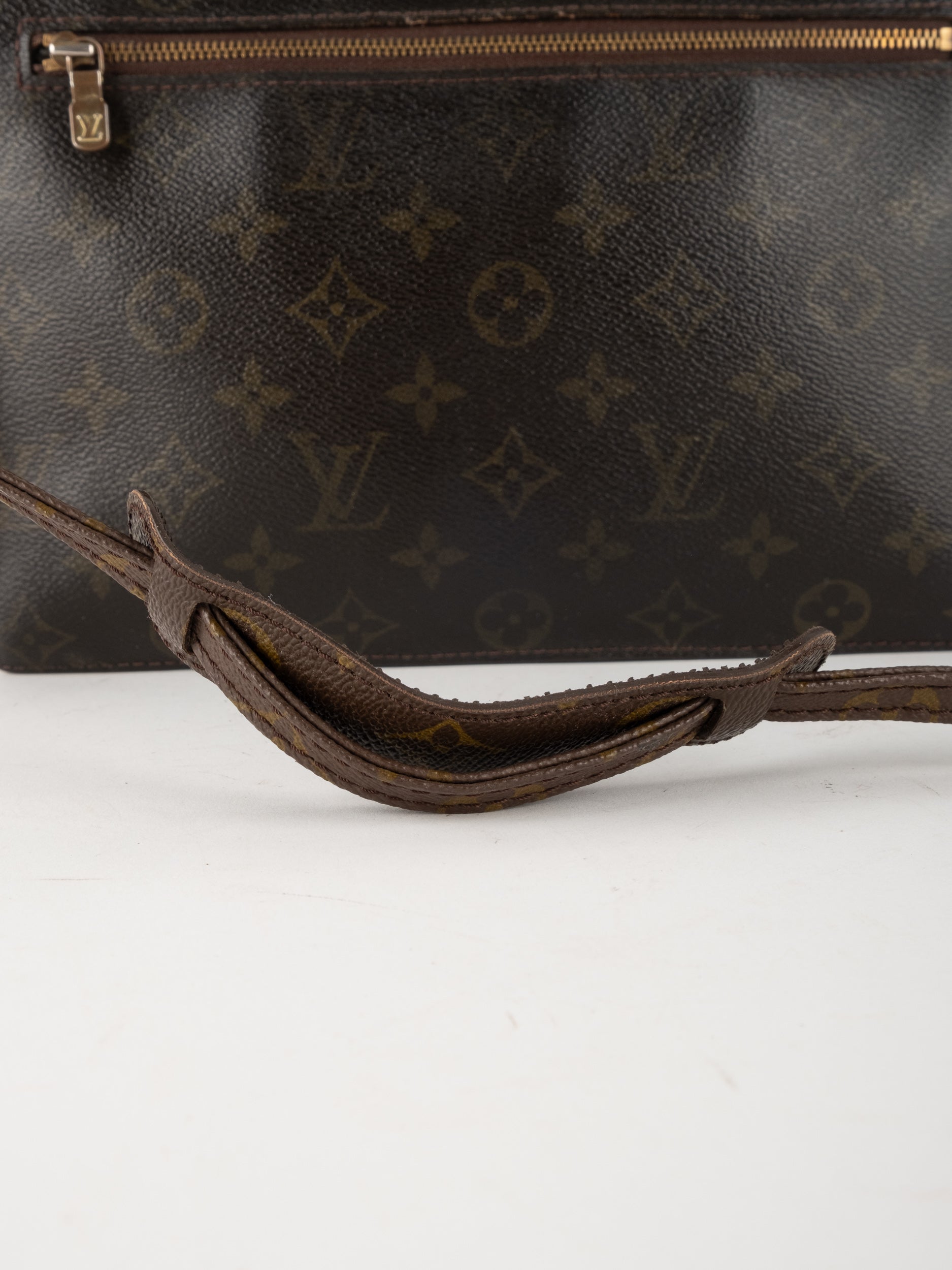 התיק עשוי קנבס בדוגמת Monogram עם עיטורי עור חום וסגירת רוכסן עליונה. כולל רצועת צד הניתנת להסרה, כך שניתן להשתמש בו כפאוץ', קלאץ' או כתיק קטן לנשיאה ביד. מבנה שטוח ונוח לשימוש יומיומי קליל.