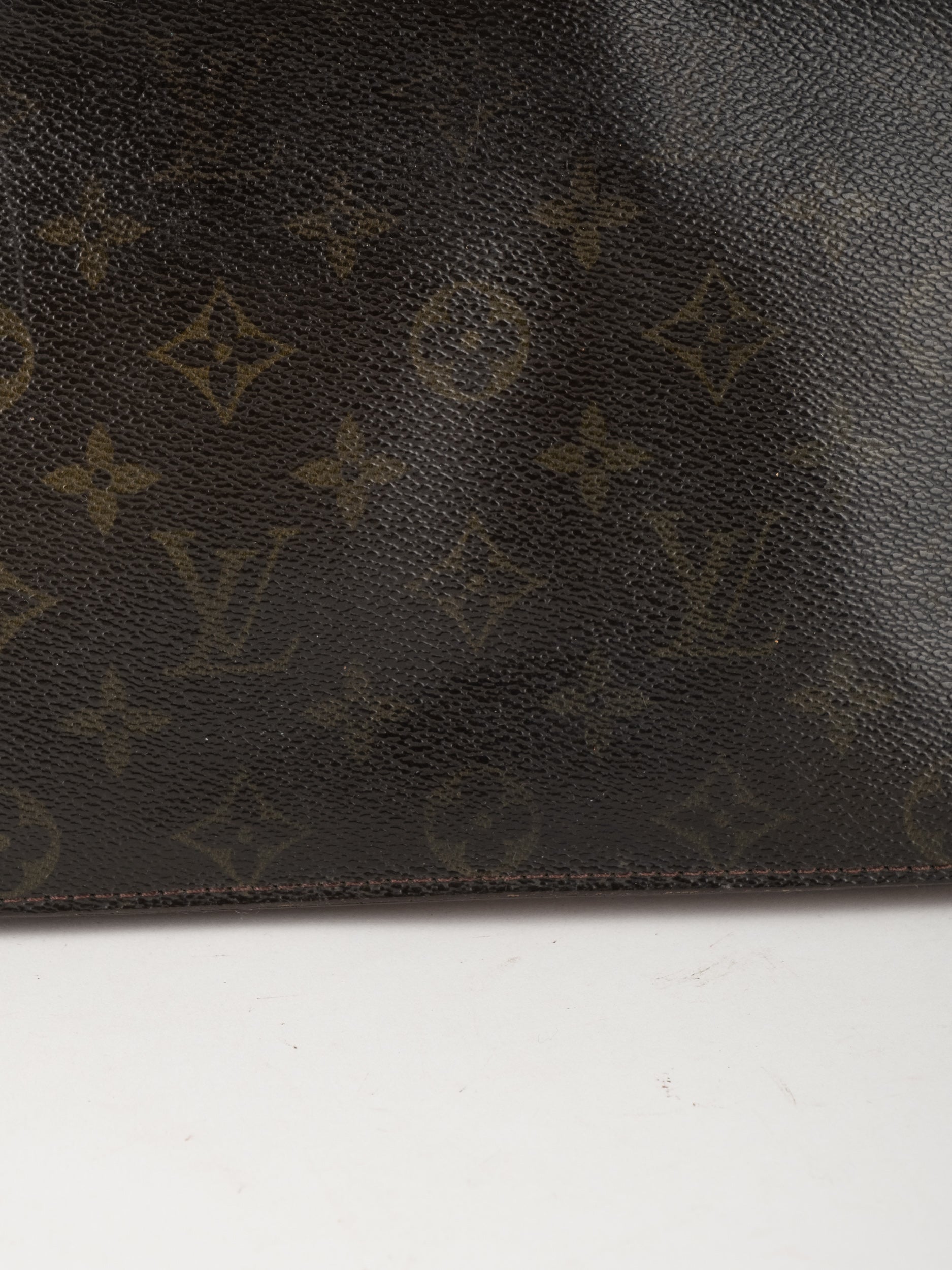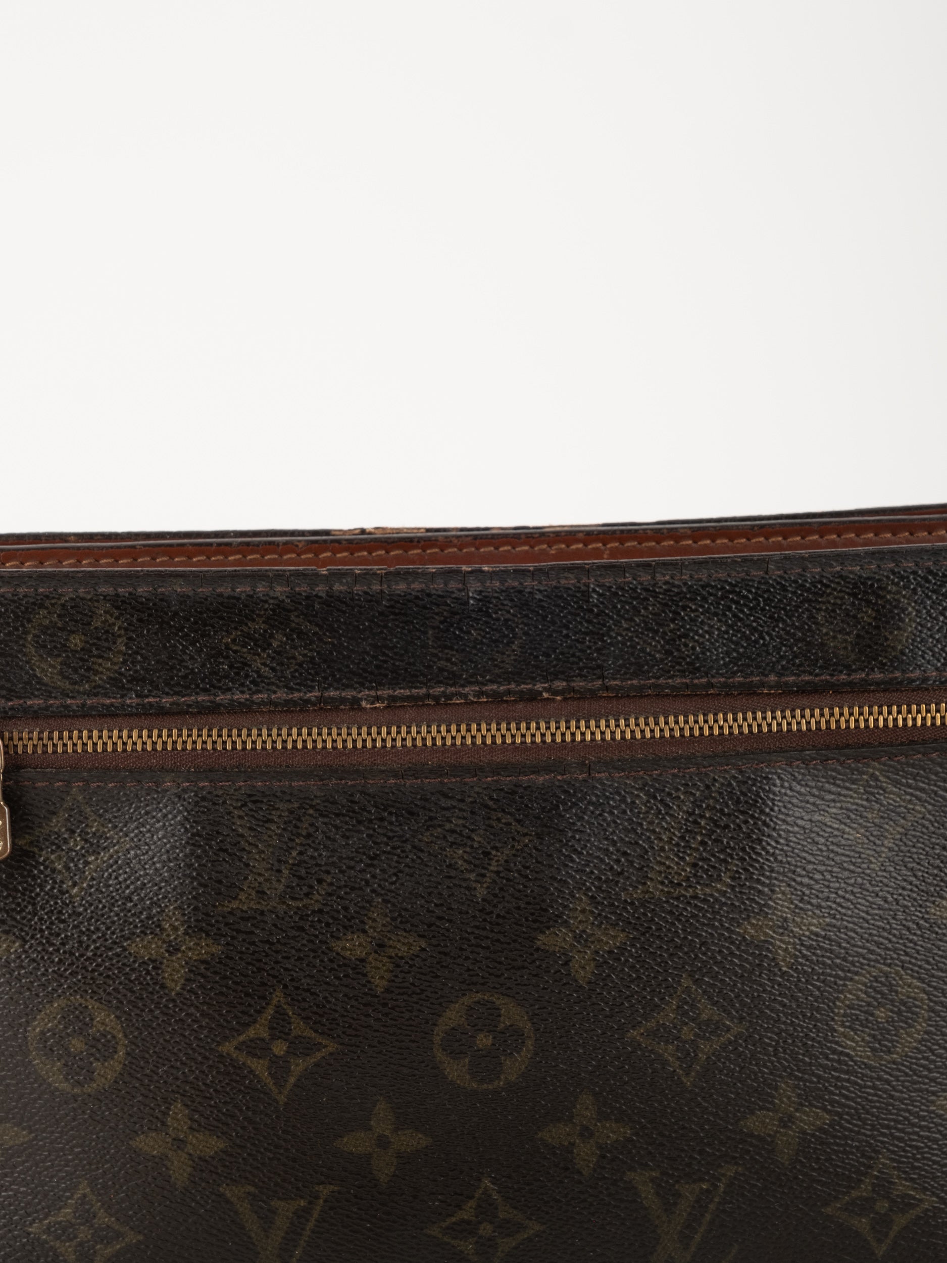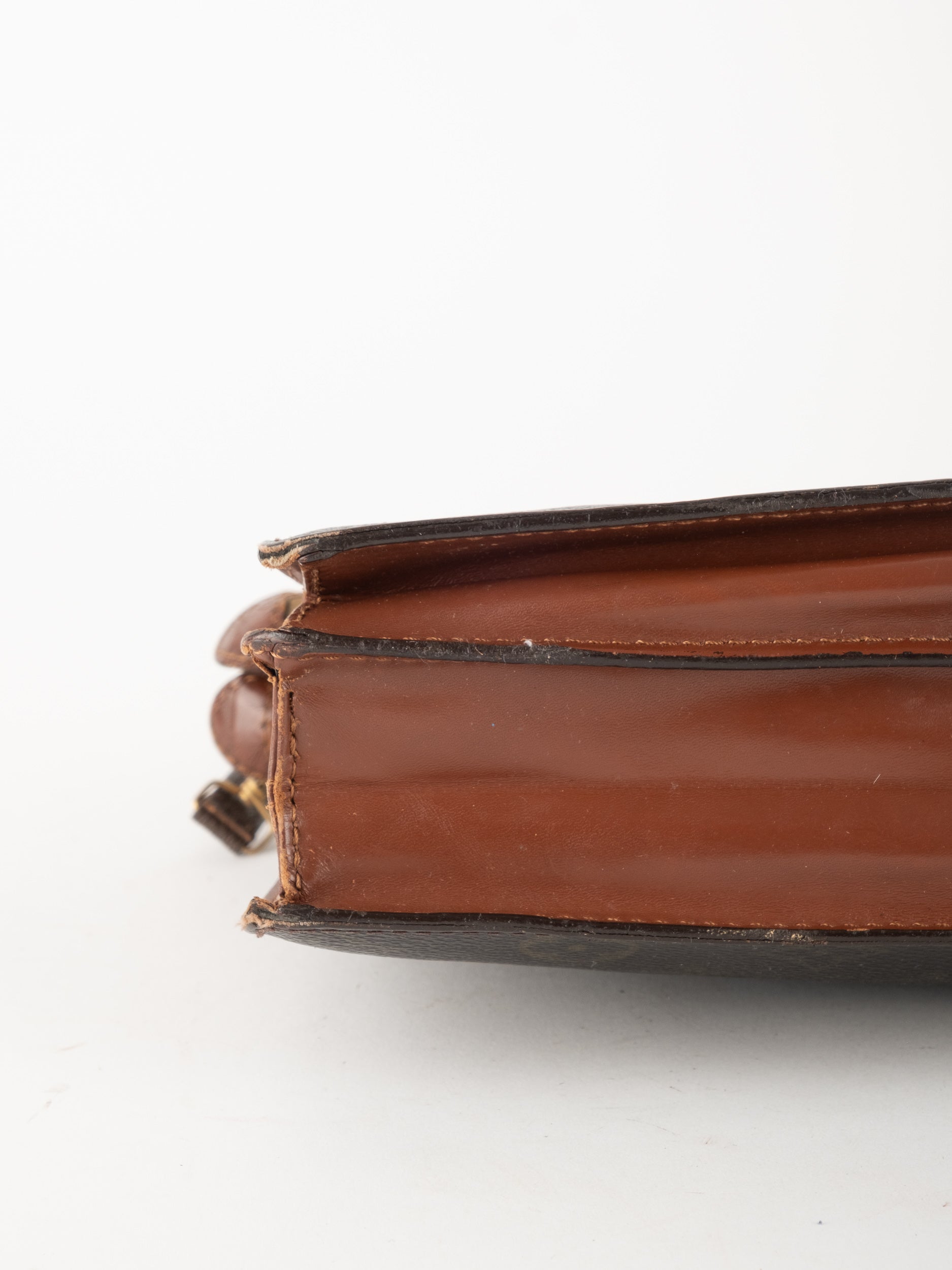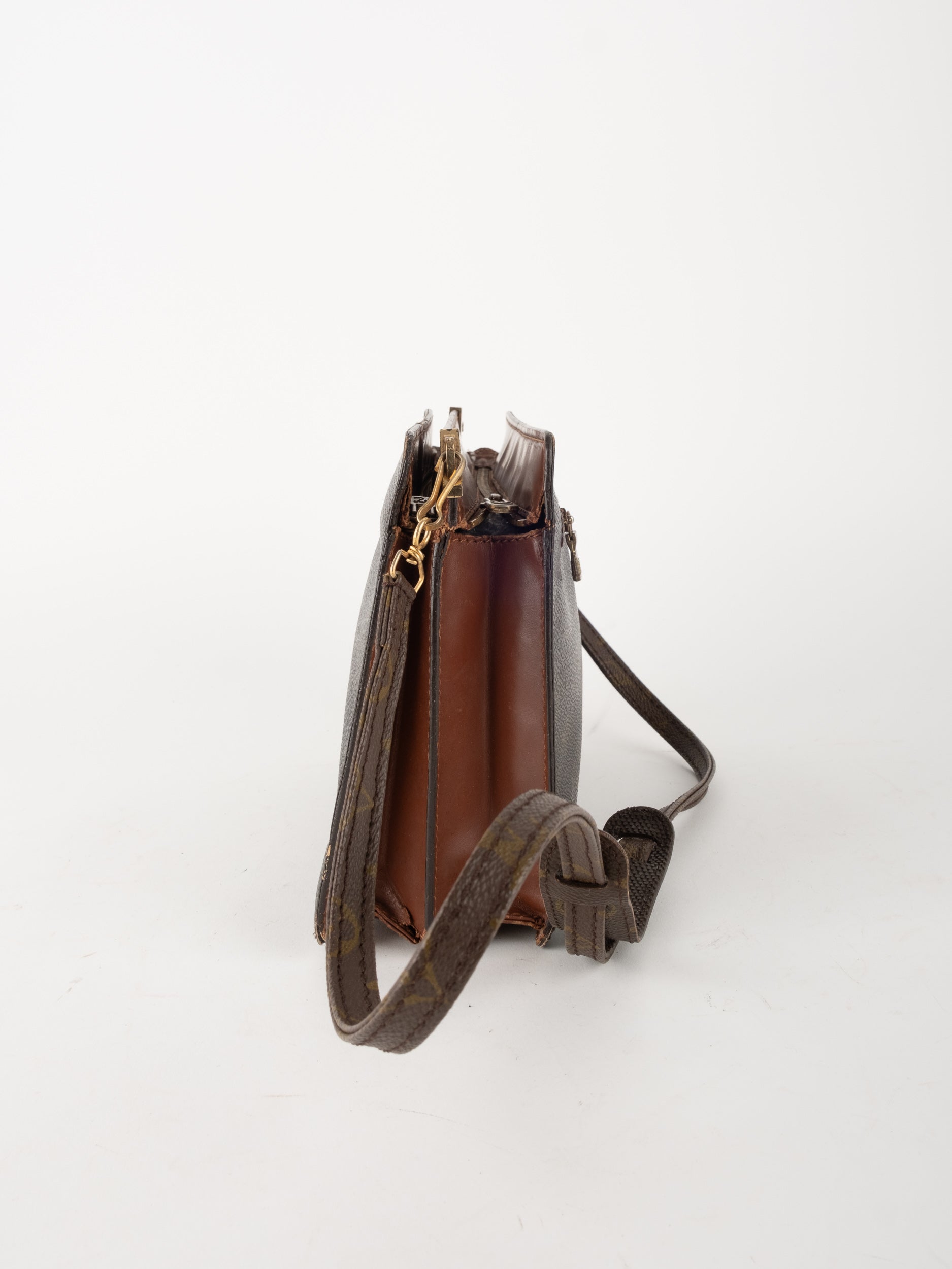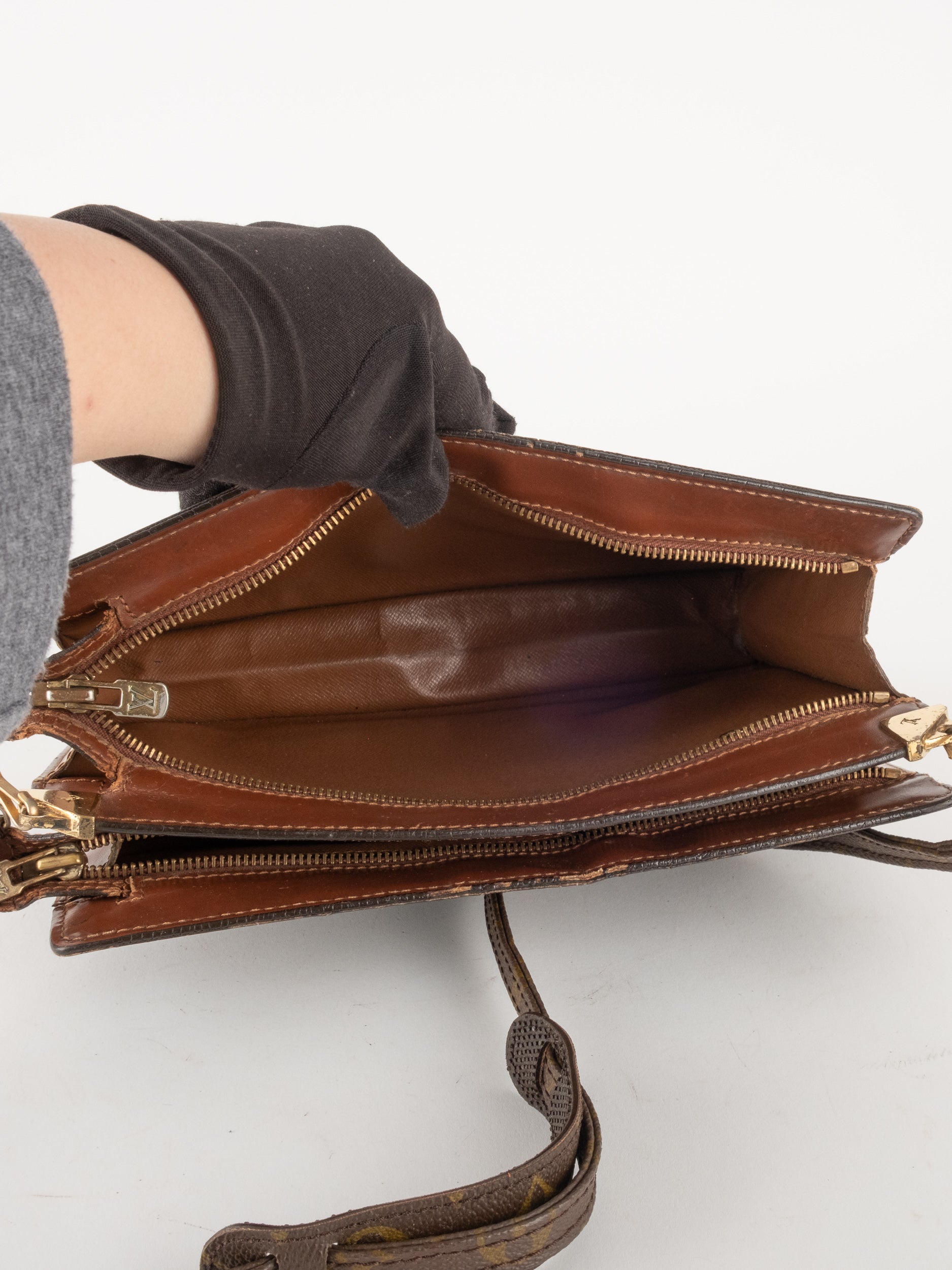 התיק עשוי קנבס בדוגמת Monogram עם עיטורי עור חום וסגירת רוכסן עליונה. כולל רצועת צד הניתנת להסרה, כך שניתן להשתמש בו כפאוץ', קלאץ' או כתיק קטן לנשיאה ביד. מבנה שטוח ונוח לשימוש יומיומי קליל.