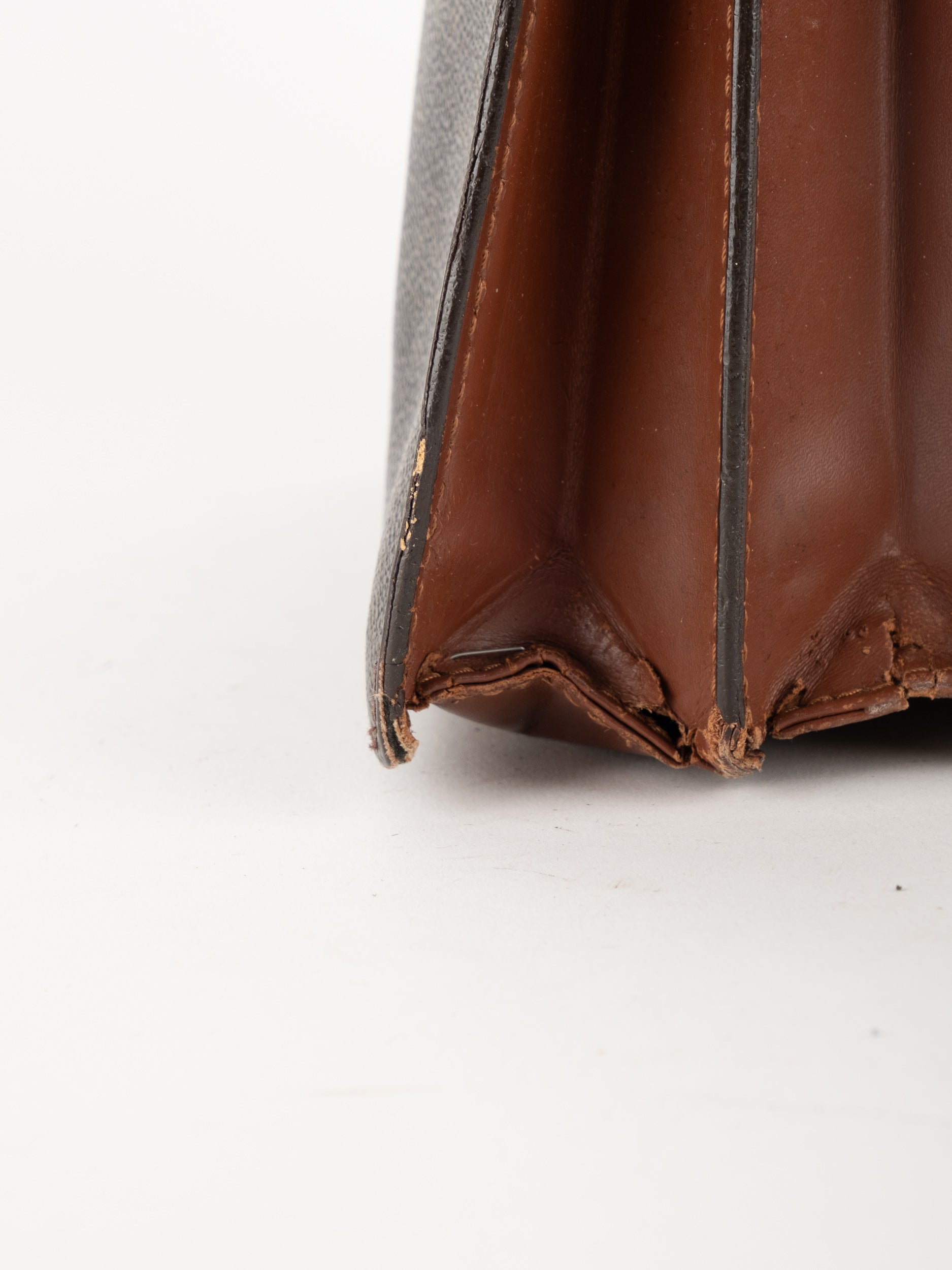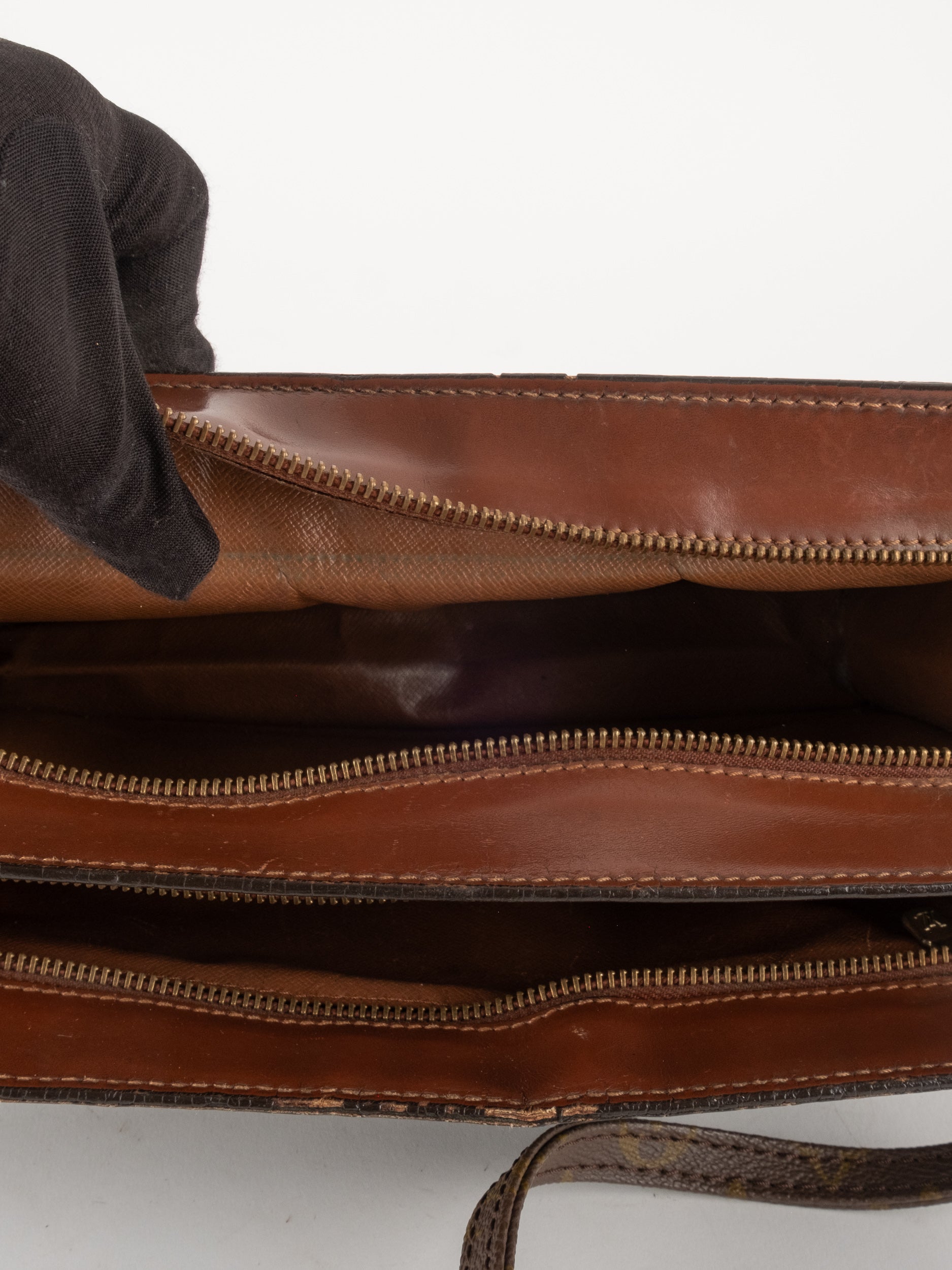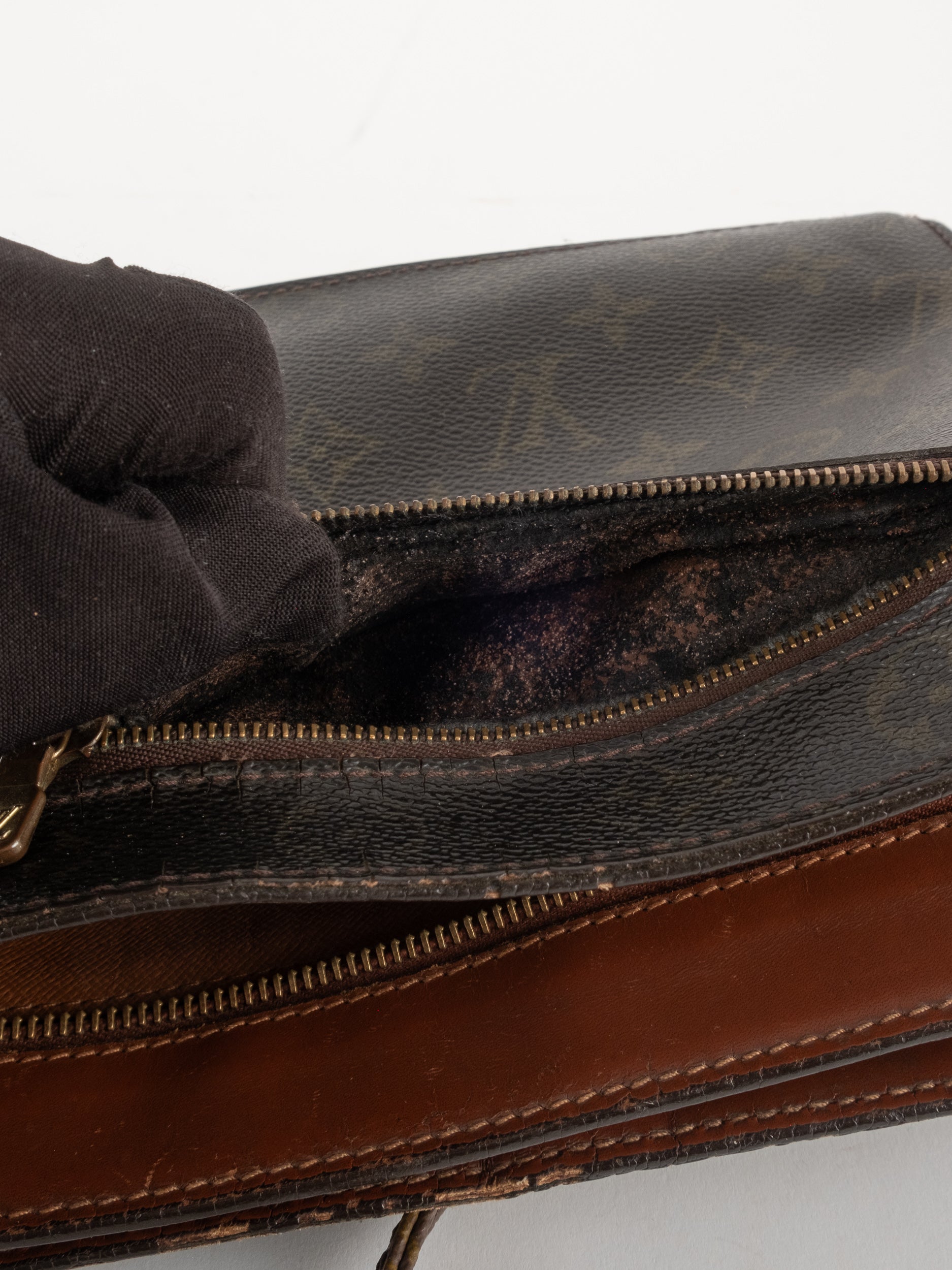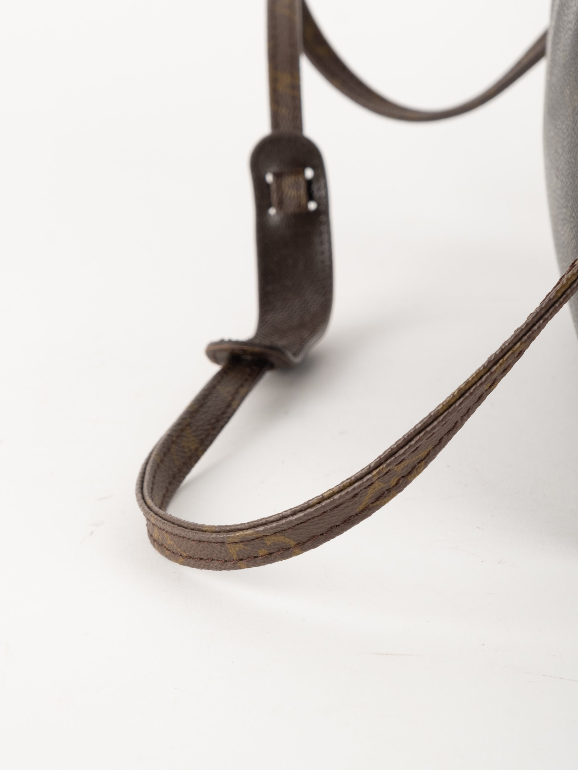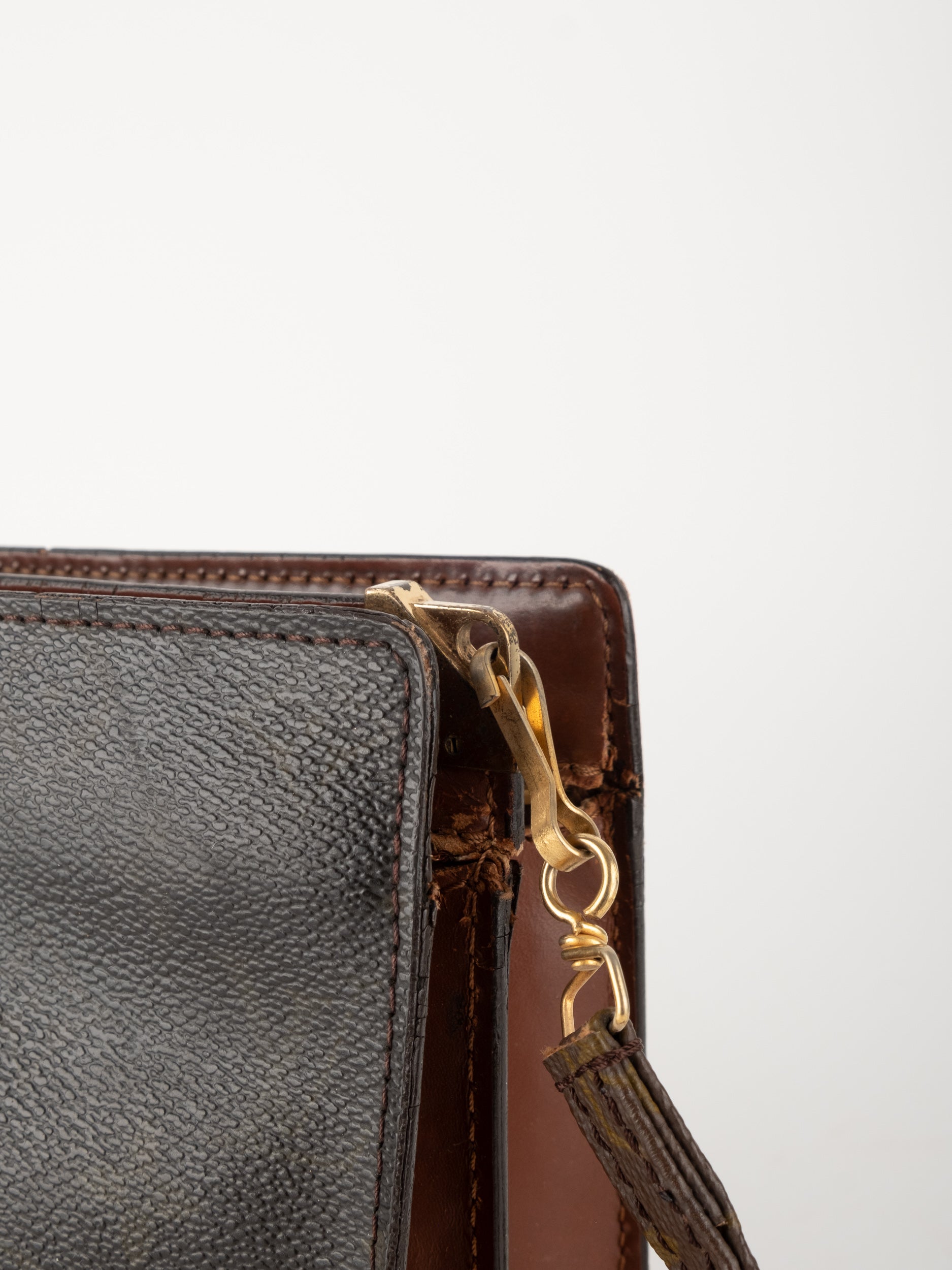 התיק עשוי קנבס בדוגמת Monogram עם עיטורי עור חום וסגירת רוכסן עליונה. כולל רצועת צד הניתנת להסרה, כך שניתן להשתמש בו כפאוץ', קלאץ' או כתיק קטן לנשיאה ביד. מבנה שטוח ונוח לשימוש יומיומי קליל.