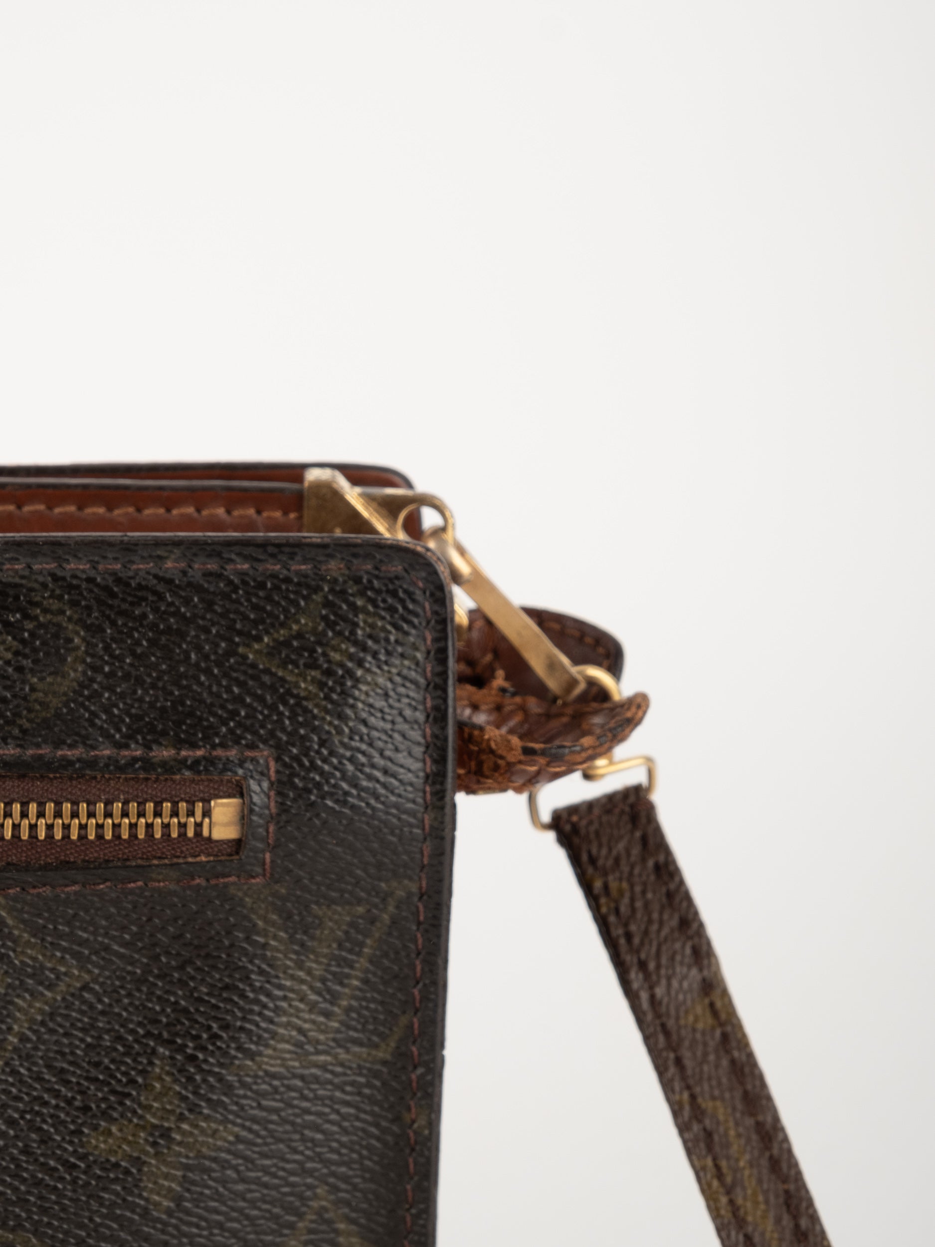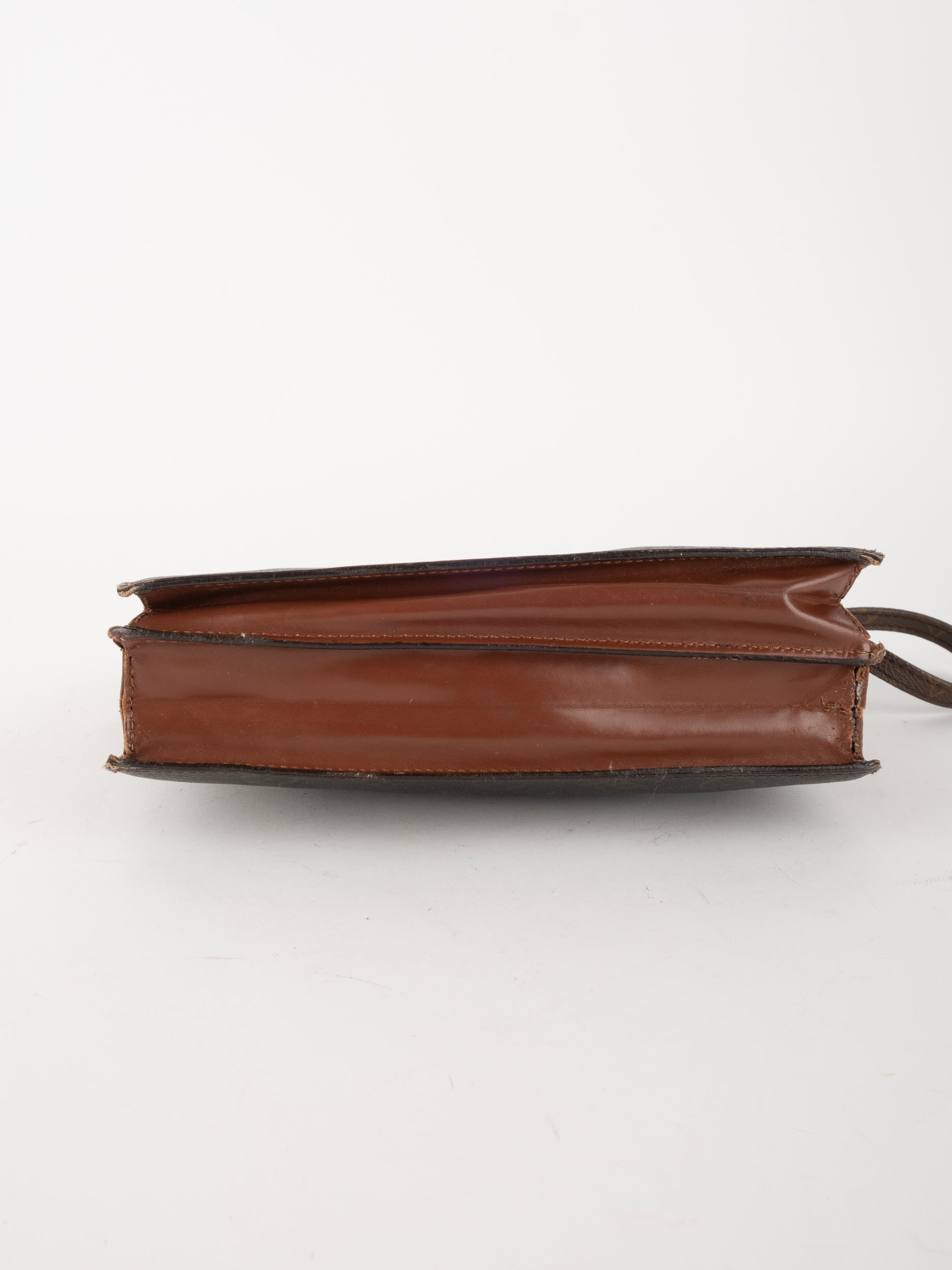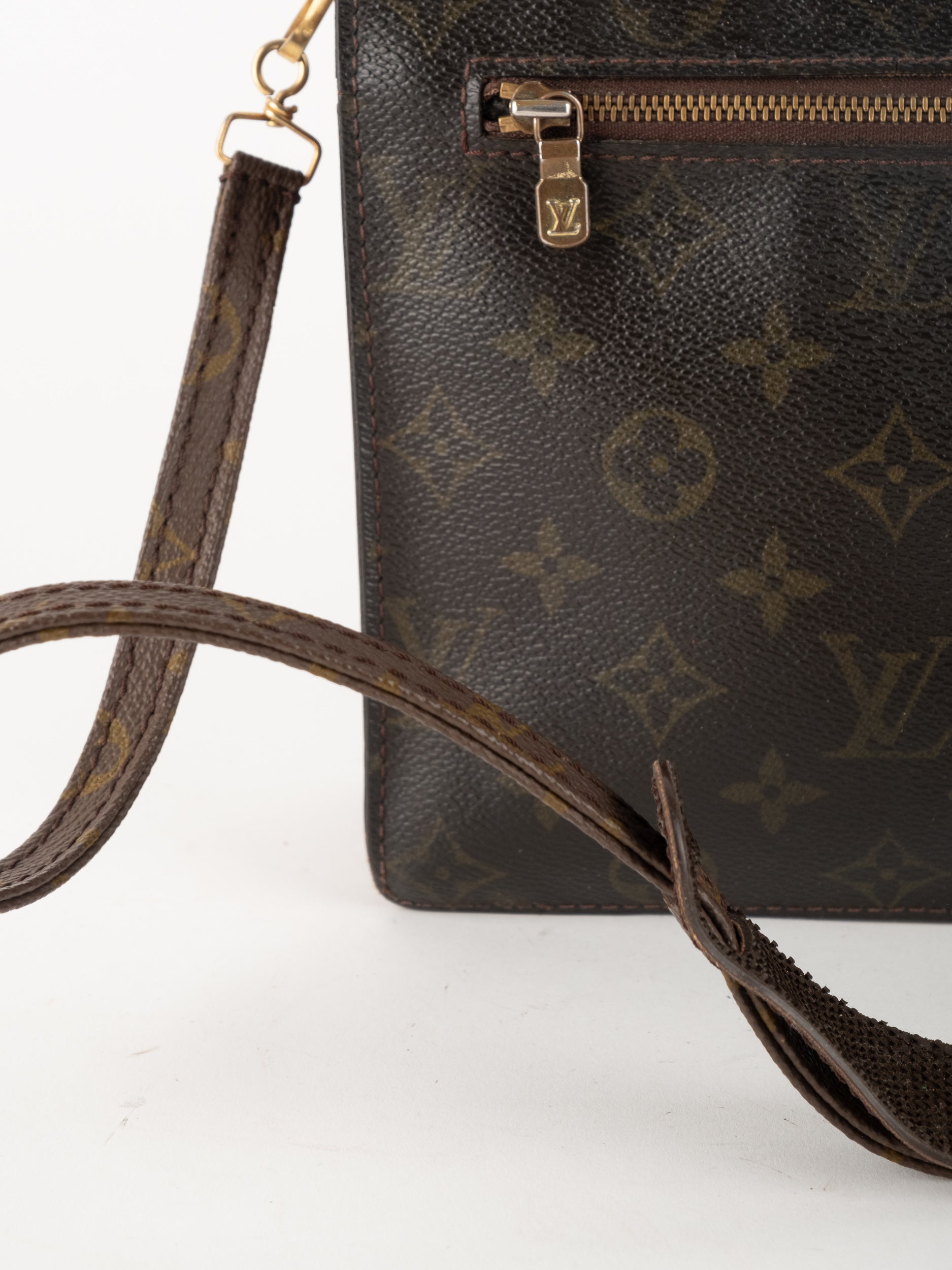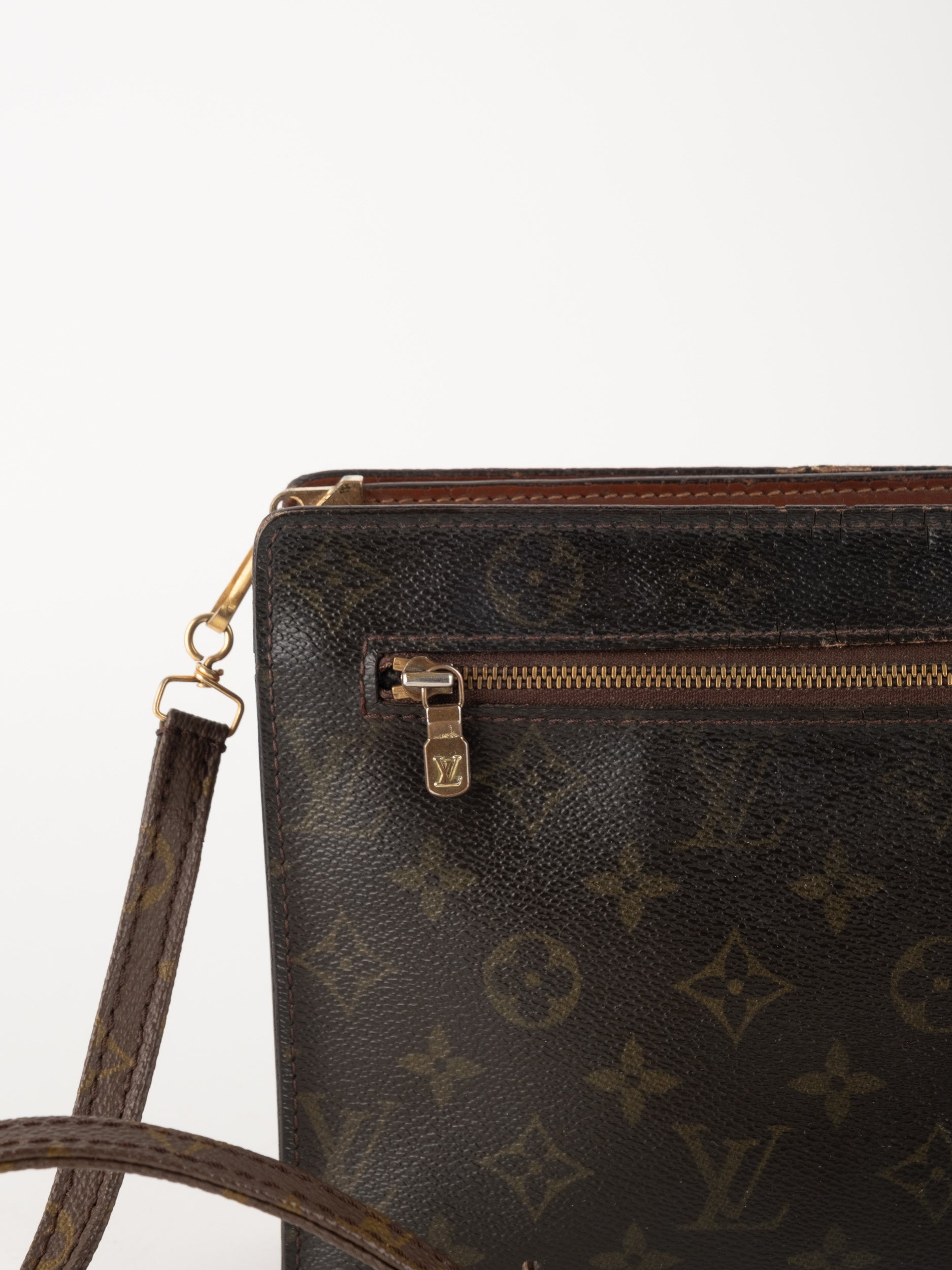 לואי ויטון LOUIS VUITTON וינטג' יד שנייה בדוגמת Monogram הקלאסית בגווני חום. פוצ'ט אייקוני ושטוח עם רצועה נשלפת – פריט קלאסי עם נוכחות ברורה של אחד מבתי האופנה הגדולים בעולם.