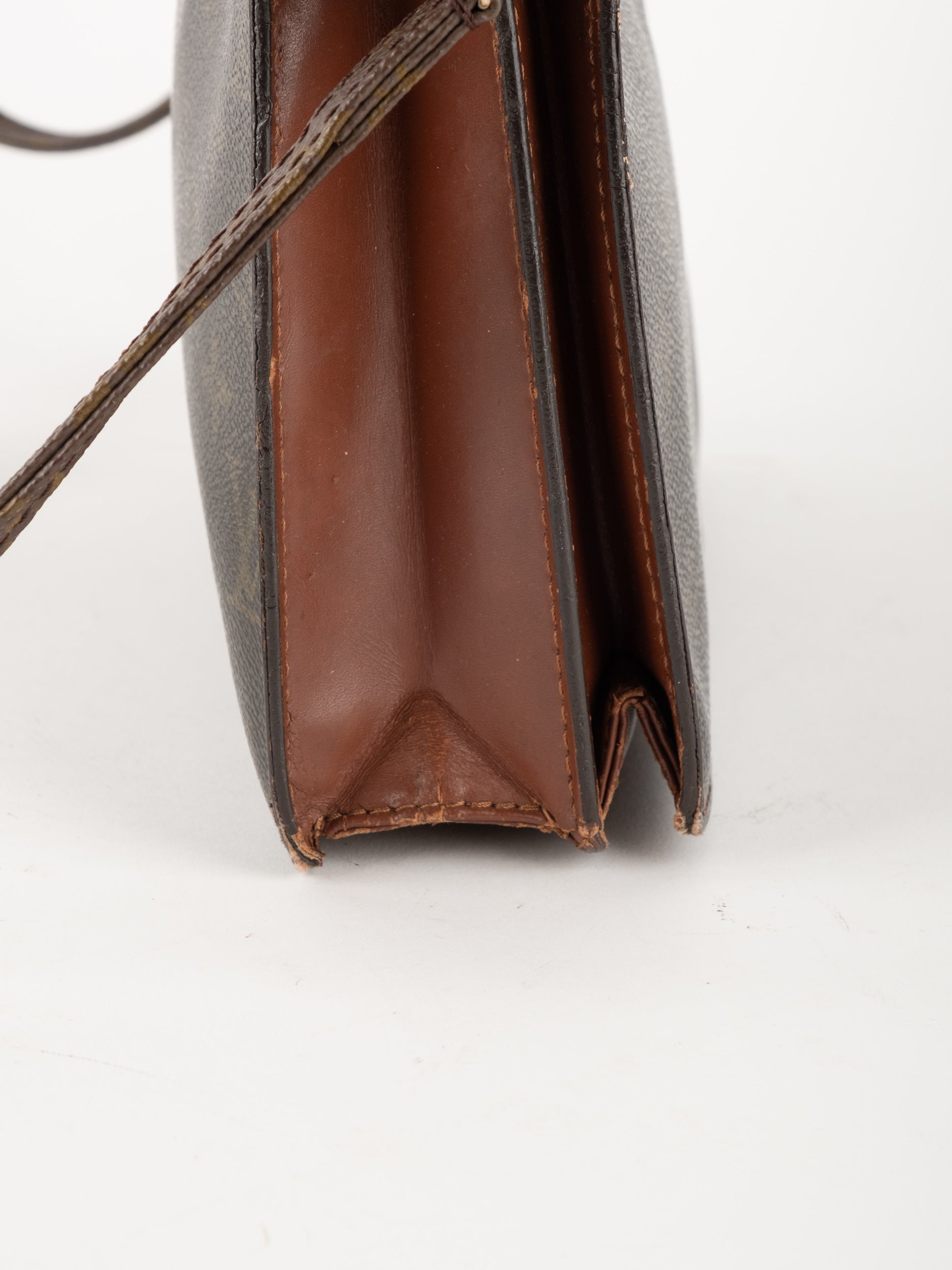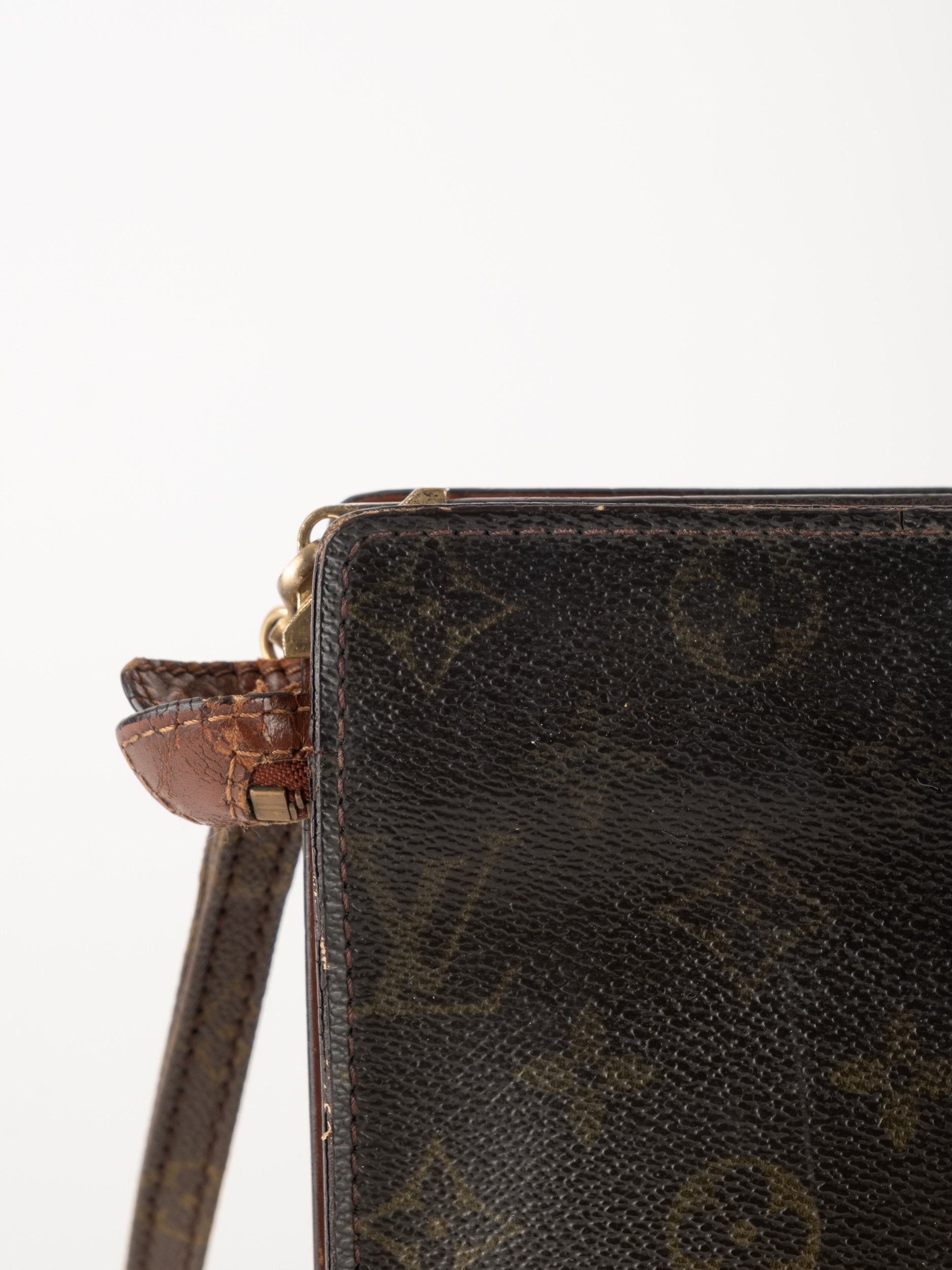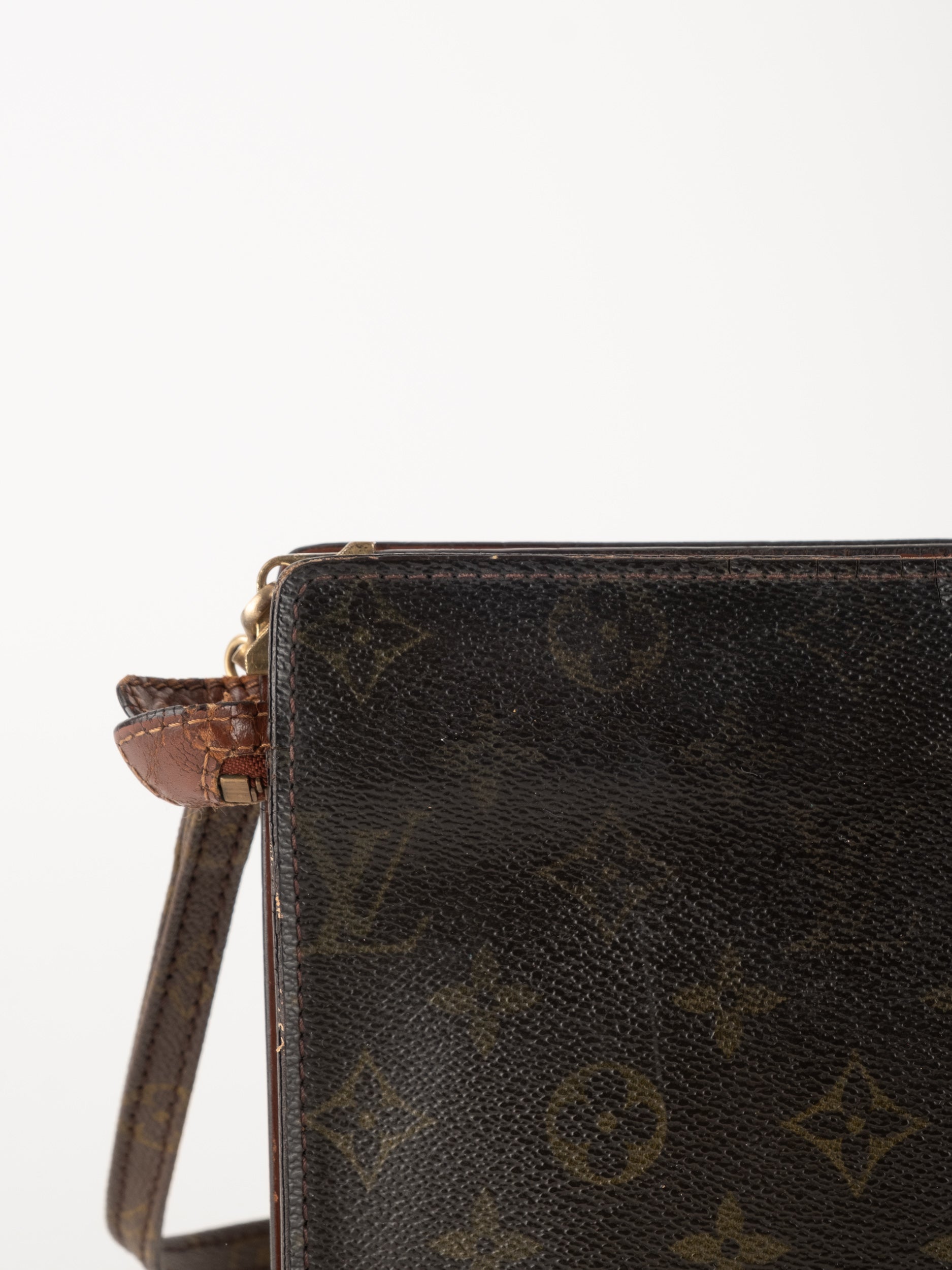לואי ויטון LOUIS VUITTON וינטג' יד שנייה בדוגמת Monogram הקלאסית בגווני חום. פוצ'ט אייקוני ושטוח עם רצועה נשלפת – פריט קלאסי עם נוכחות ברורה של אחד מבתי האופנה הגדולים בעולם.