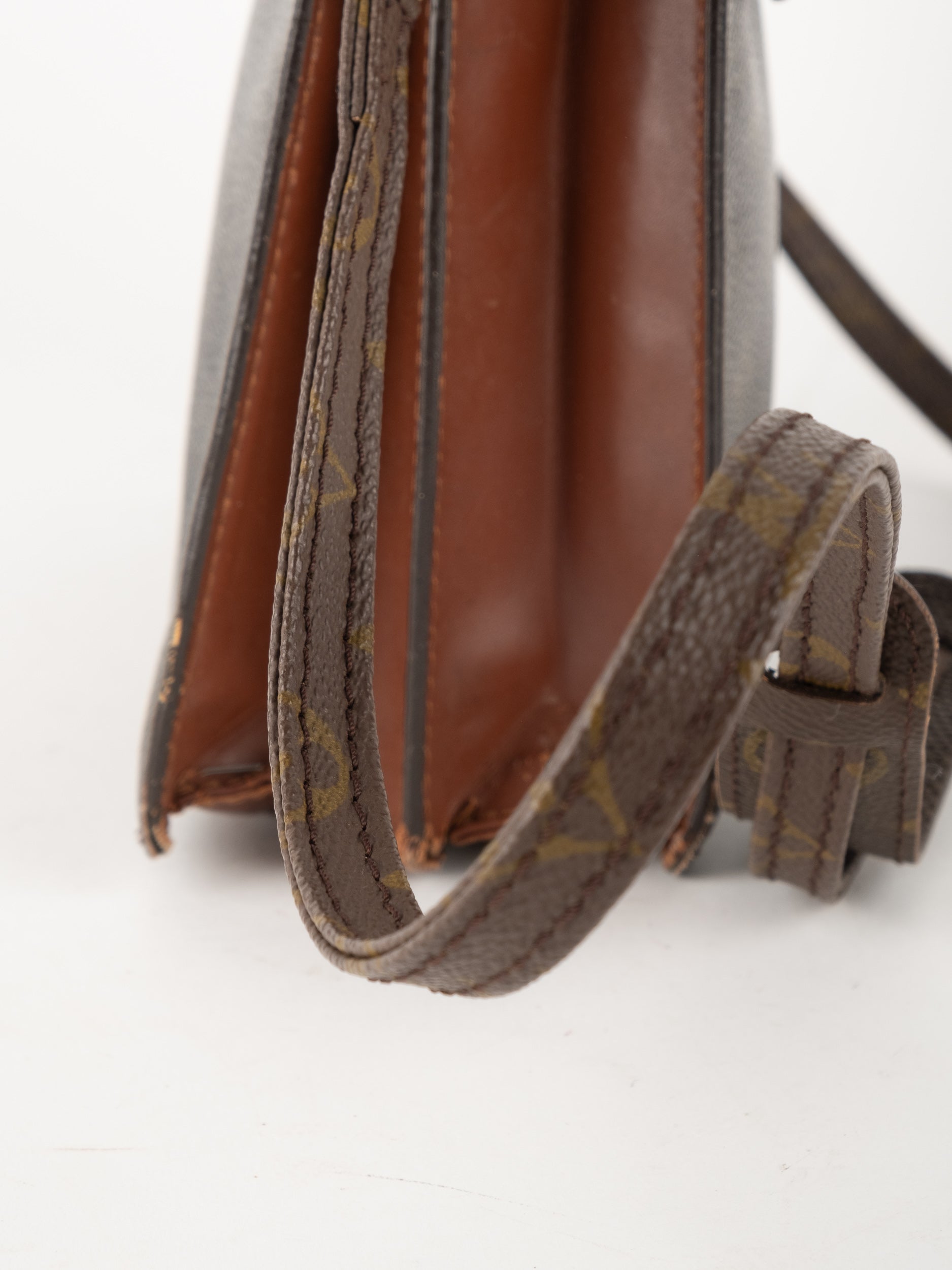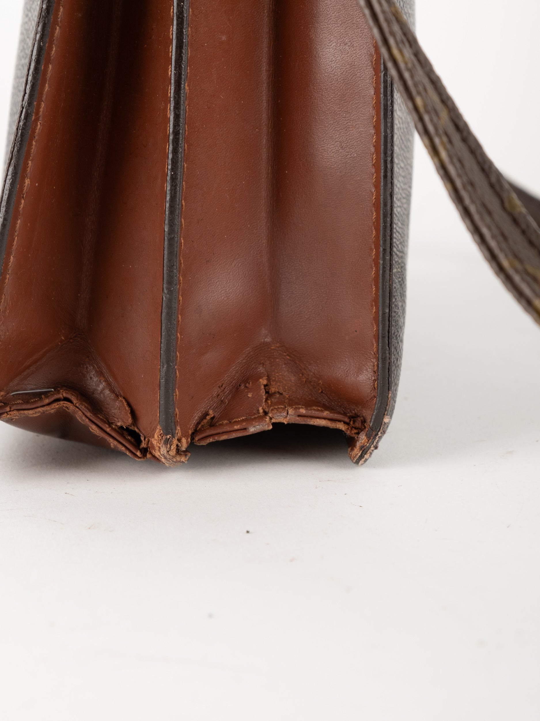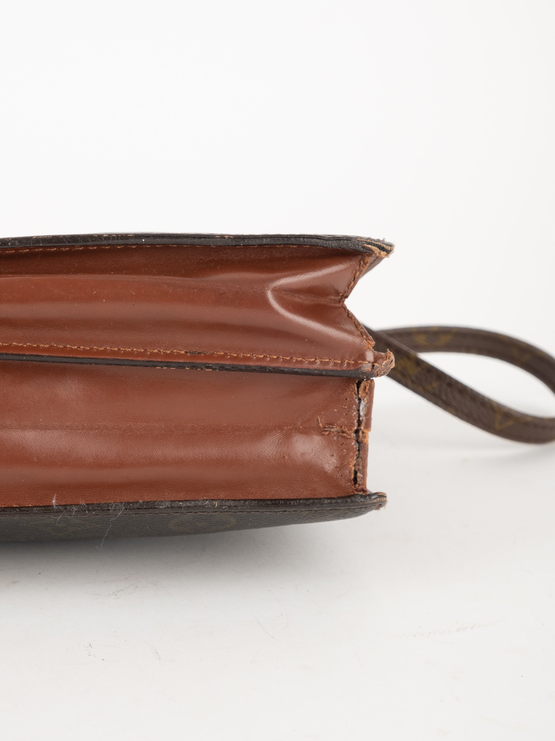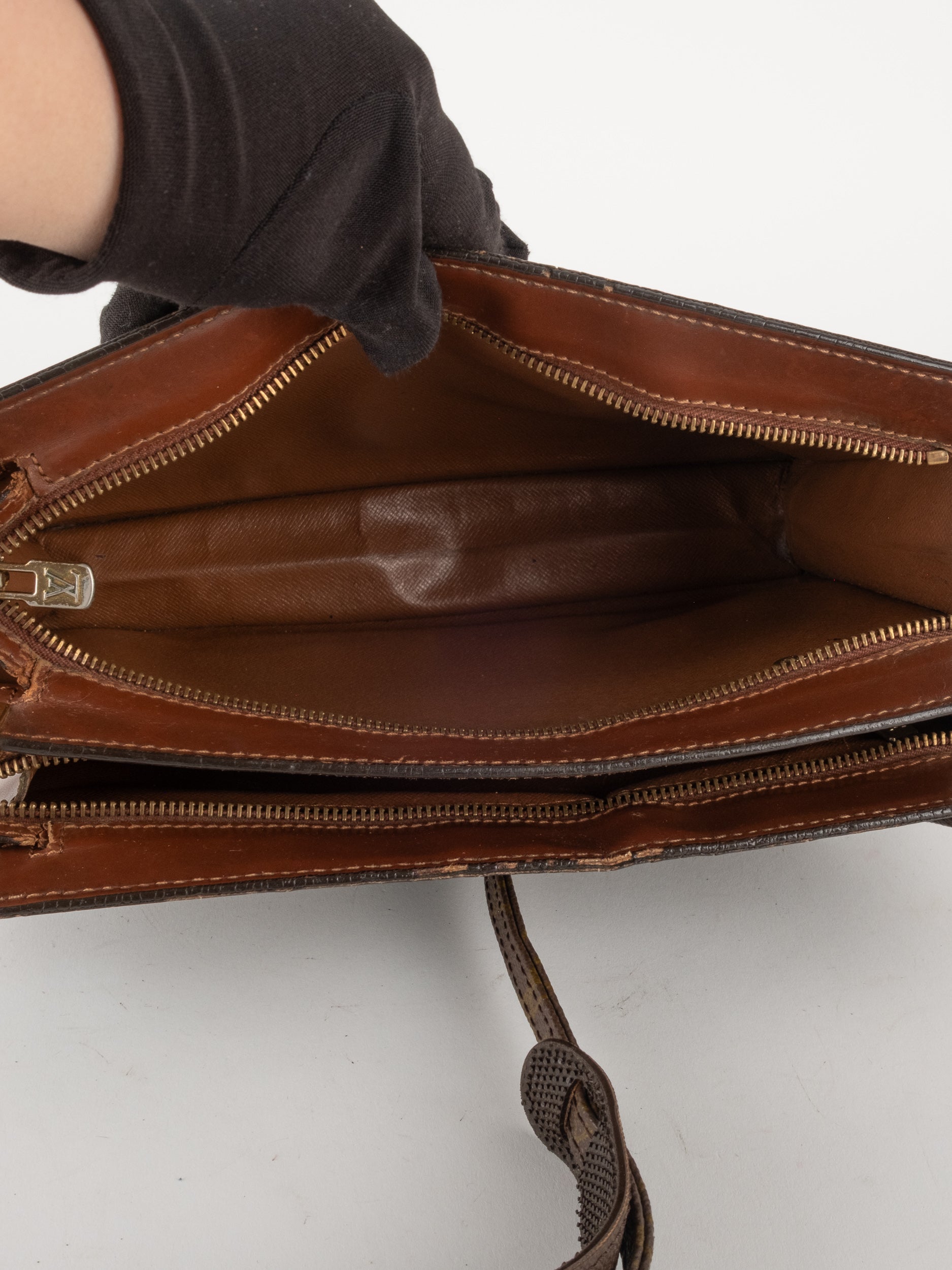לואי ויטון LOUIS VUITTON וינטג' יד שנייה בדוגמת Monogram הקלאסית בגווני חום. פוצ'ט אייקוני ושטוח עם רצועה נשלפת – פריט קלאסי עם נוכחות ברורה של אחד מבתי האופנה הגדולים בעולם.
