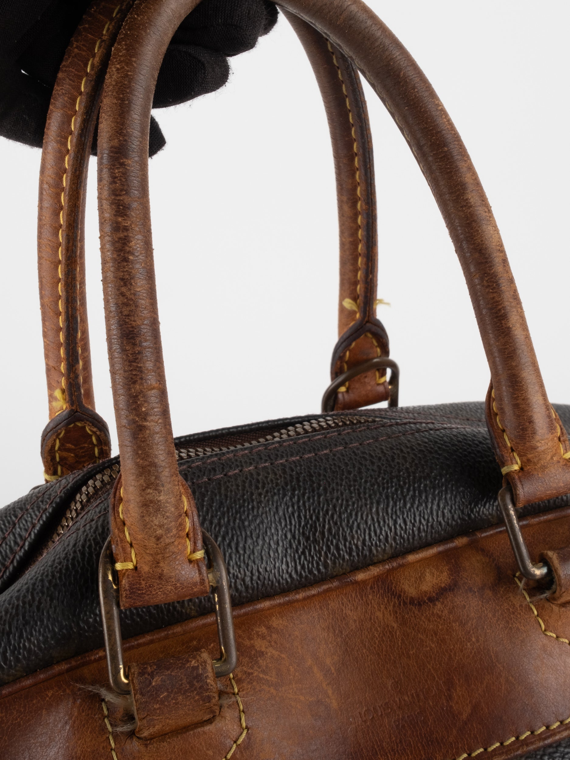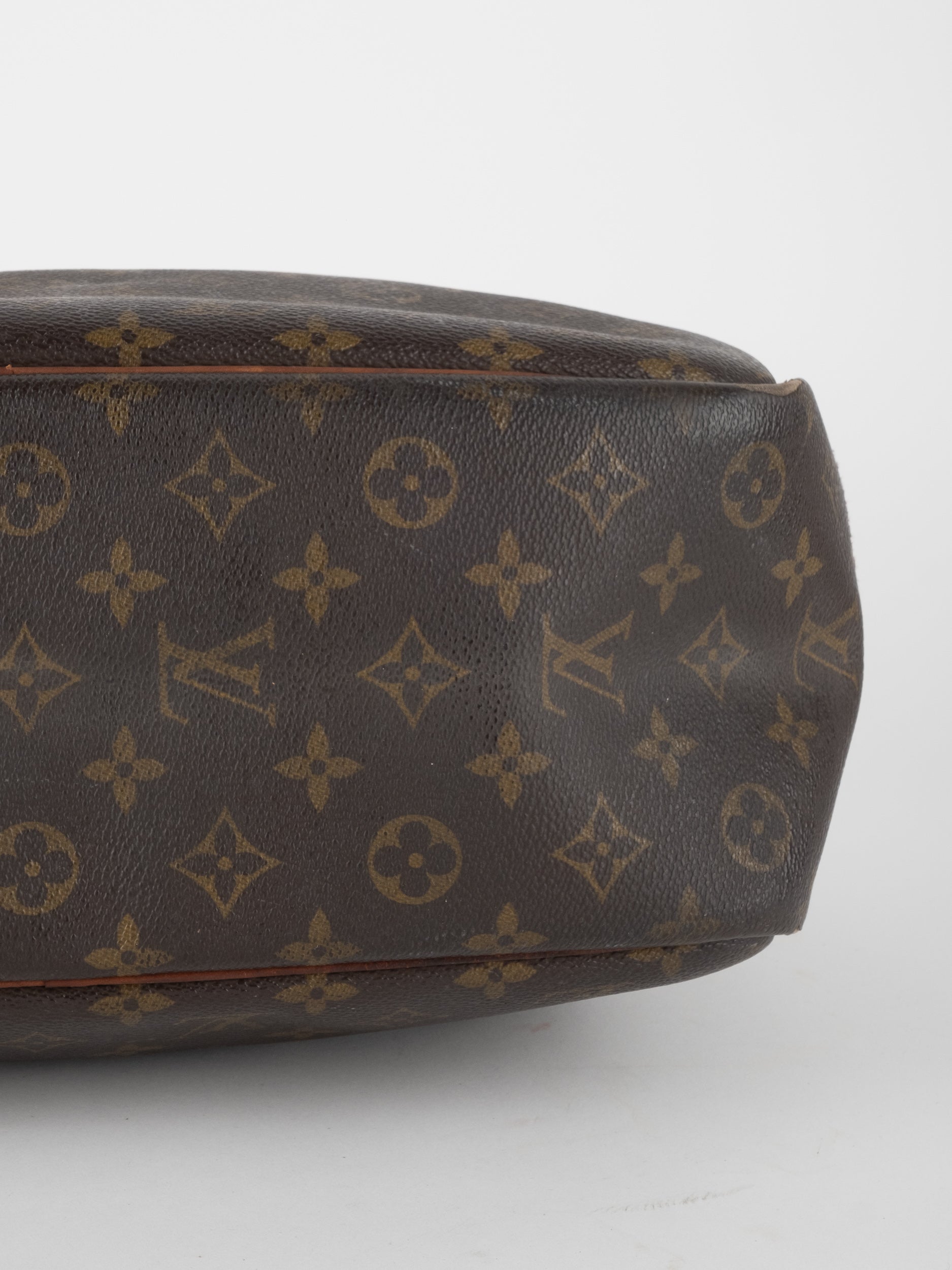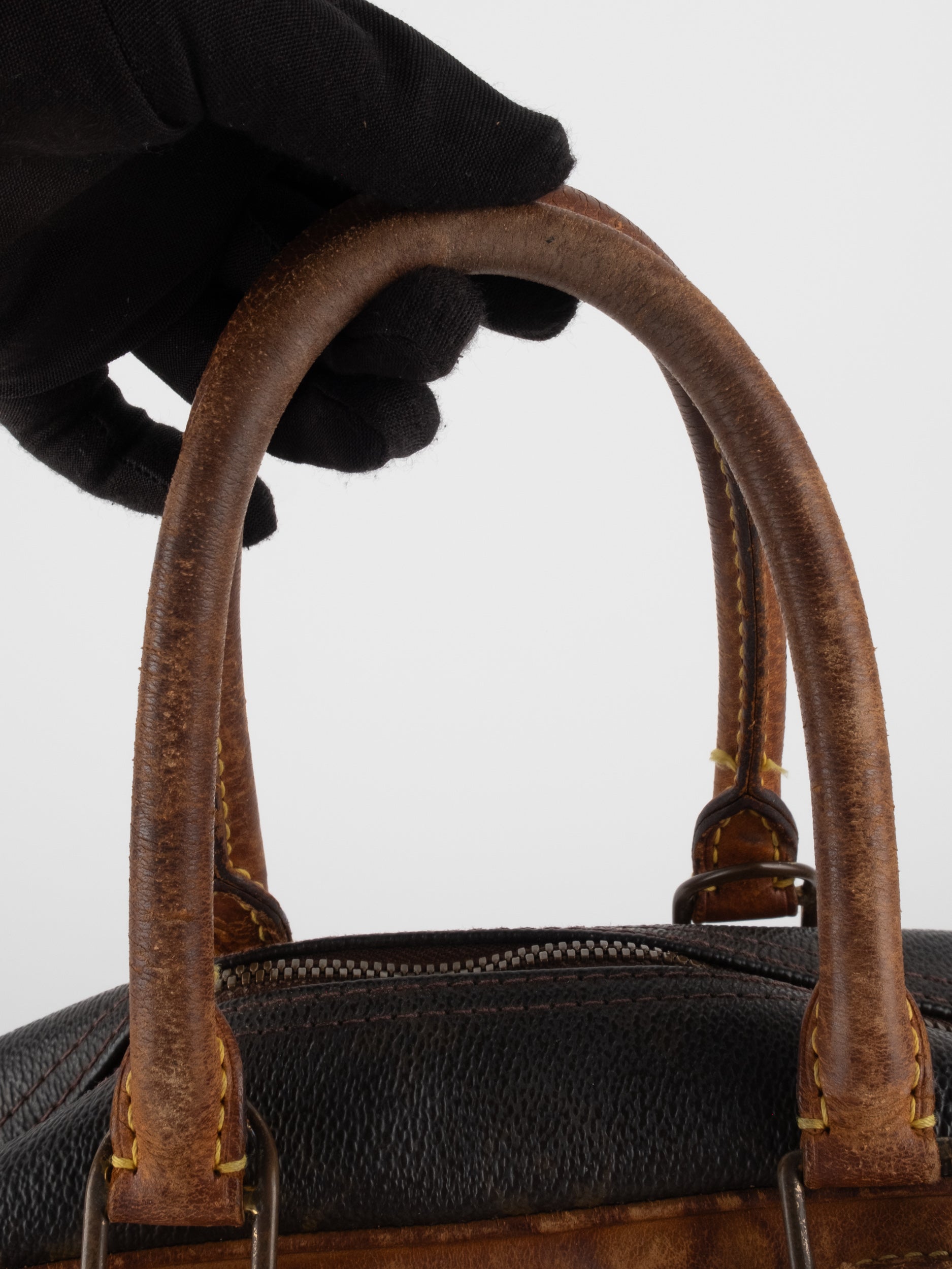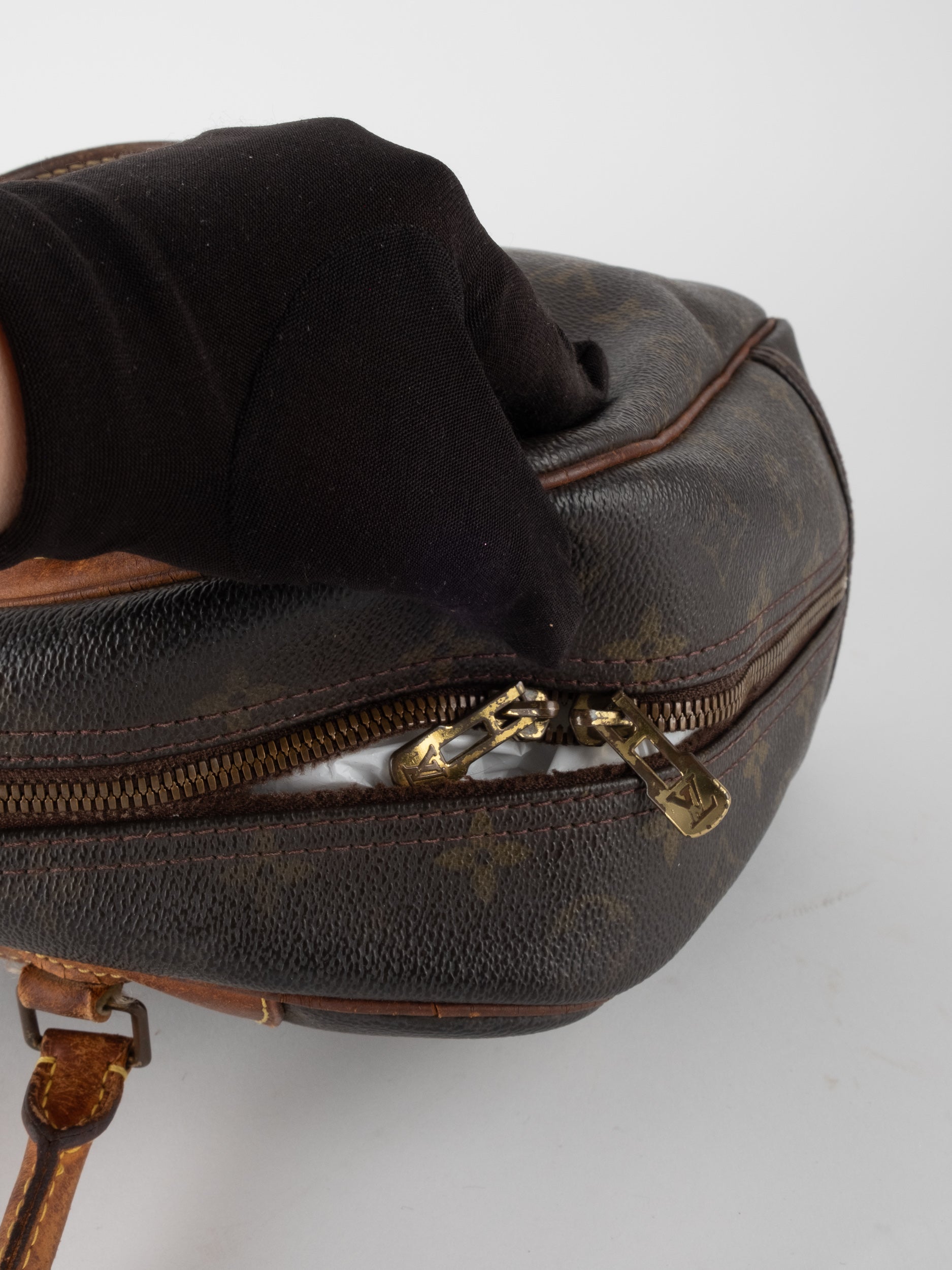 לואי ויטון LOUIS VUITTON וינטג' יד שנייה בעיצוב קלאסי עם דוגמת המונוגרמה האייקונית בגווני חום וזהב, בשילוב עיטורי עור טבעי שהתכהו עם השנים וקיבלו פטינה עמוקה ואותנטית. דגם בעל קווים מעוגלים ונשיאה ביד, עם נוכחות נוסטלגית של וינטג' אמיתי.