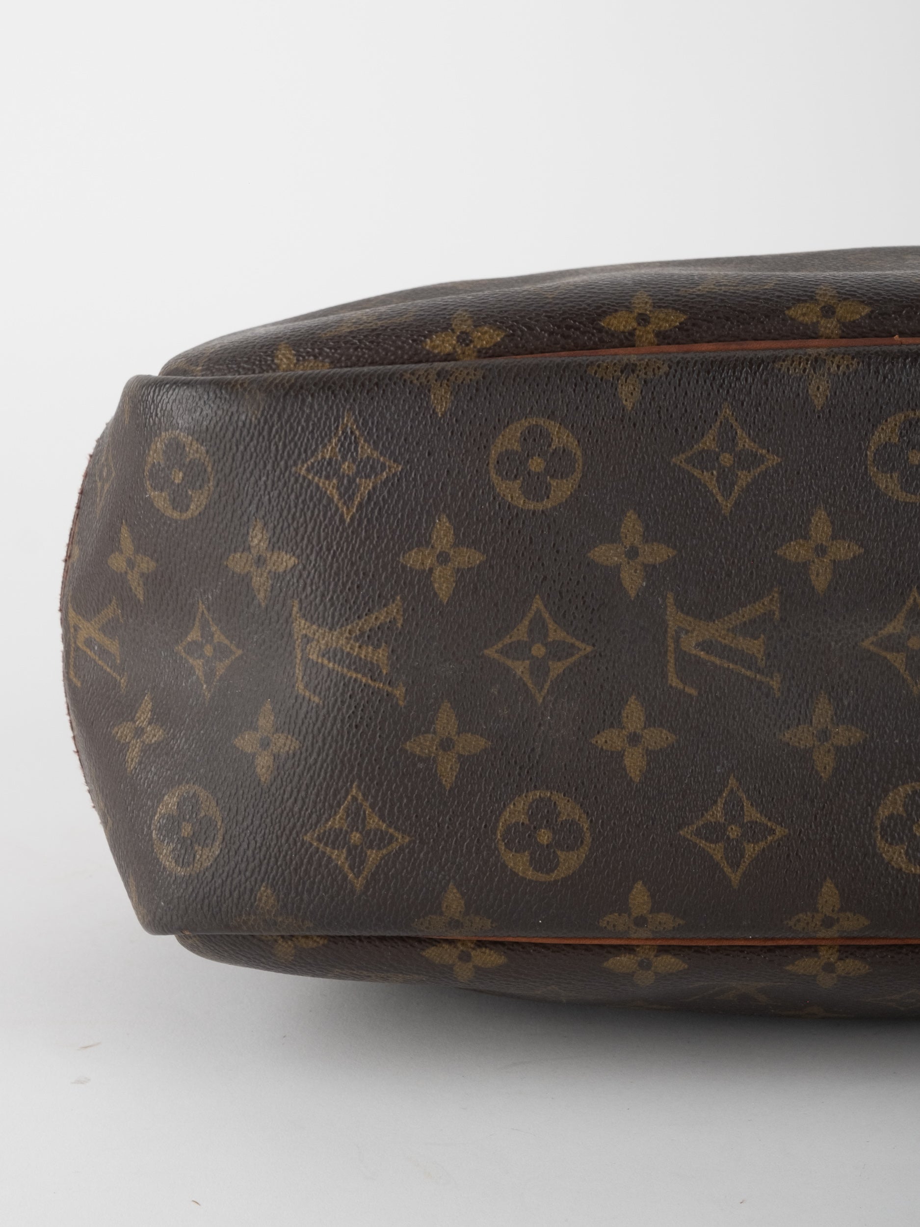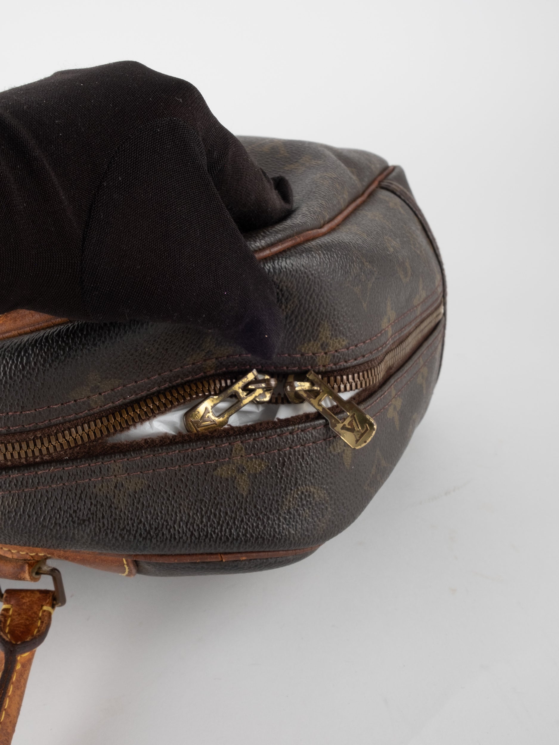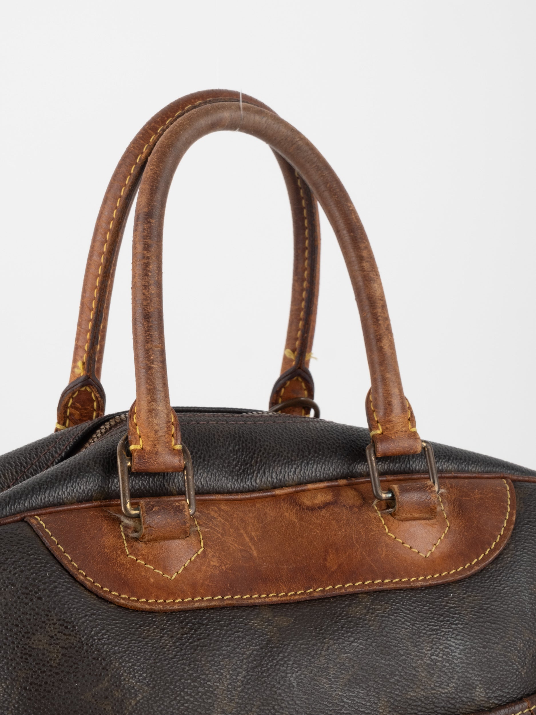 לואי ויטון LOUIS VUITTON וינטג' יד שנייה בעיצוב קלאסי עם דוגמת המונוגרמה האייקונית בגווני חום וזהב, בשילוב עיטורי עור טבעי שהתכהו עם השנים וקיבלו פטינה עמוקה ואותנטית. דגם בעל קווים מעוגלים ונשיאה ביד, עם נוכחות נוסטלגית של וינטג' אמיתי.