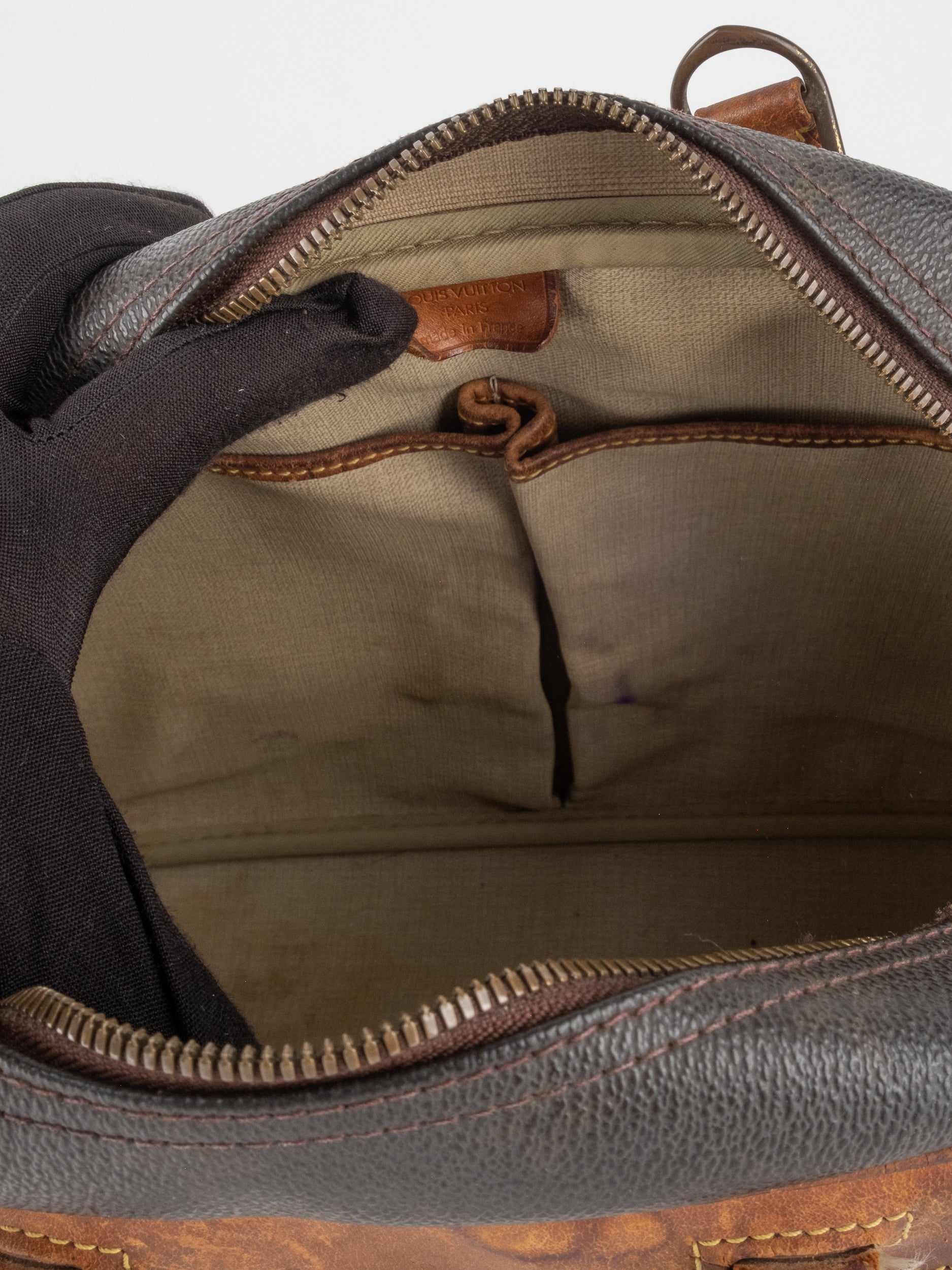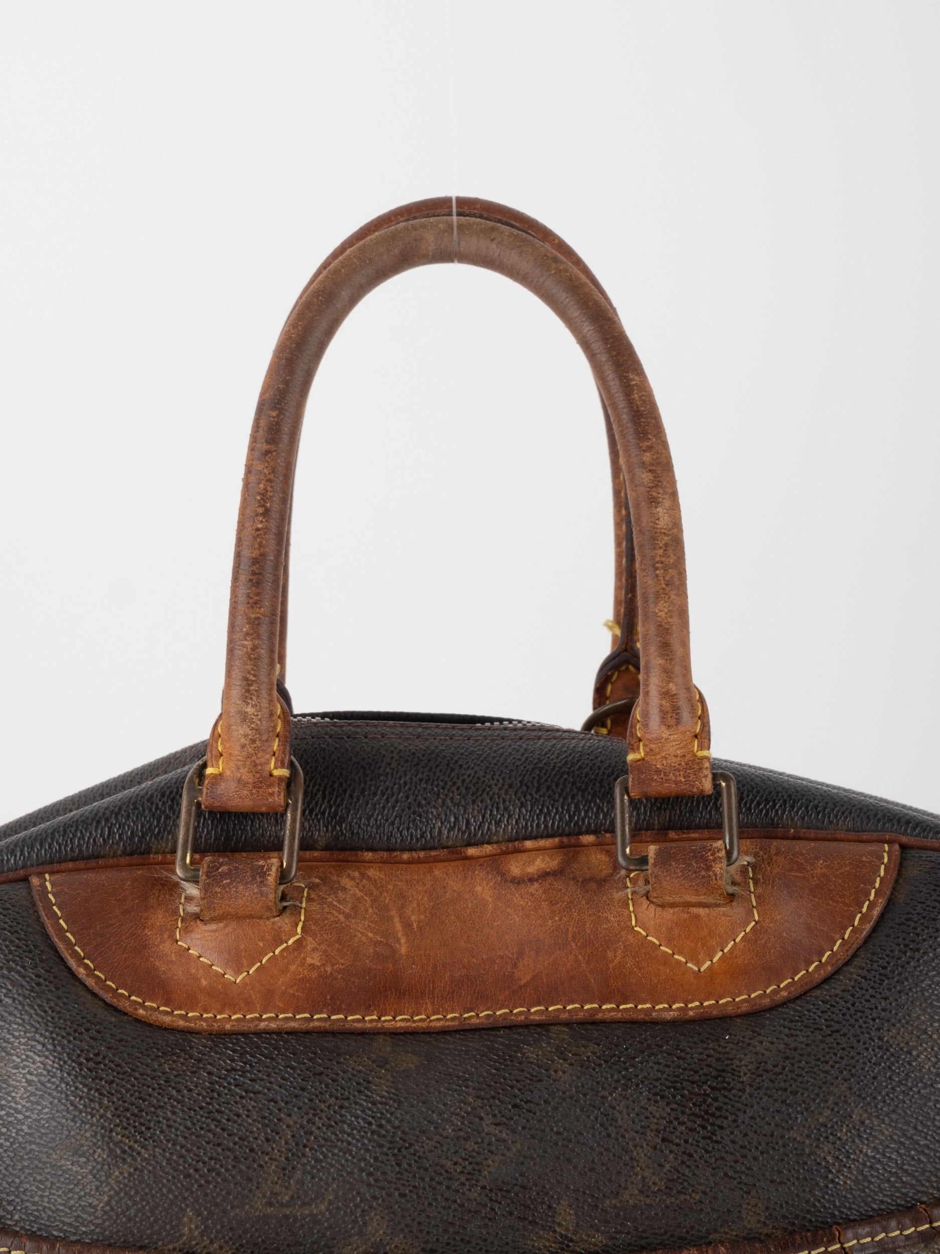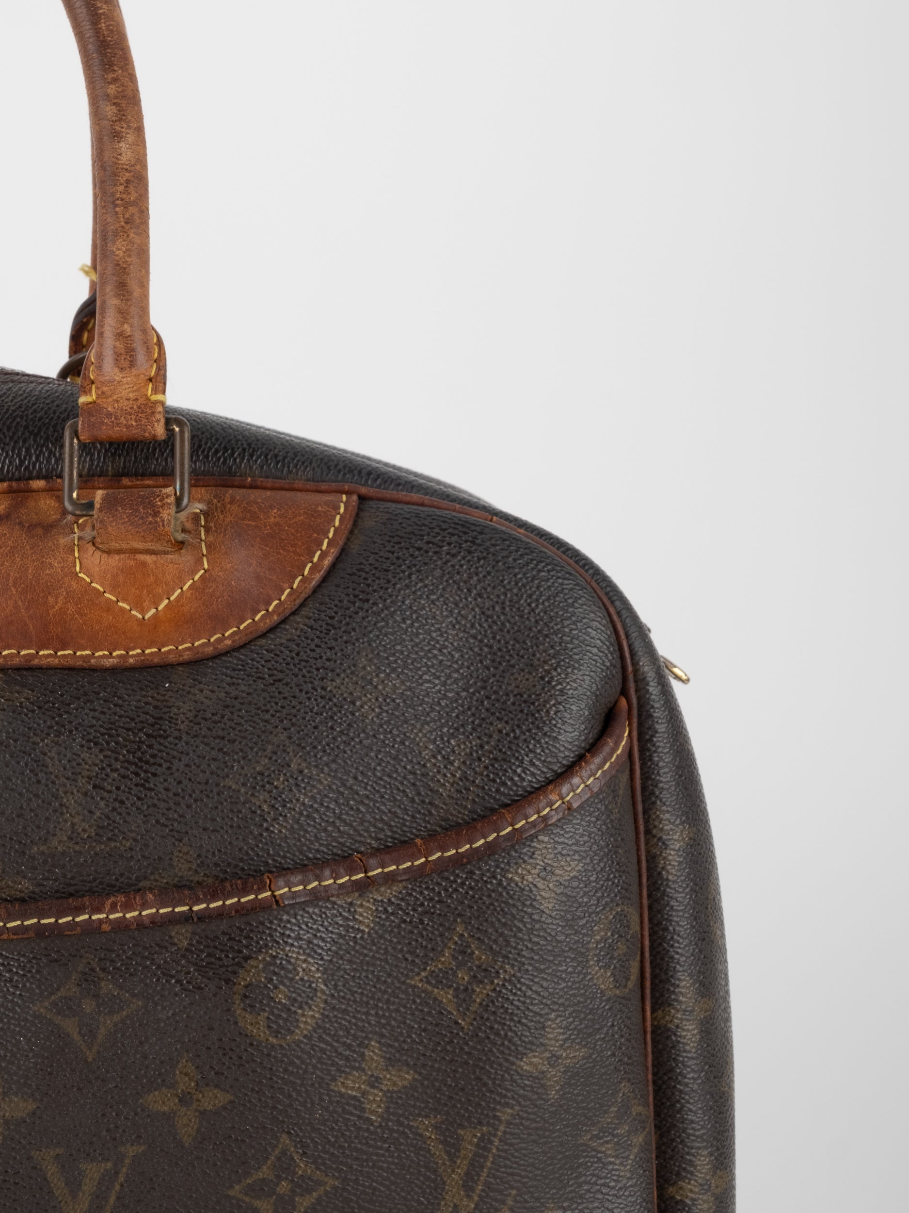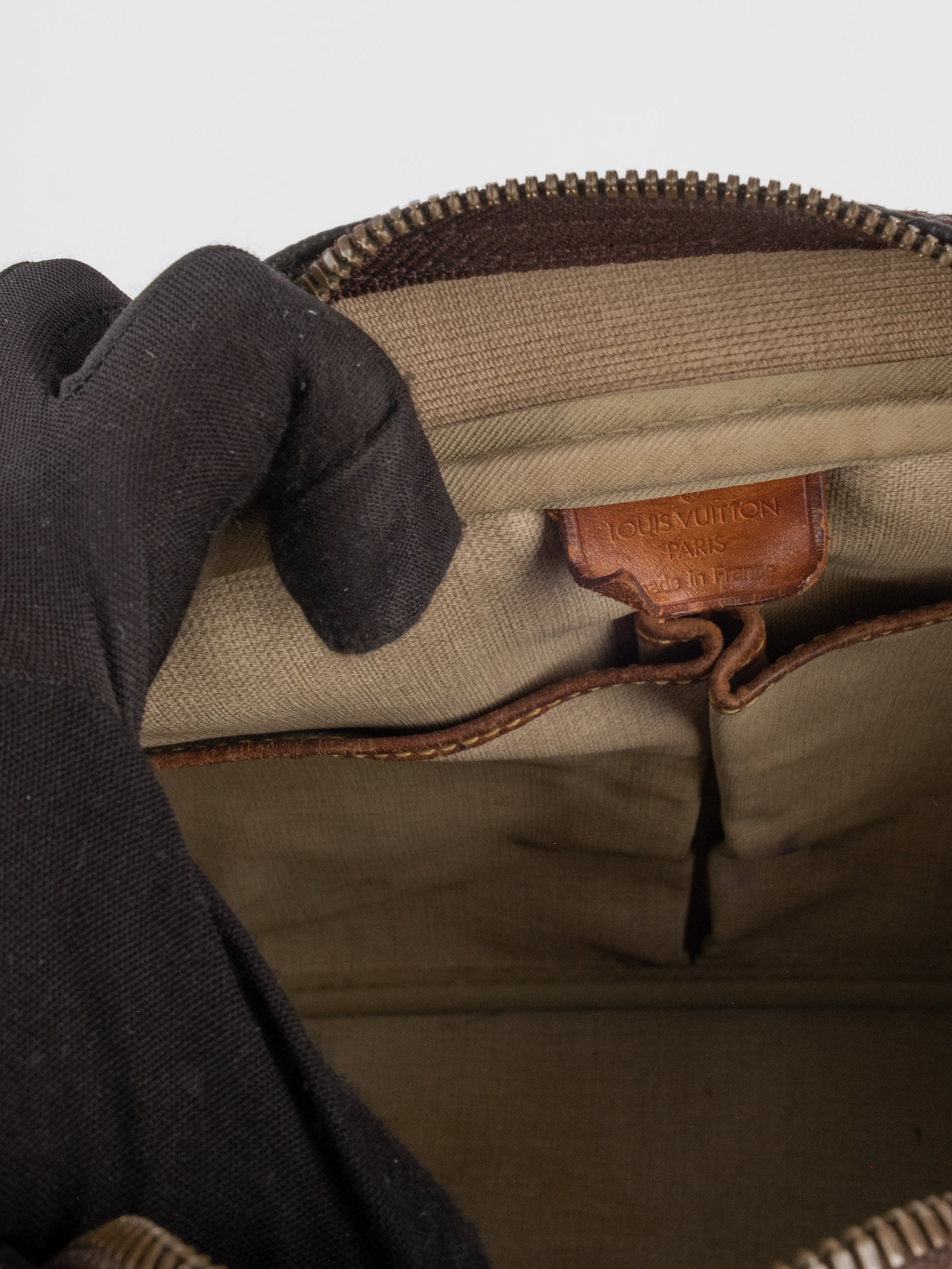 לואי ויטון LOUIS VUITTON וינטג' יד שנייה בעיצוב קלאסי עם דוגמת המונוגרמה האייקונית בגווני חום וזהב, בשילוב עיטורי עור טבעי שהתכהו עם השנים וקיבלו פטינה עמוקה ואותנטית. דגם בעל קווים מעוגלים ונשיאה ביד, עם נוכחות נוסטלגית של וינטג' אמיתי.