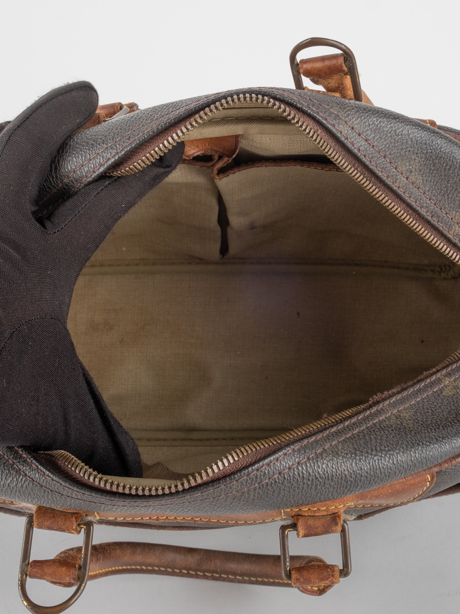 התיק עשוי קנבס מונוגרמה מצופה בגווני חום, עם ידיות ועיטורי עור טבעי כהה. מבנה רחב ומעוגל עם תא מרכזי גדול וסגירת רוכסן עליונה. מתאים כנשיאה ביד וכפריט ייחודי למי שמחפשת תיק וינטג' עם אופי וסיפור.