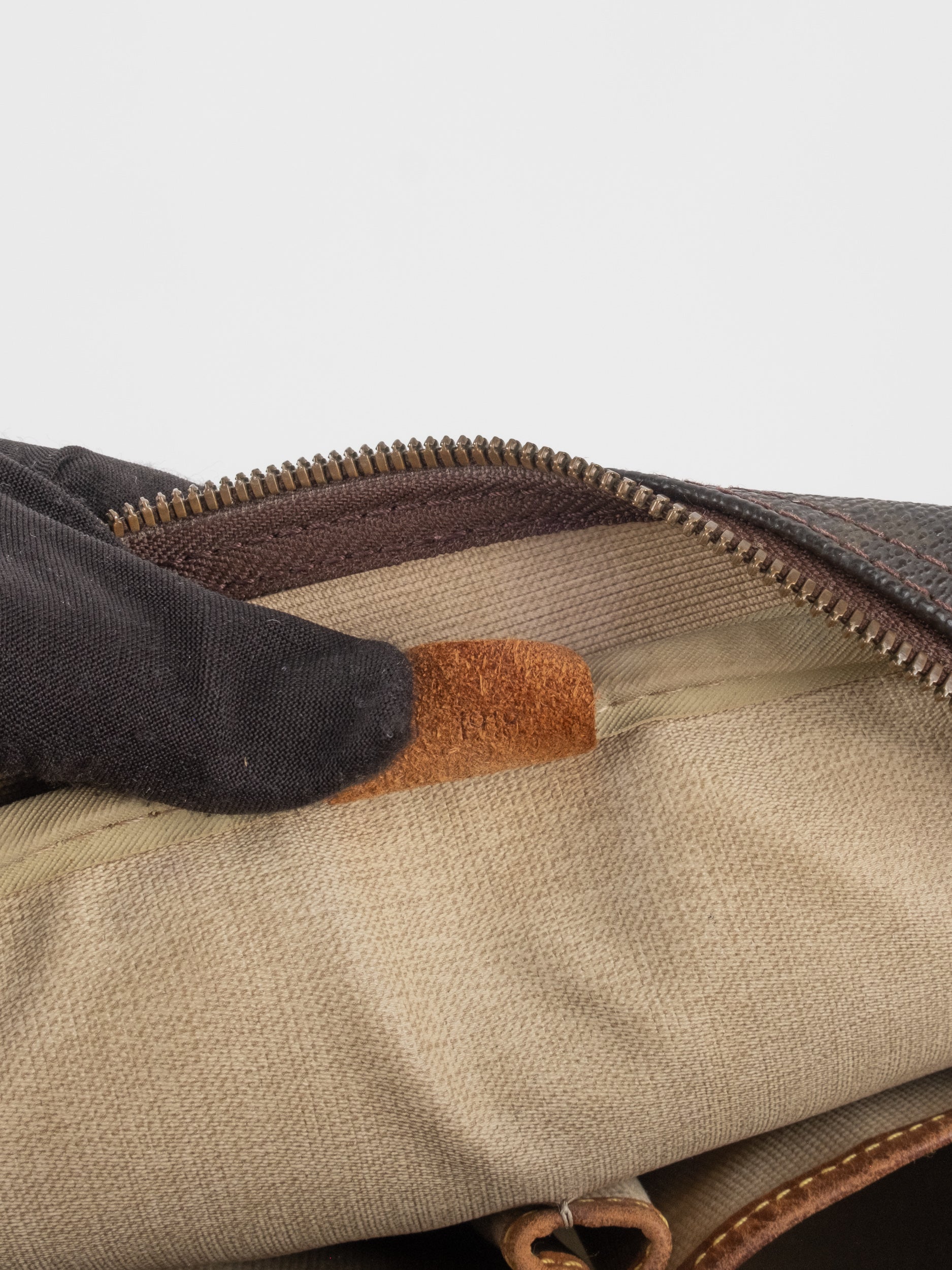 קיימים סימני שימוש משמעותיים בהתאם לגילו של הפריט, לרבות שחיקה ניכרת בעור, פטינה כהה, ושפשופים בפינות. הרוכסן קרוע ואינו נסגר באופן תקין.