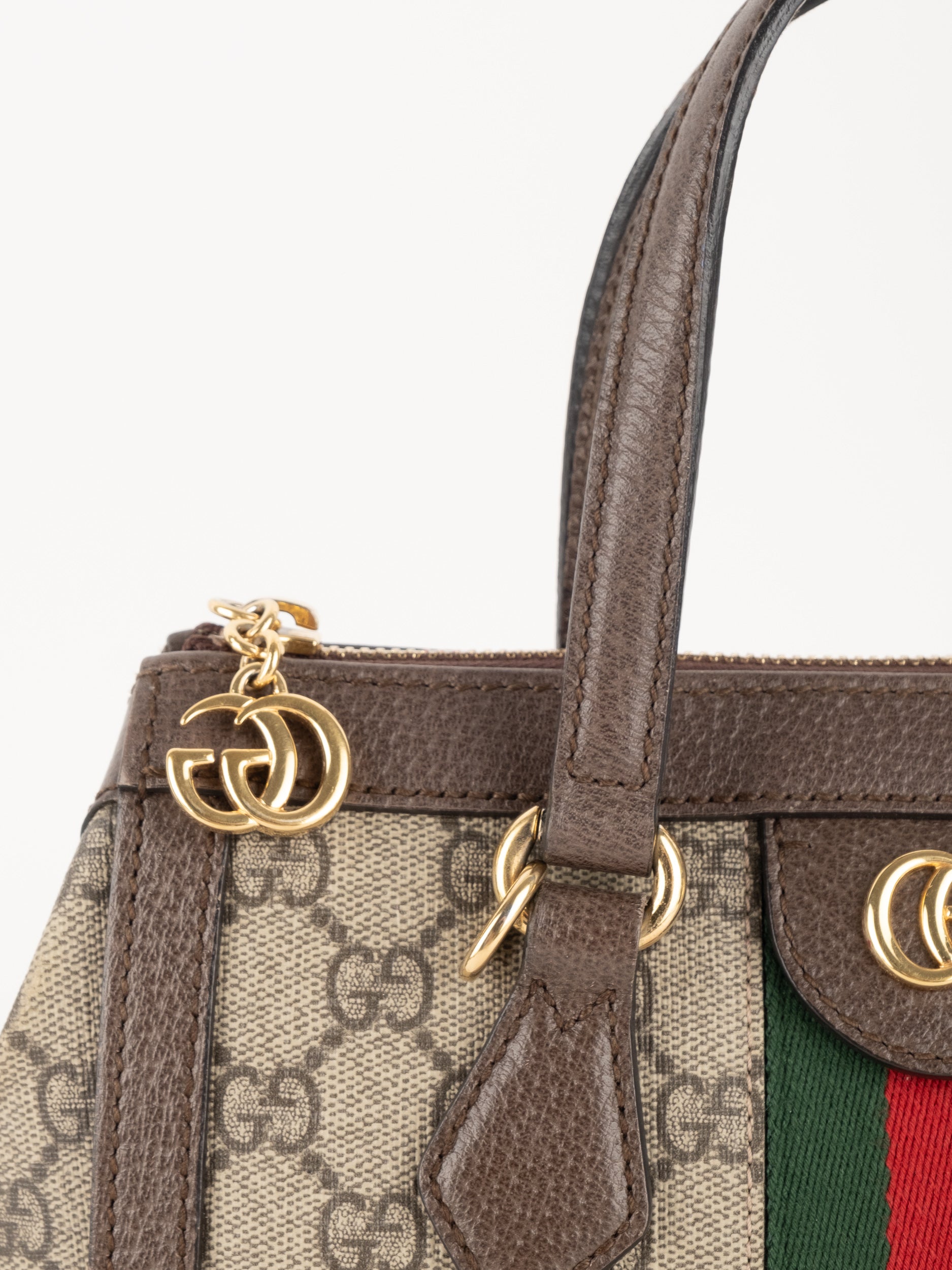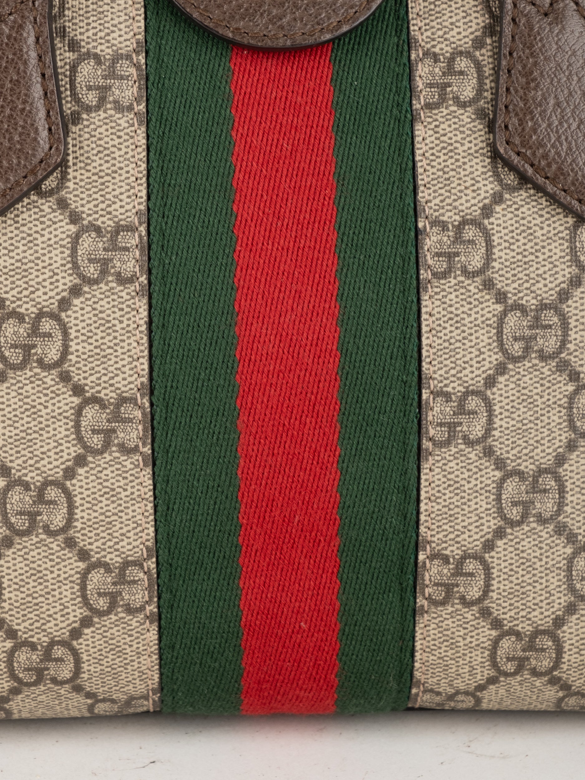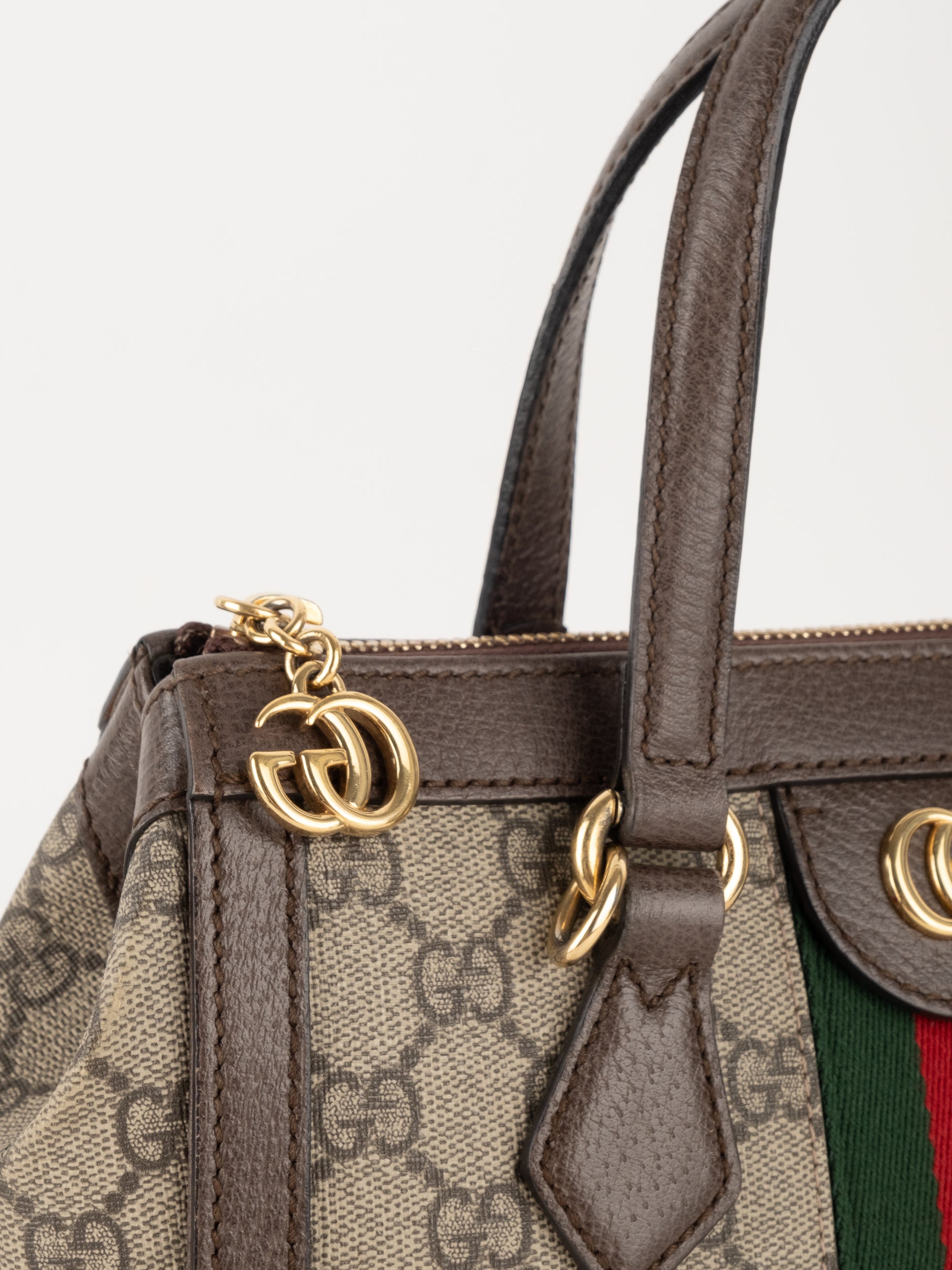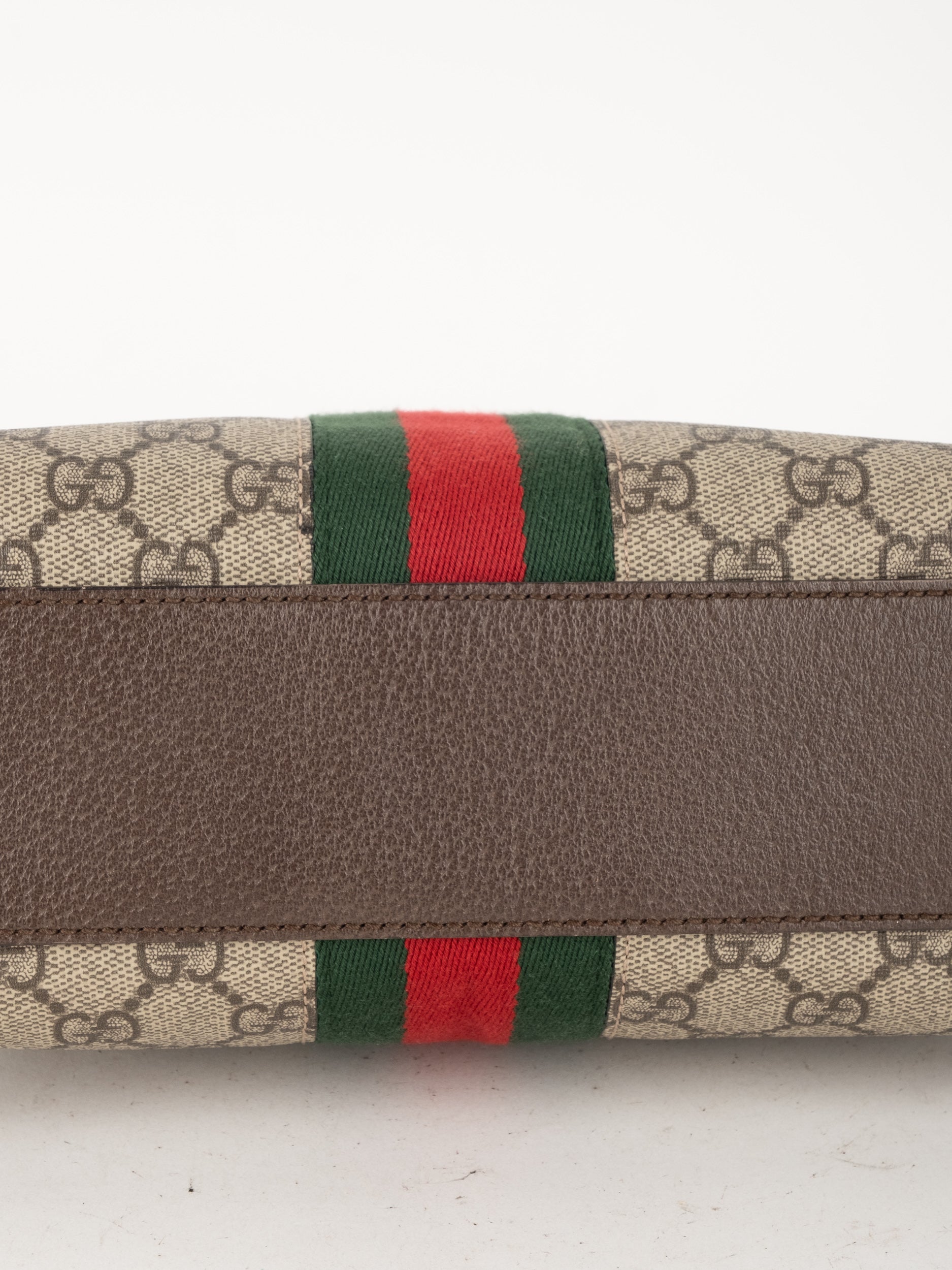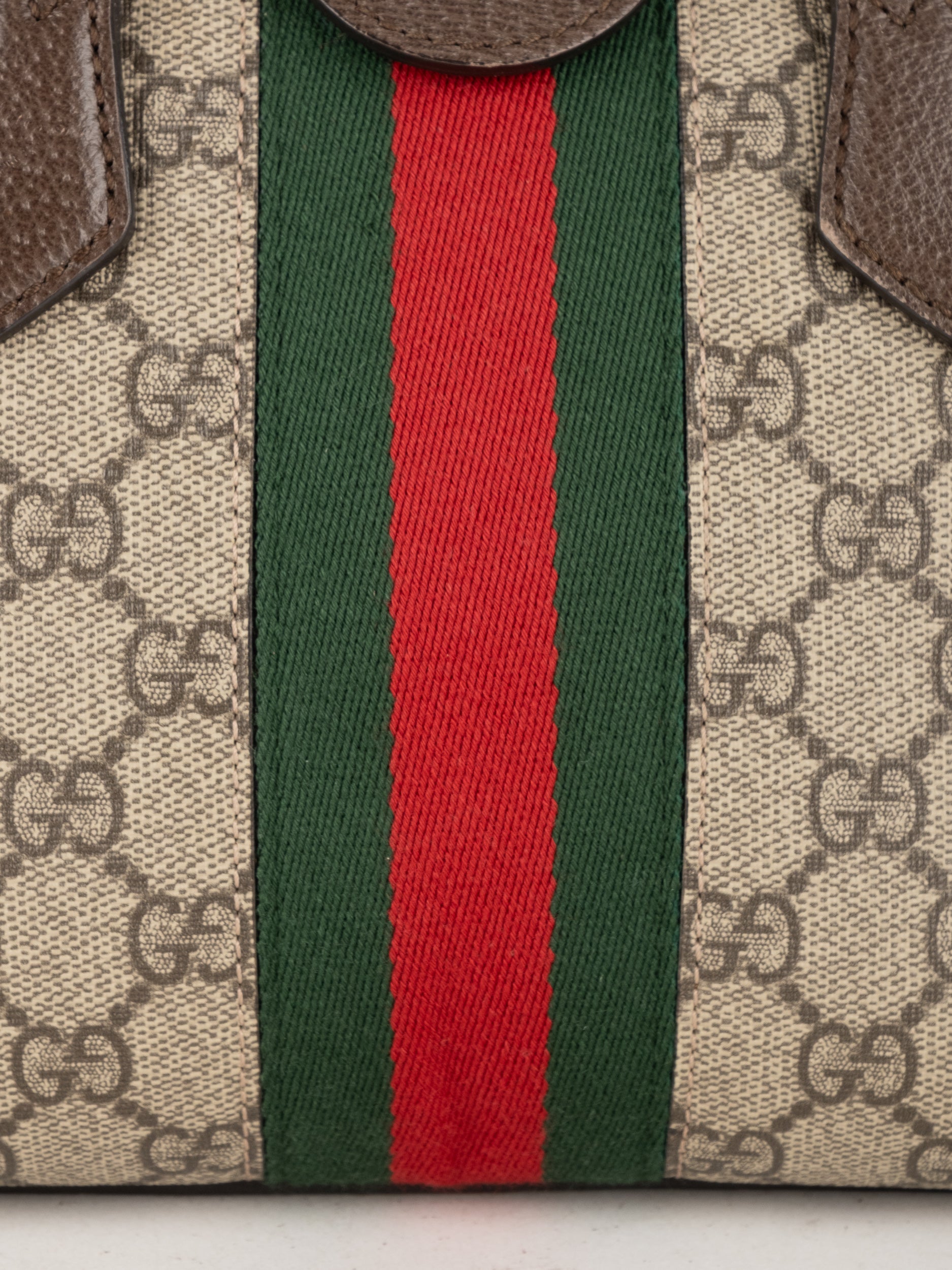 תיק של בית האופנה האיטלקי Gucci גוצ'י – וינטג' יד שנייה, מדגם קלאסי בהשראת סדרת Ophidia המפורסמת של המותג. התיק משלב בין דוגמת ה-GG האייקונית לבין פס ה-Web הירוק-אדום המזוהה עם Gucci, אלמנט שהפך לאחד הסמלים החזקים ביותר של בית האופנה לאורך השנים.