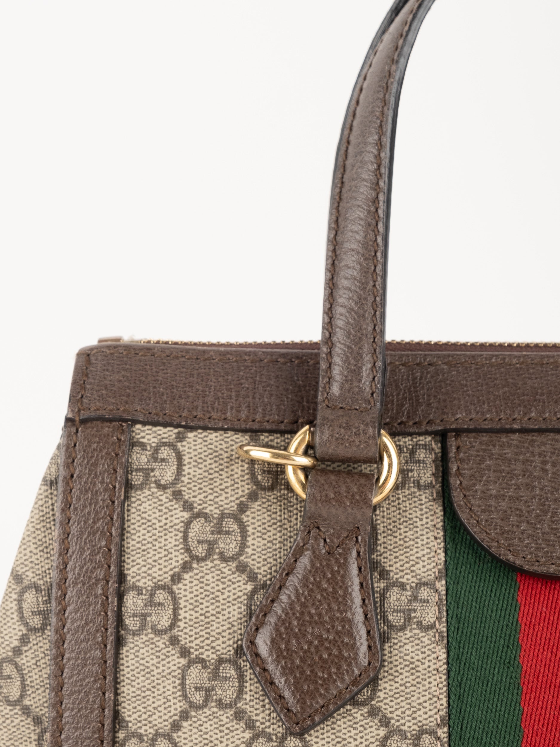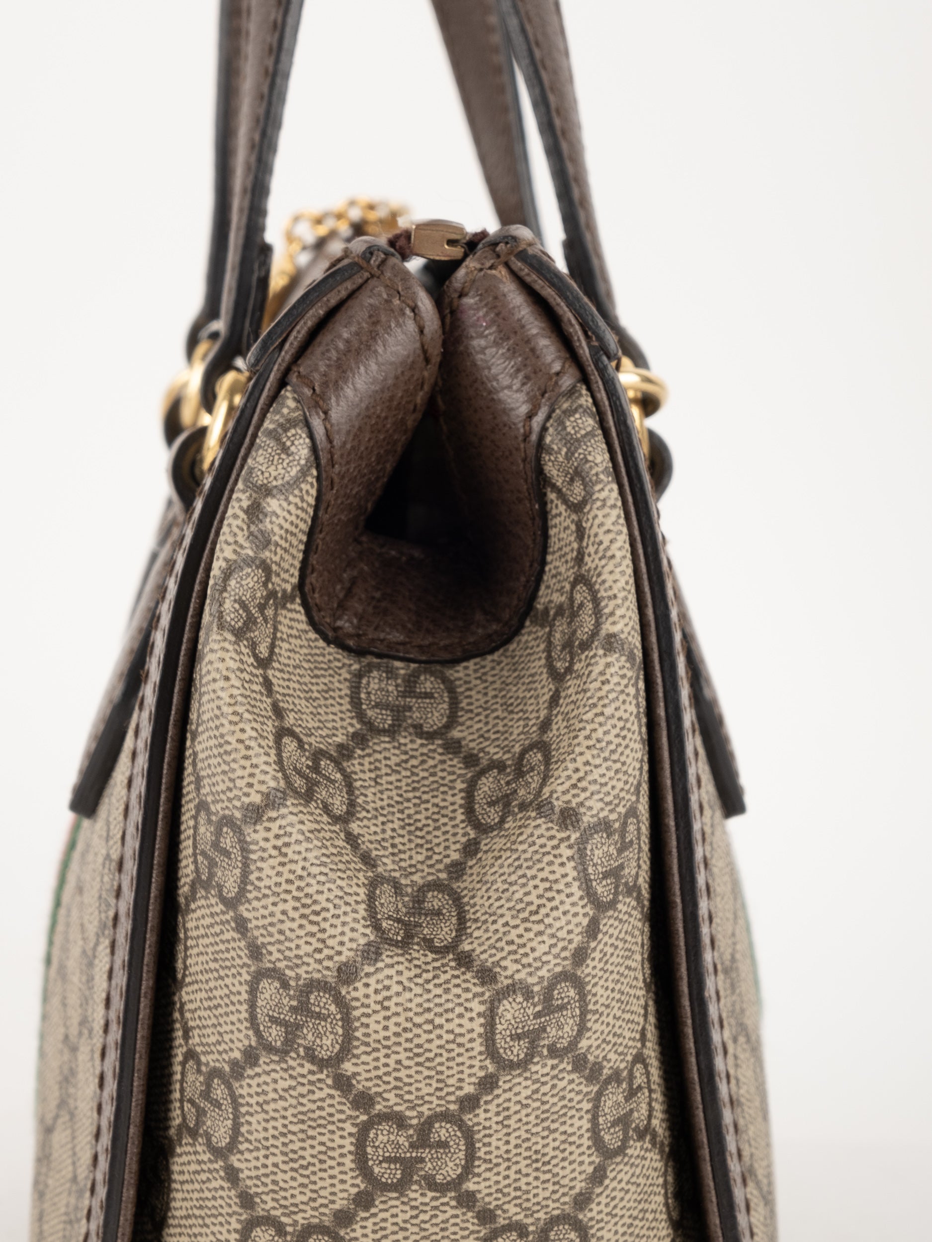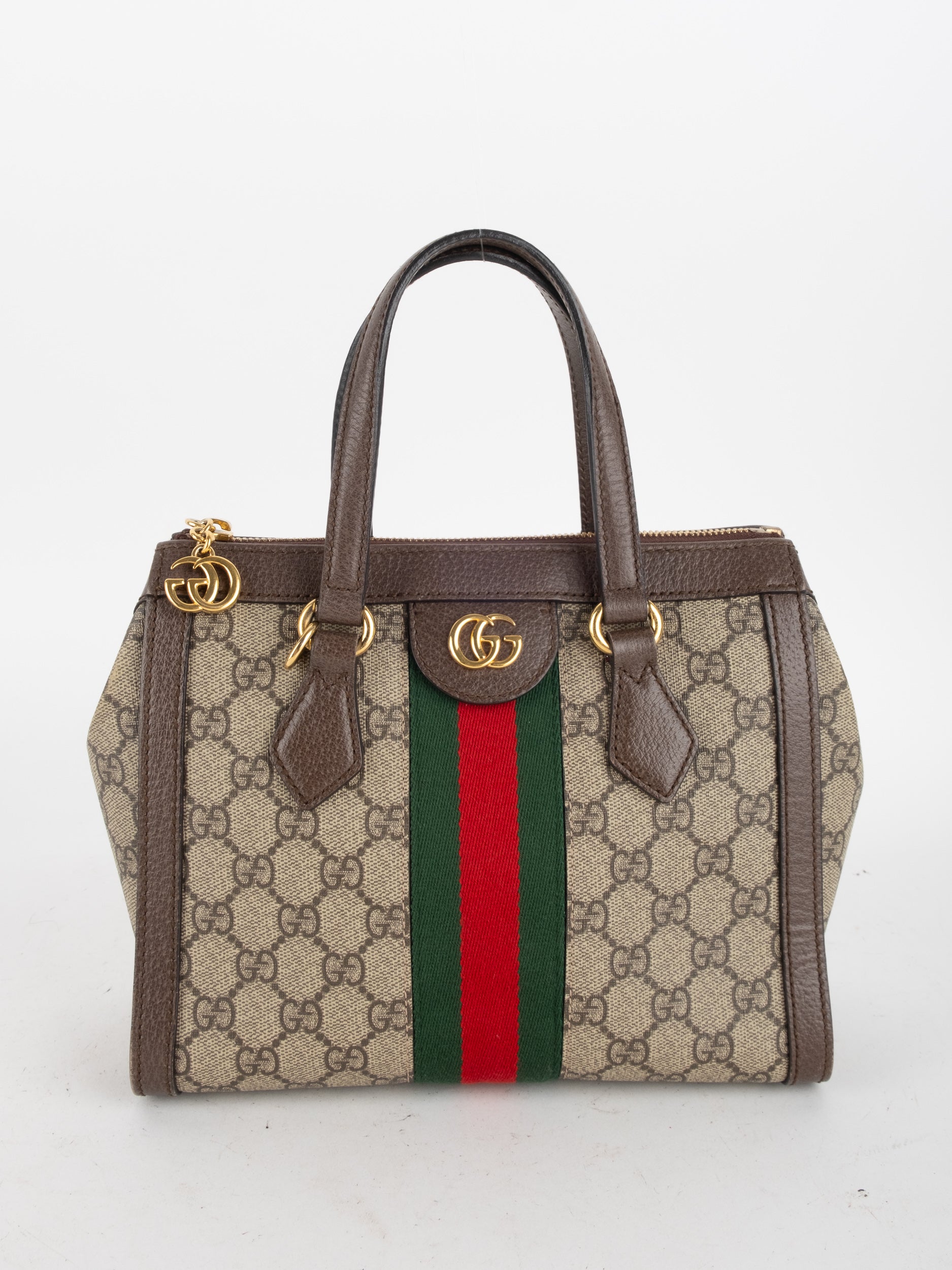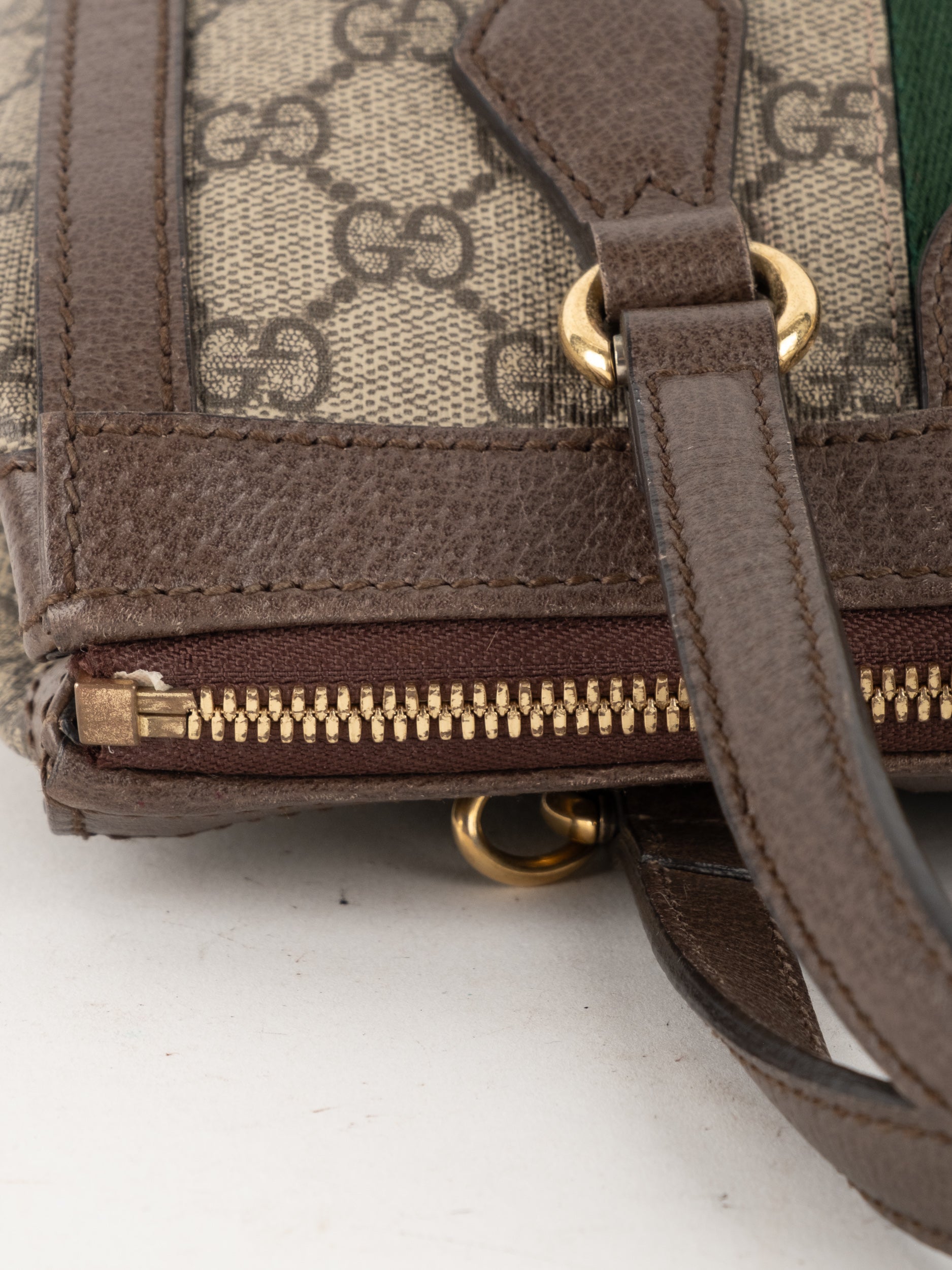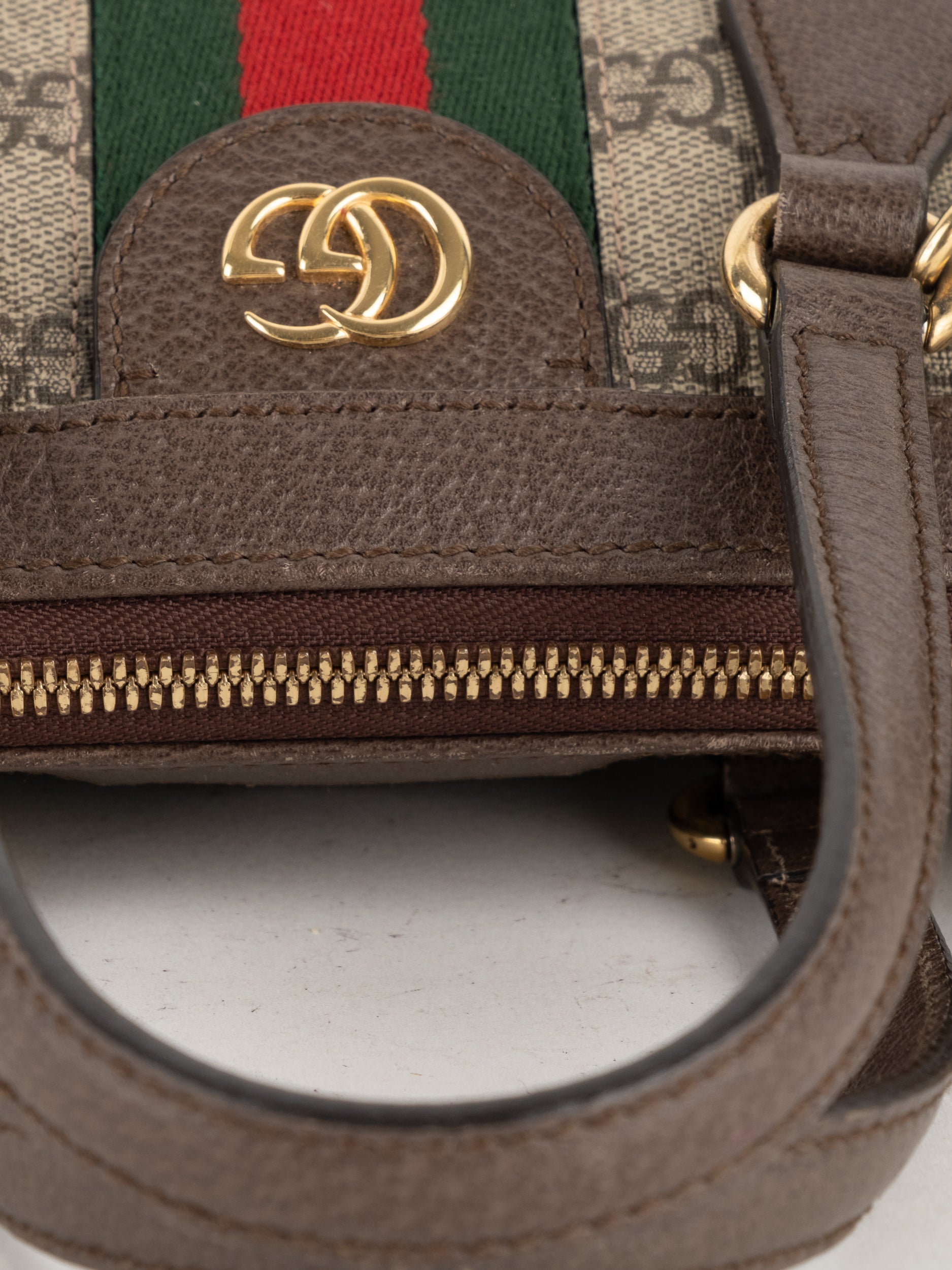 תיק של בית האופנה האיטלקי Gucci גוצ'י – וינטג' יד שנייה, מדגם קלאסי בהשראת סדרת Ophidia המפורסמת של המותג. התיק משלב בין דוגמת ה-GG האייקונית לבין פס ה-Web הירוק-אדום המזוהה עם Gucci, אלמנט שהפך לאחד הסמלים החזקים ביותר של בית האופנה לאורך השנים.