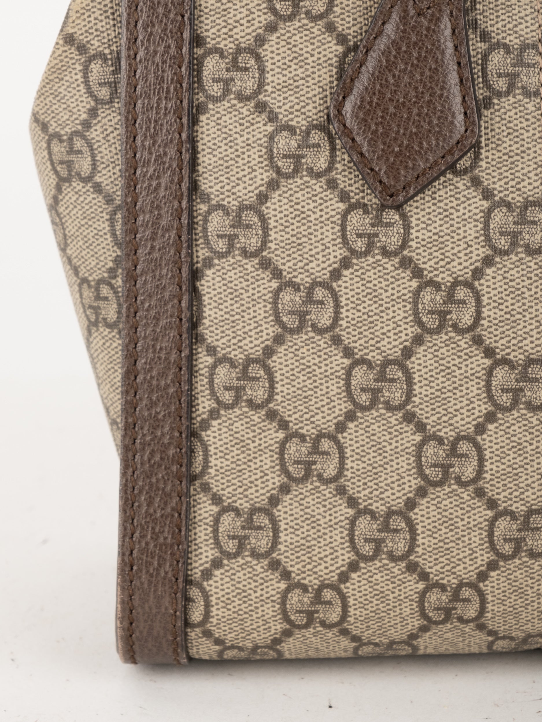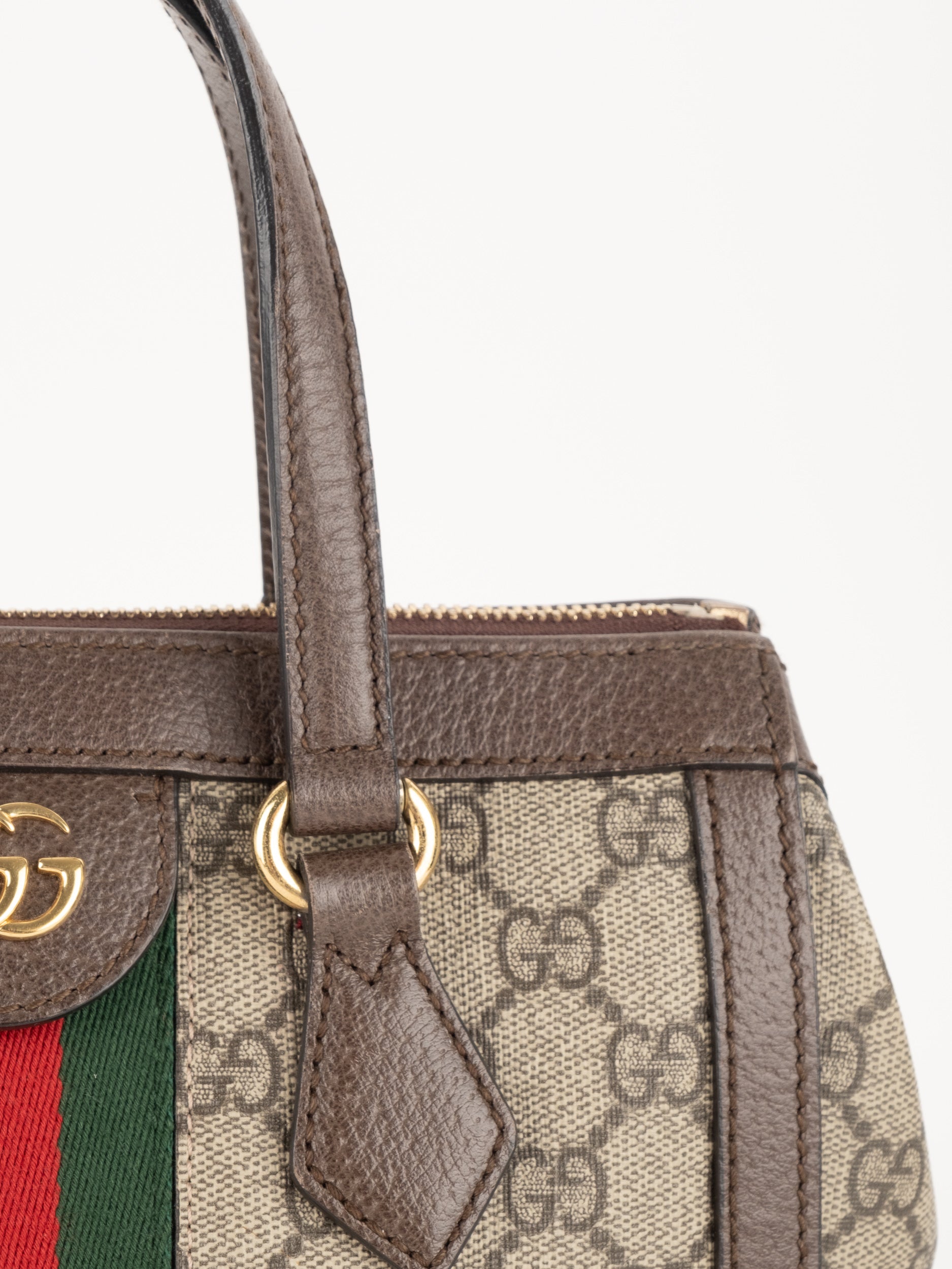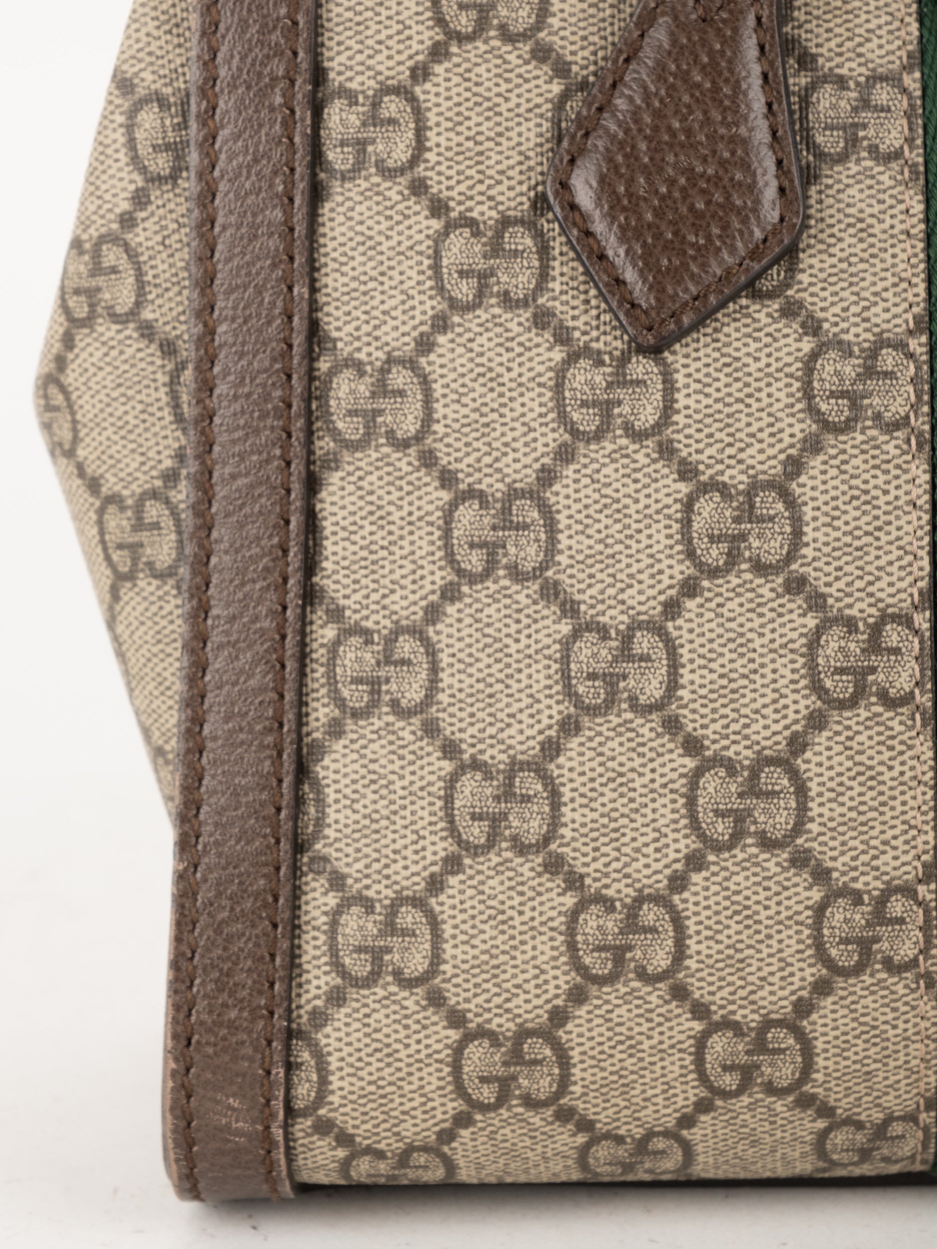 התיק עשוי בד GG Supreme canvas בגווני בז' וחום, בשילוב פרטי עור בגוון חום. במרכז התיק מופיע פס ה-Web הירוק-אדום האייקוני ובחלק העליון סמל Double G מוזהב. לתיק שתי ידיות נשיאה קצרות, תא מרכזי עם סגירת רוכסן ומבנה יציב ואלגנטי המתאים לשימוש יומיומי או לאירועים.