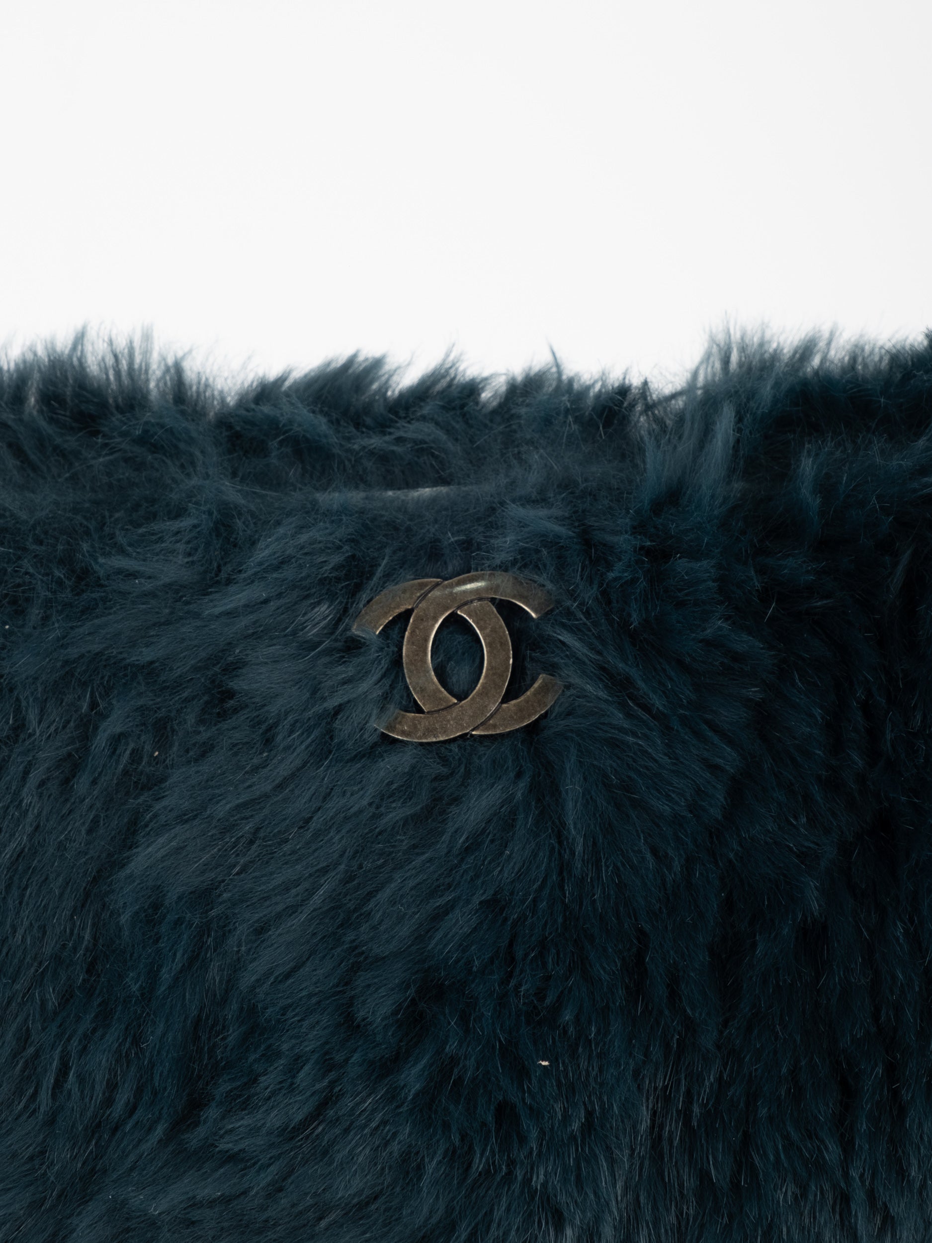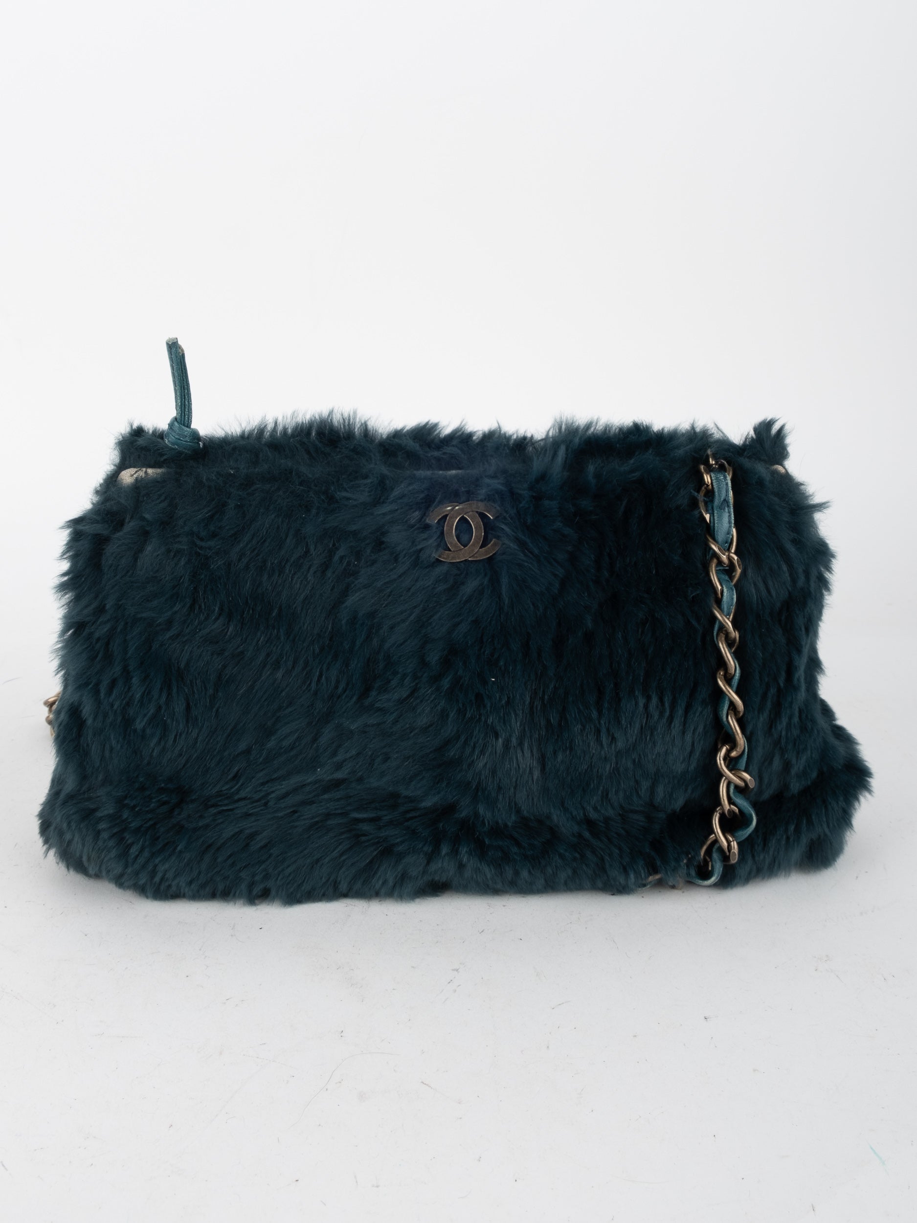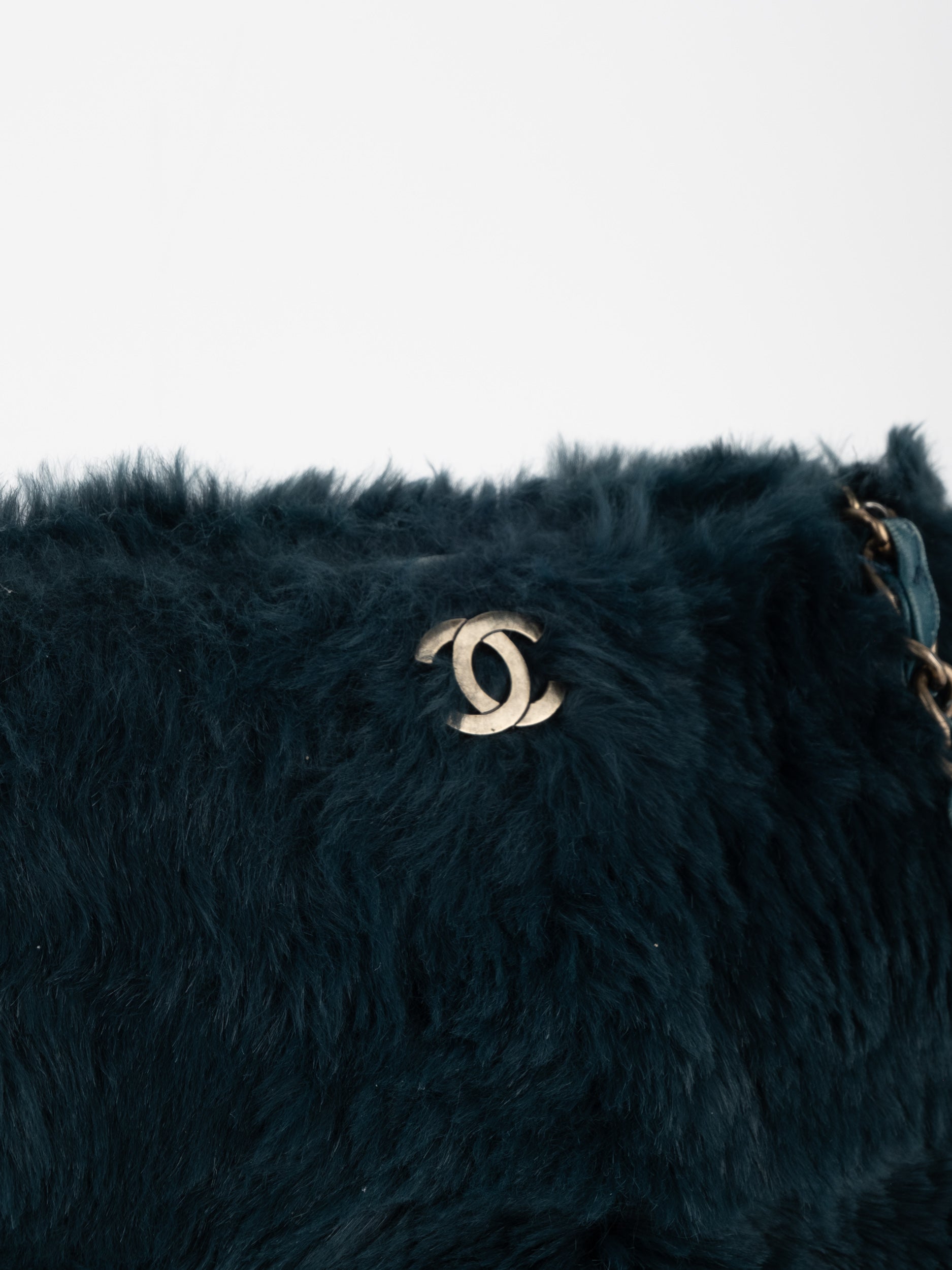 ההתיק עשוי חומר דמוי פרווה בגוון שחור, כולל שרשרת כתף בגוון זהב ושילוב לוגו CC קדמי. מבנה רך ונוח עם סגירת רוכסן עליון.