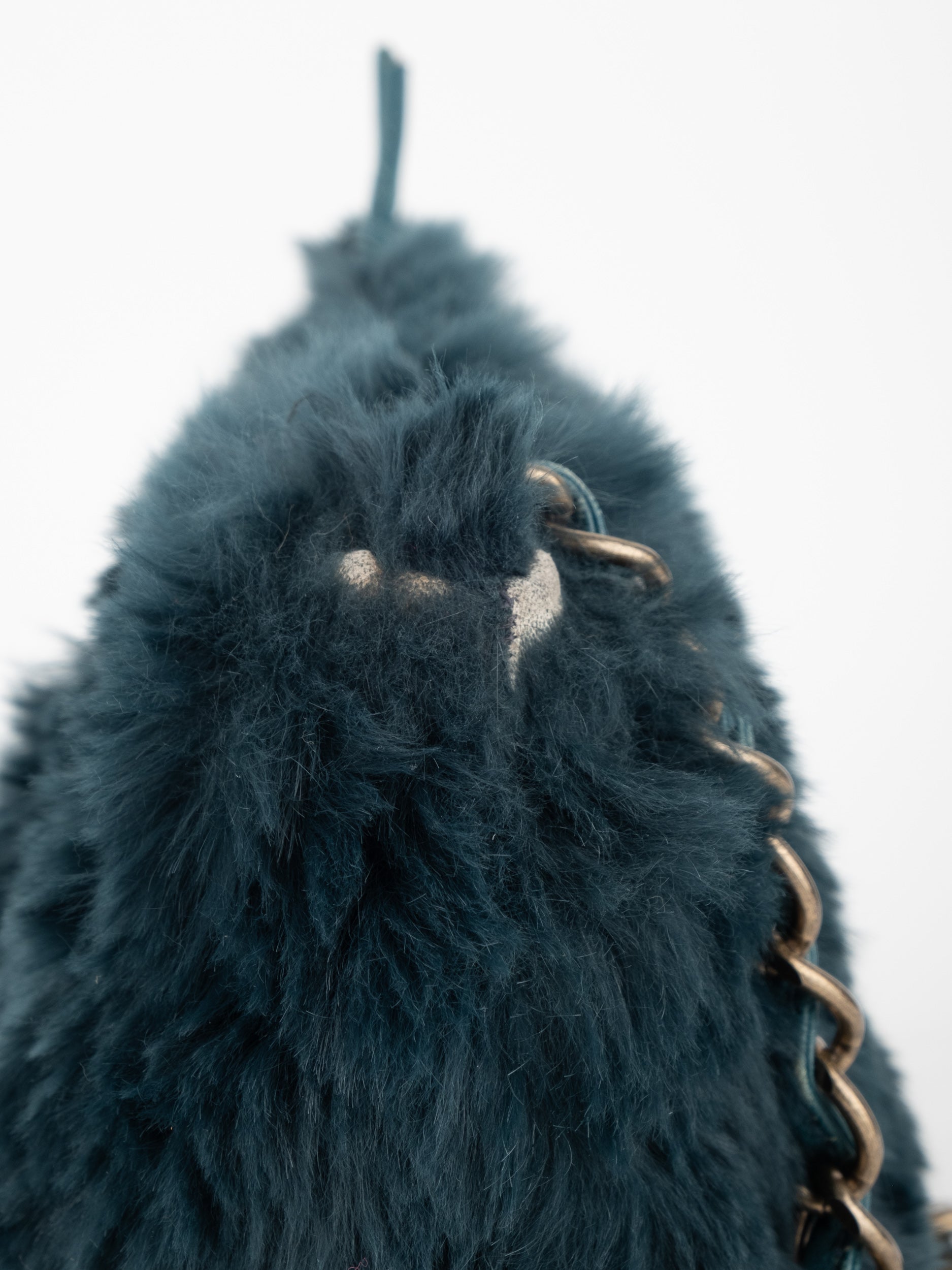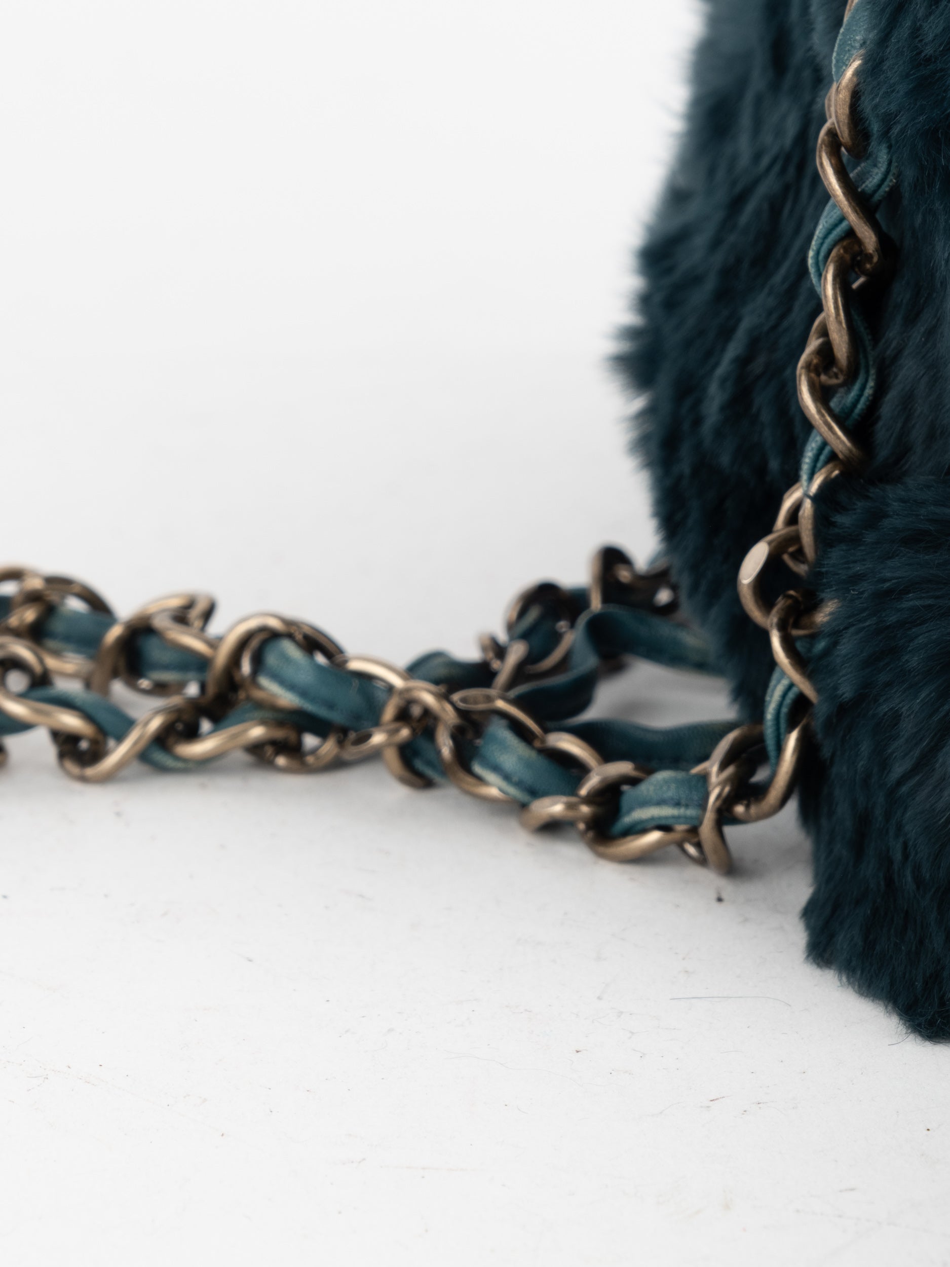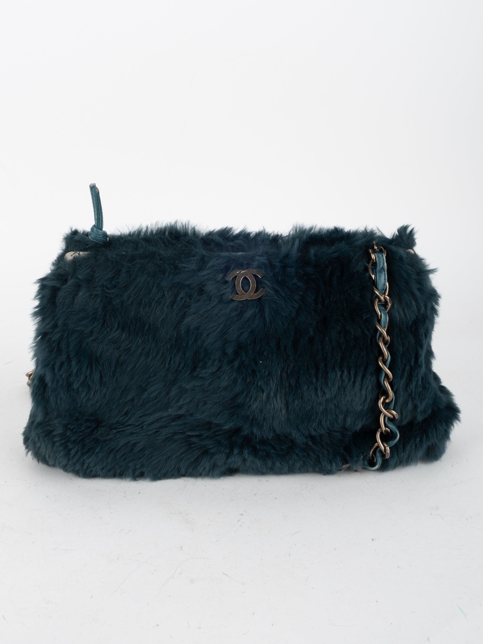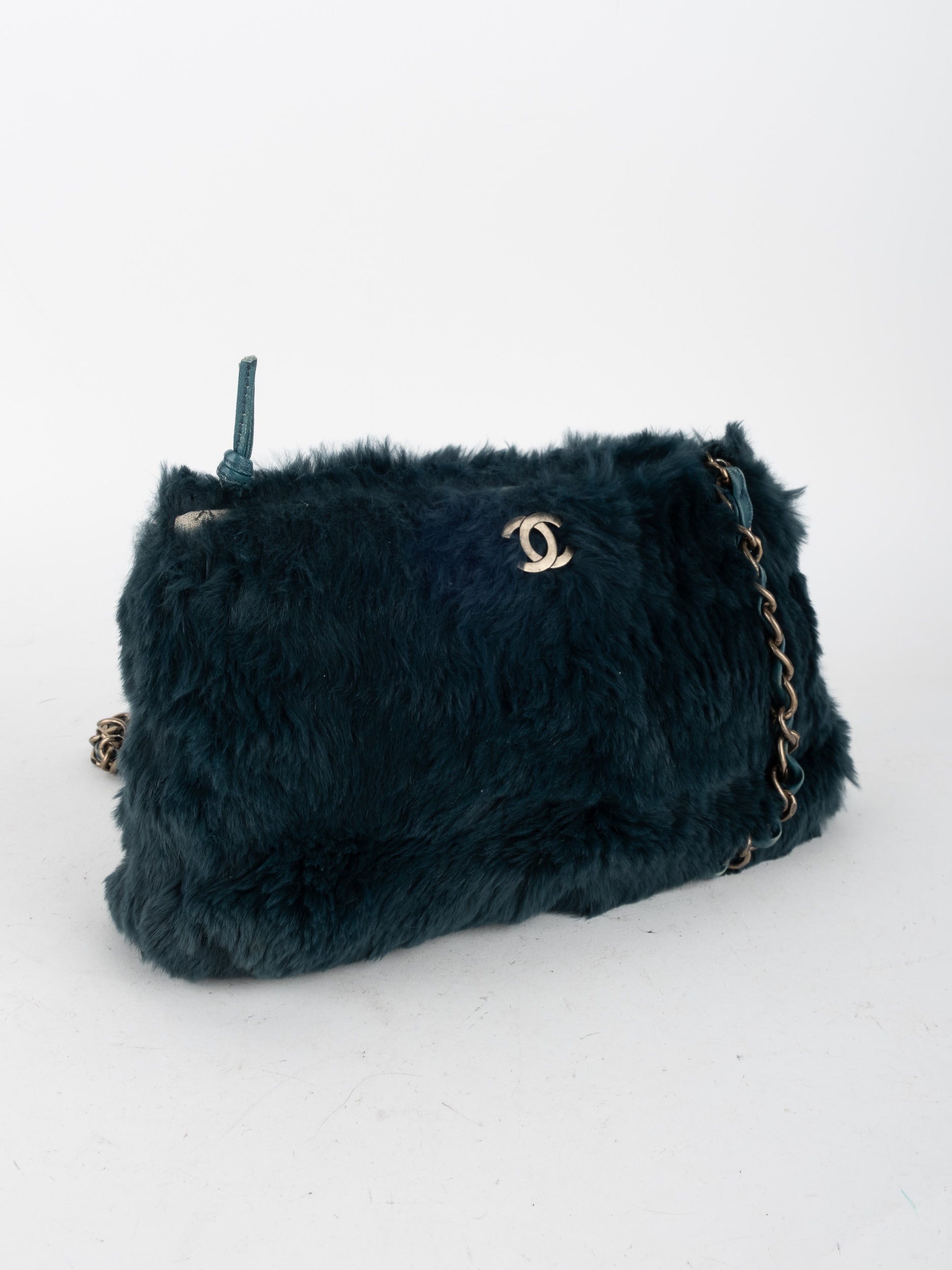 ההתיק עשוי חומר דמוי פרווה בגוון שחור, כולל שרשרת כתף בגוון זהב ושילוב לוגו CC קדמי. מבנה רך ונוח עם סגירת רוכסן עליון.